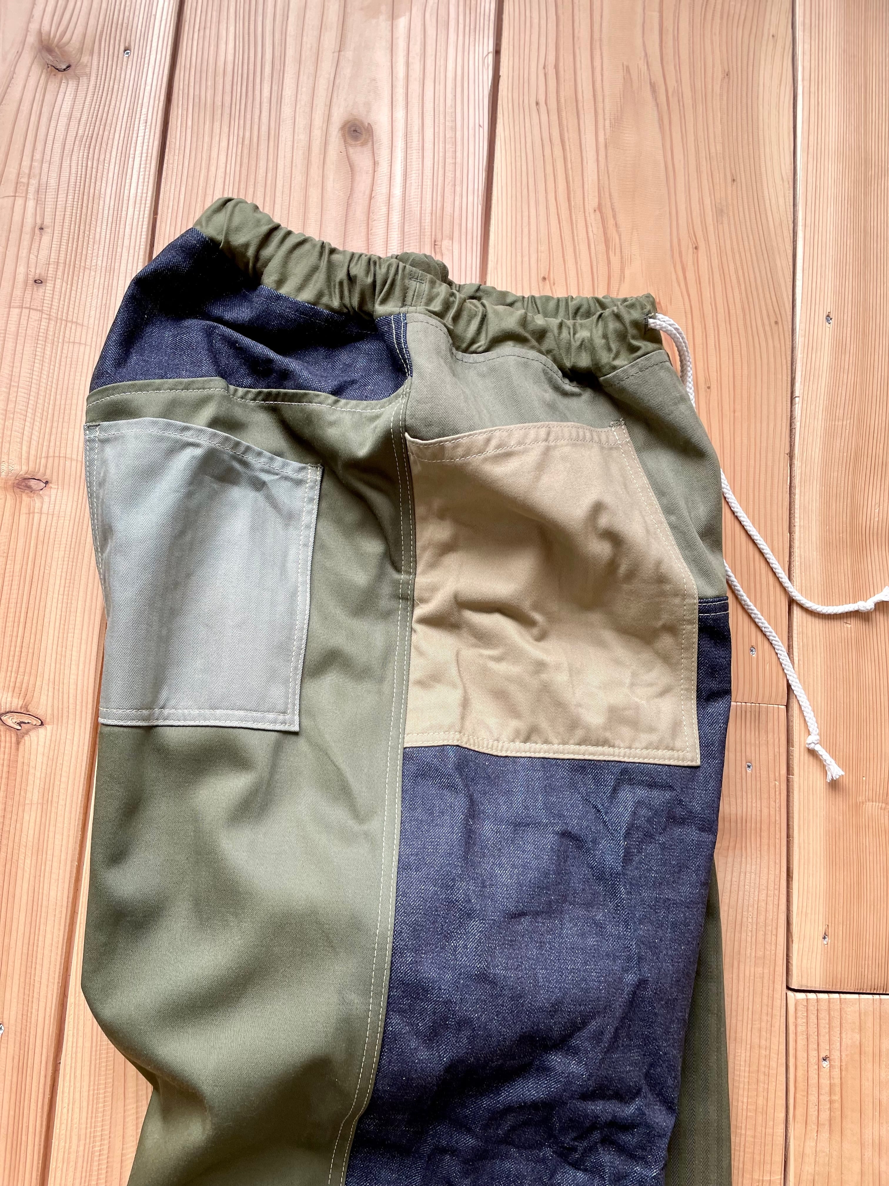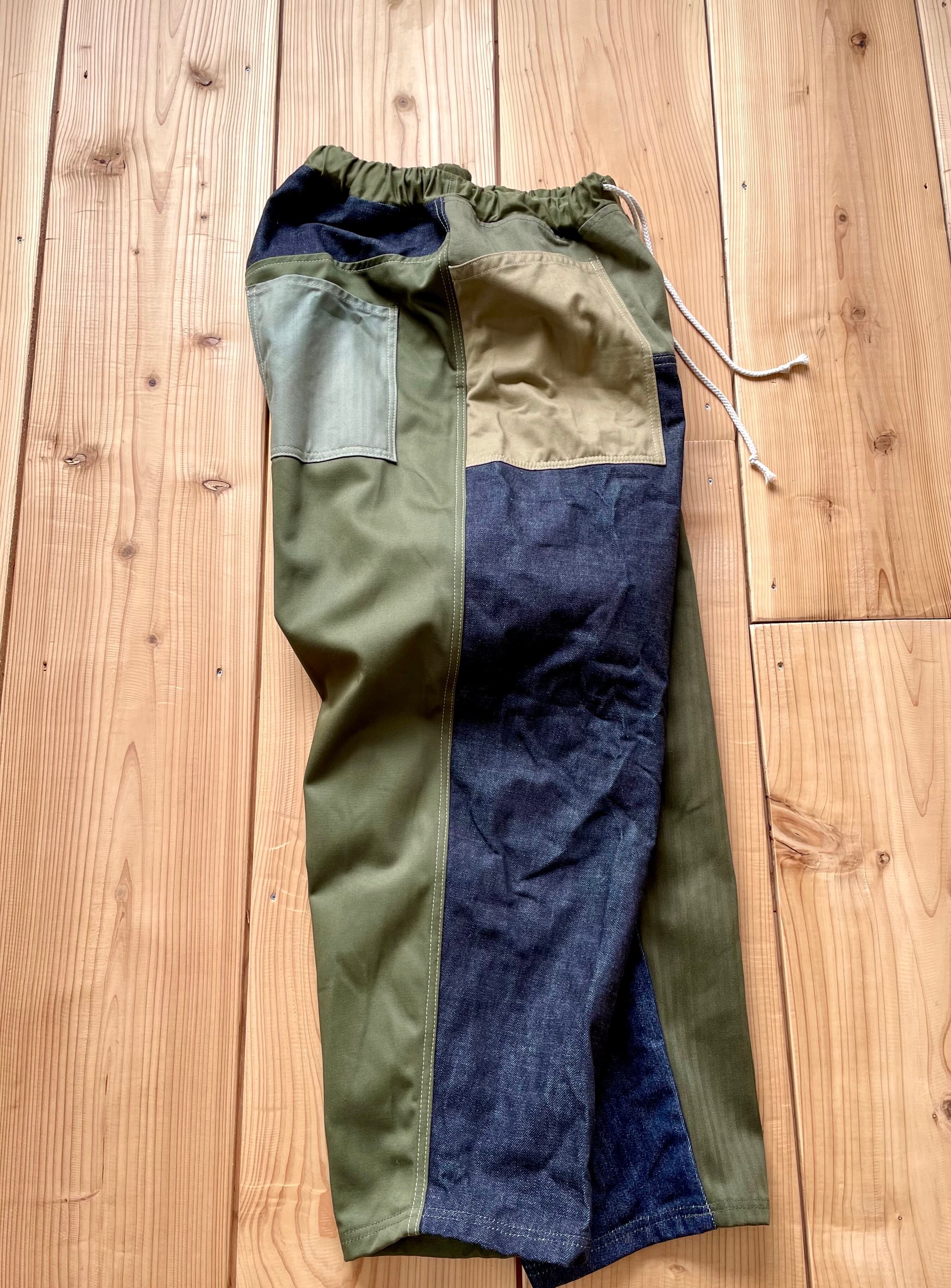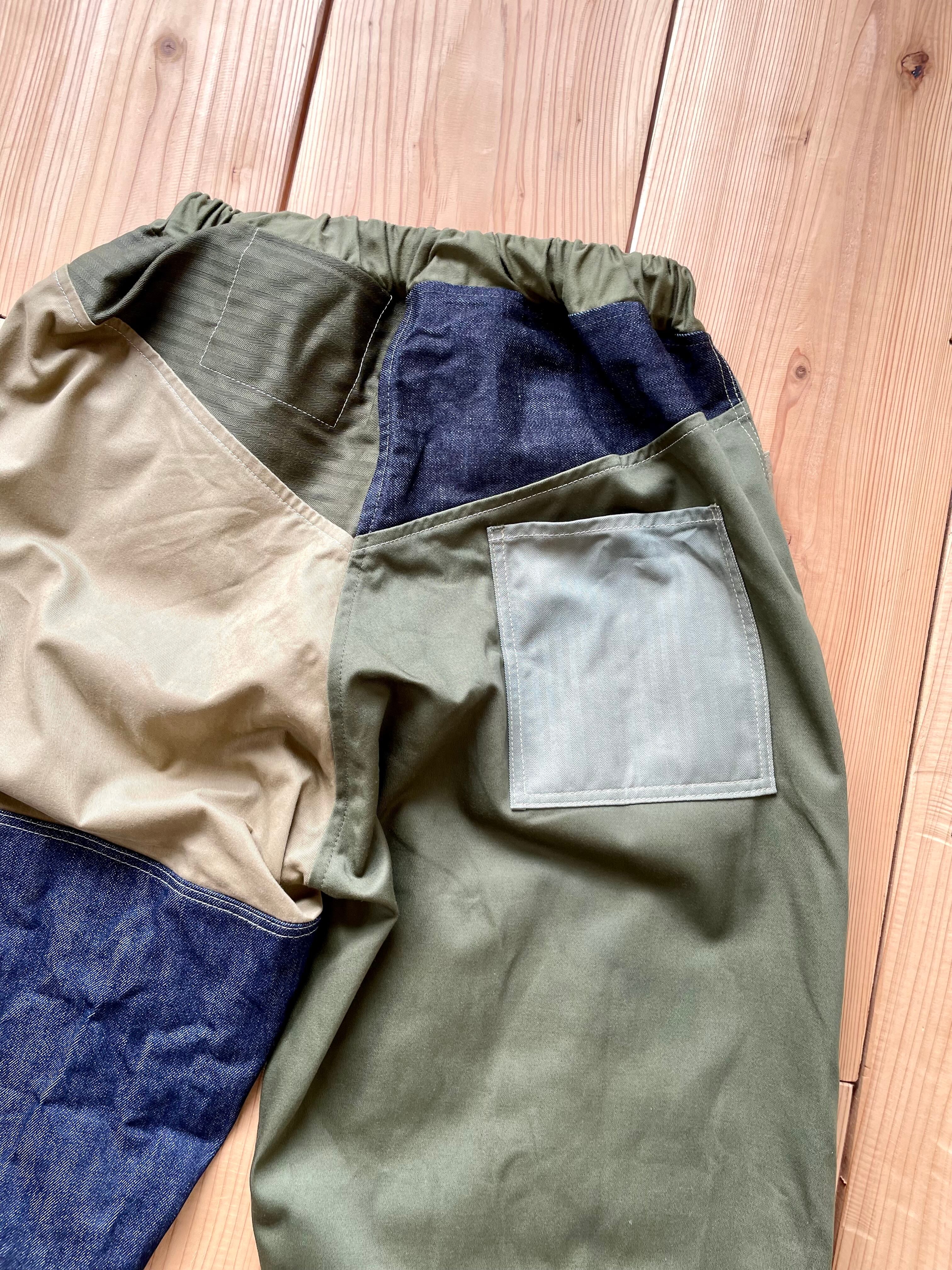 デニム、カーキ系で生地をランダムに使っています。