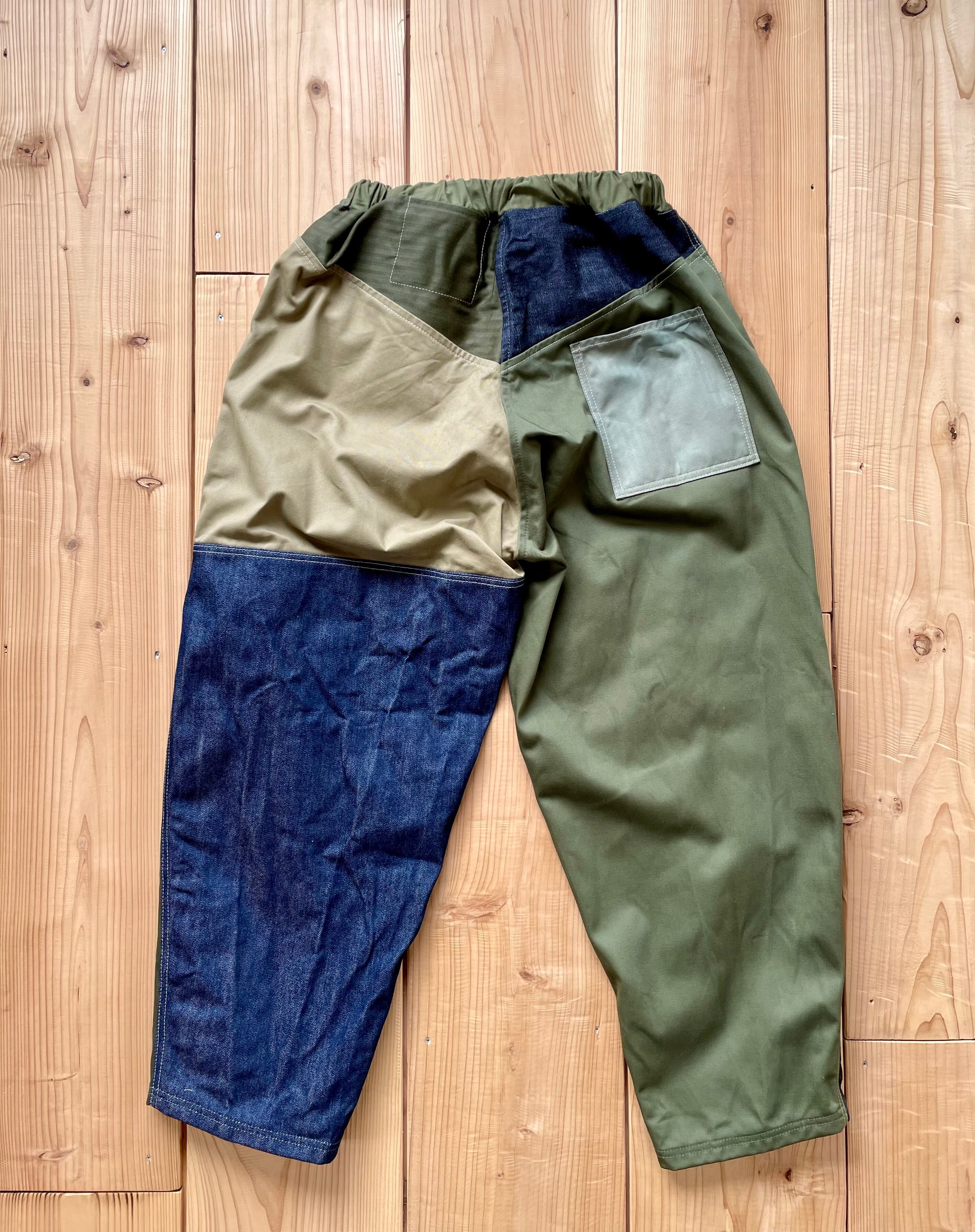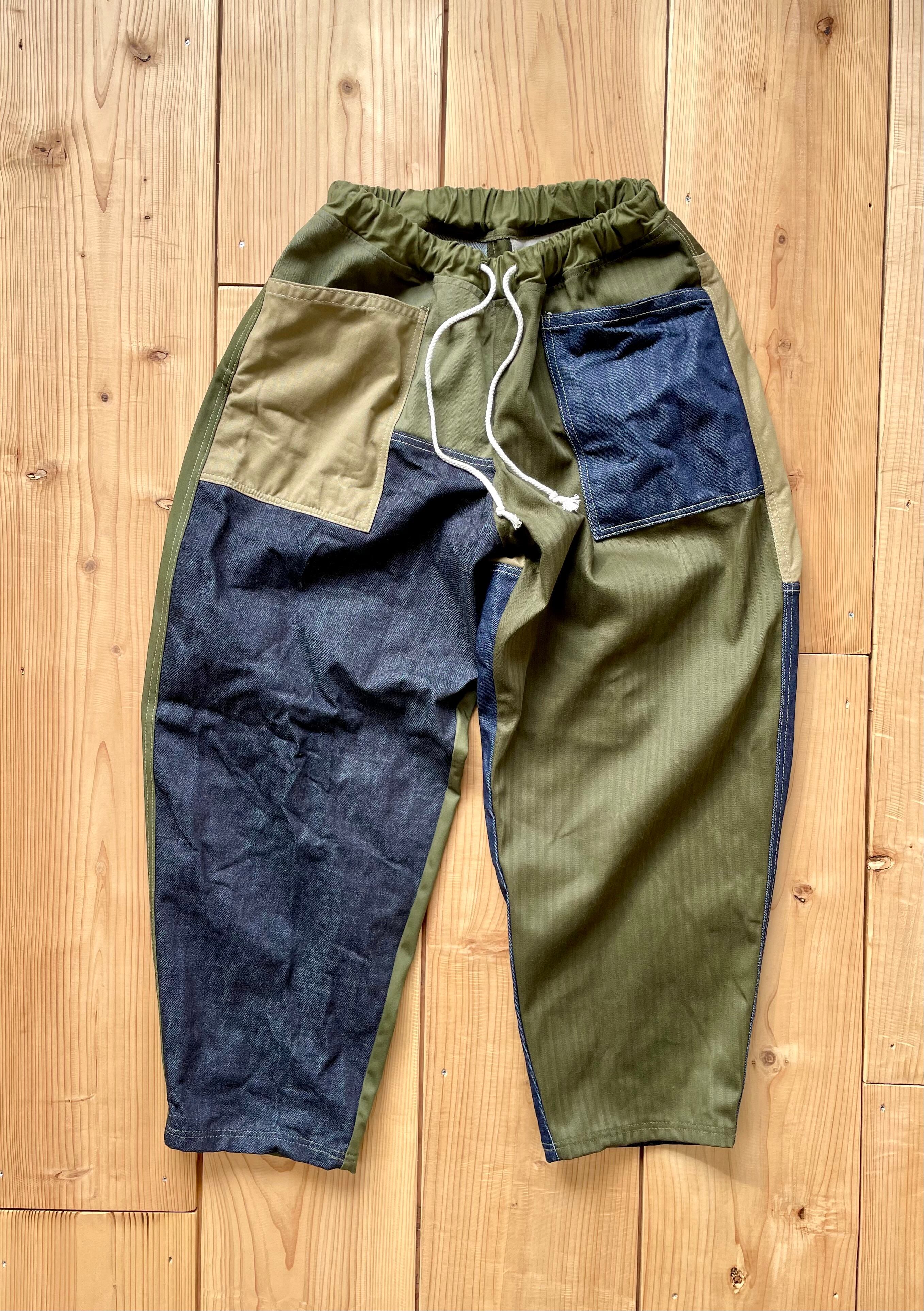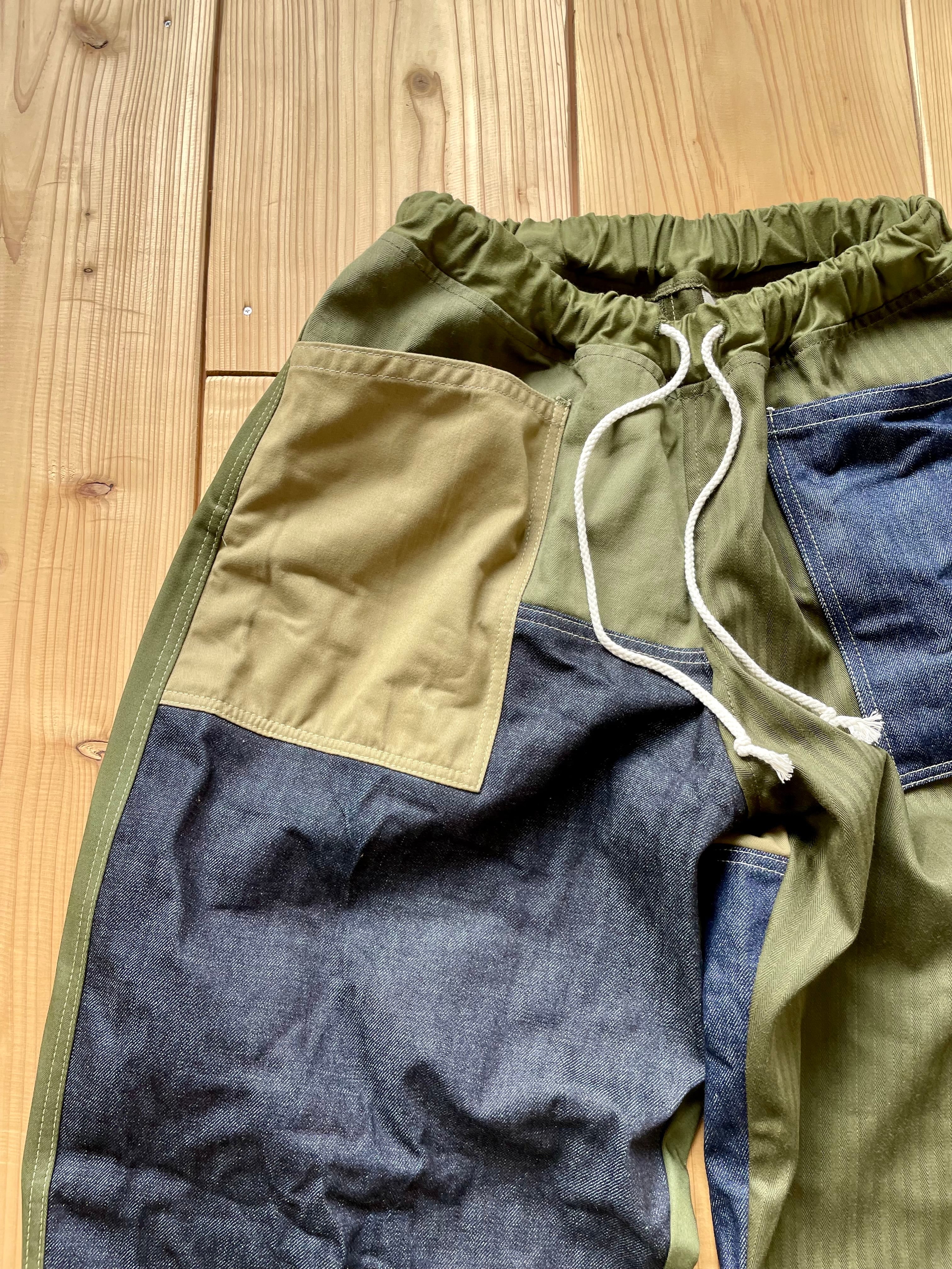 デニム、カーキ系で生地をランダムに使っています。