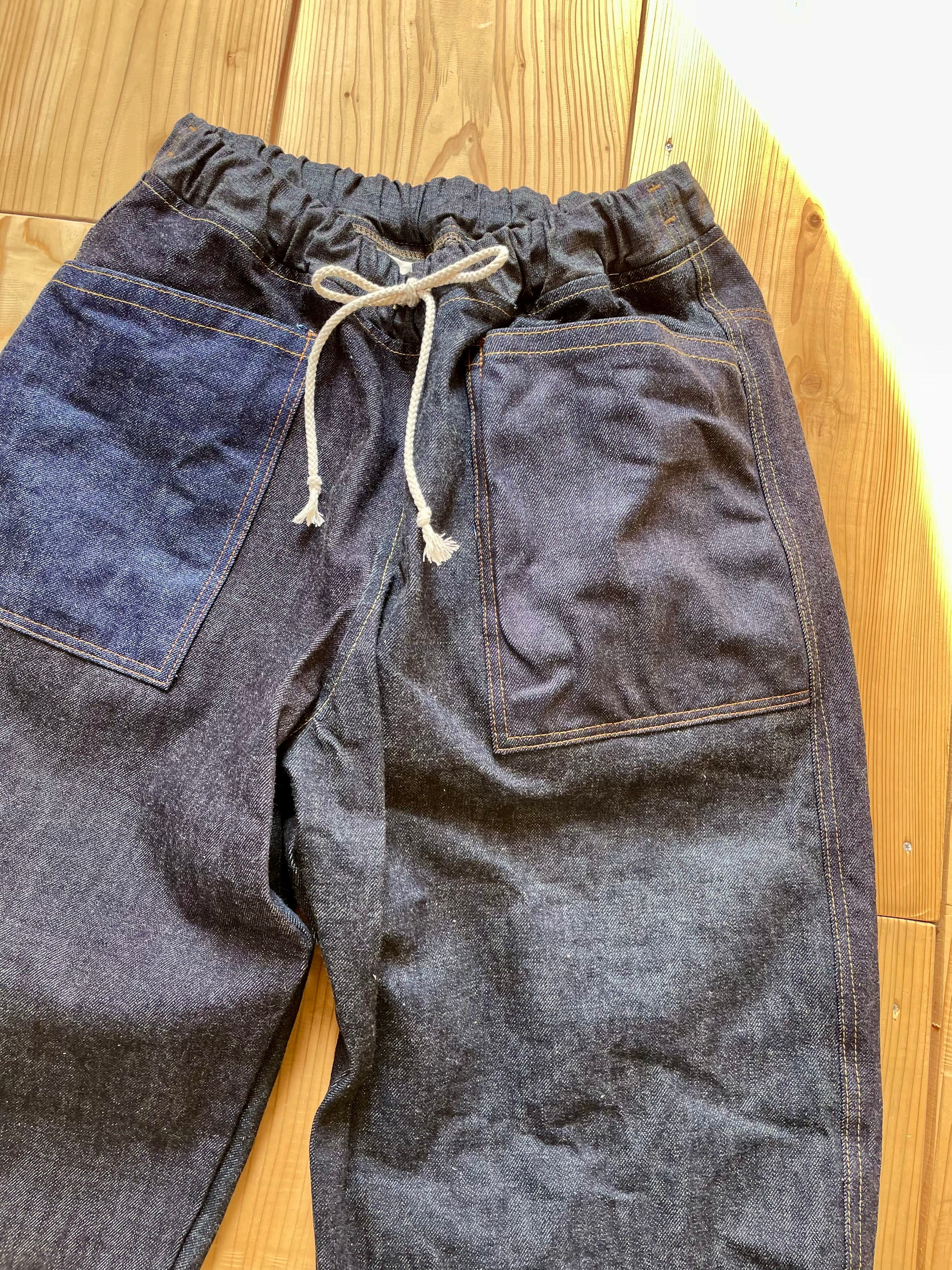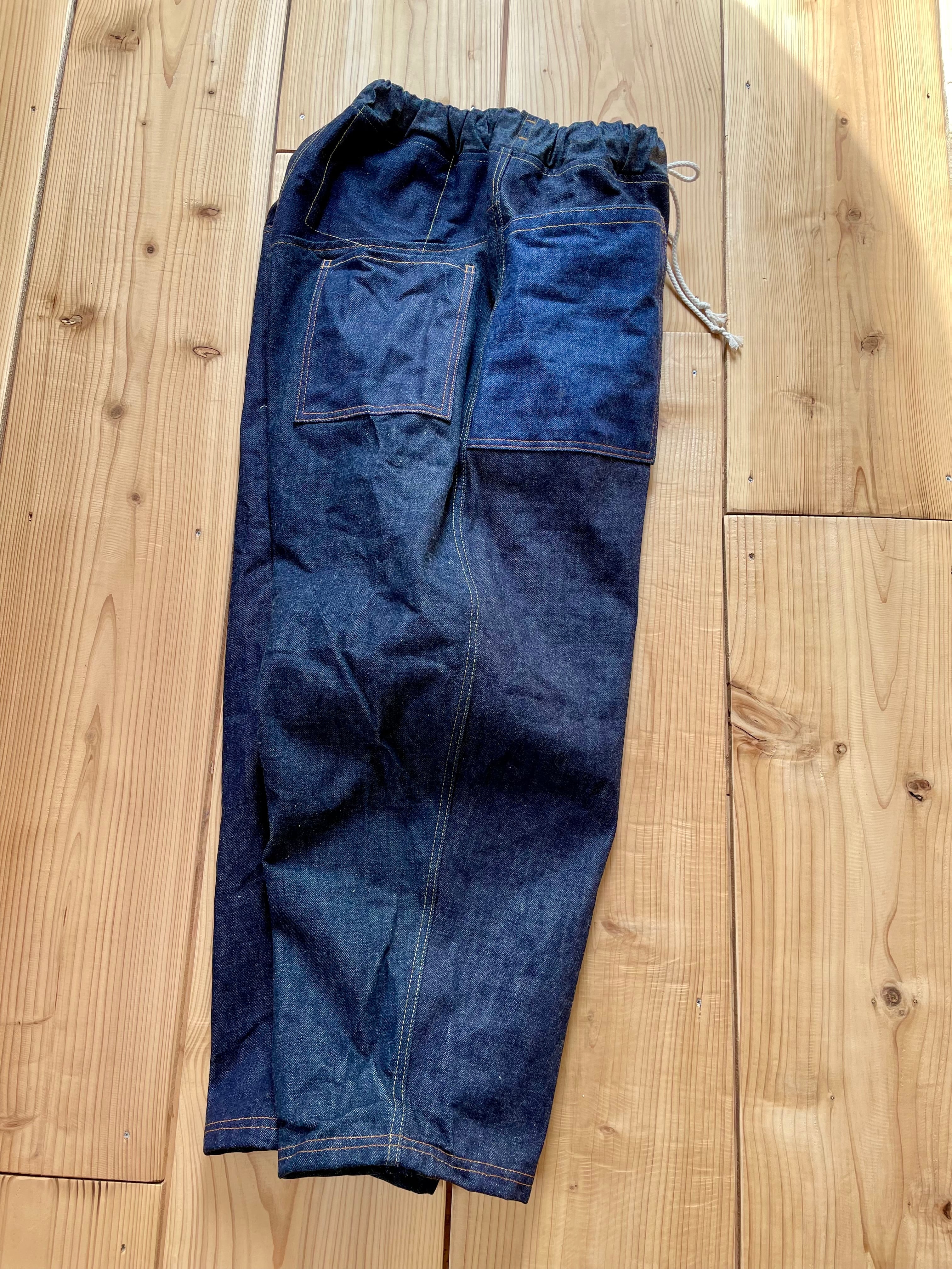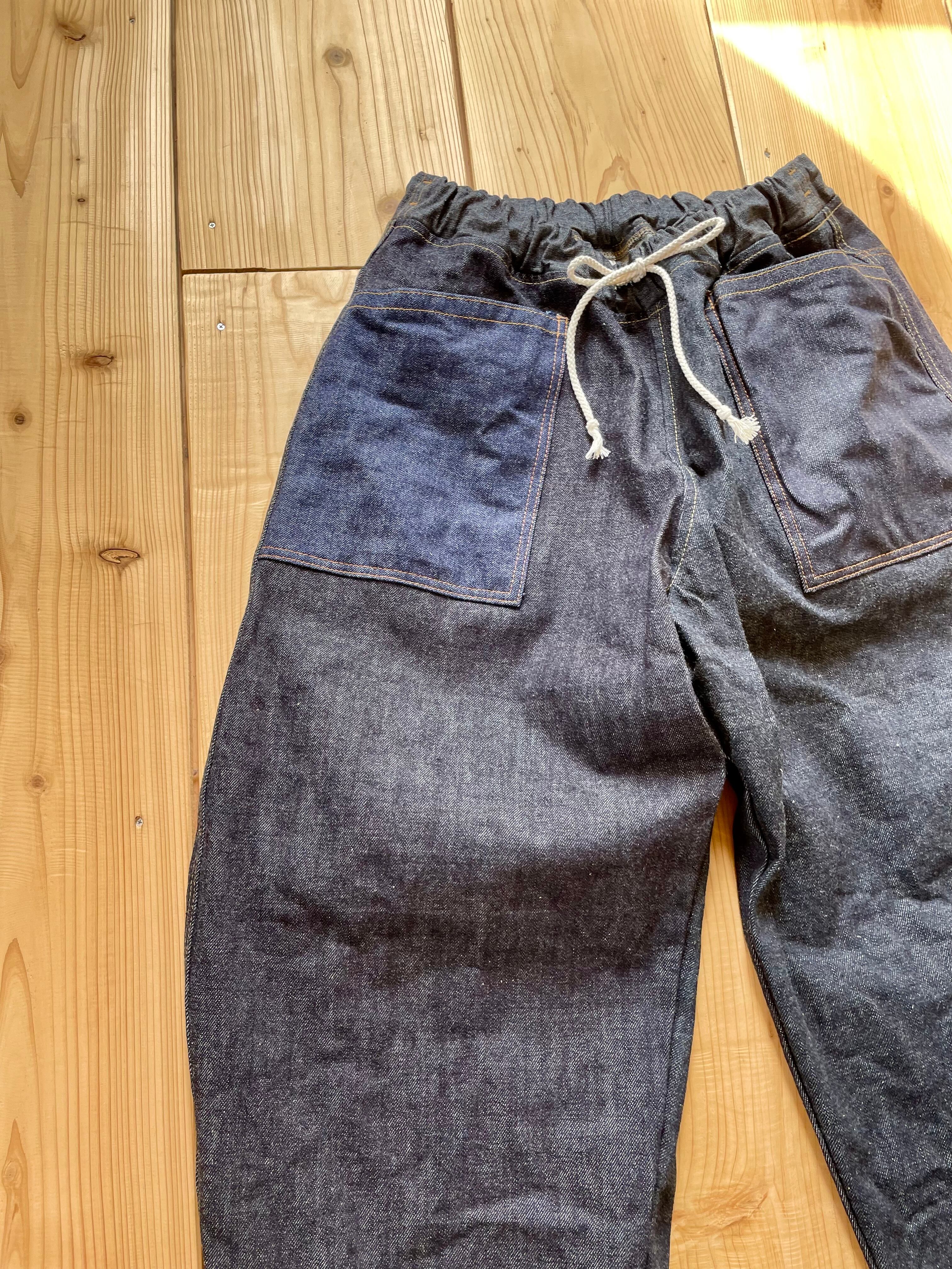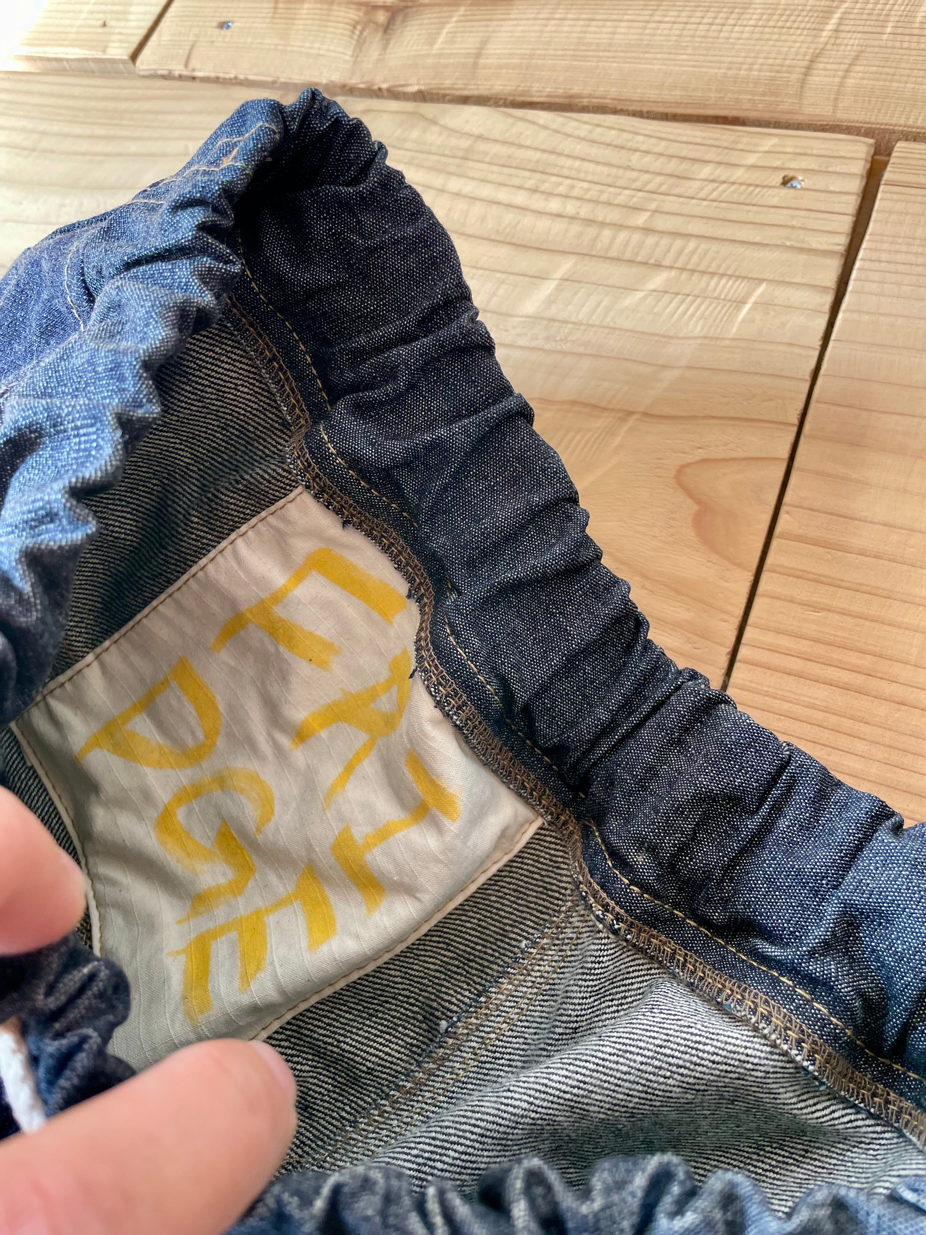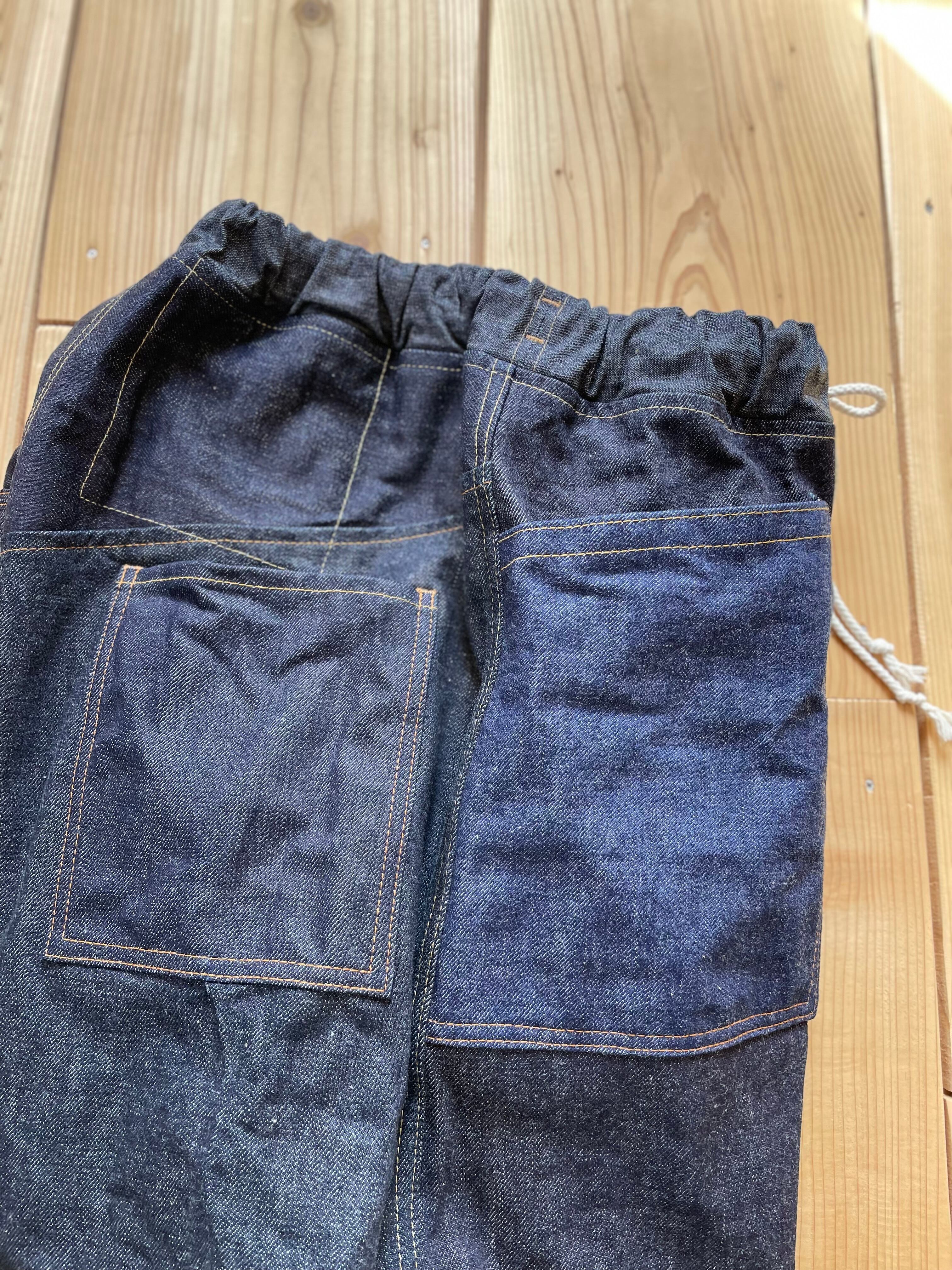 ロット違いの15オンスくらいの厚手な生地をパーツごとにランダムに使っています。