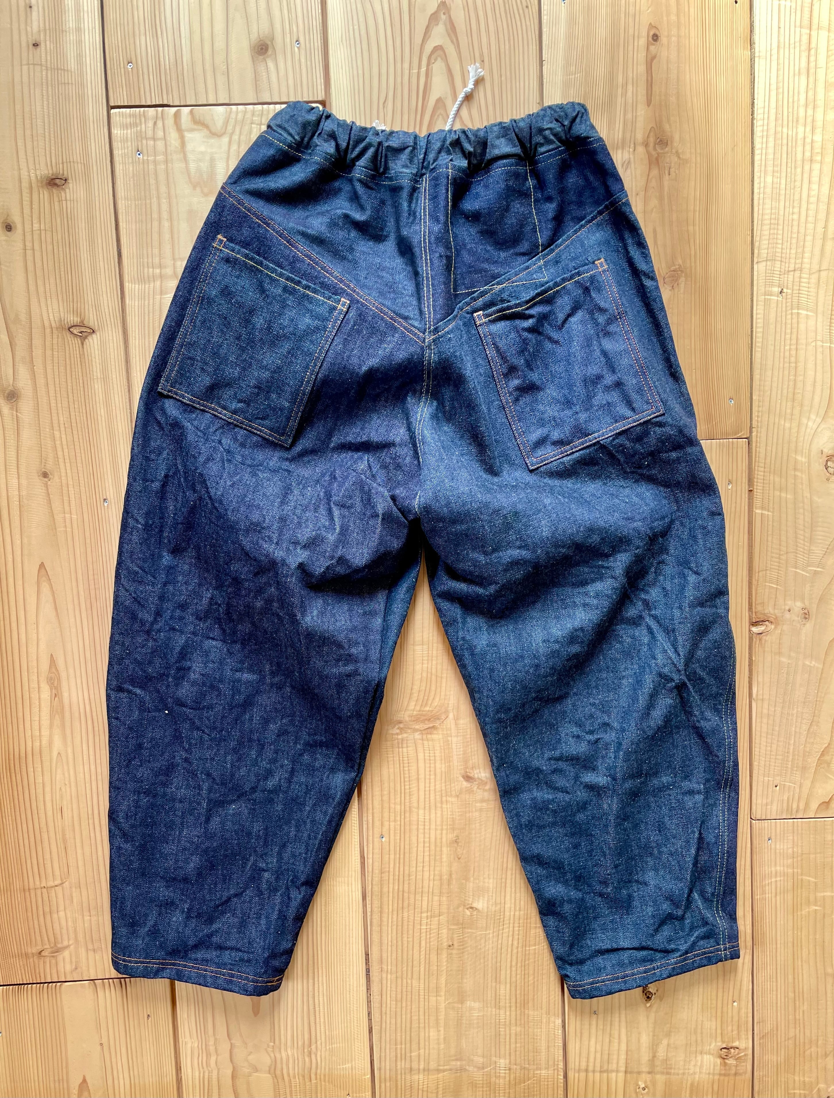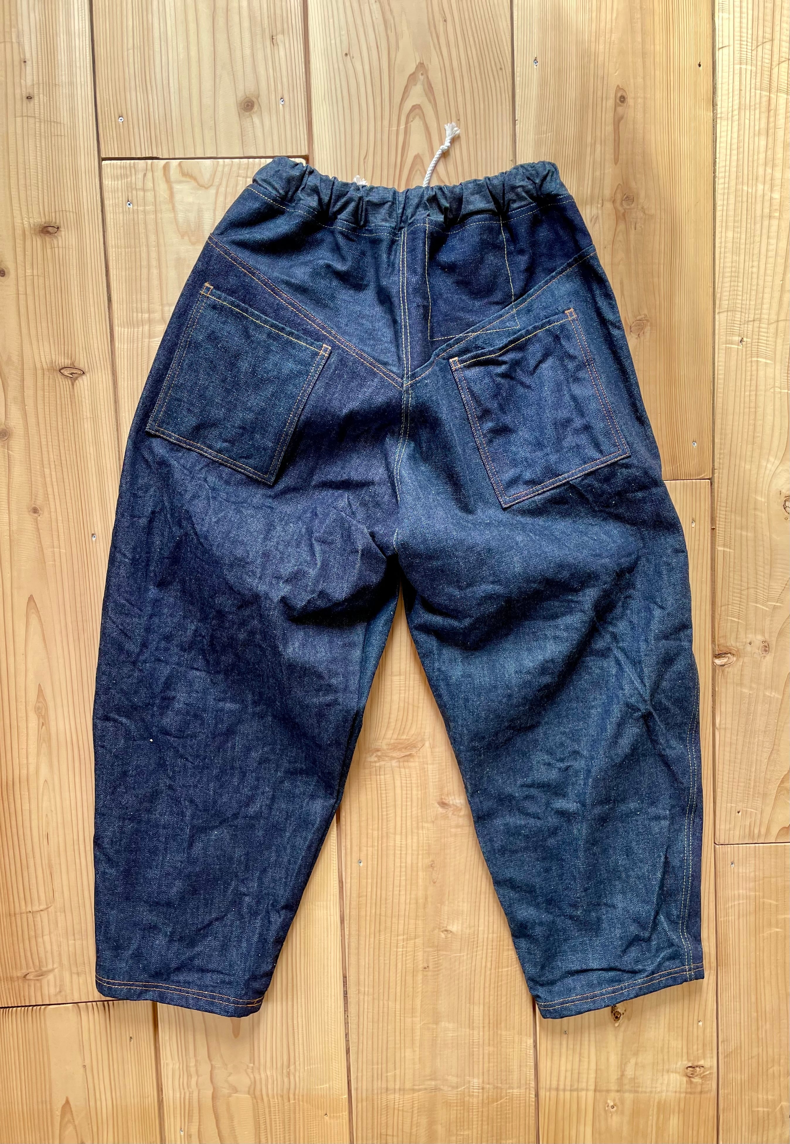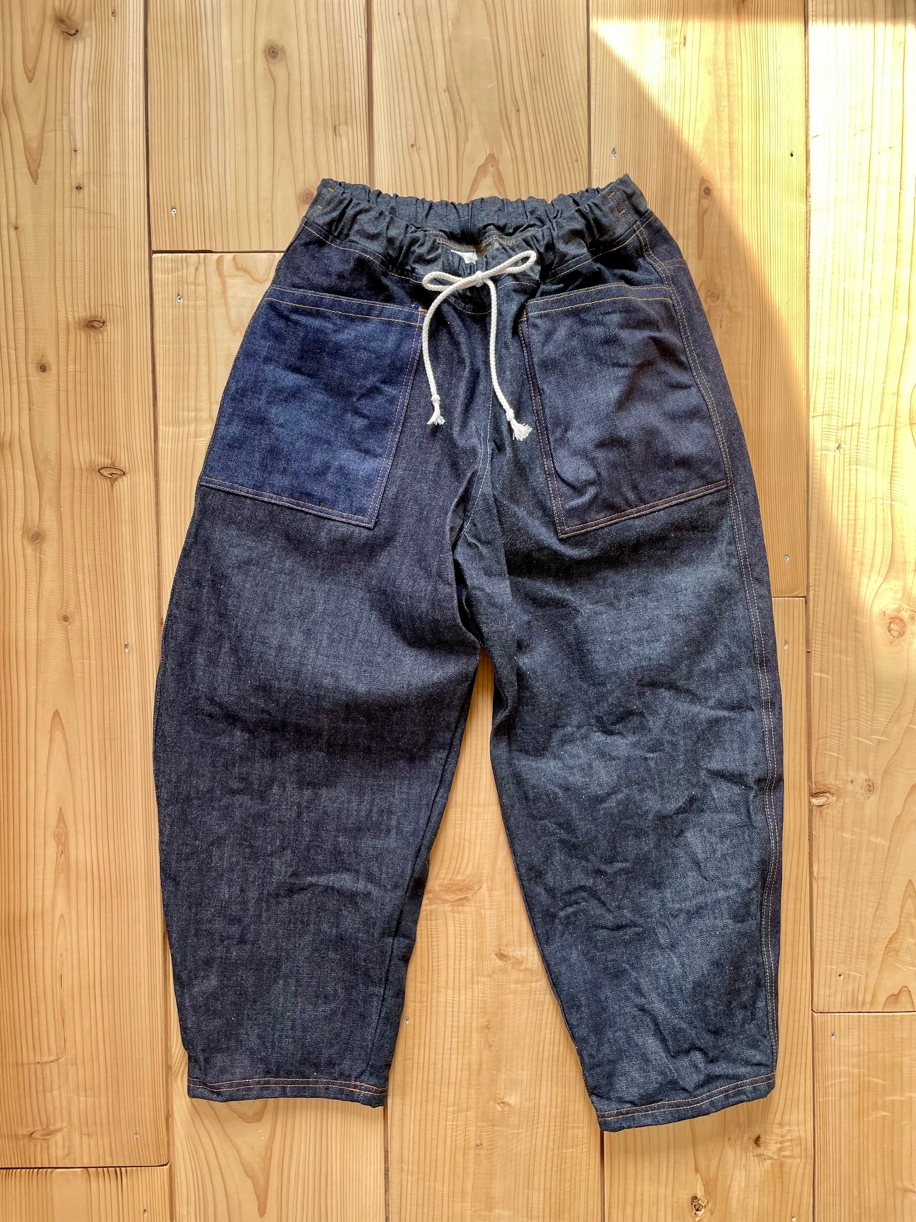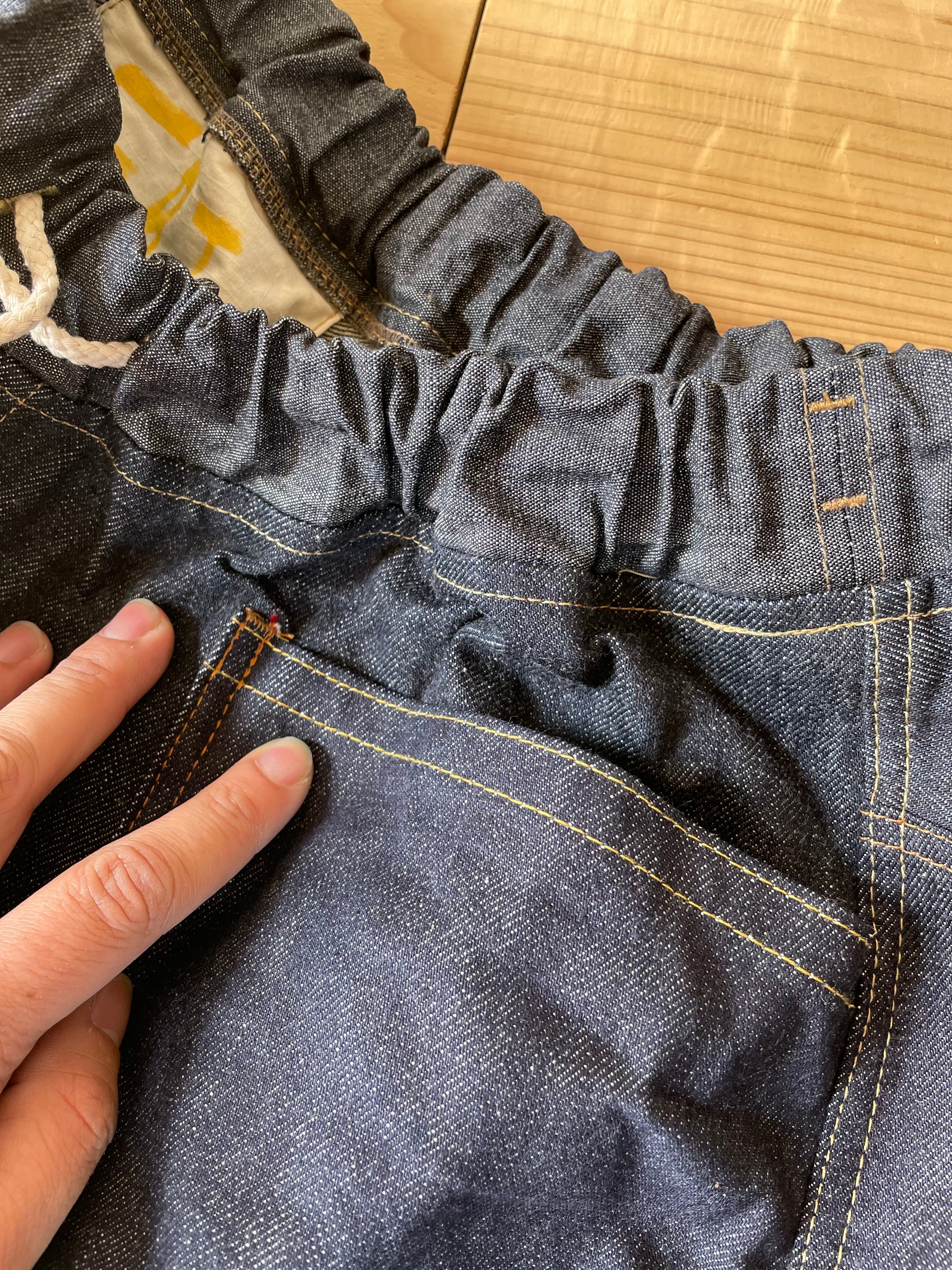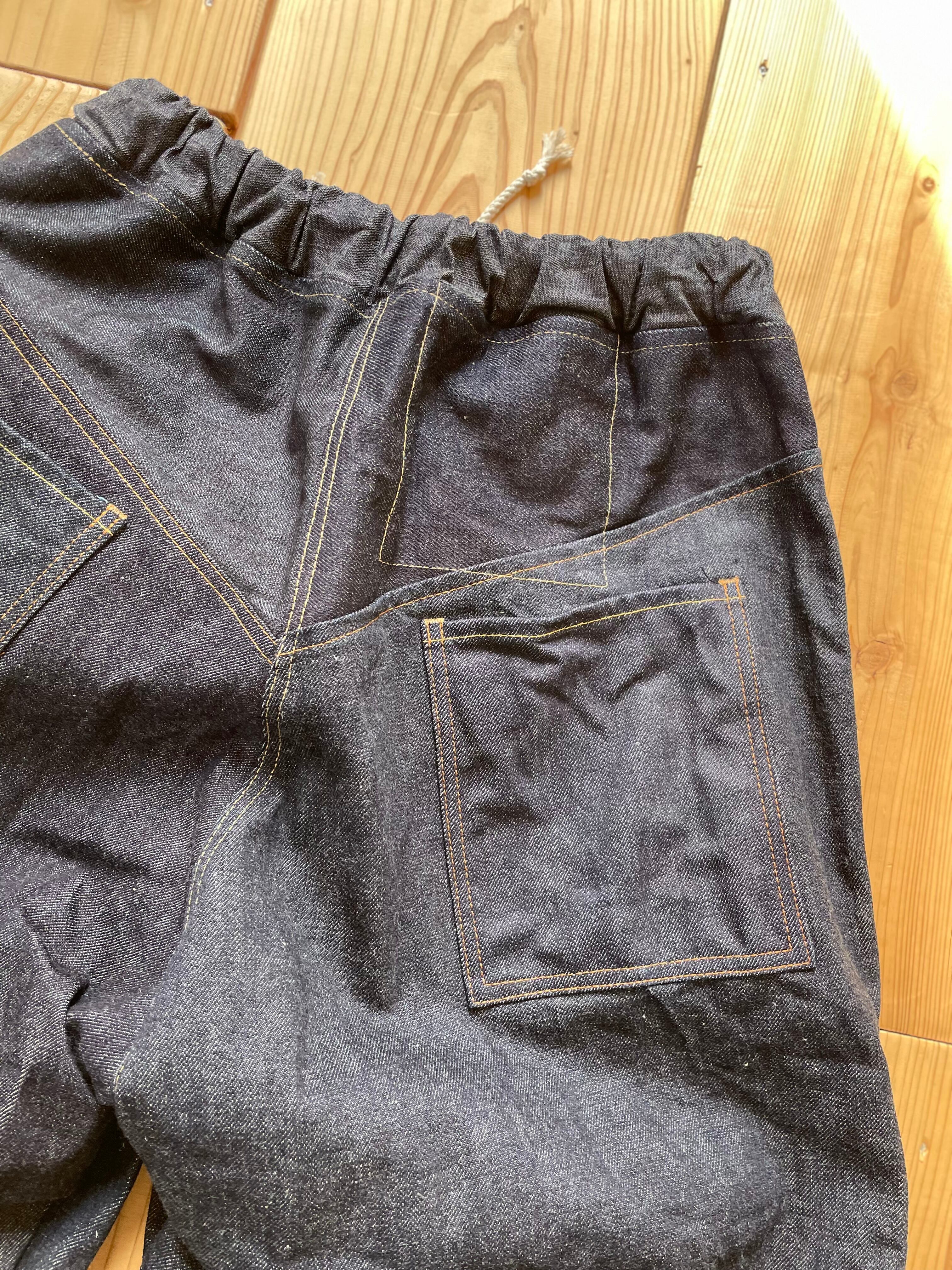 ロット違いの15オンスくらいの厚手な生地をパーツごとにランダムに使っています。