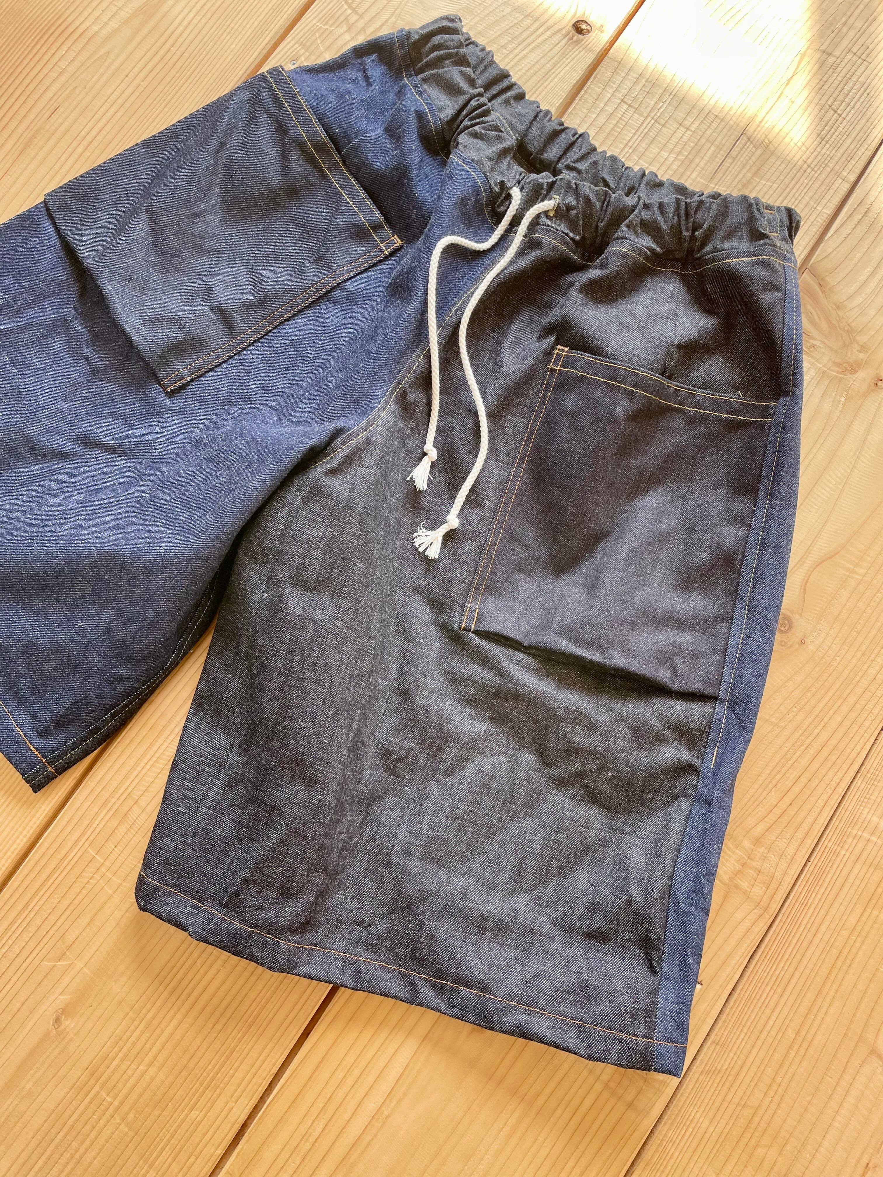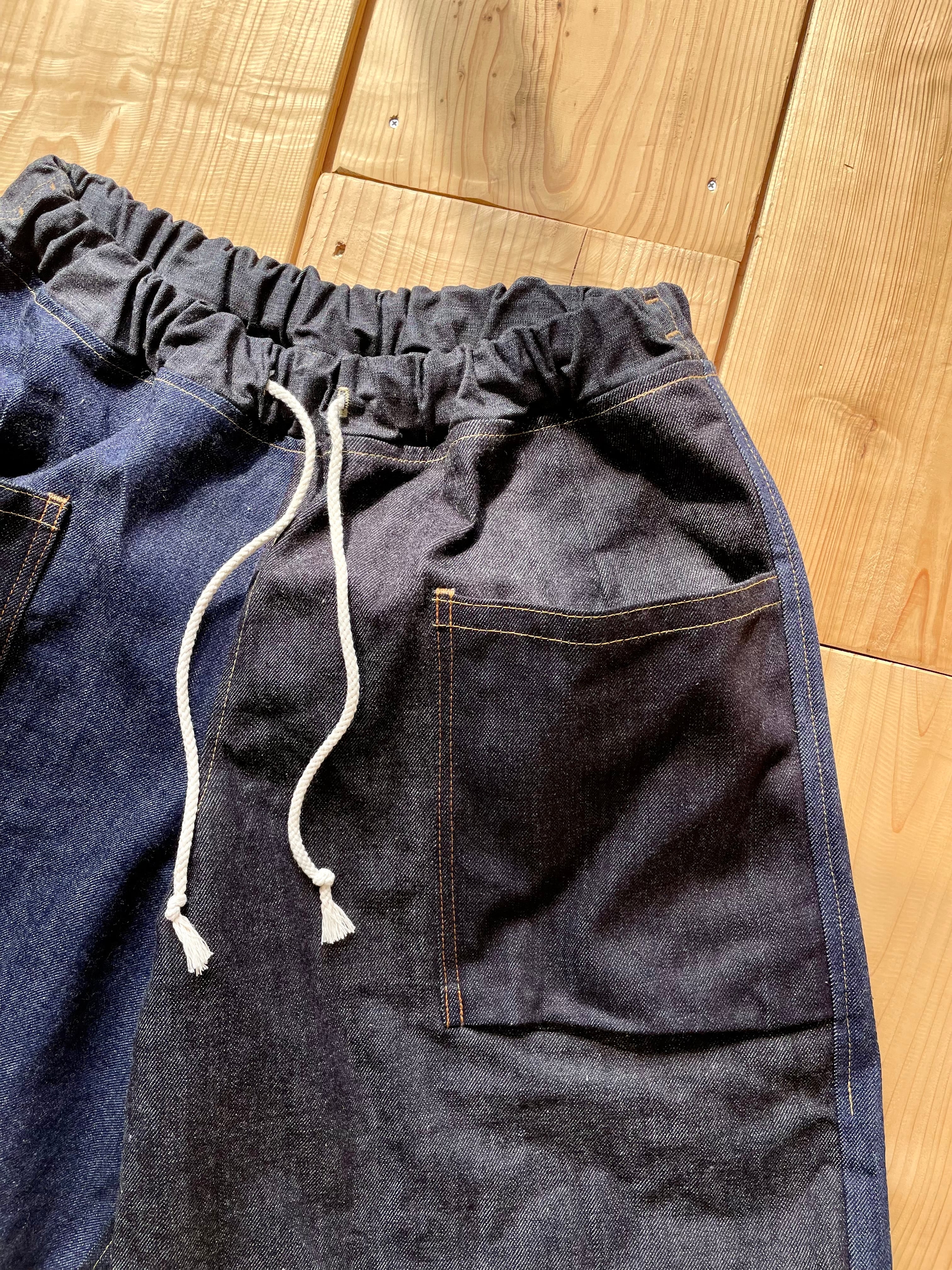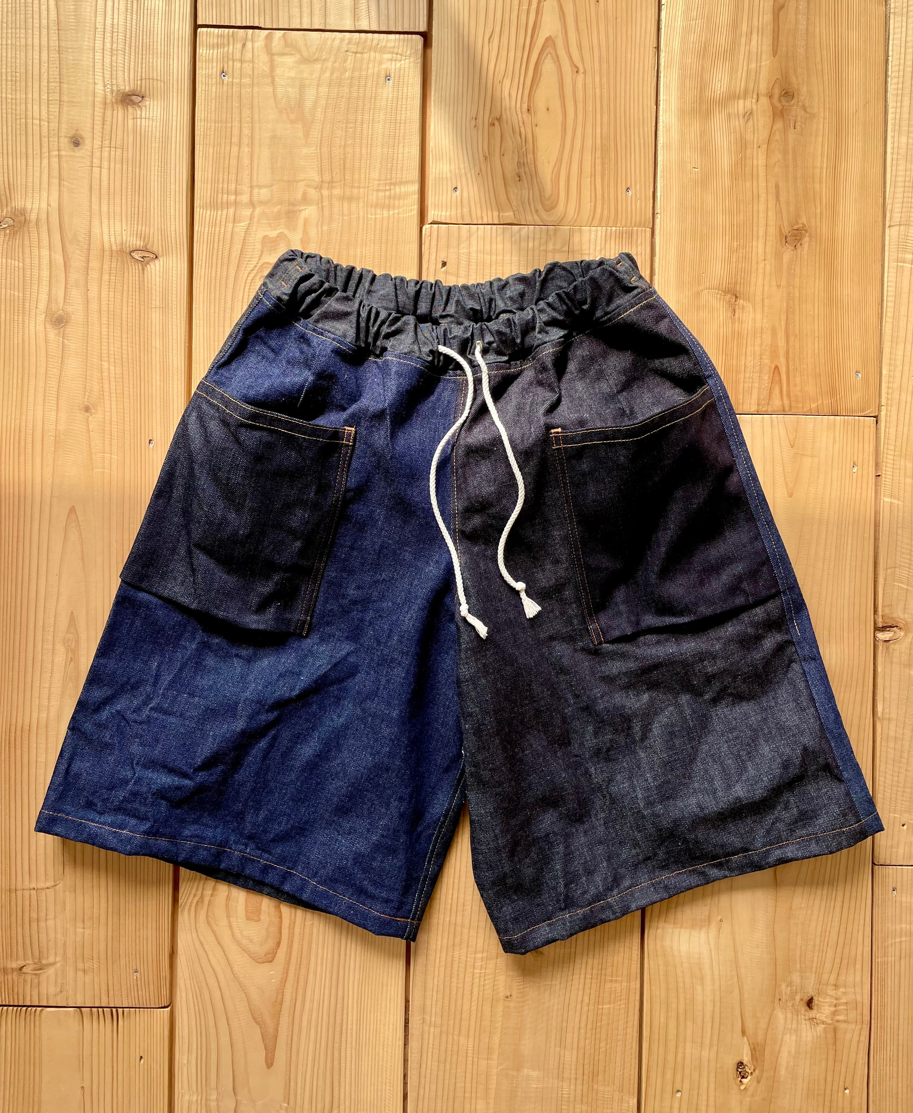 赤耳デニム生地をランダムに使って、ワイドな短パンにしました。