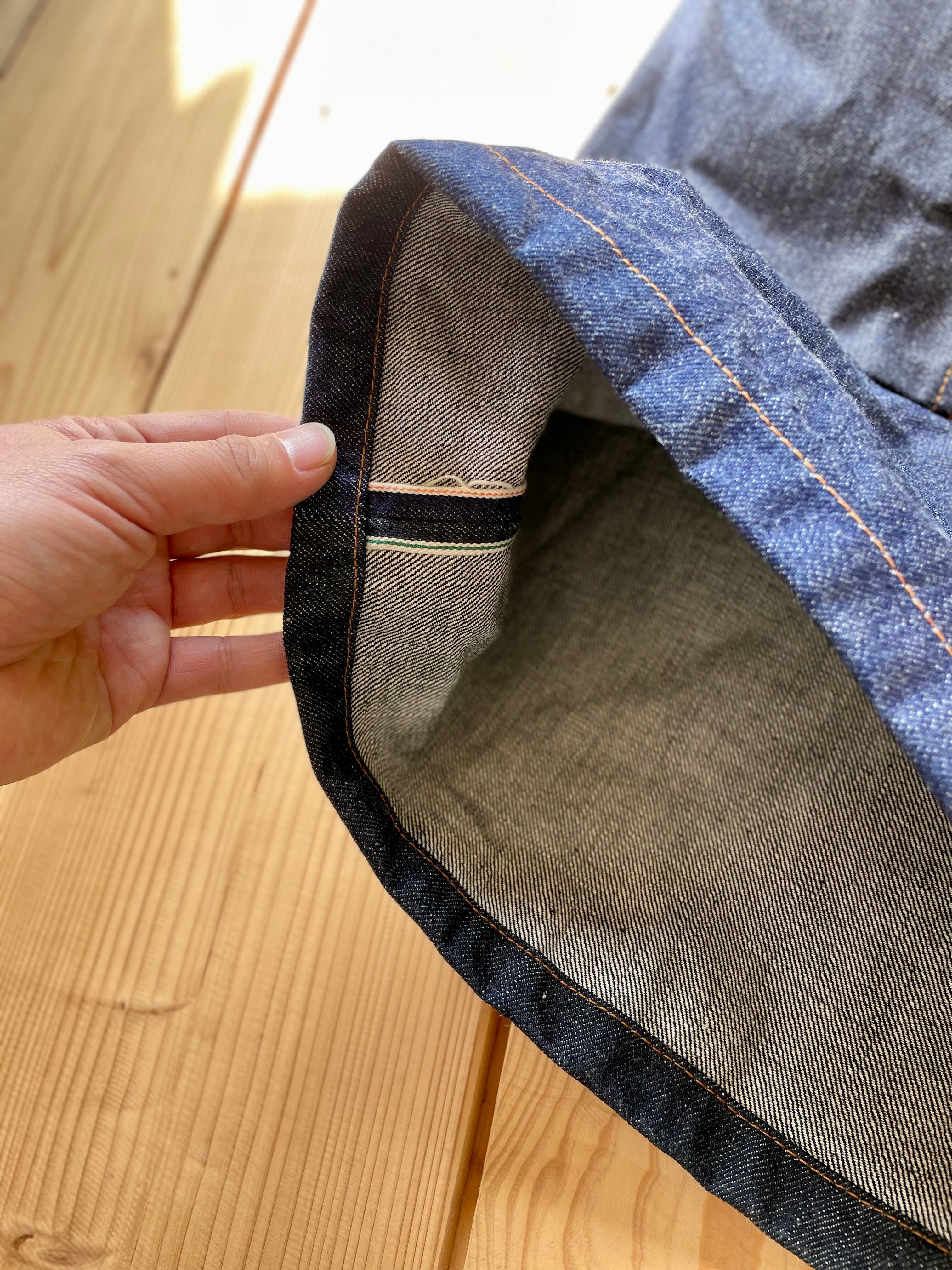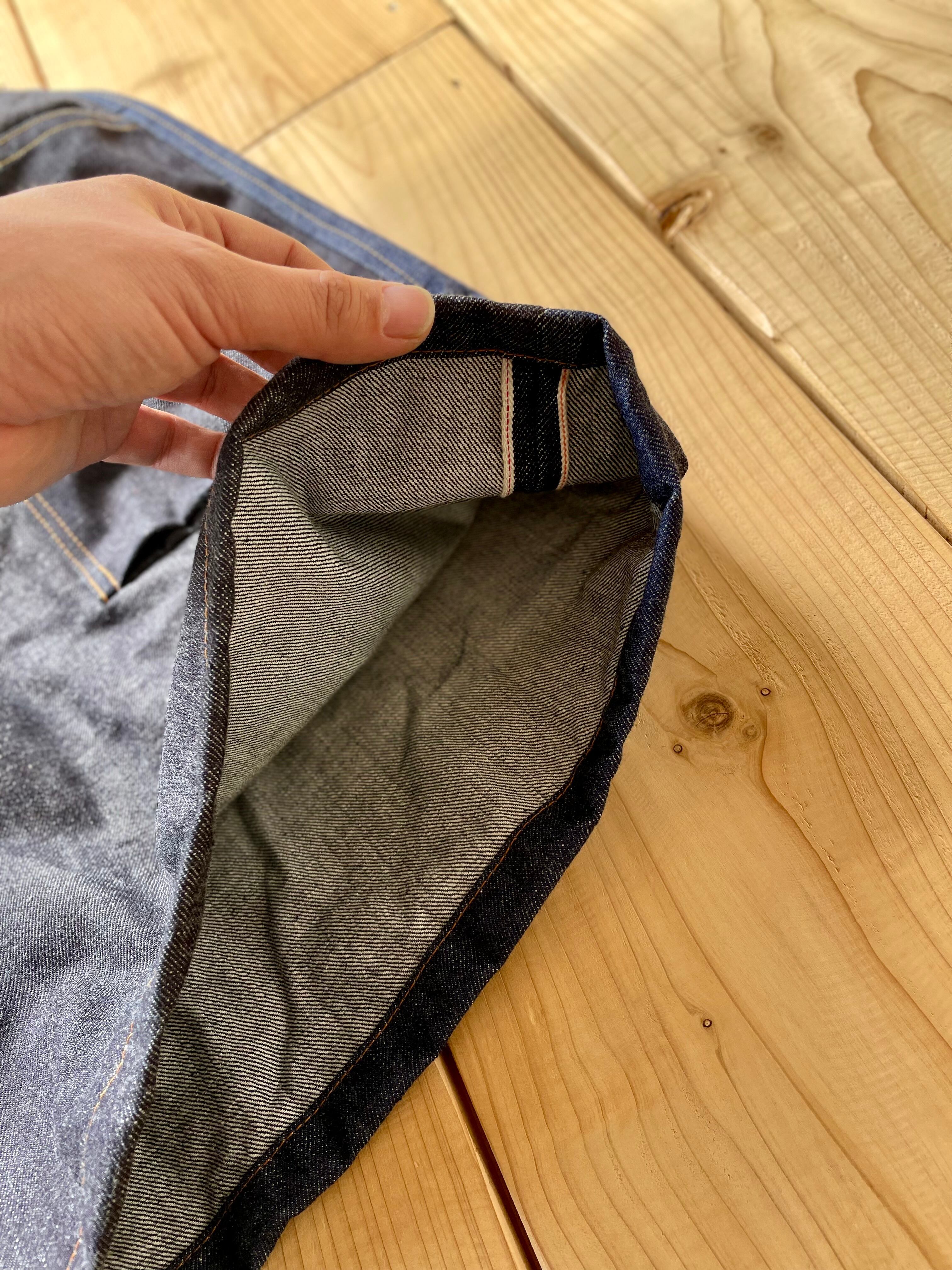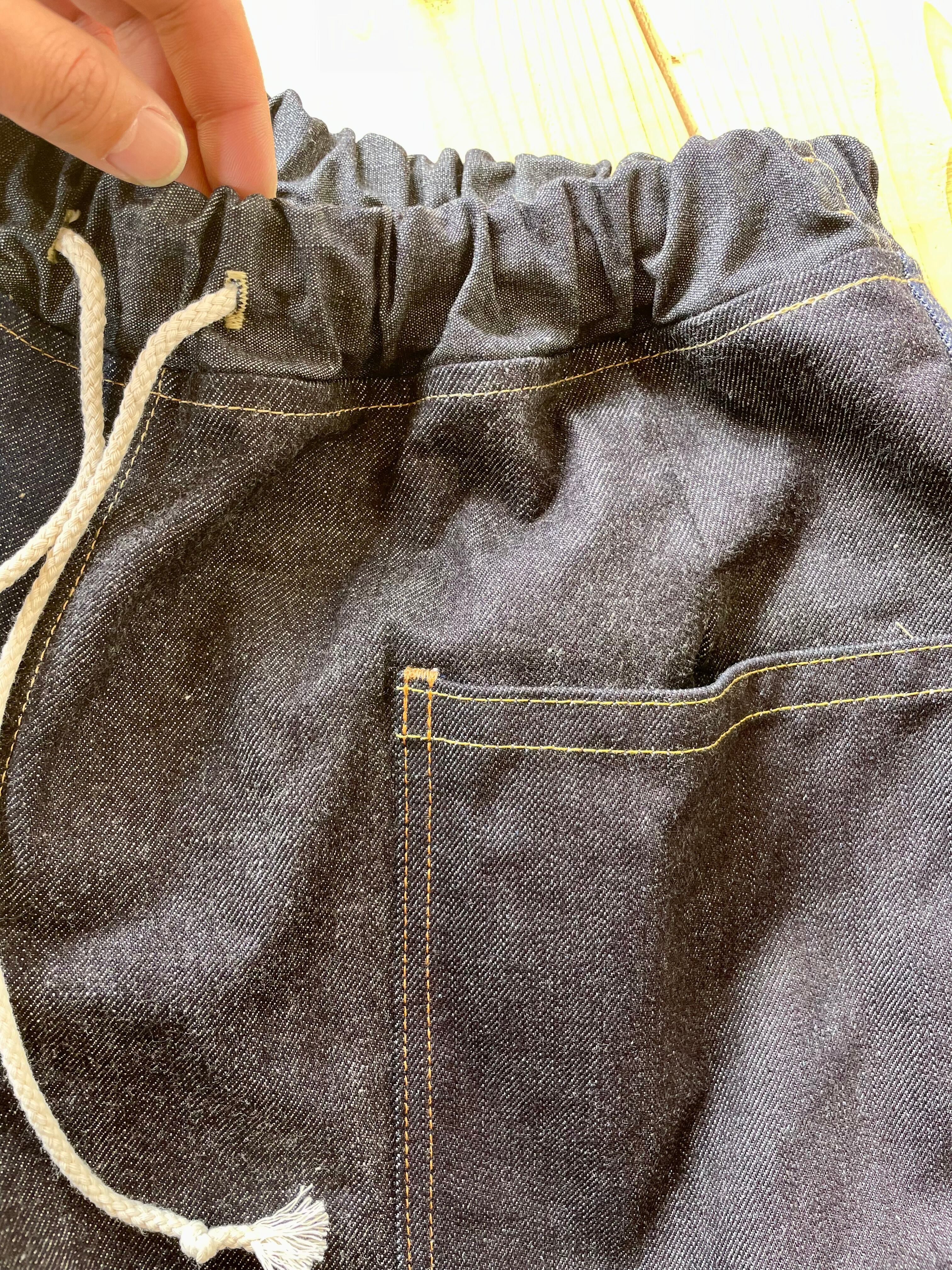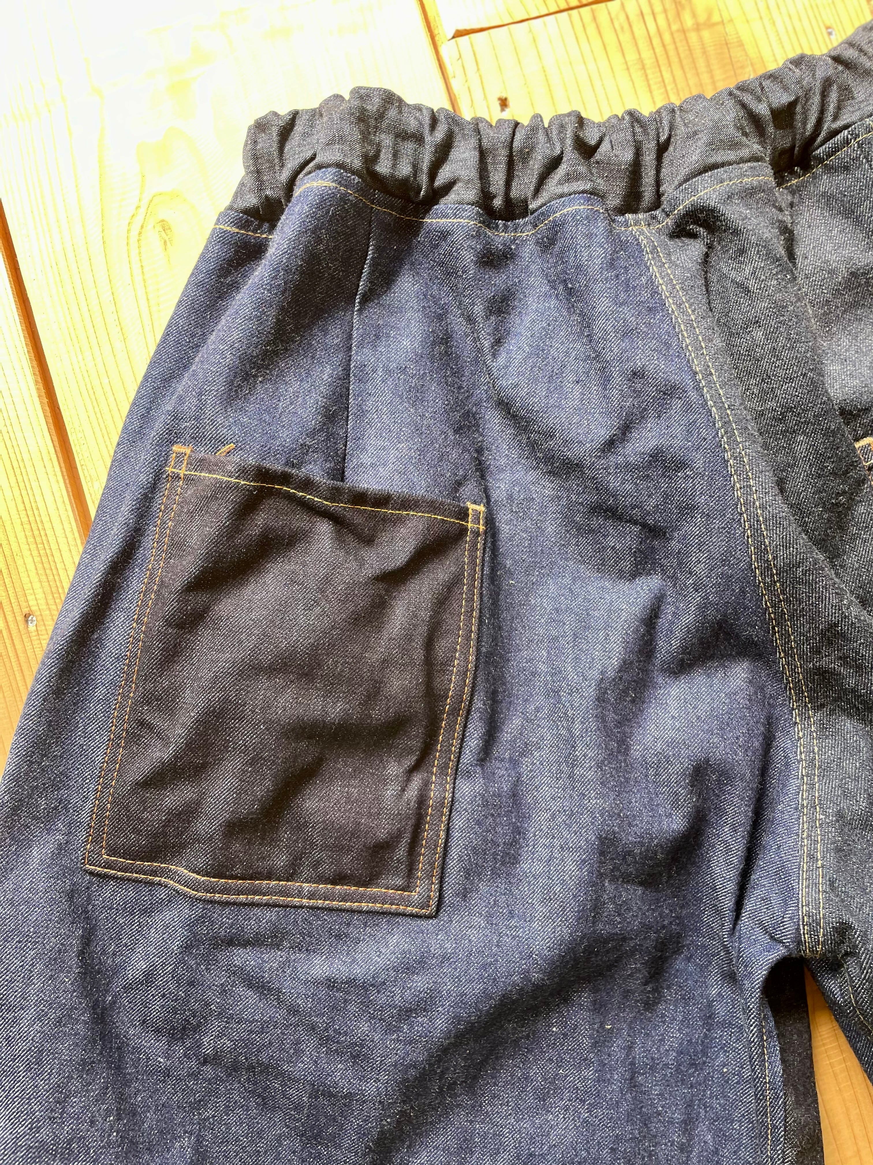 赤耳デニム生地をランダムに使って、ワイドな短パンにしました。