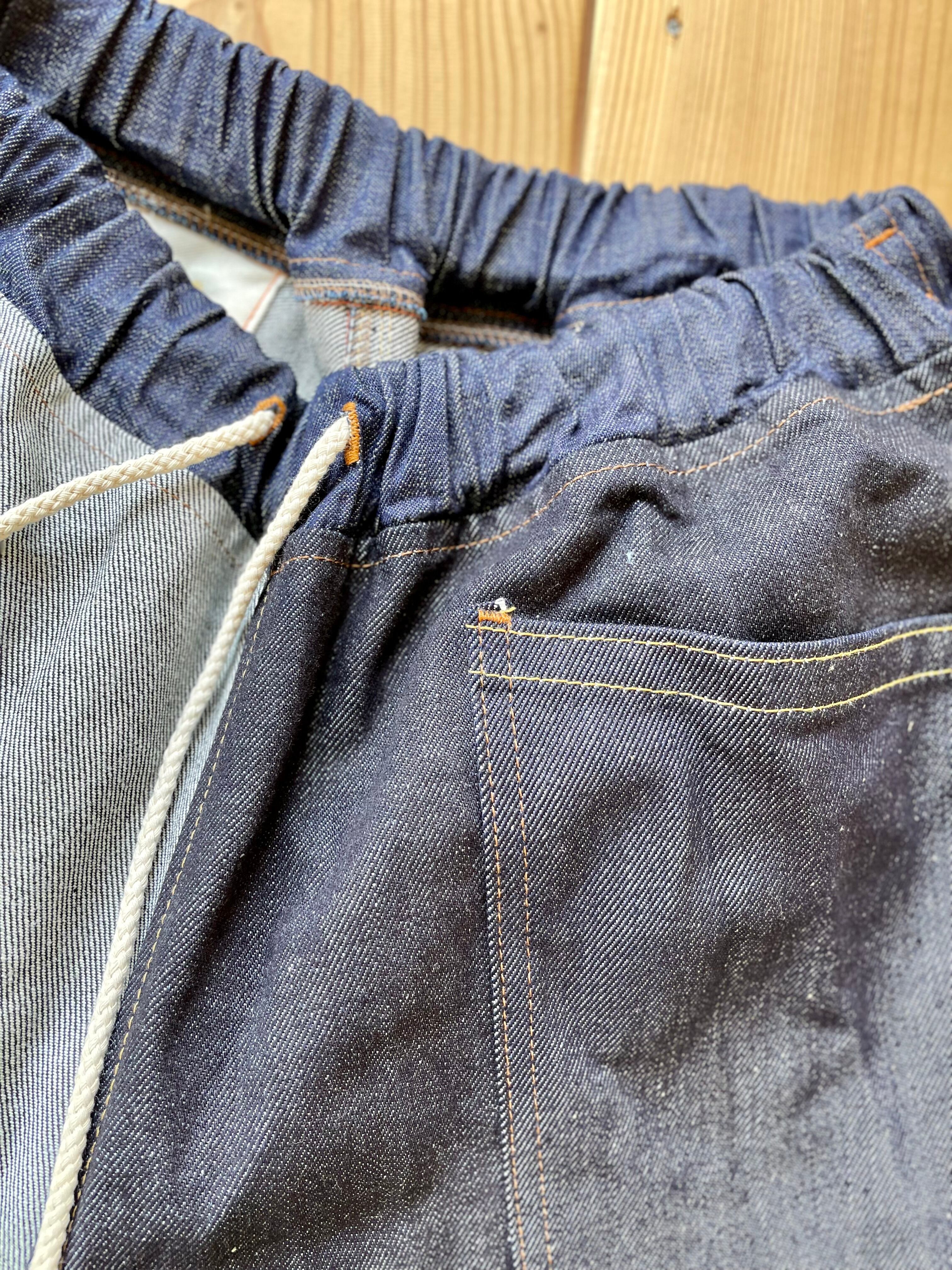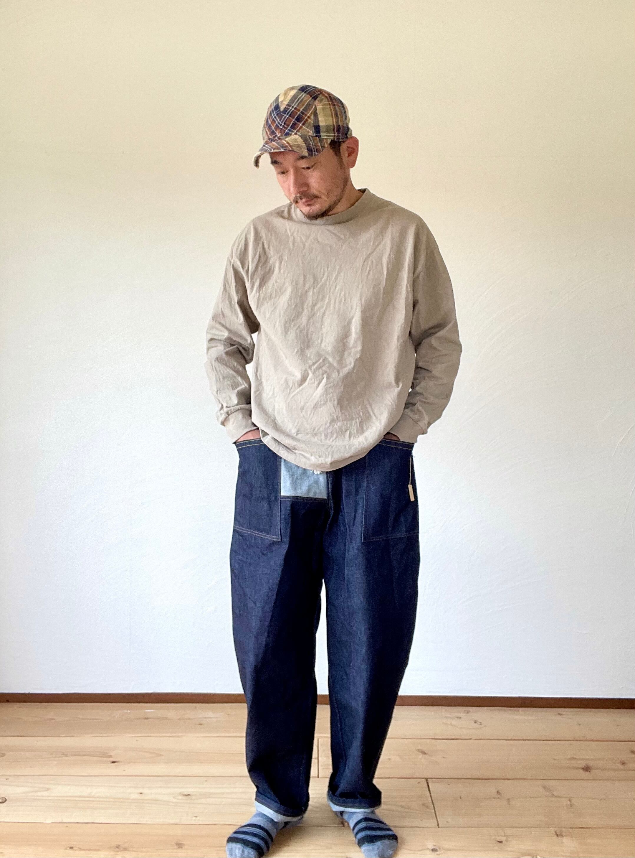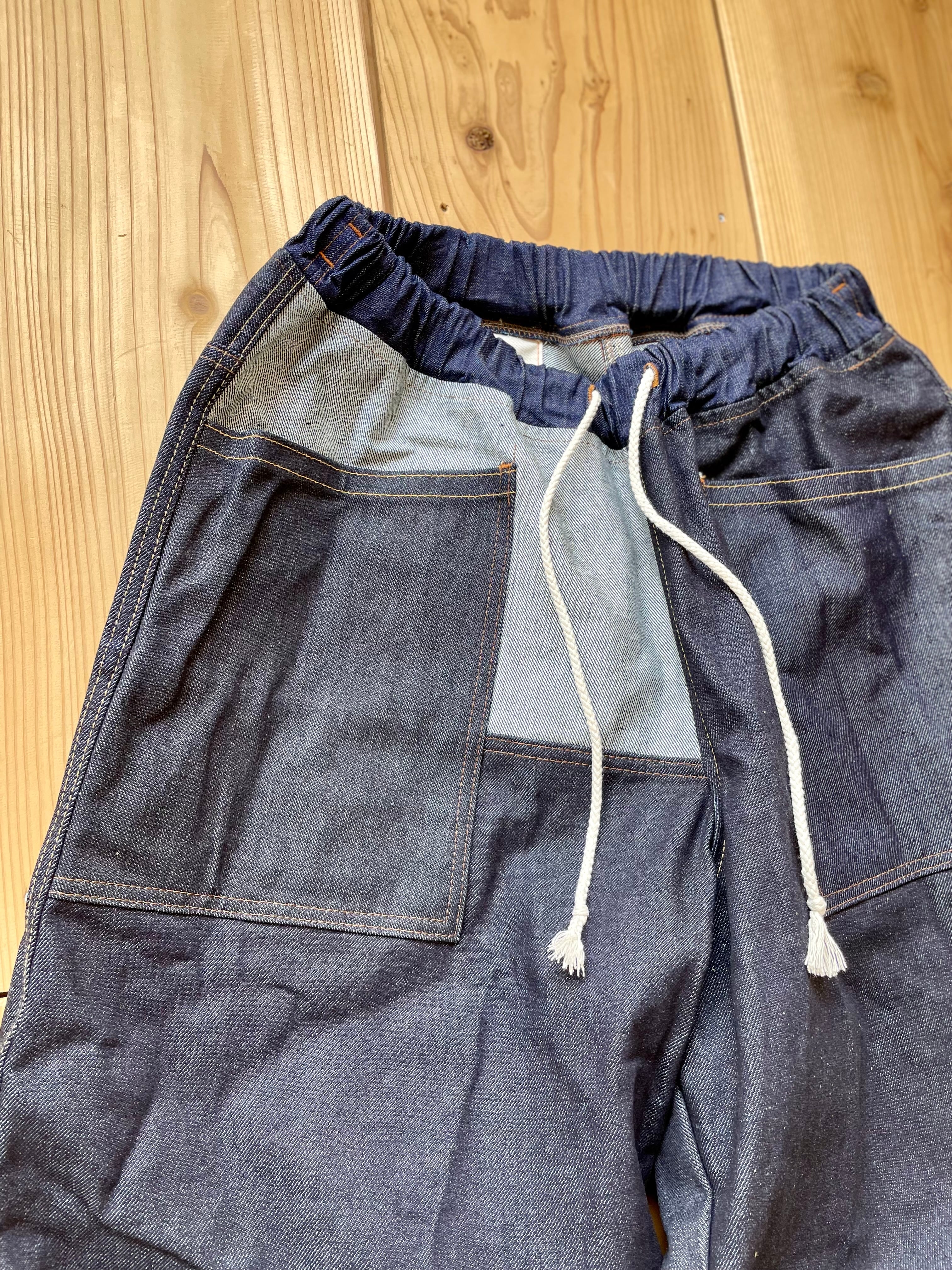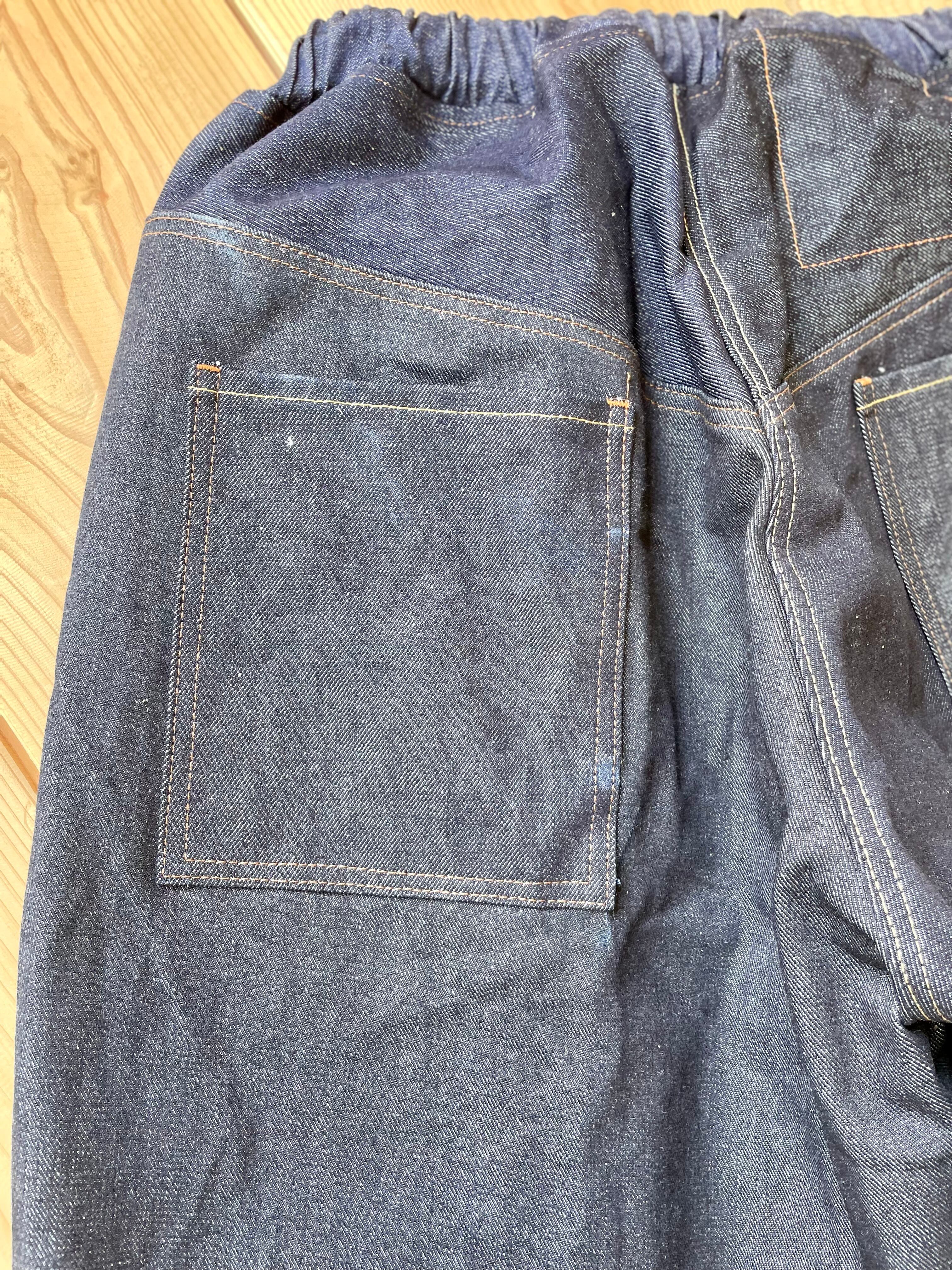 ロット違いの15オンスくらいの中厚手な生地をパーツごとにランダムに使っています。