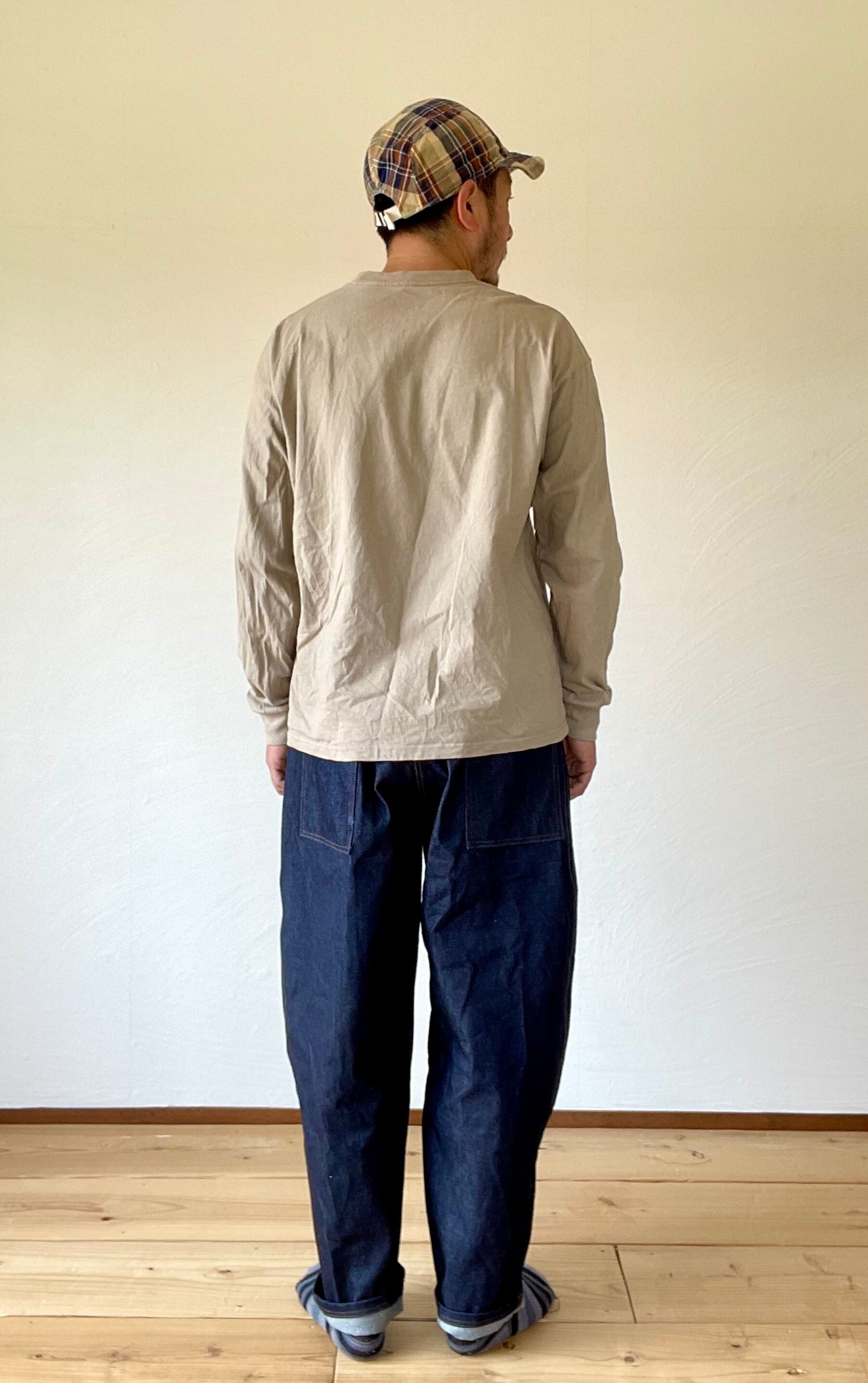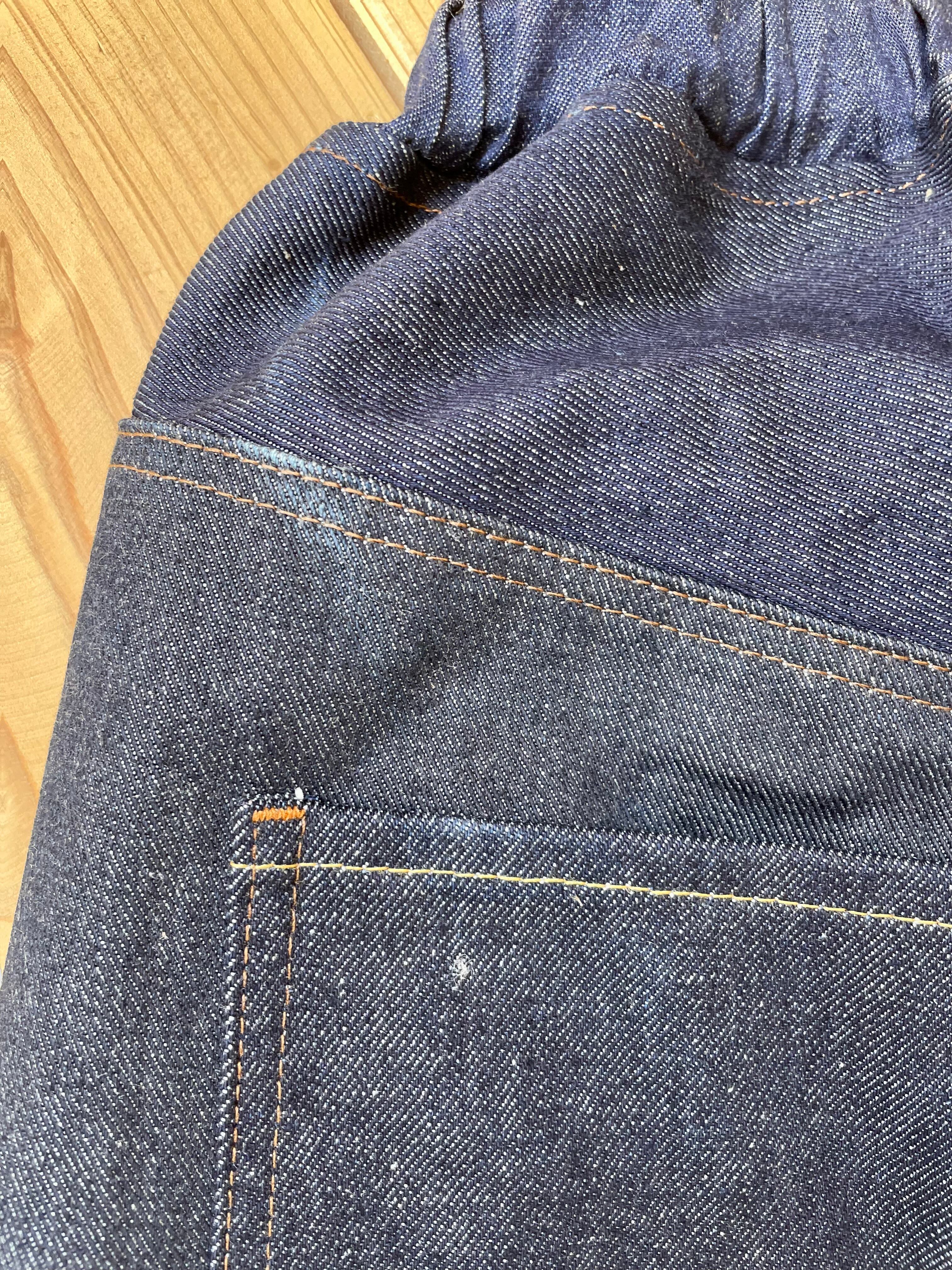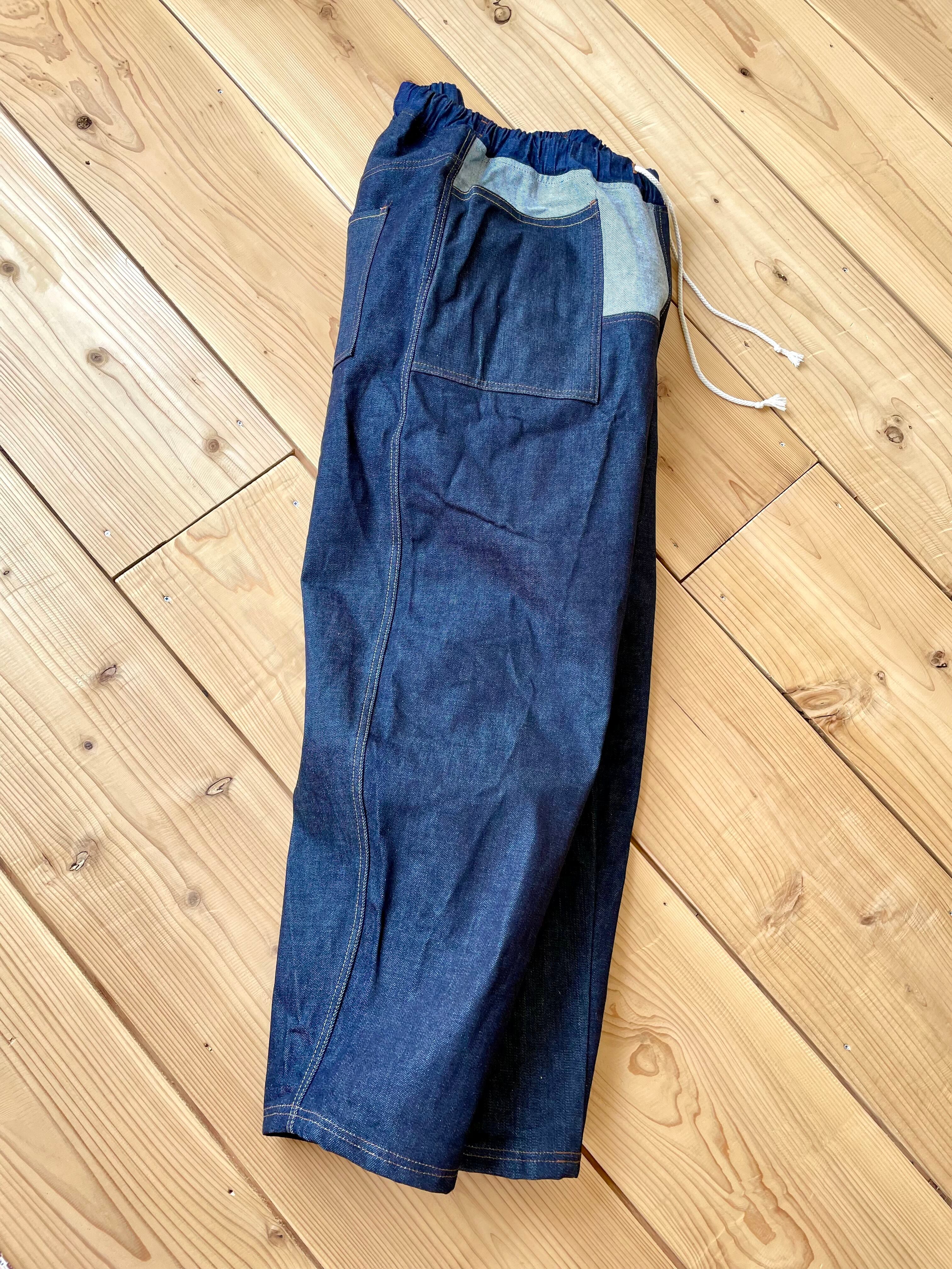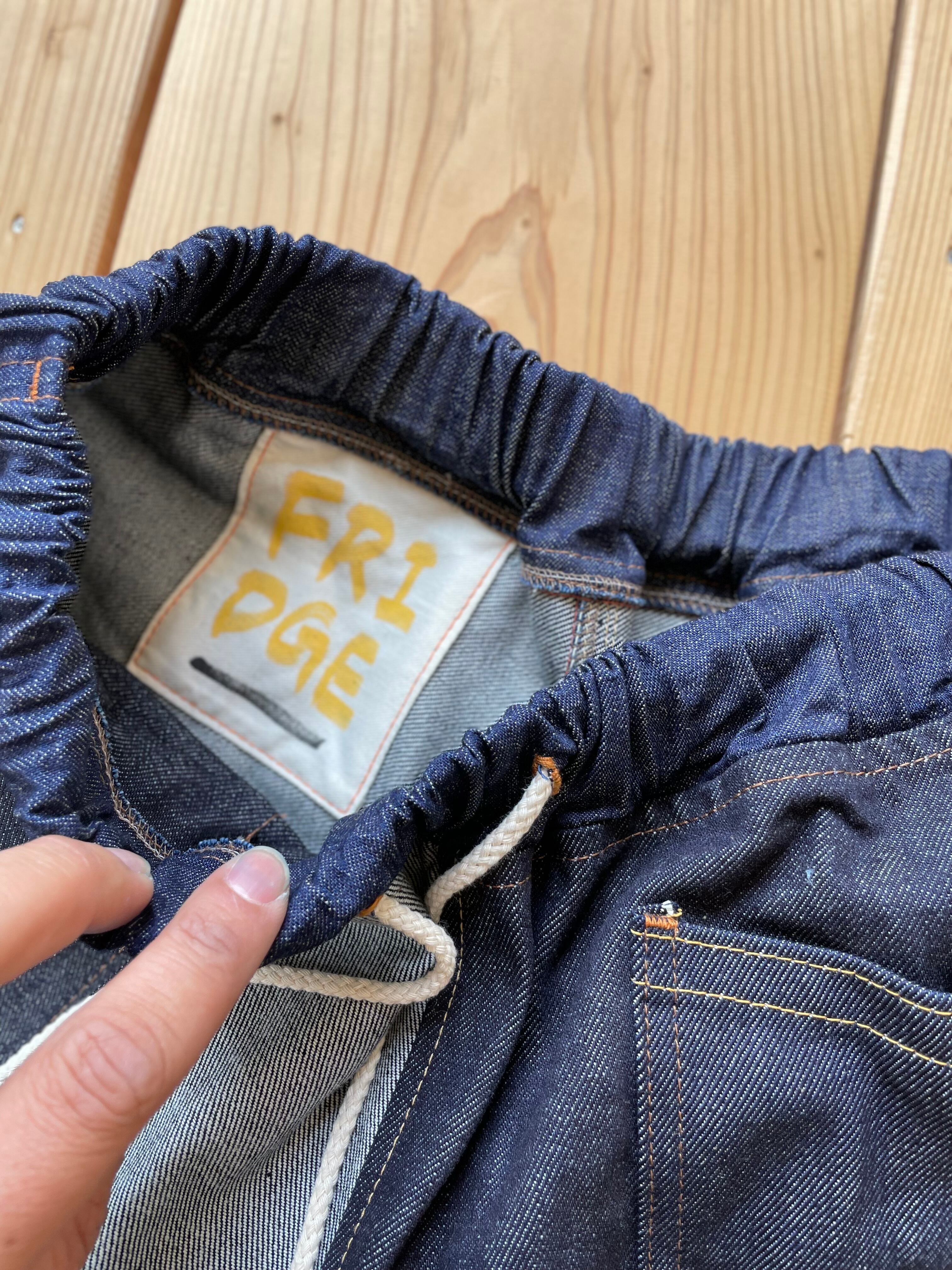 ロット違いの15オンスくらいの中厚手な生地をパーツごとにランダムに使っています。