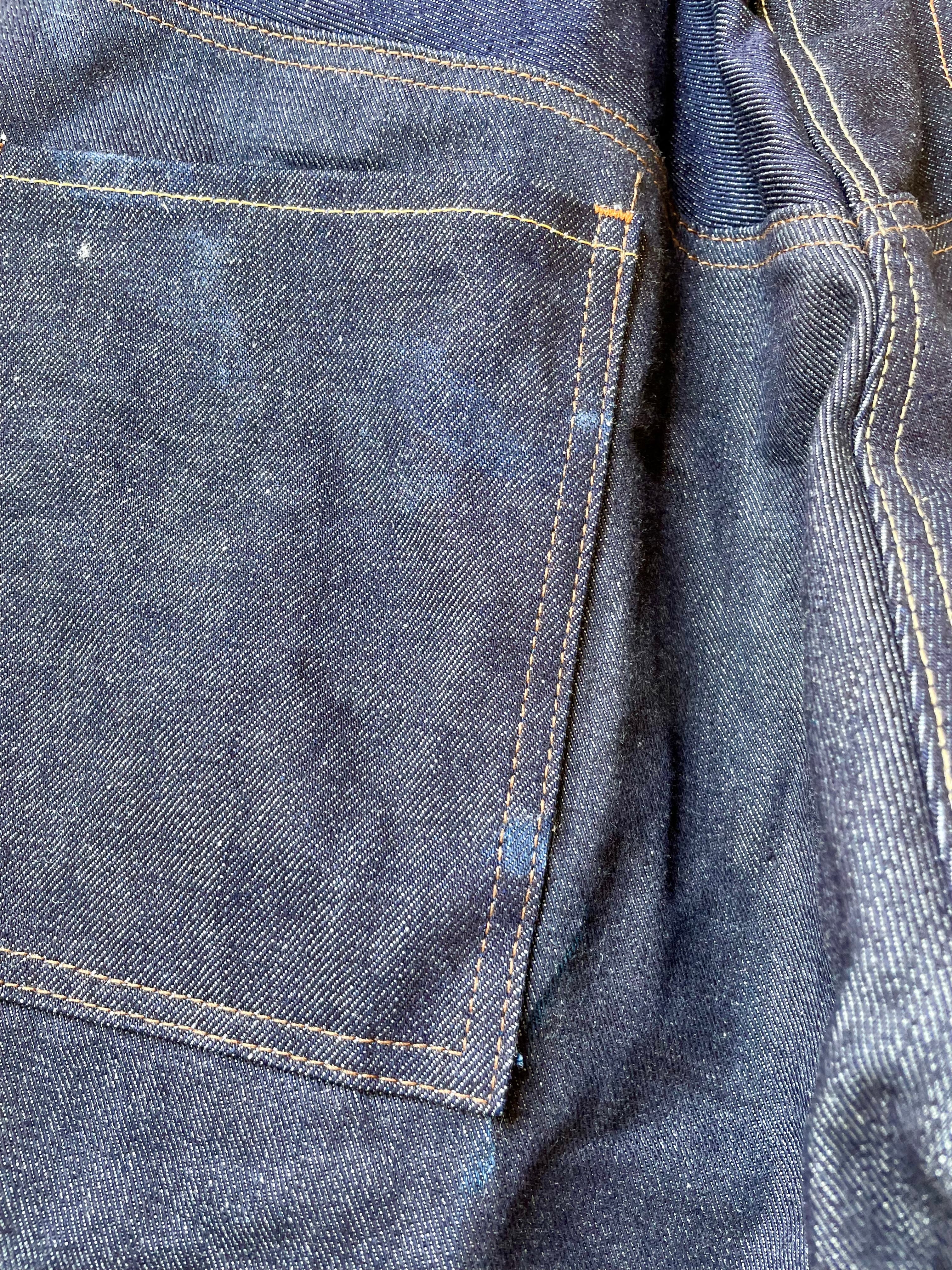 左後ろのポケットあたり、ワンウォッシュのときに一部擦れて、色落ちしています。