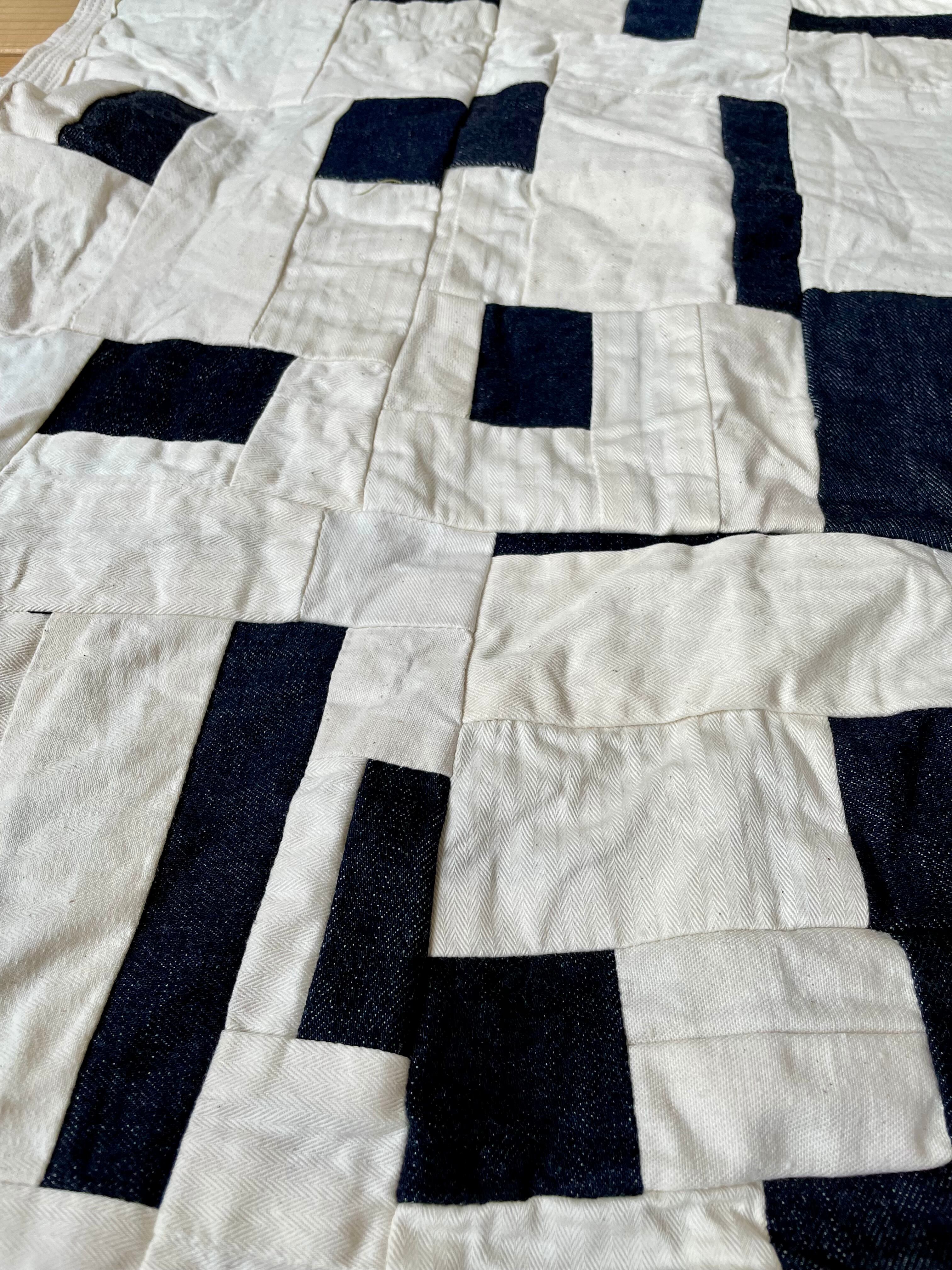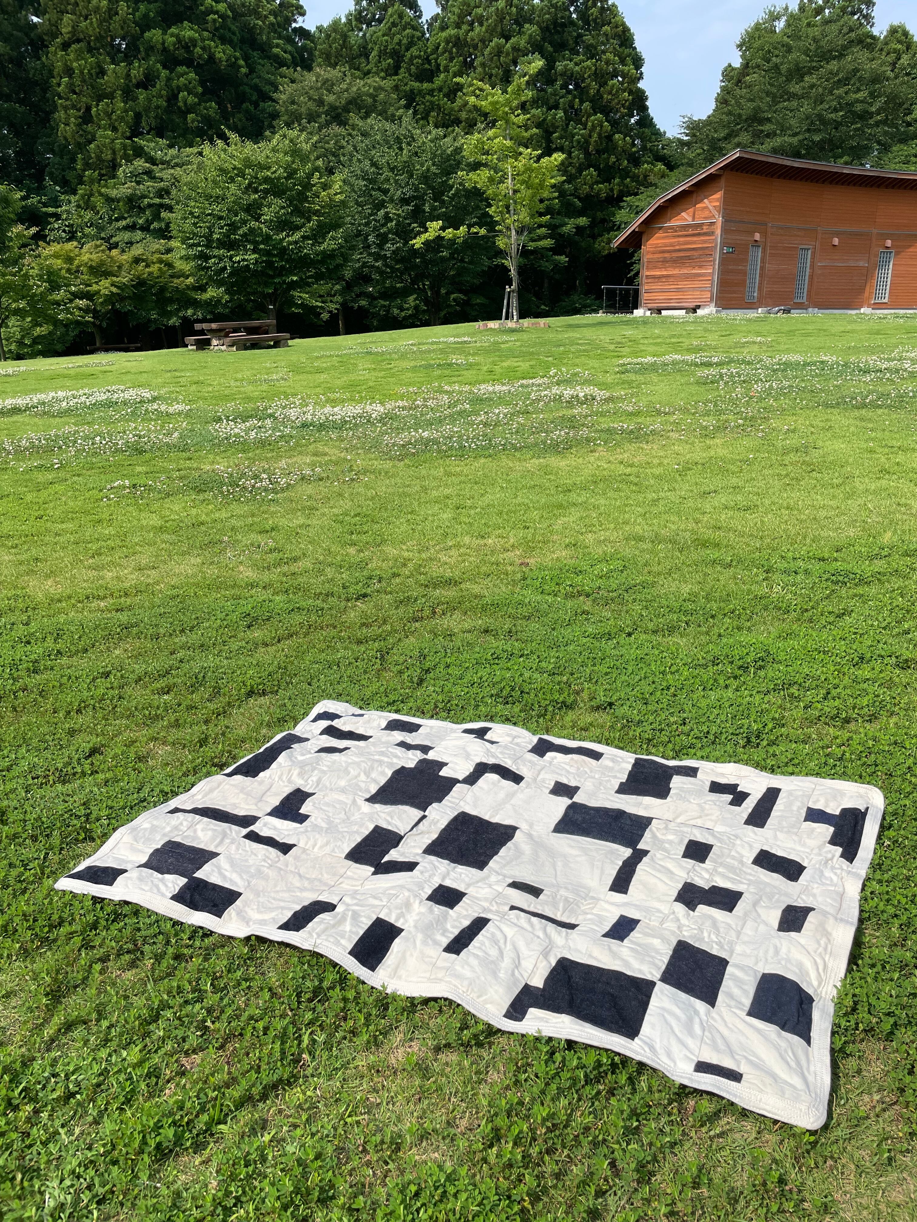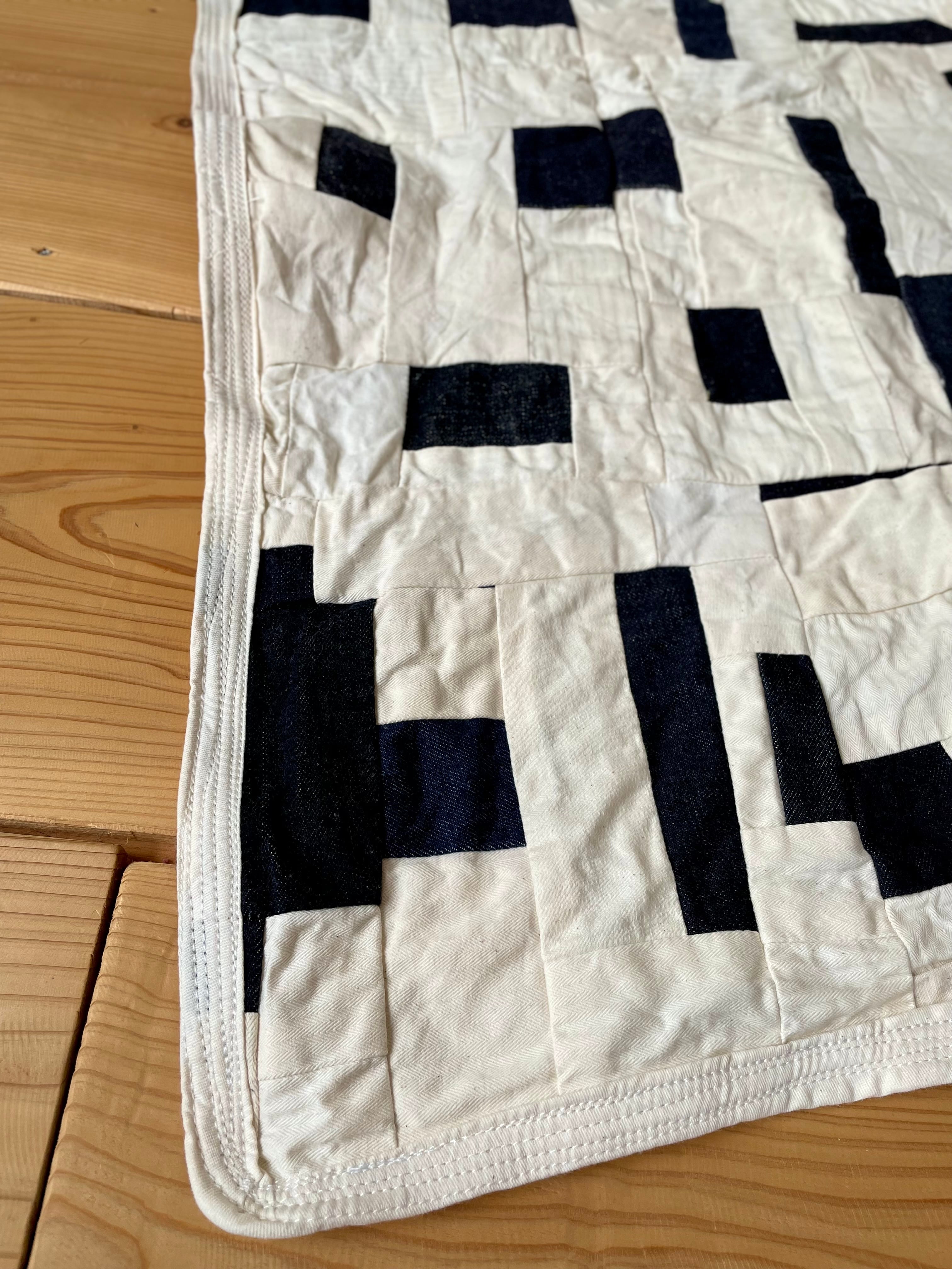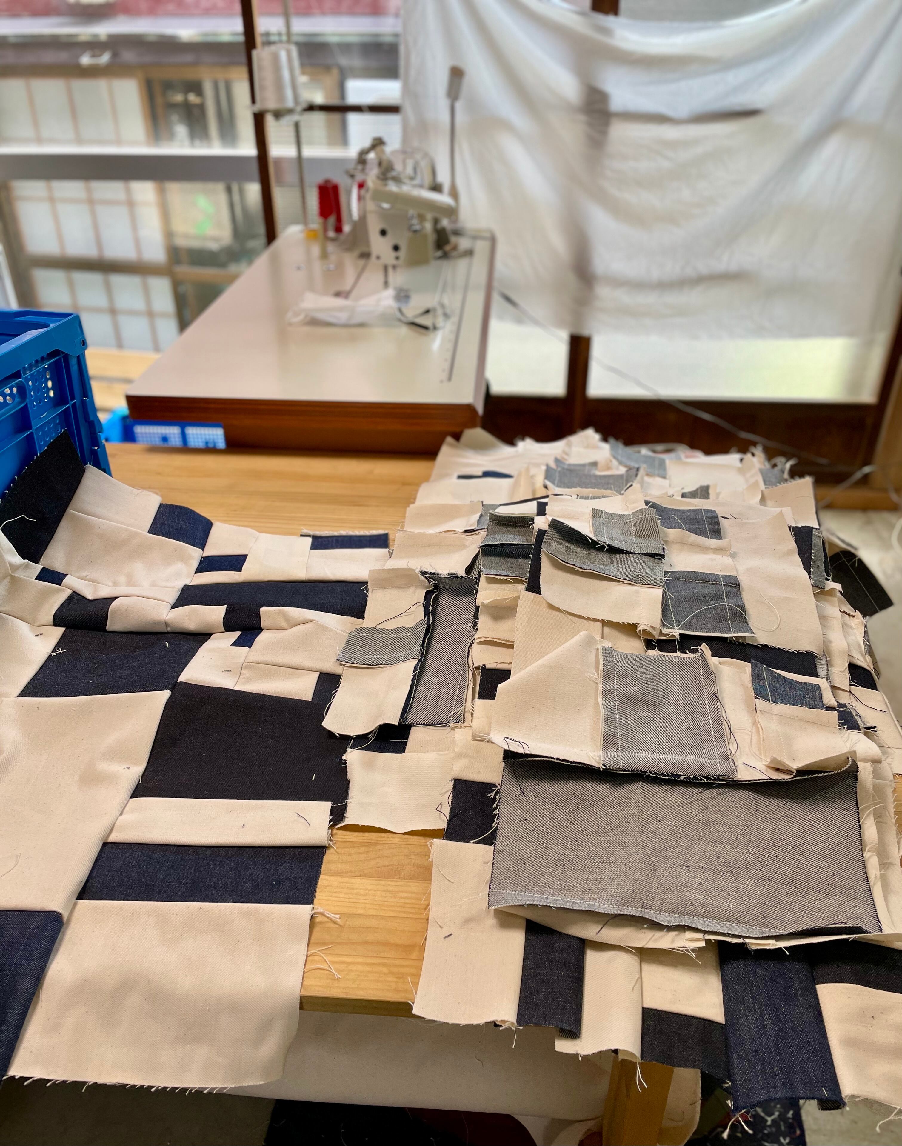 さまざまなデニム生地と白、生成り系のをひたすら縫い合わせた作品となります。