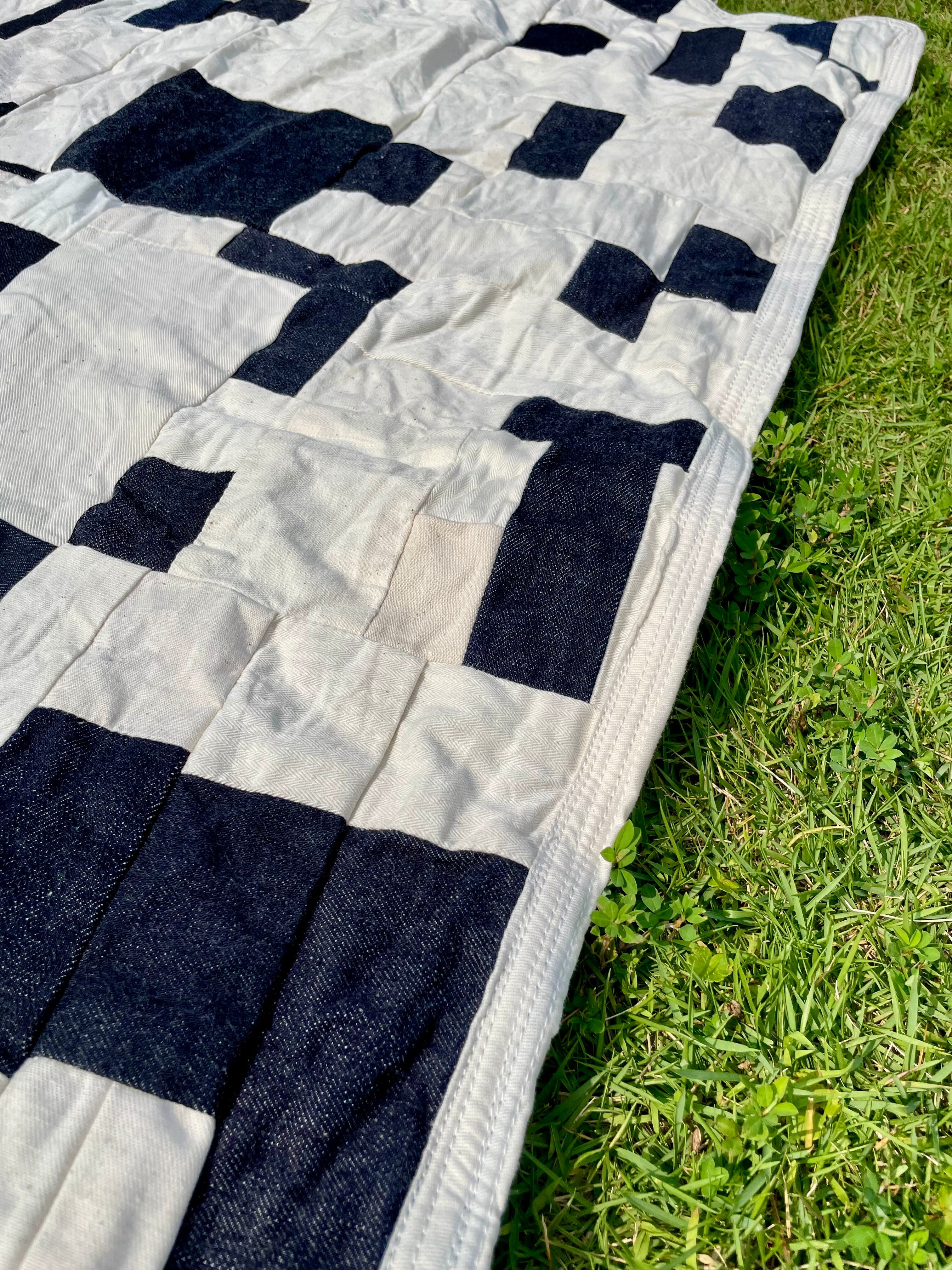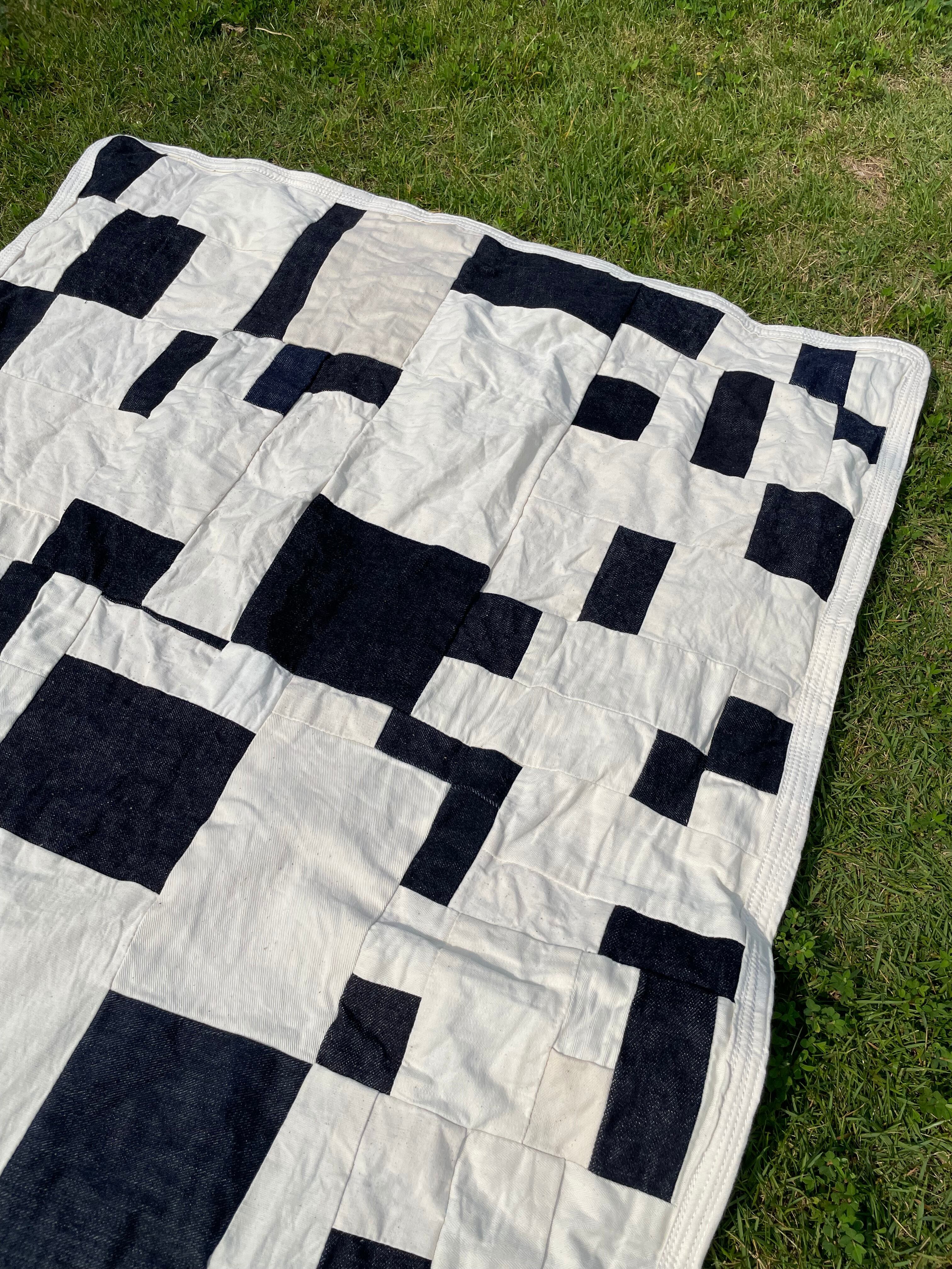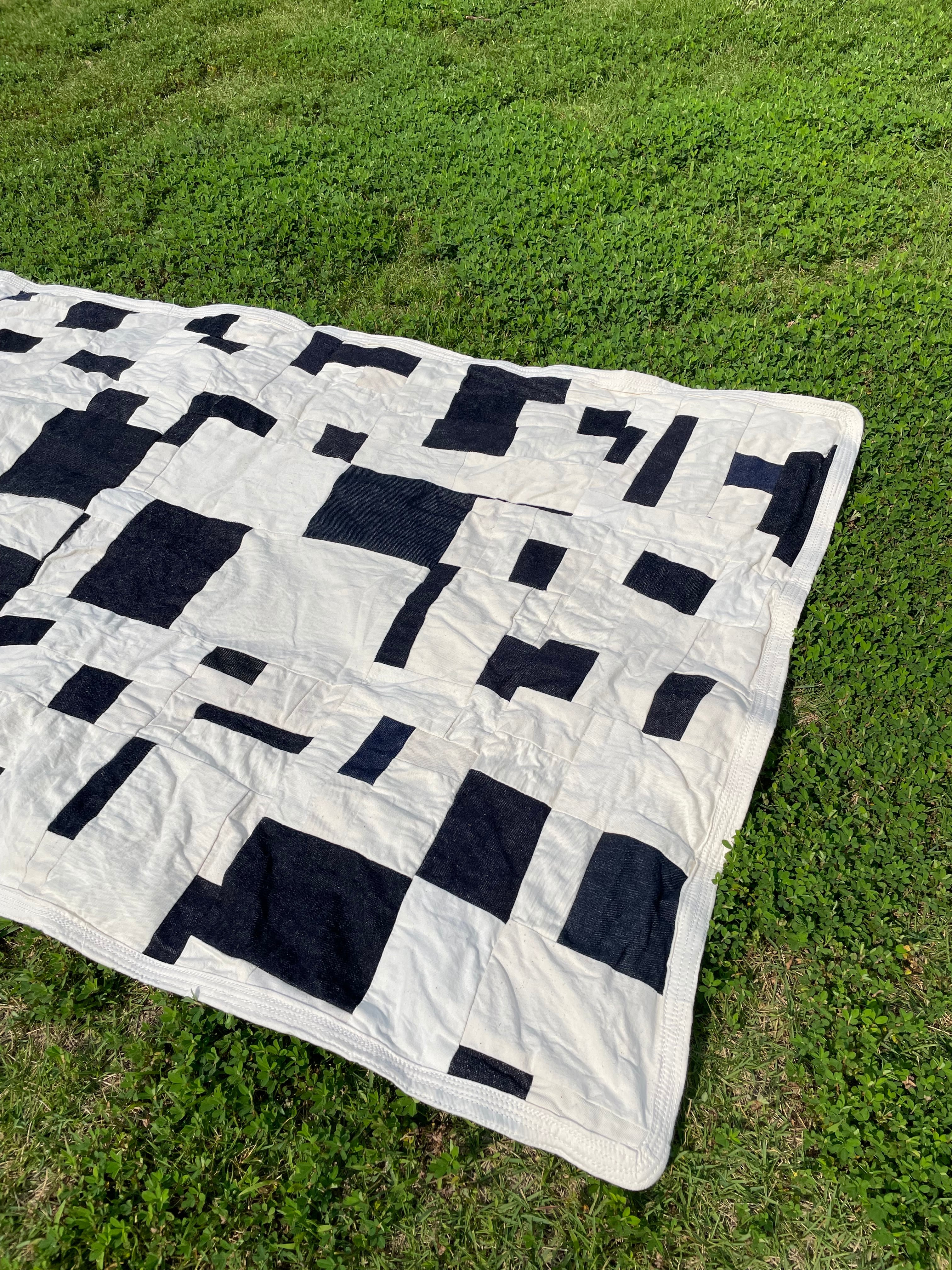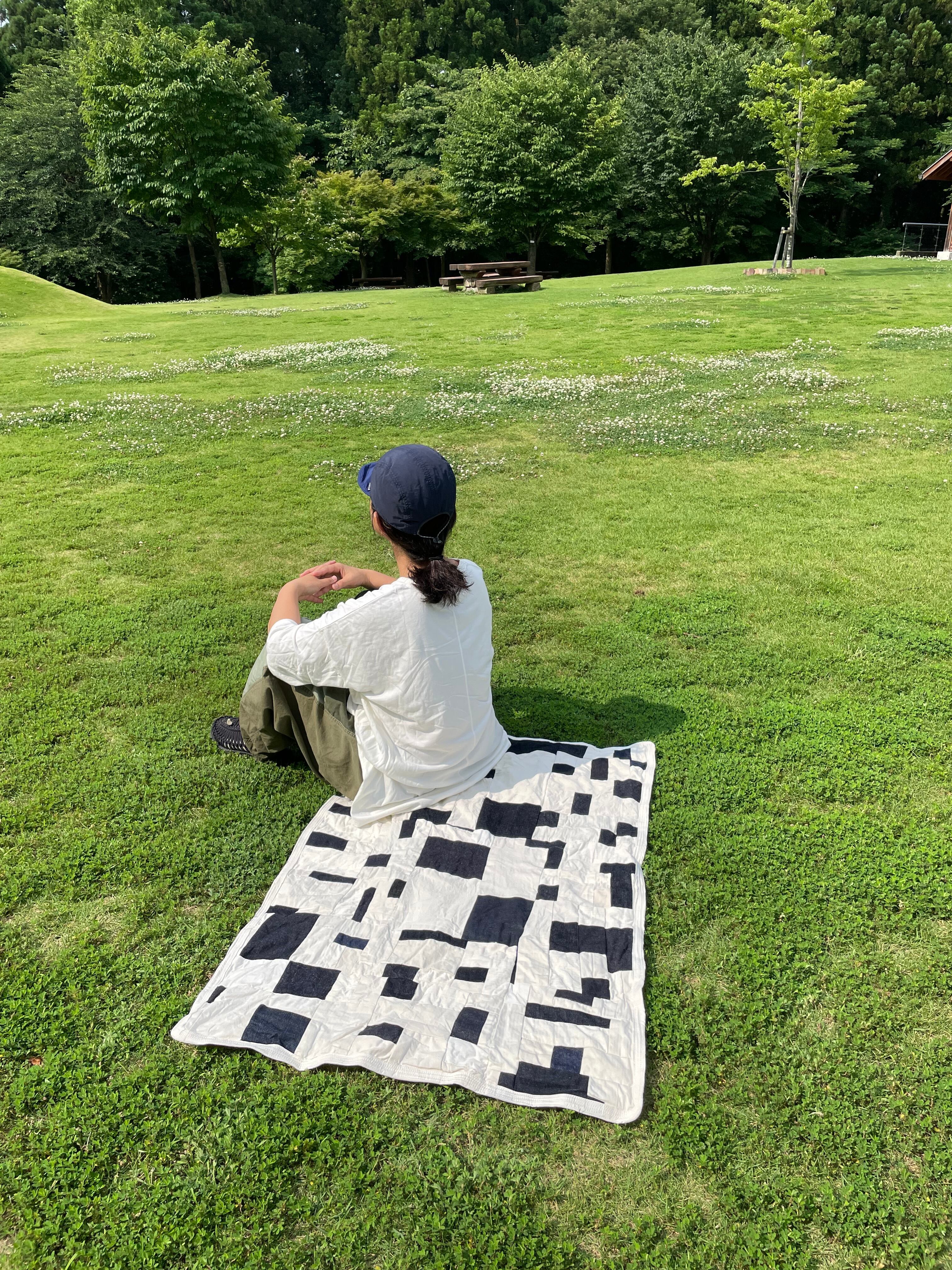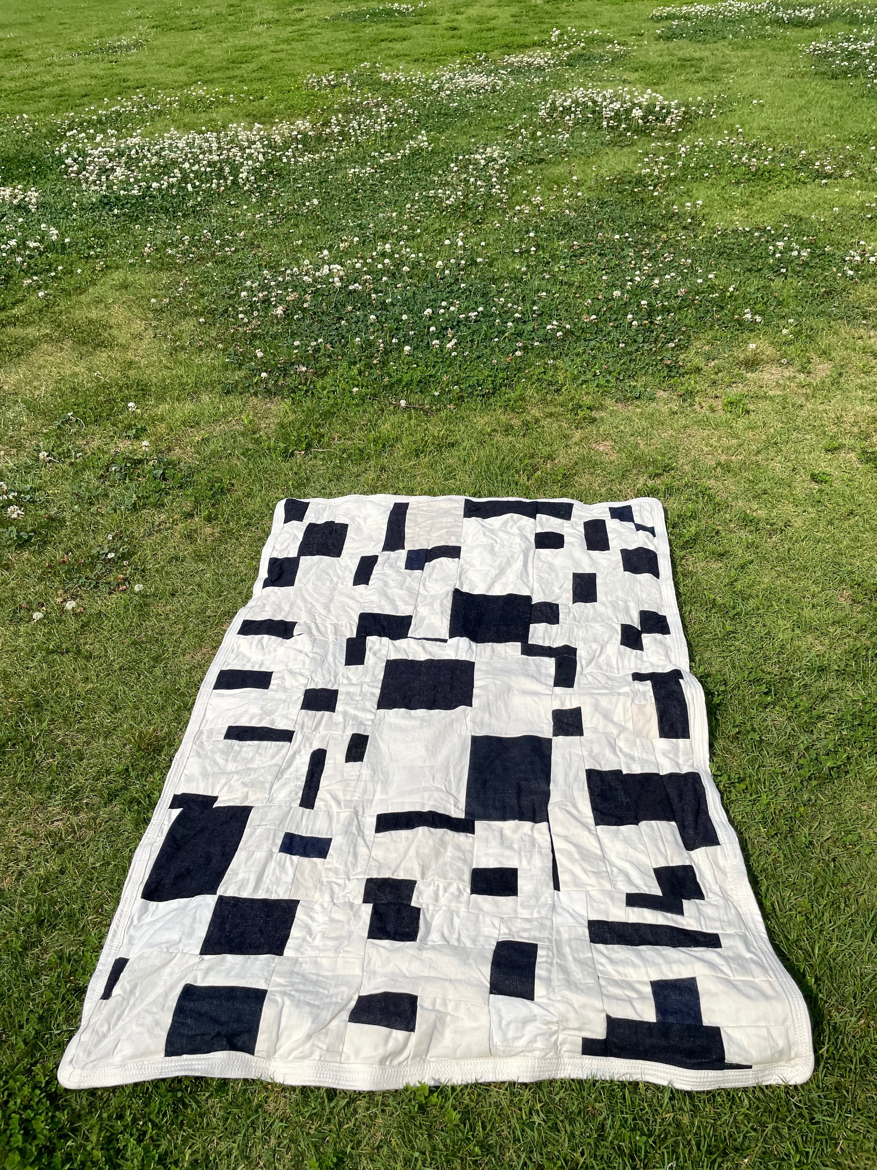 さまざまなデニム生地と白、生成り系のをひたすら縫い合わせた作品となります。