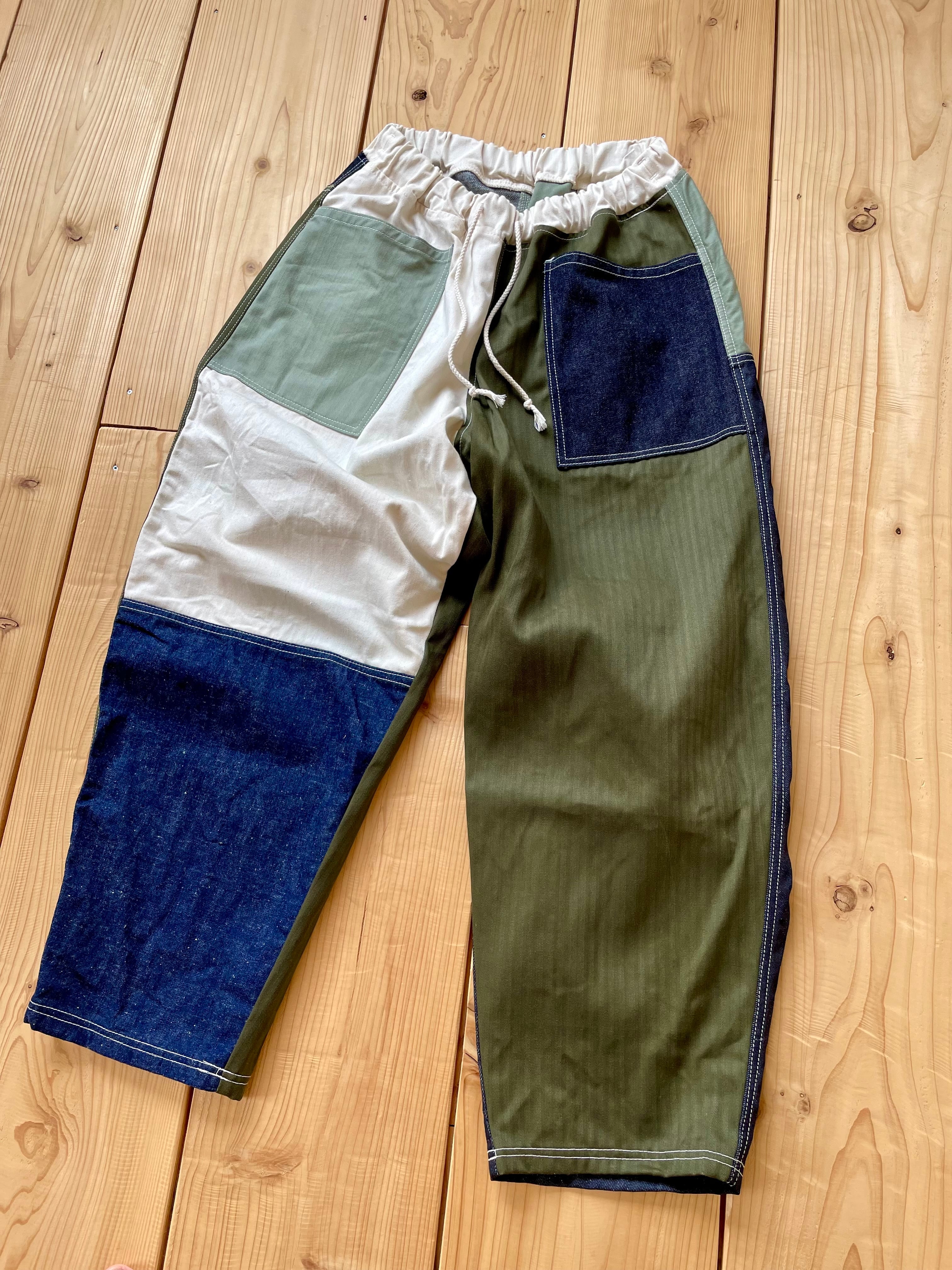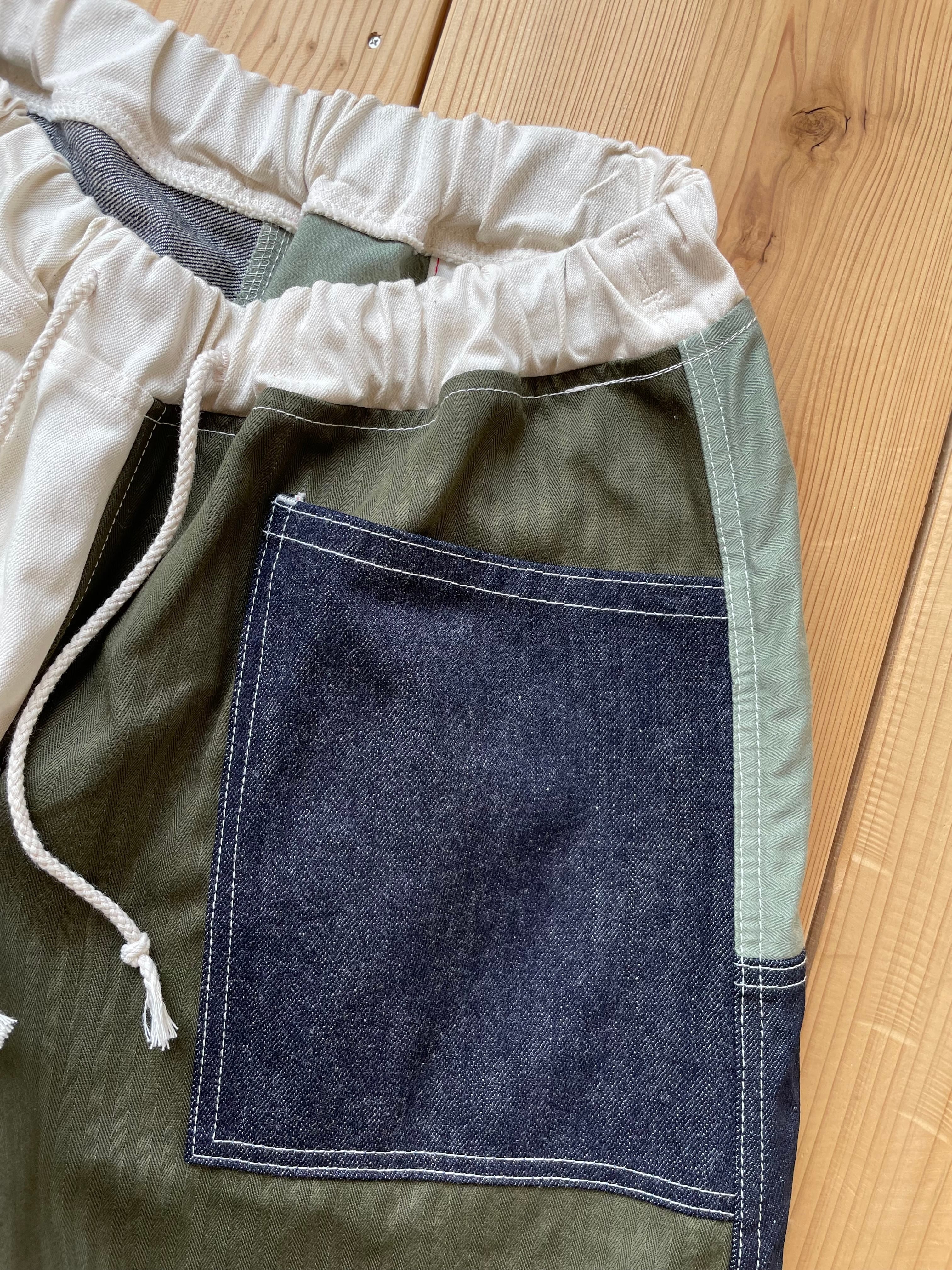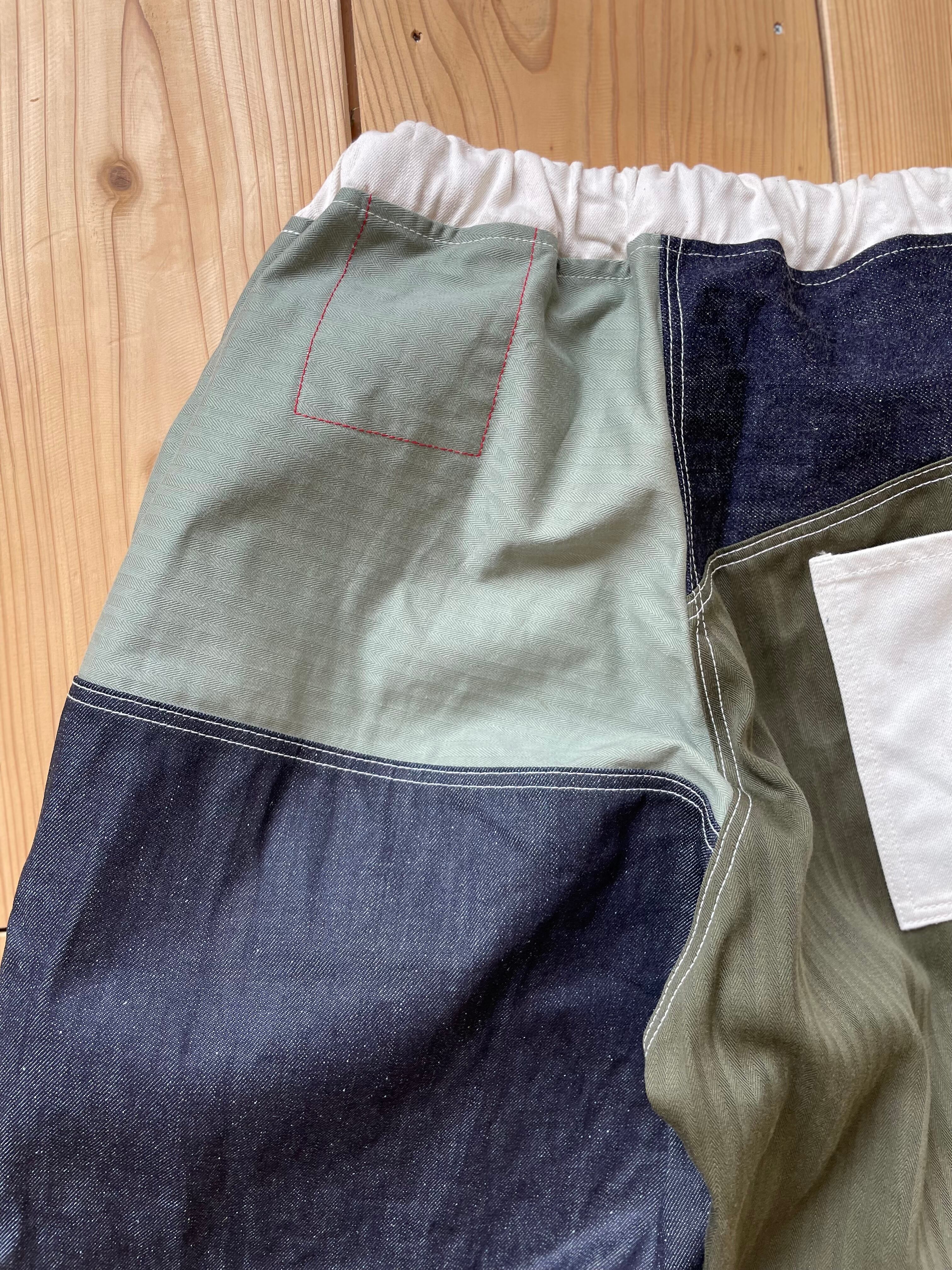 デニム、カーキ、生成り系の中厚手な生地をパーツごとにランダムに使っています。