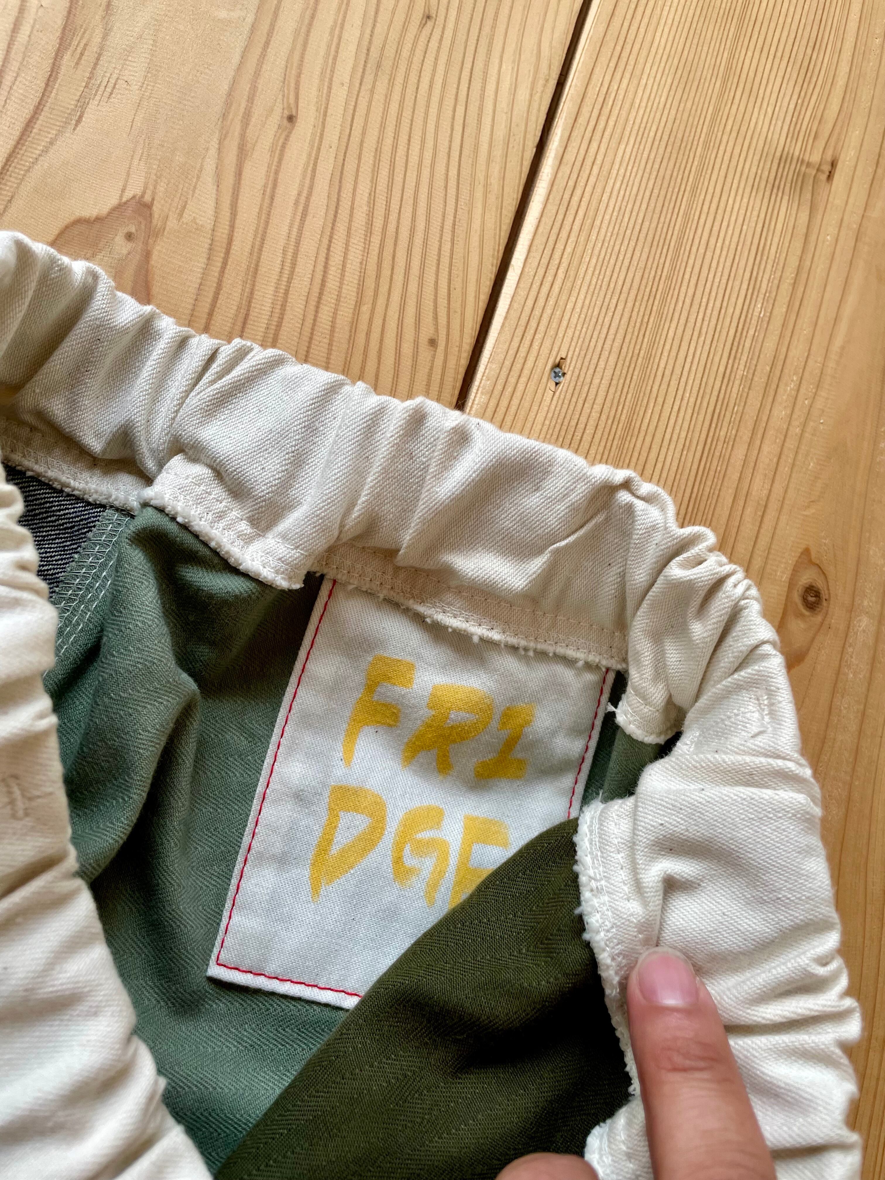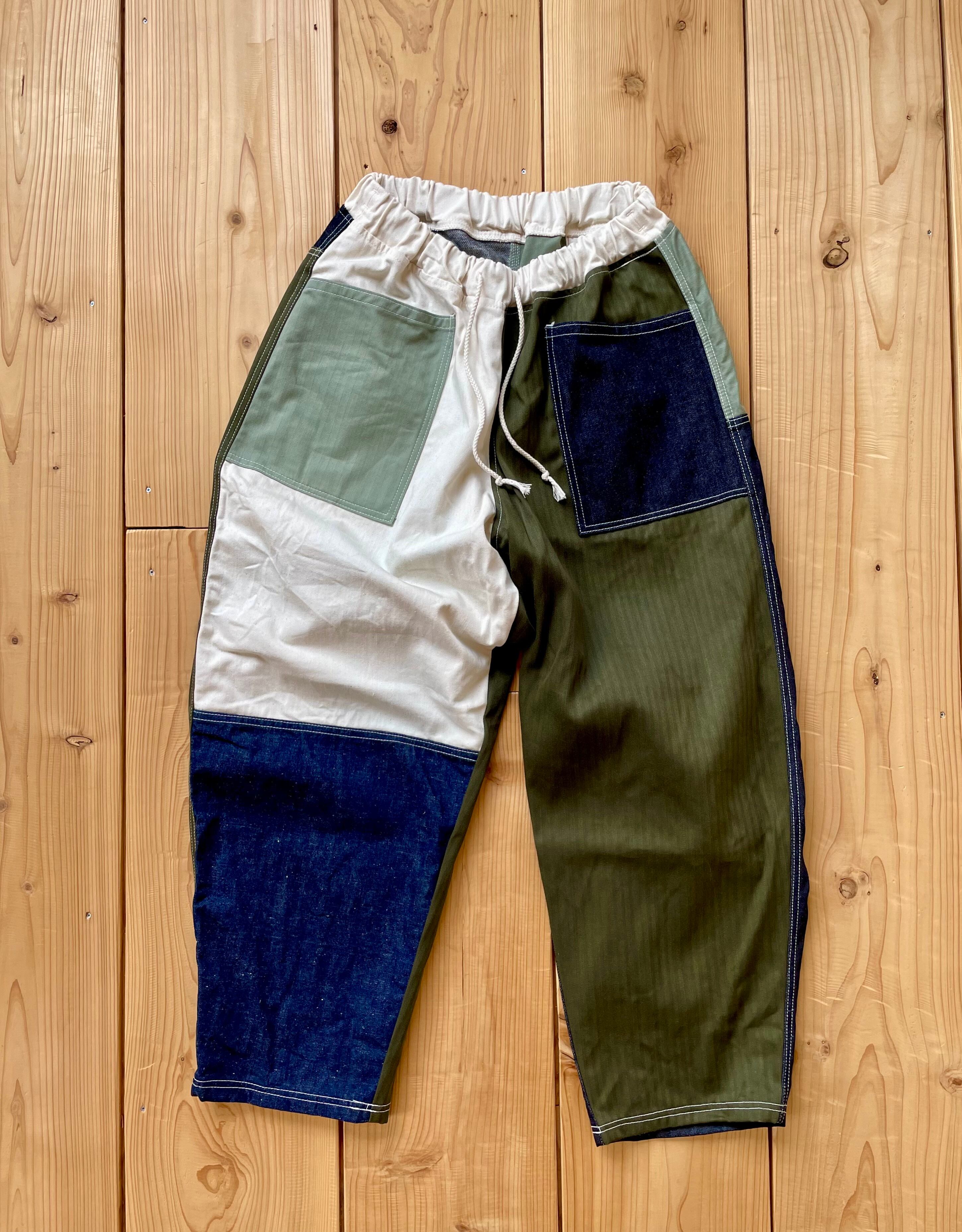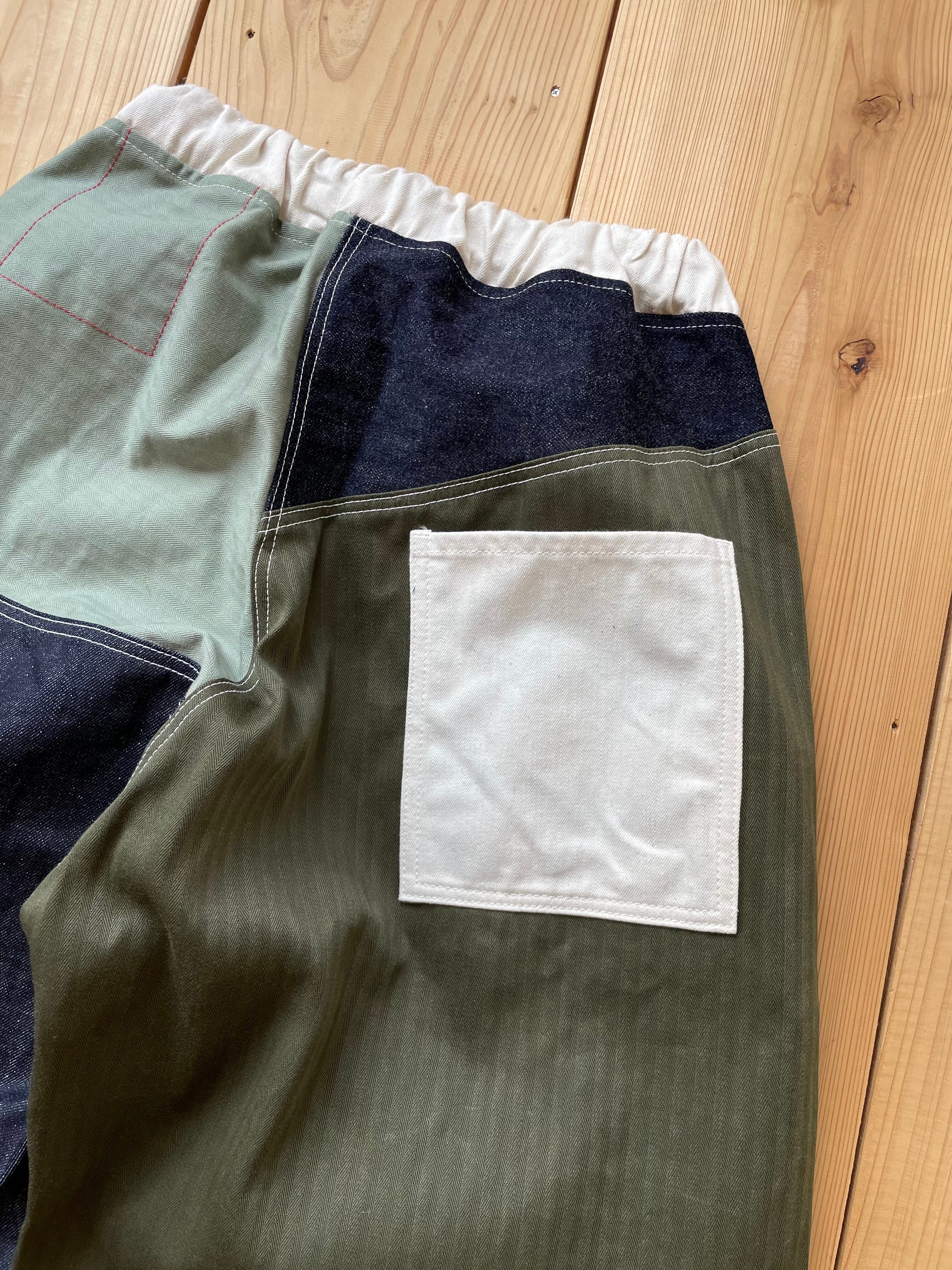 デニム、カーキ、生成り系の中厚手な生地をパーツごとにランダムに使っています。