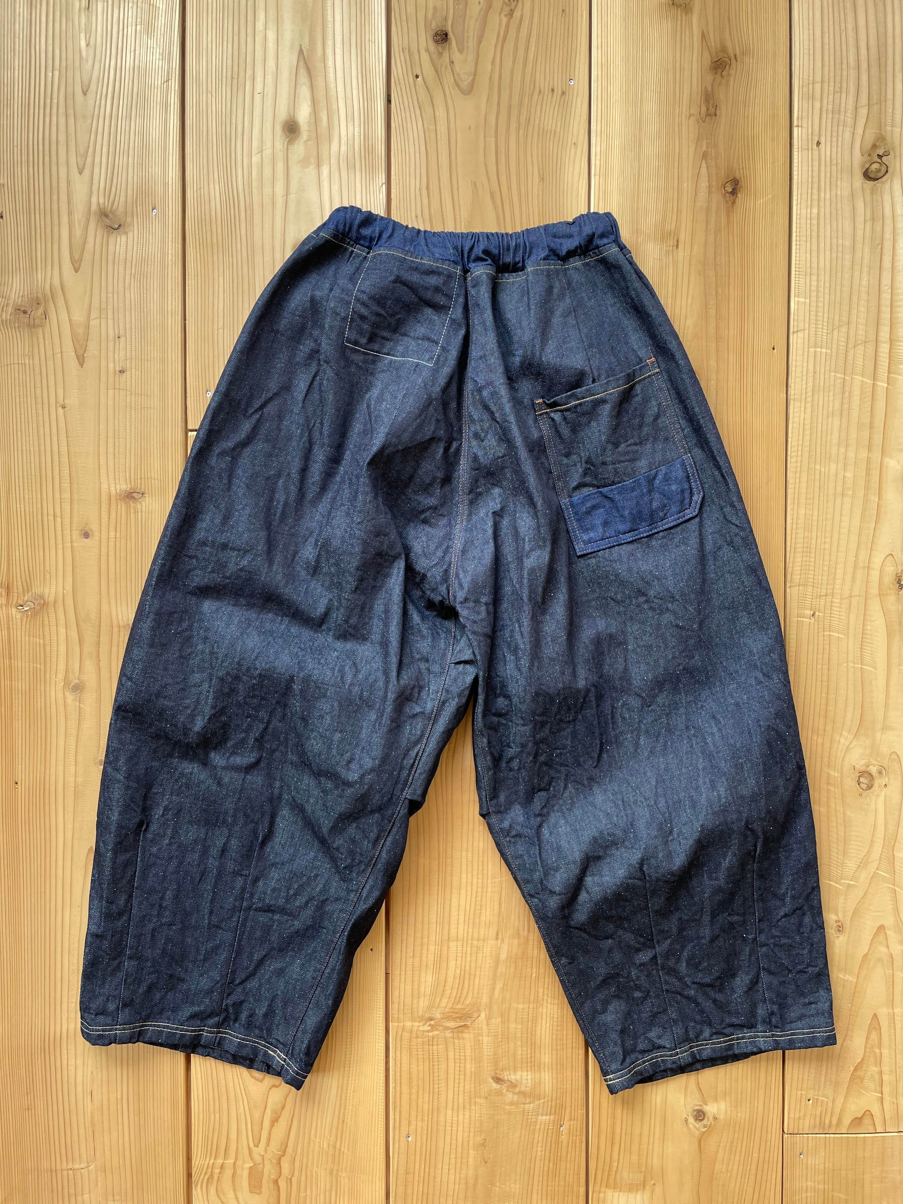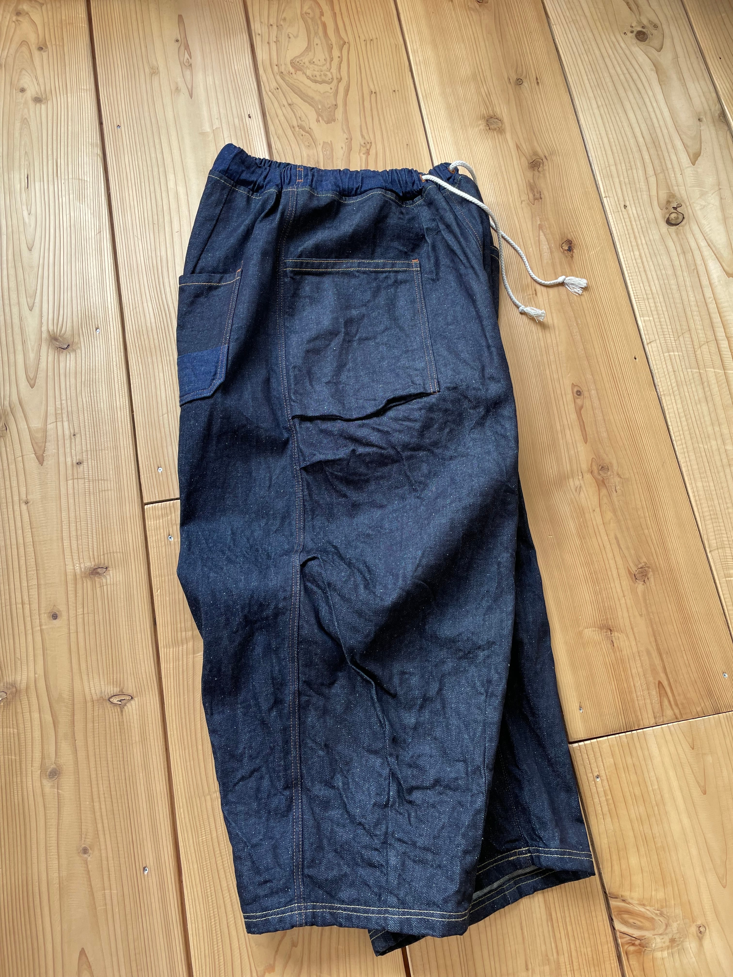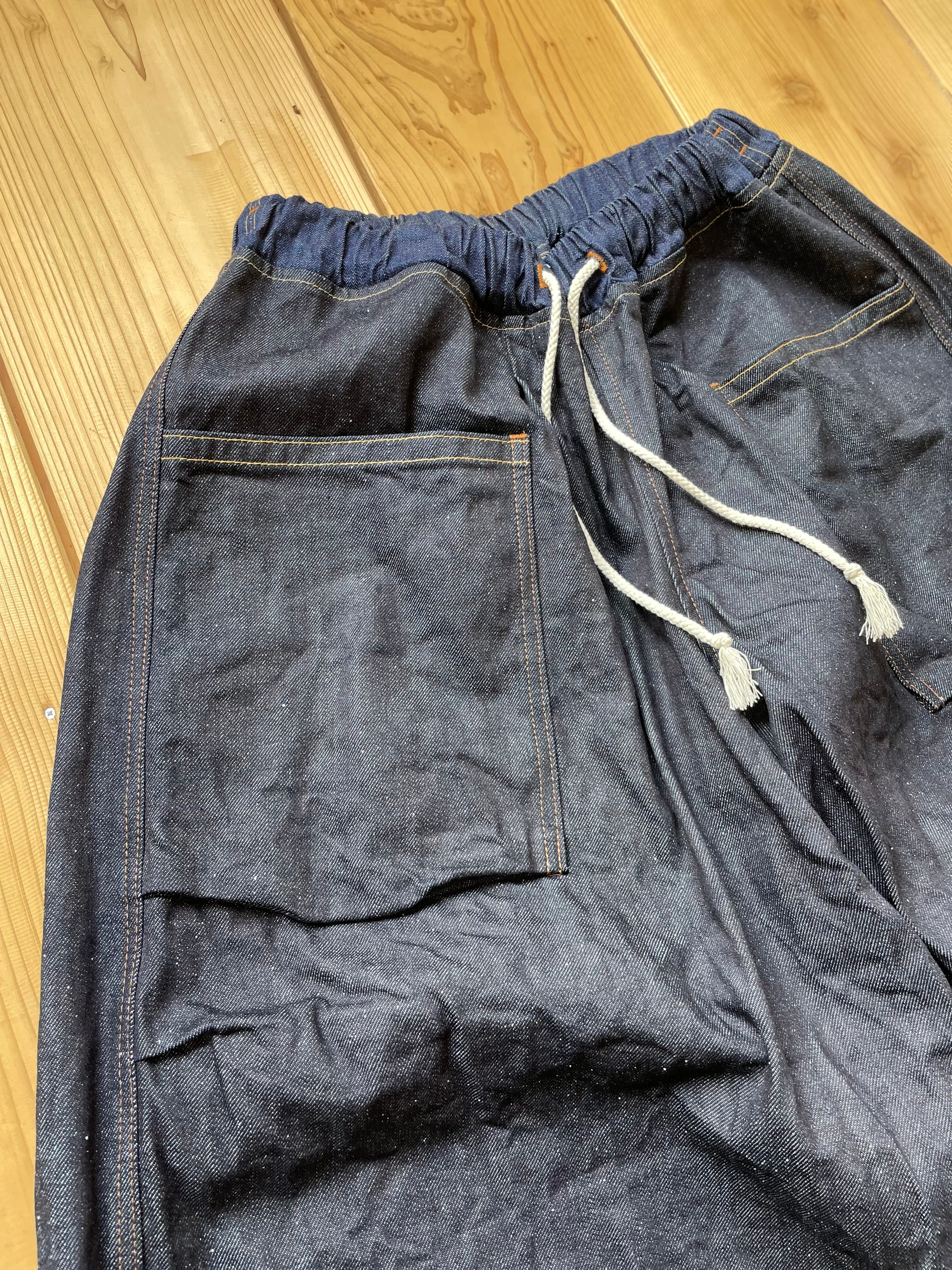 厚すぎないフワッとなる14オンスくらいの国産デニム生地で、ダーツやタックが入ってるワイドパンツです。