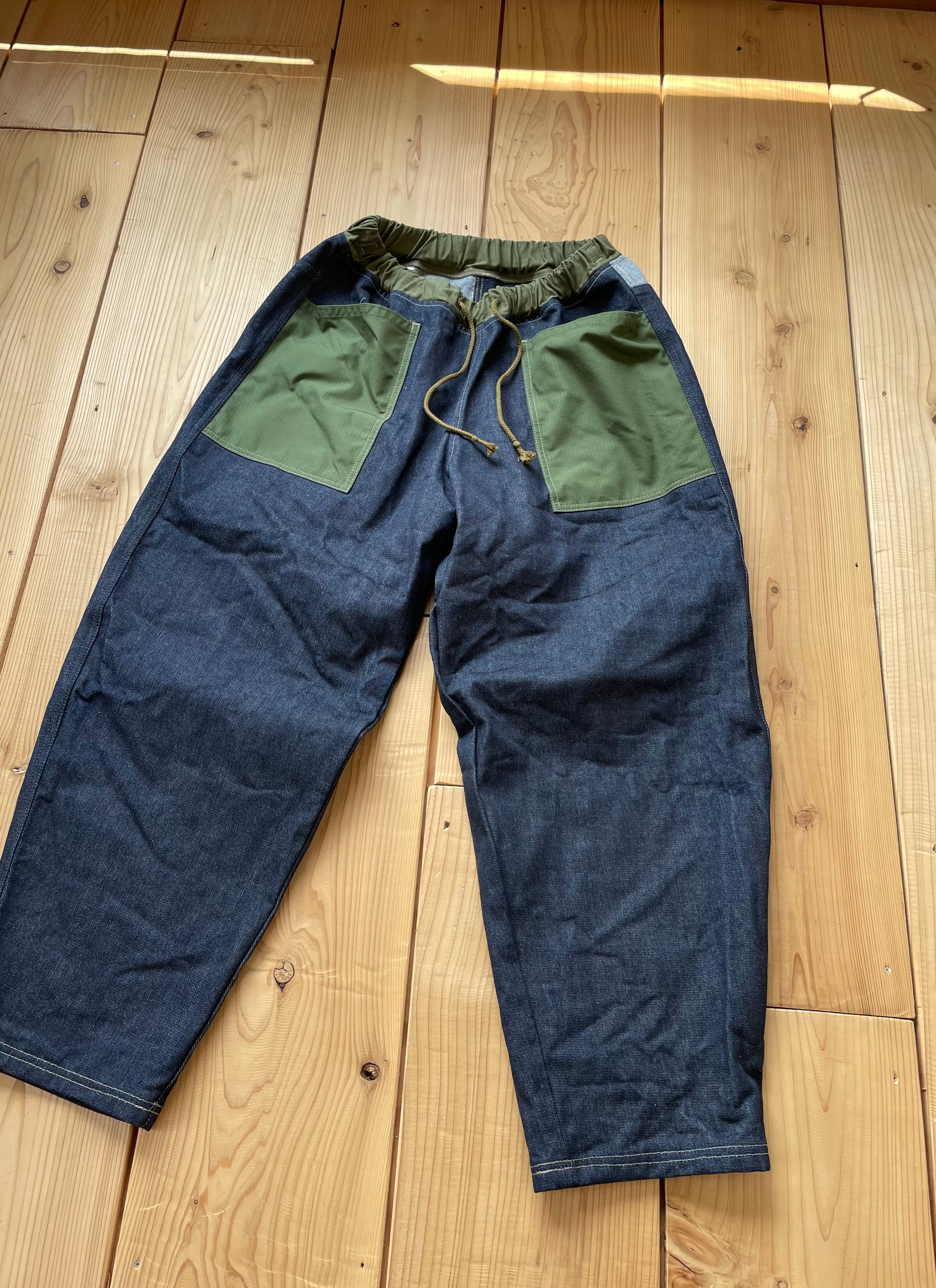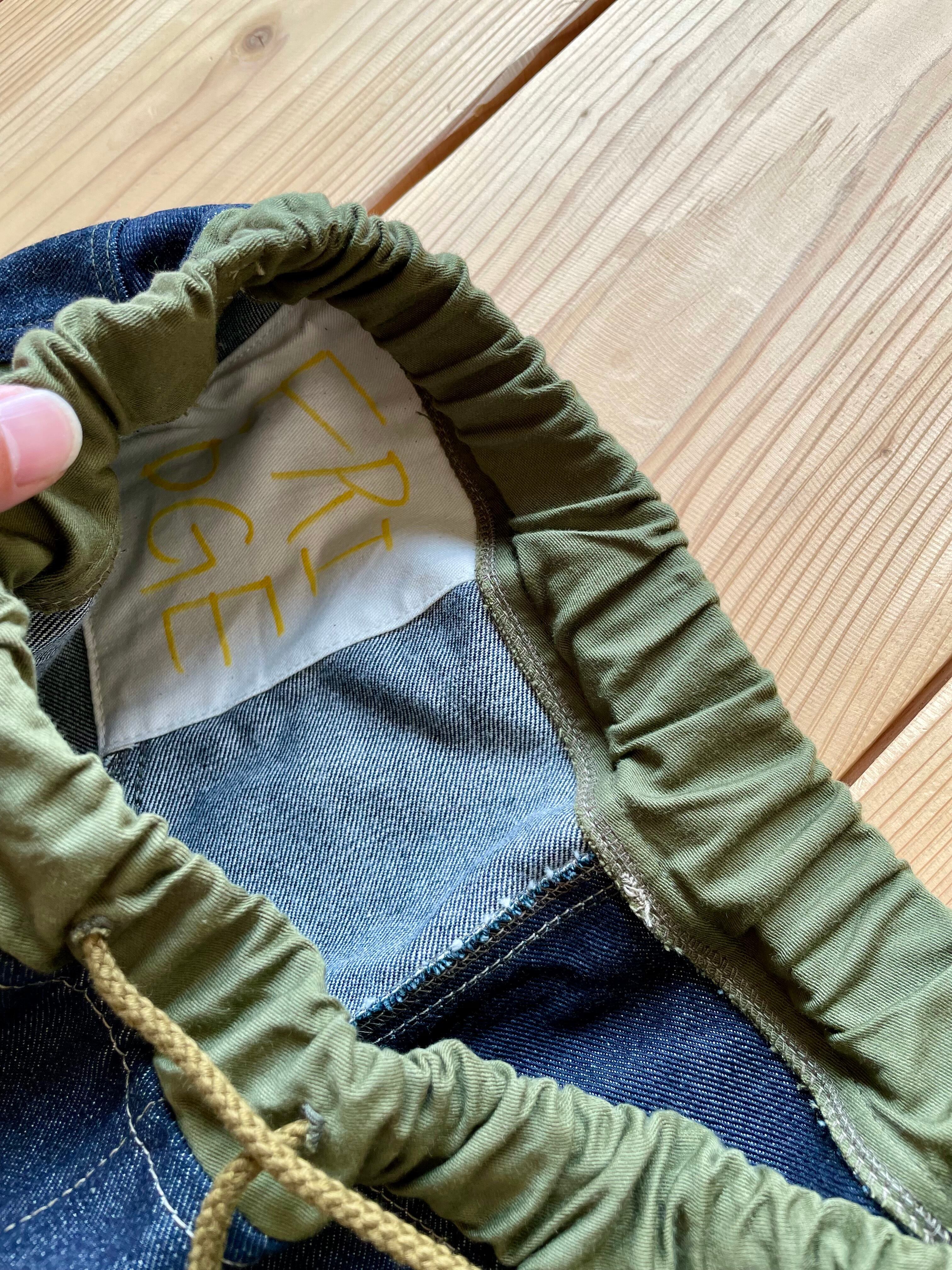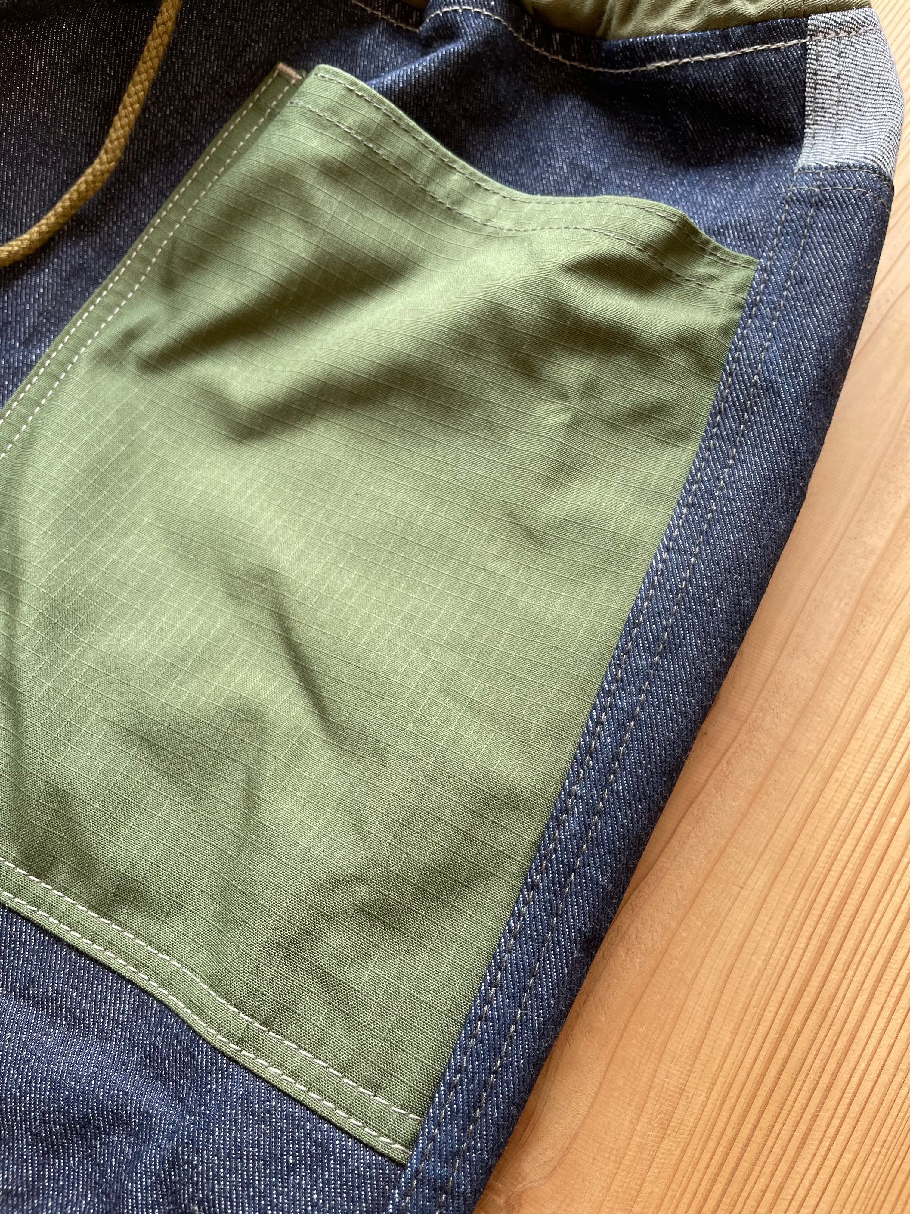14〜15オンスくらいの中厚手なデニム生地で作りました。ポケットはコットンリップストップです。