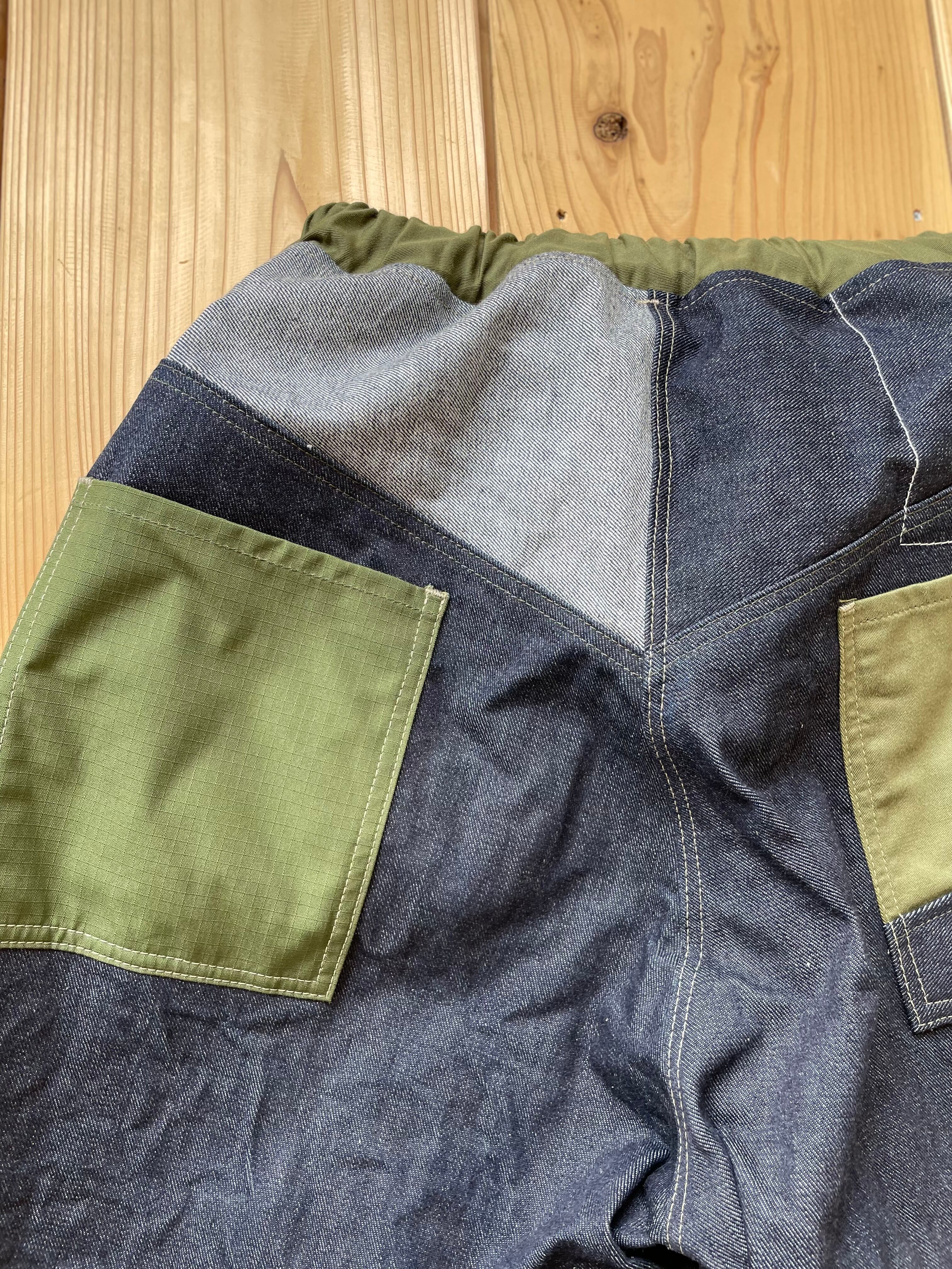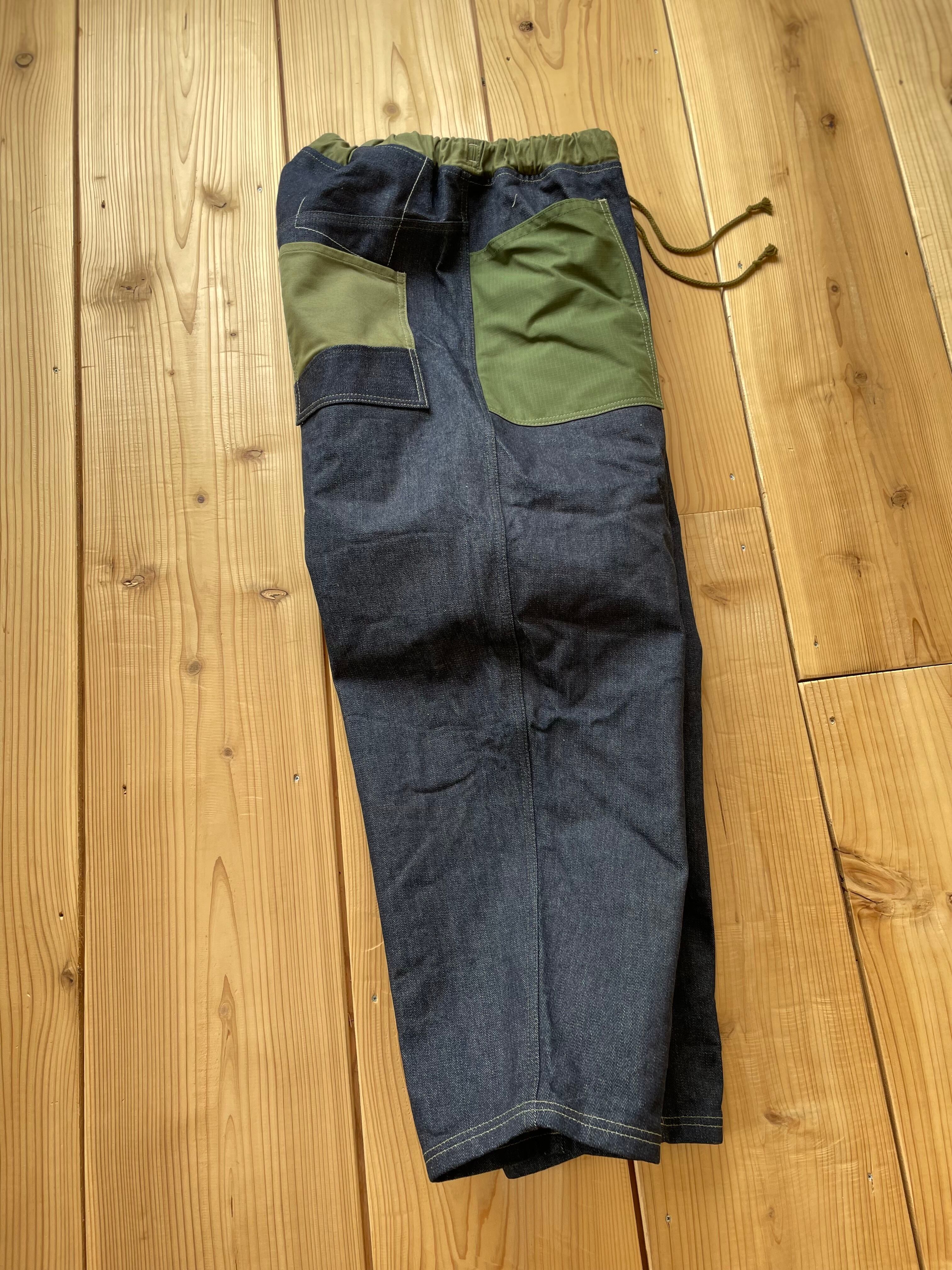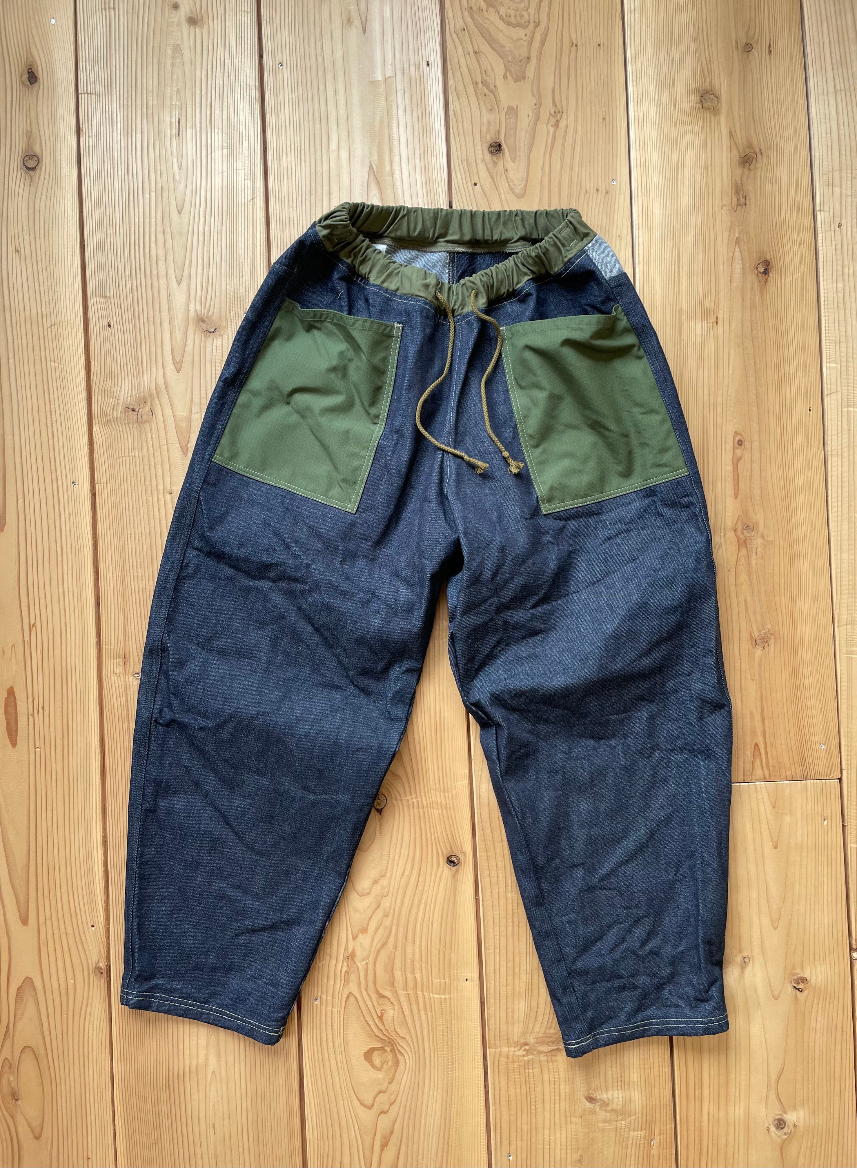 14〜15オンスくらいの中厚手なデニム生地で作りました。ポケットはコットンリップストップです。