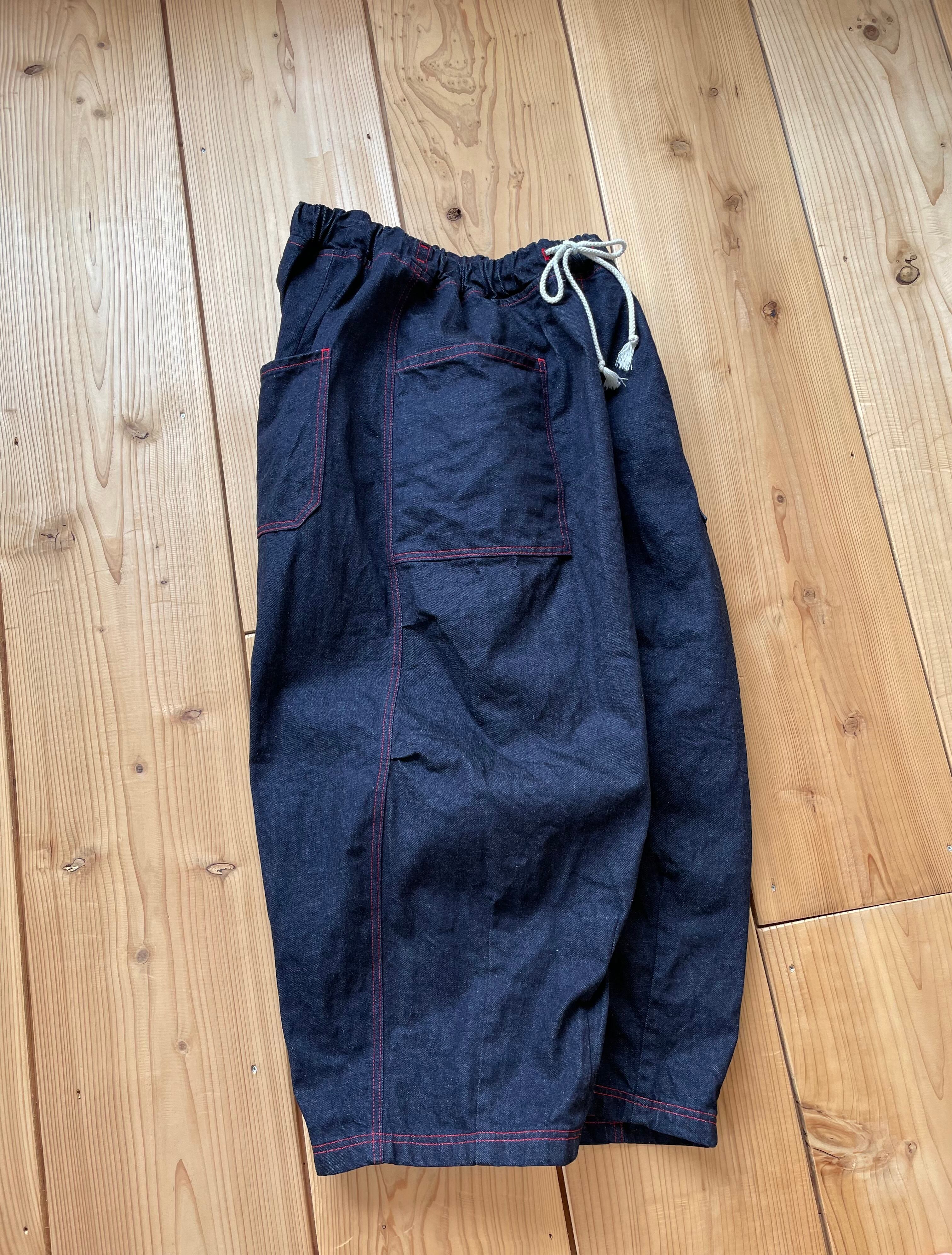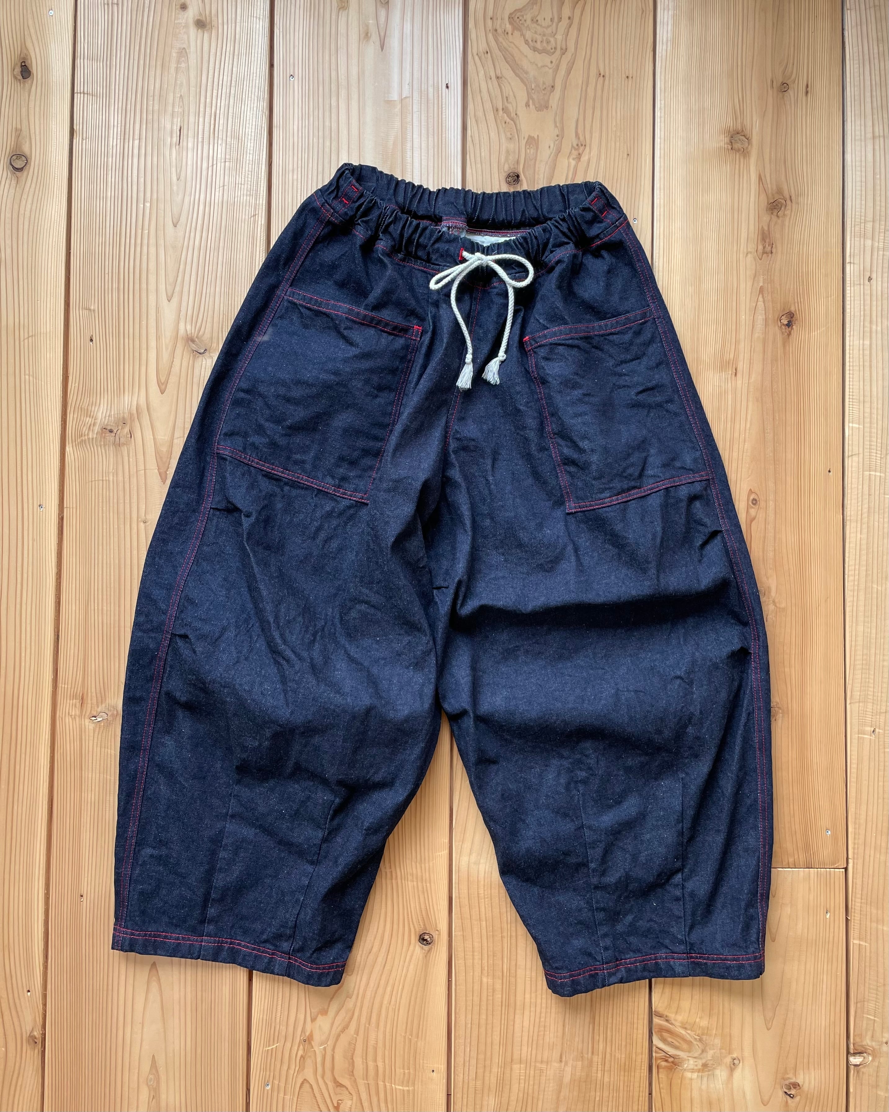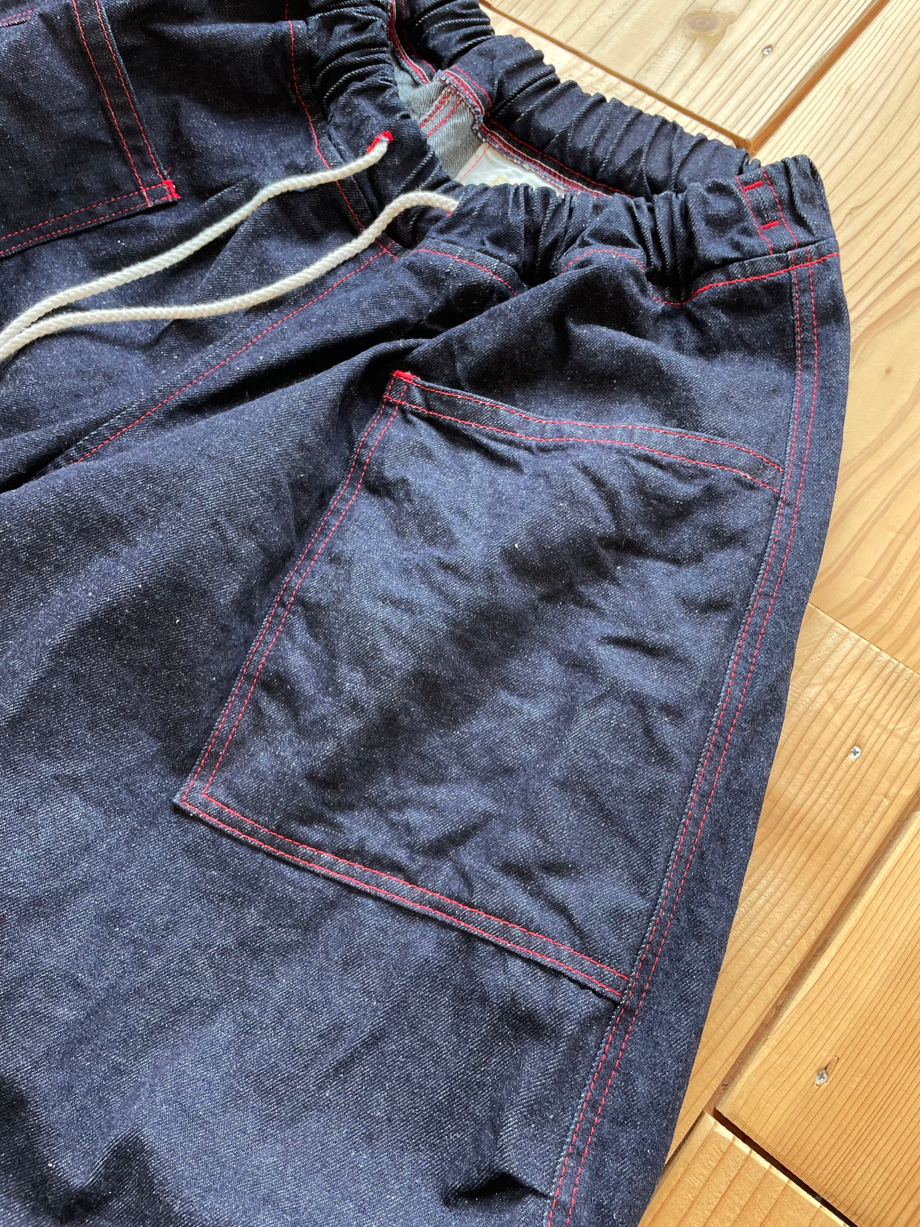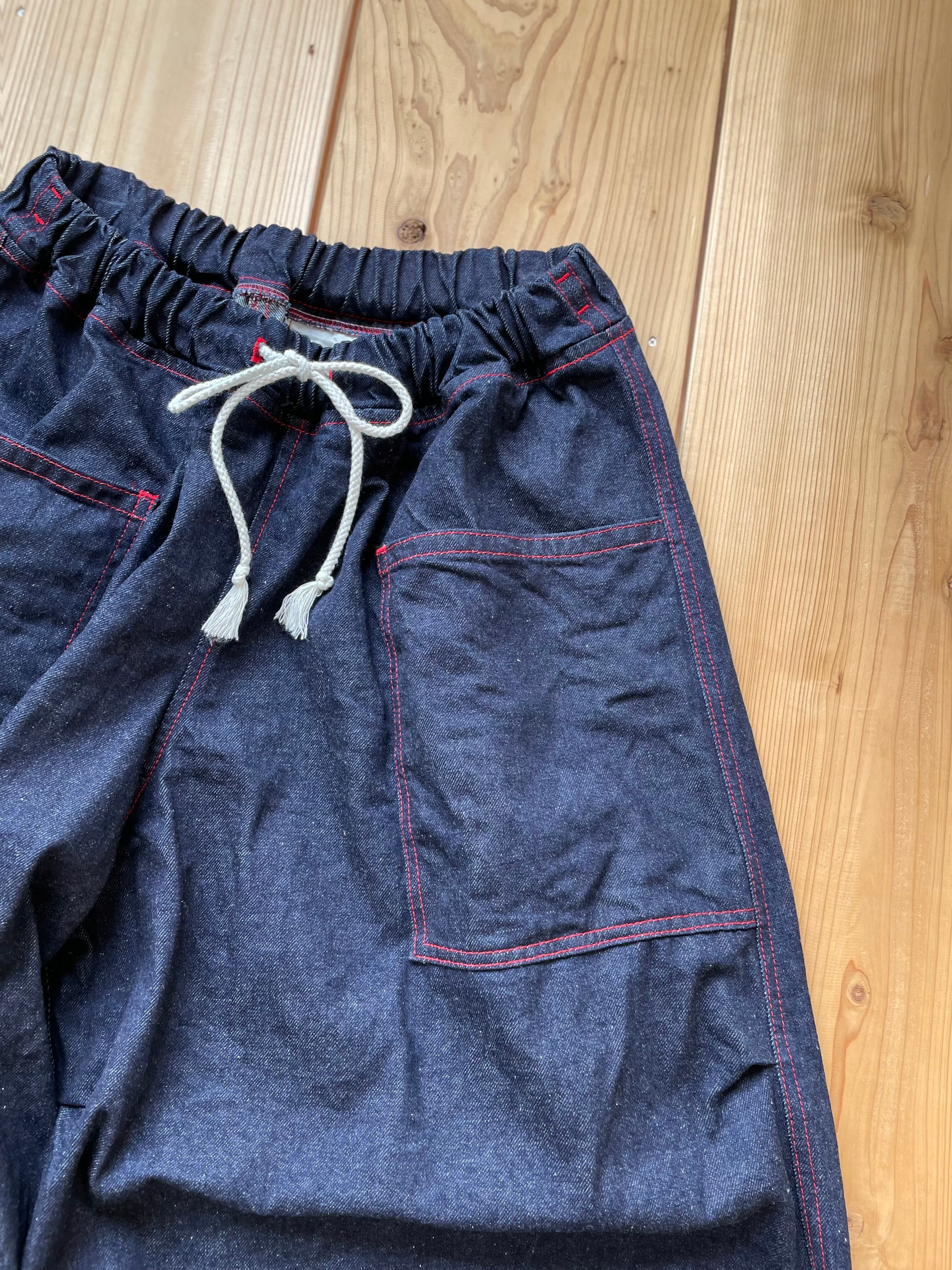 厚すぎないフワッとなる14オンスくらいの国産デニム生地で、ダーツやタックが入ってるワイドパンツです。