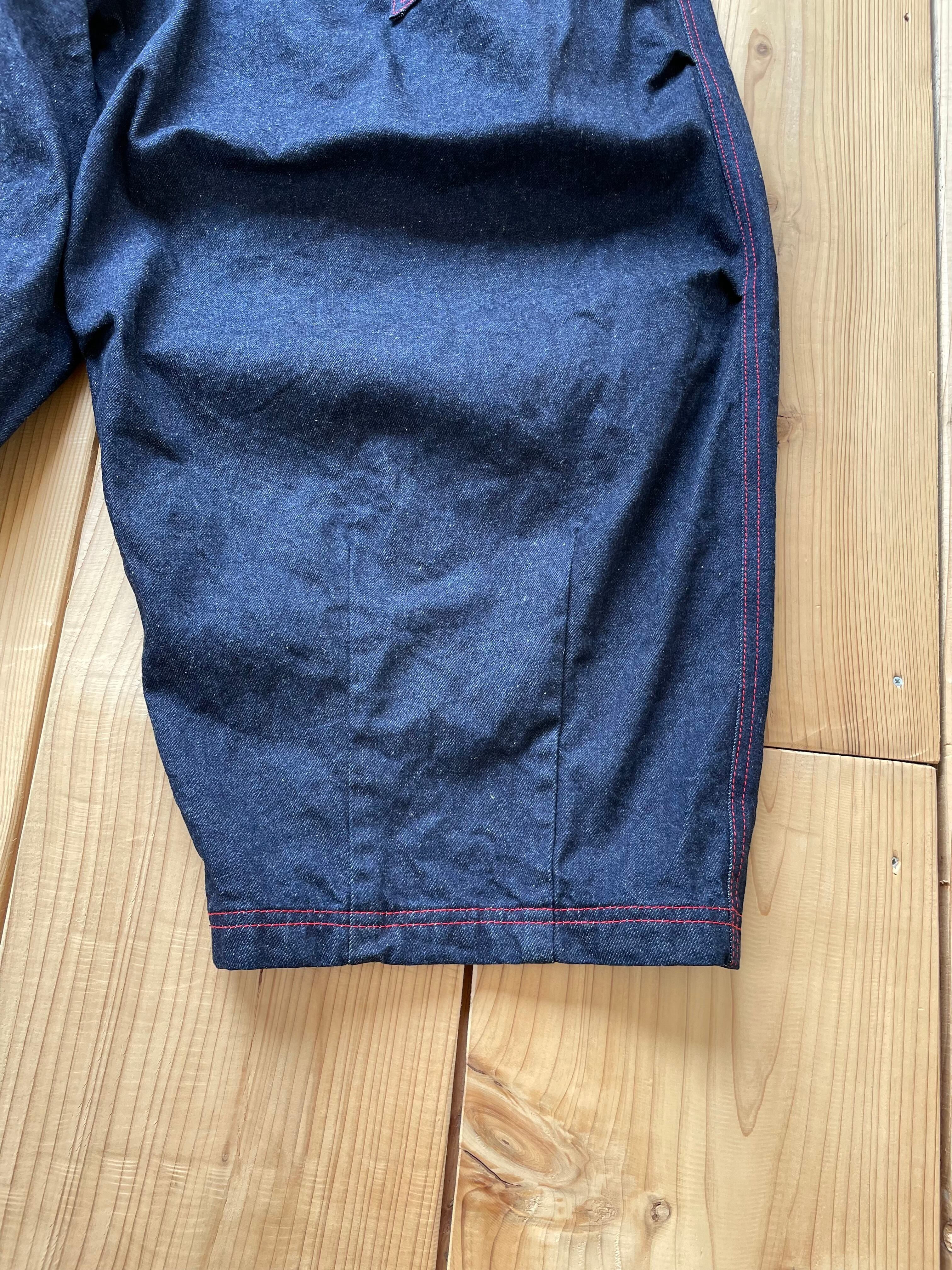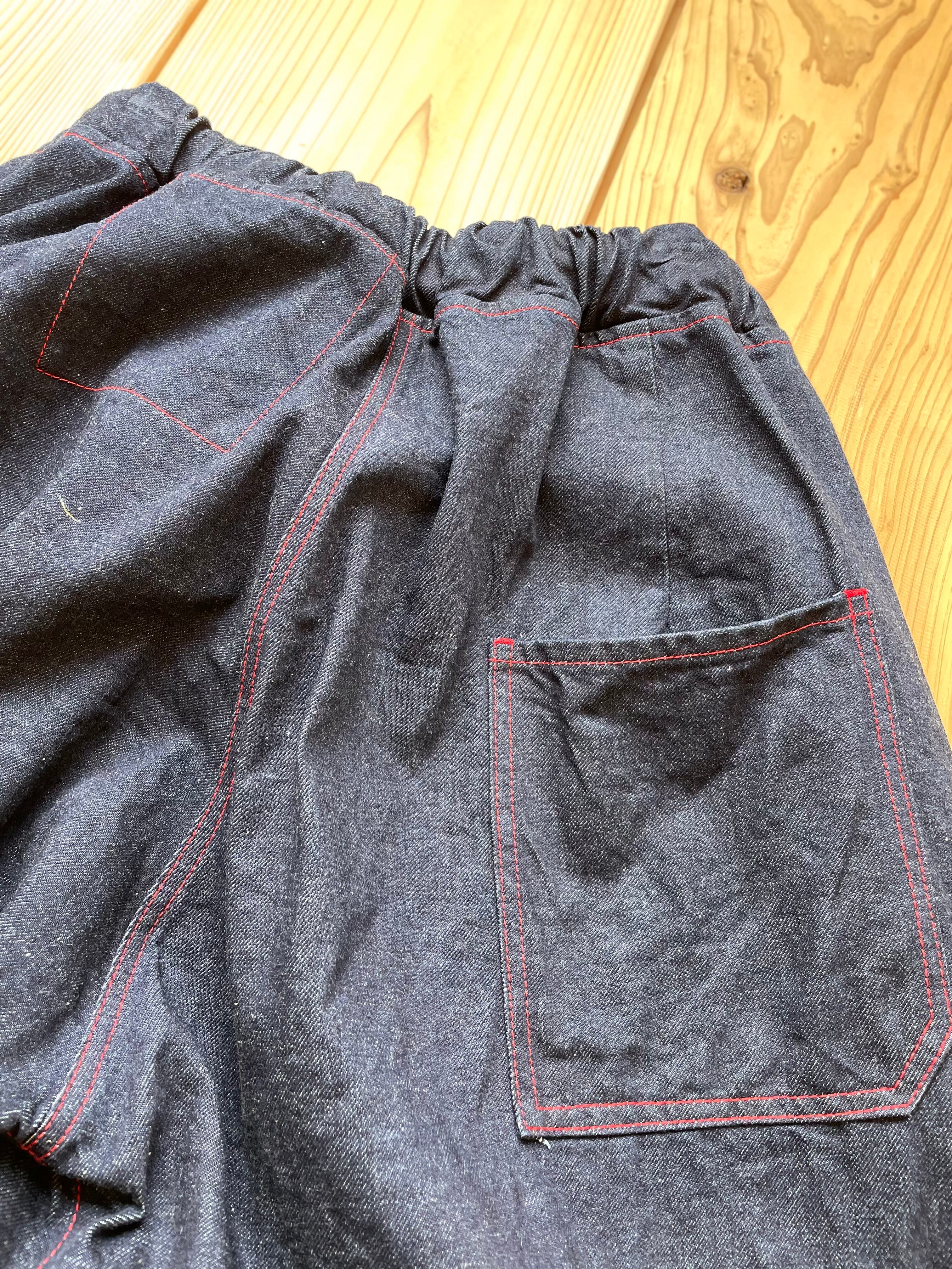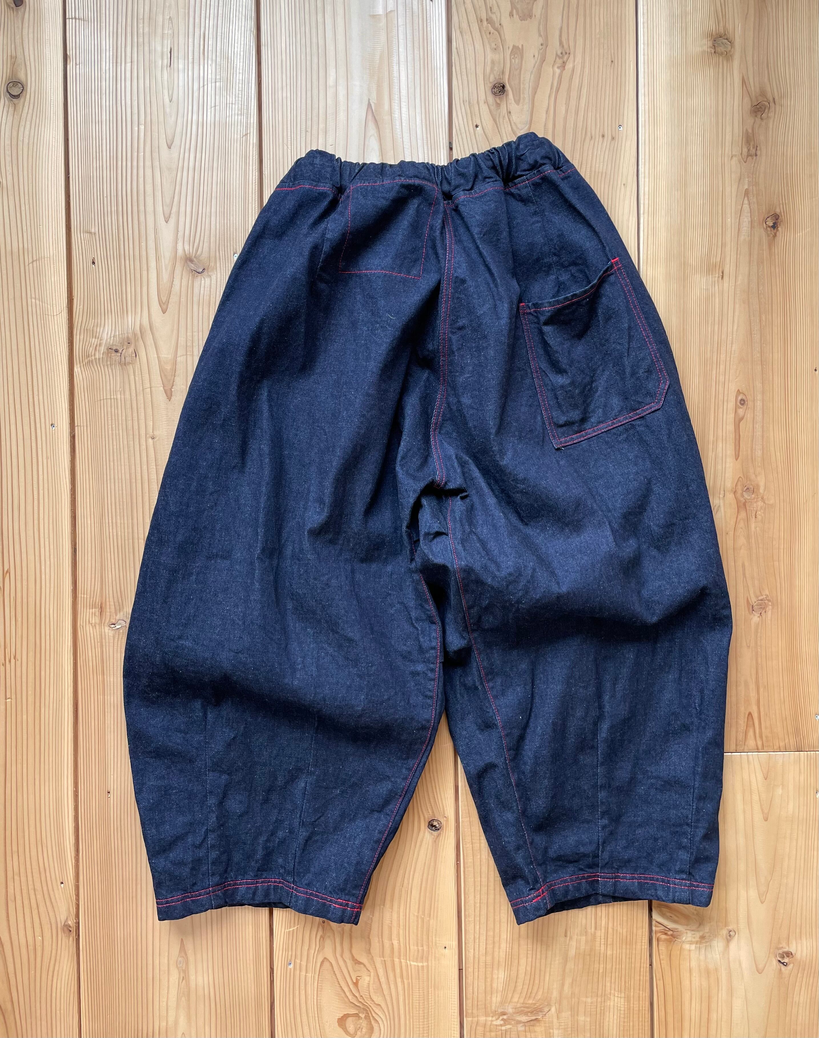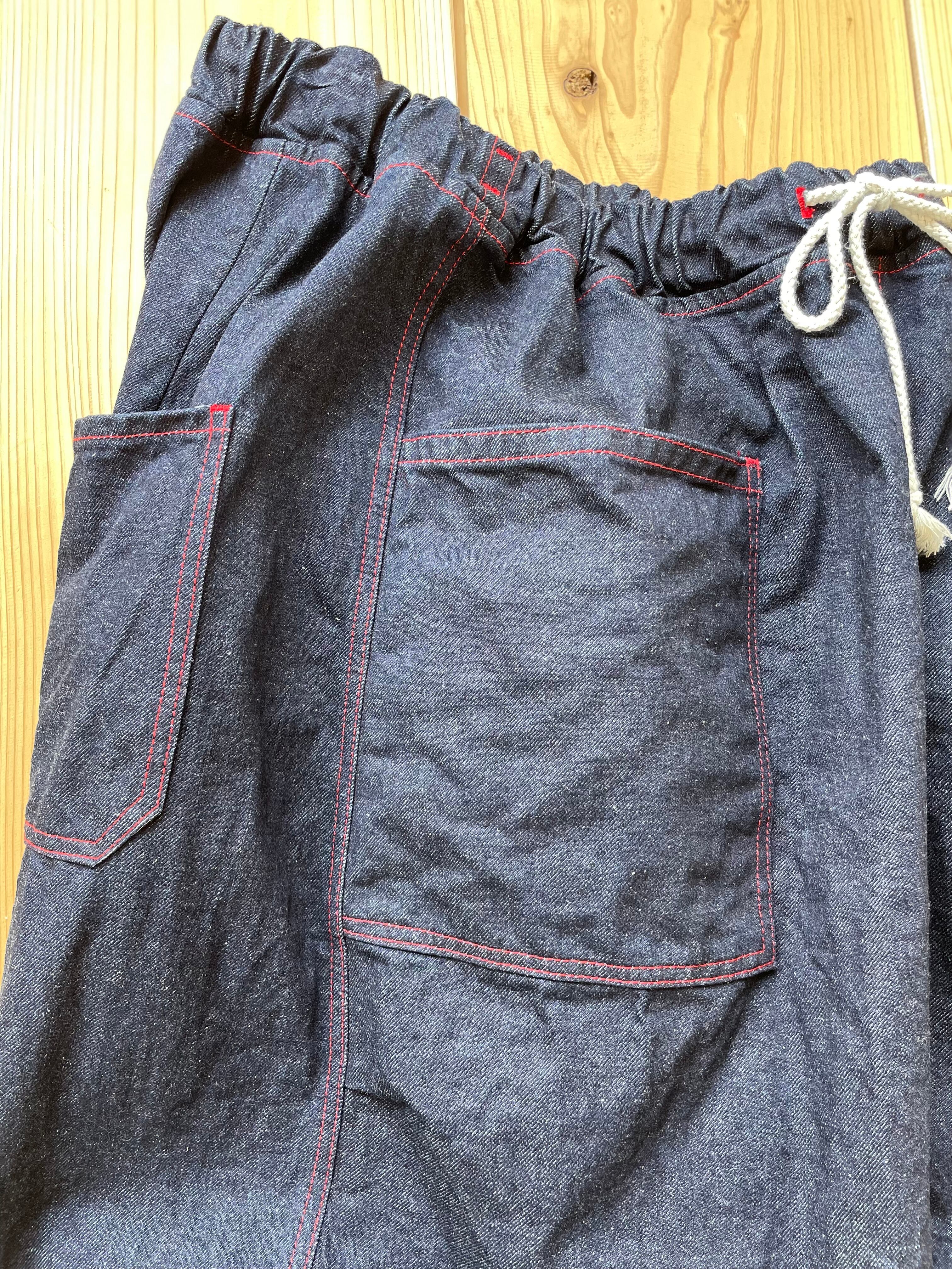 厚すぎないフワッとなる14オンスくらいの国産デニム生地で、ダーツやタックが入ってるワイドパンツです。