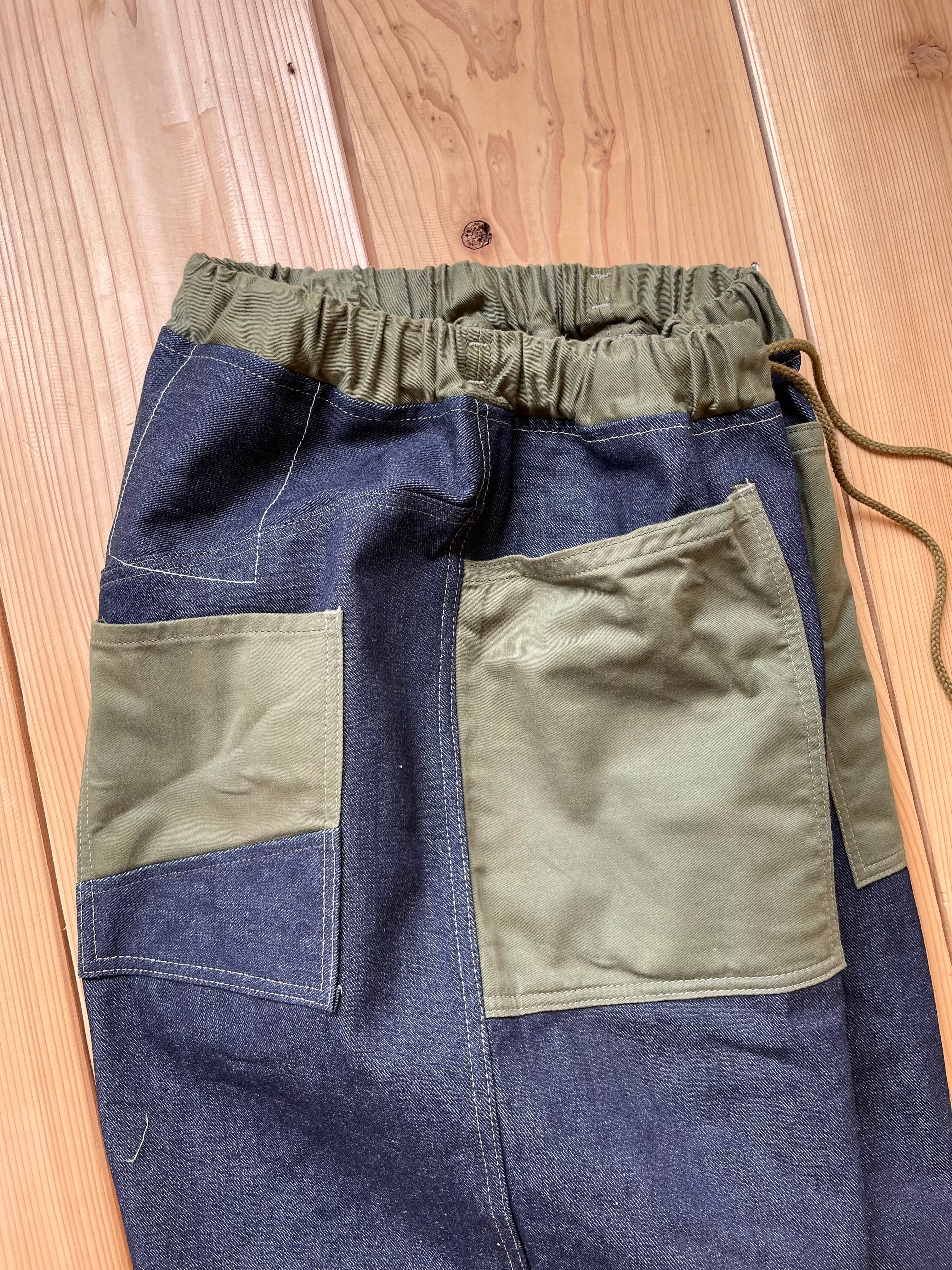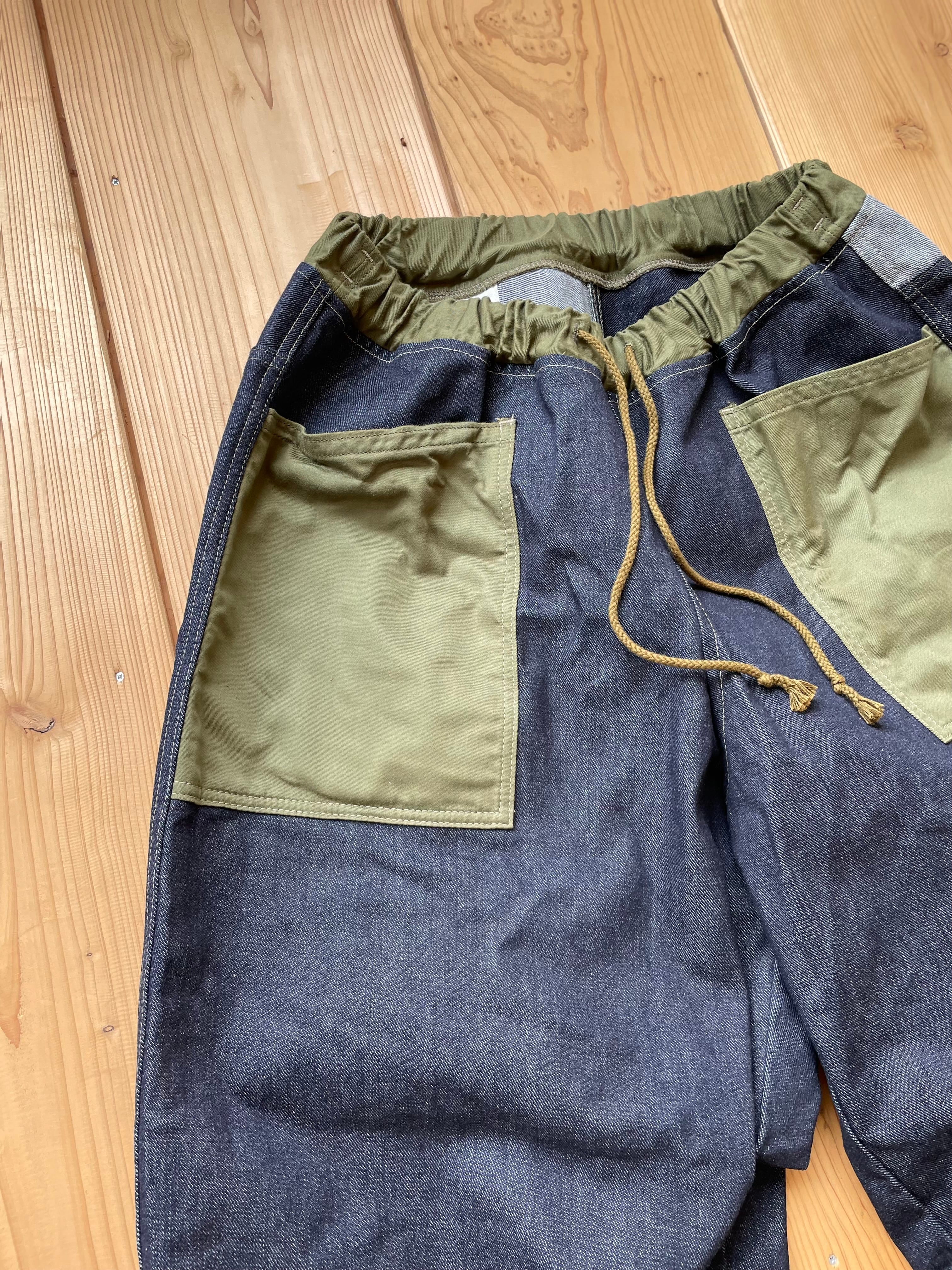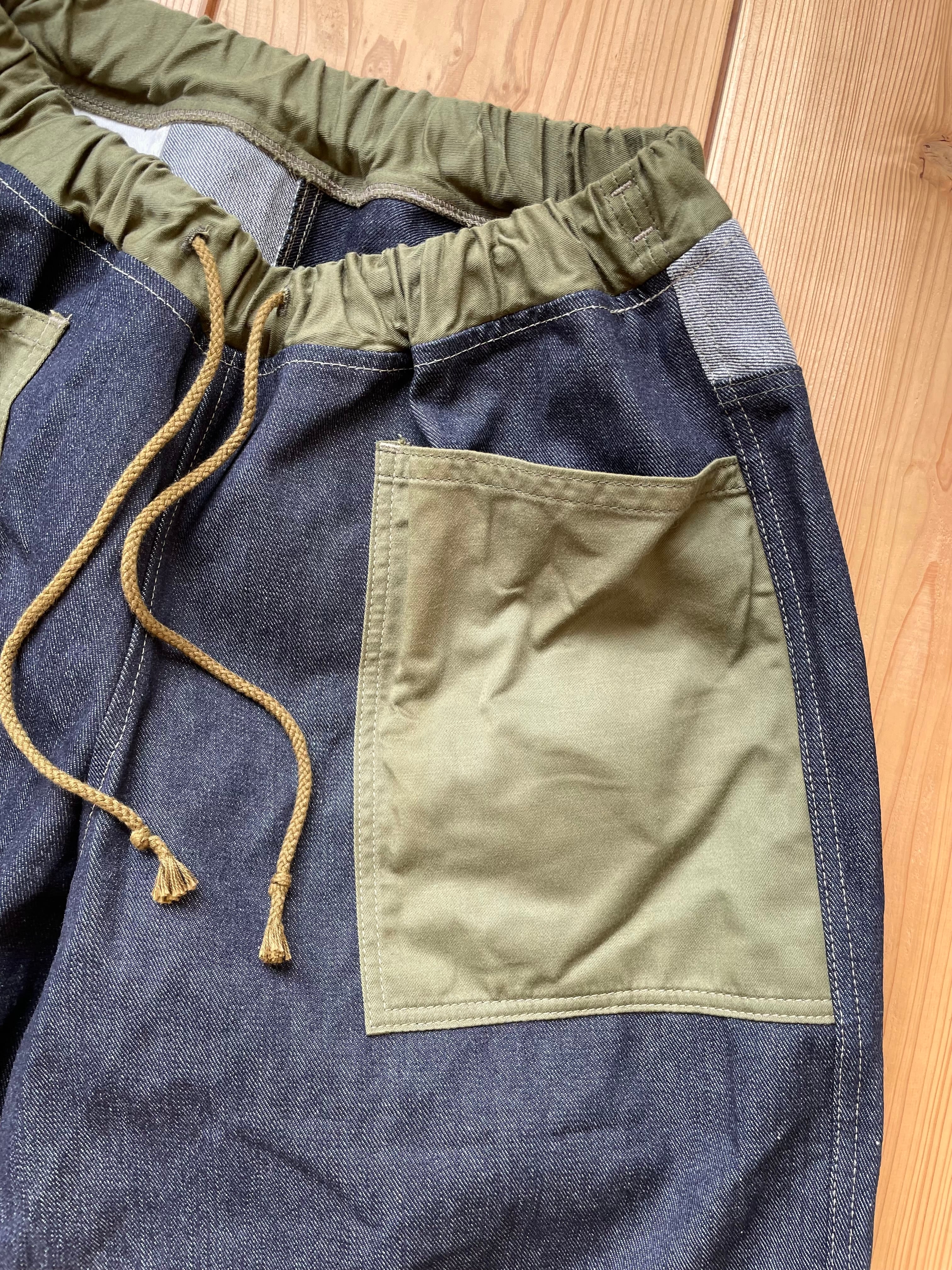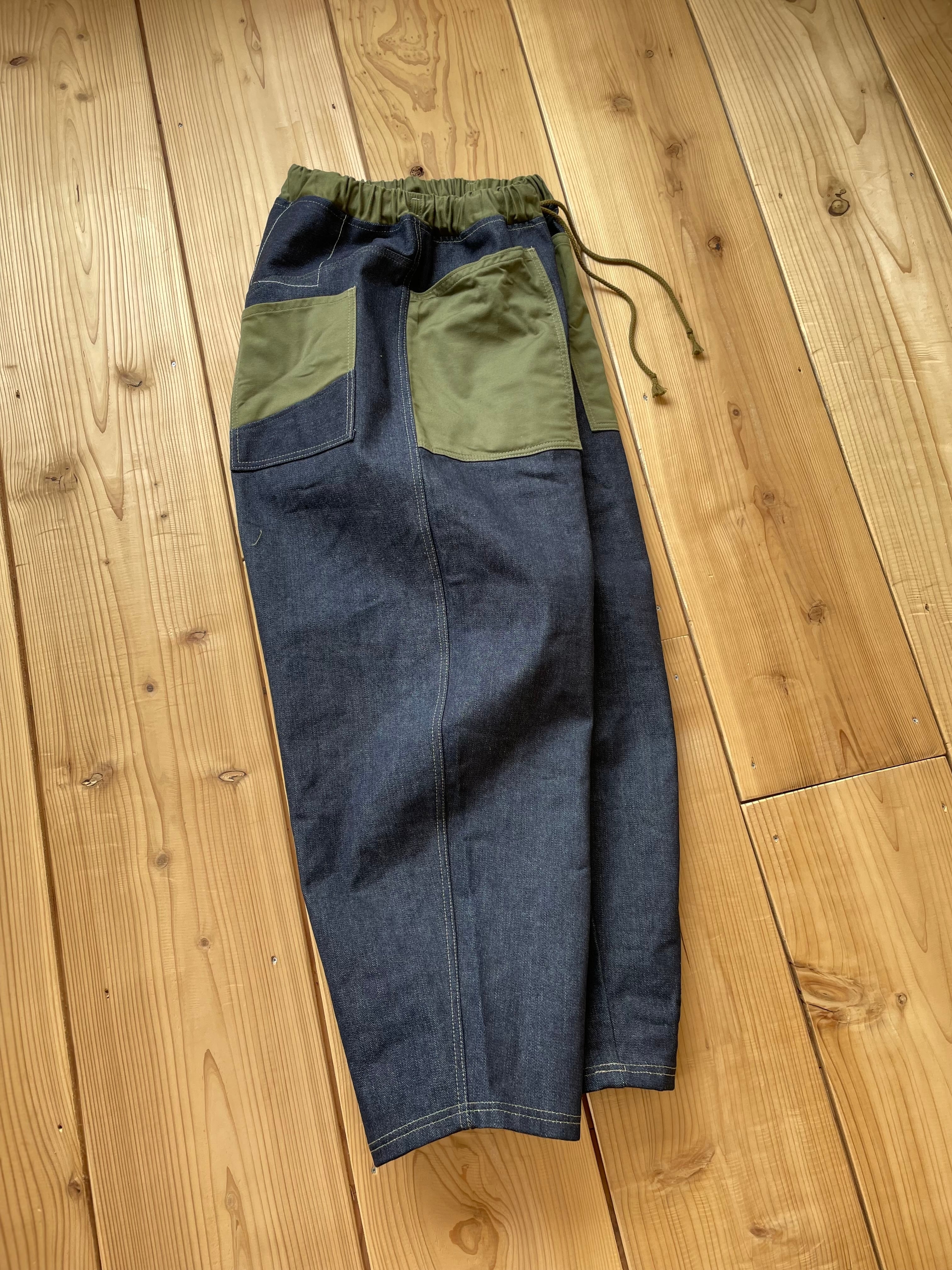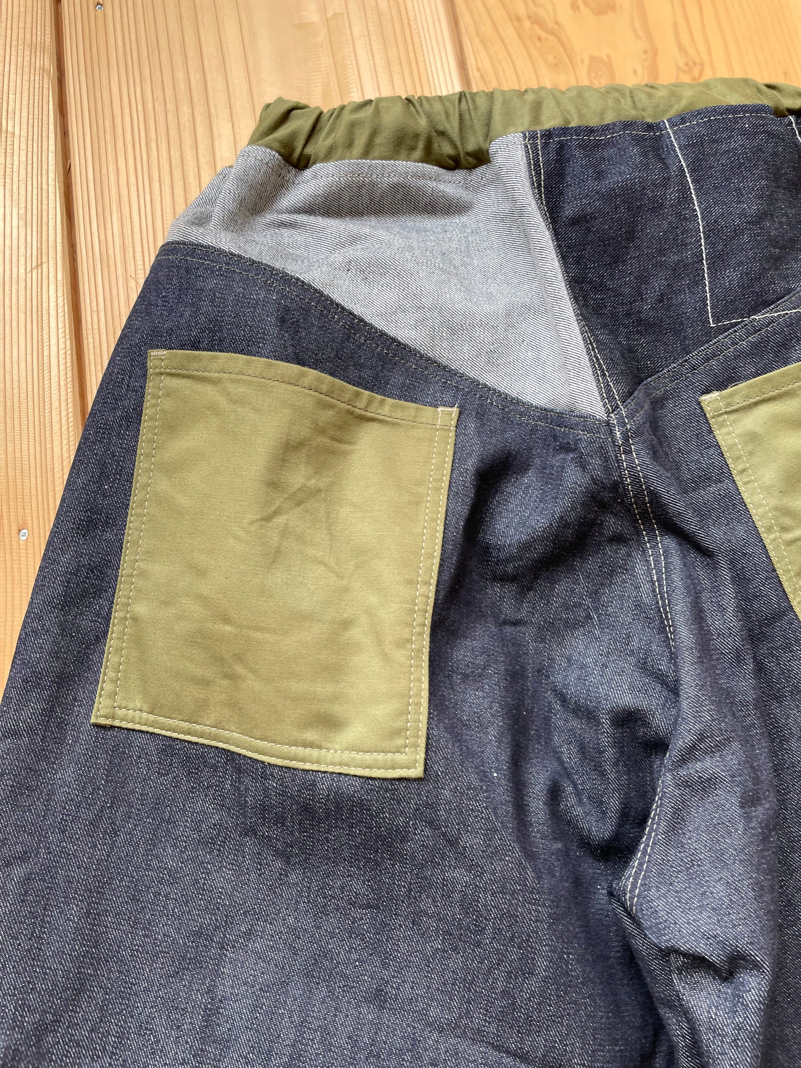 14〜15オンスくらいの中厚手なデニム生地で作りました。ポケットはカーキです。
