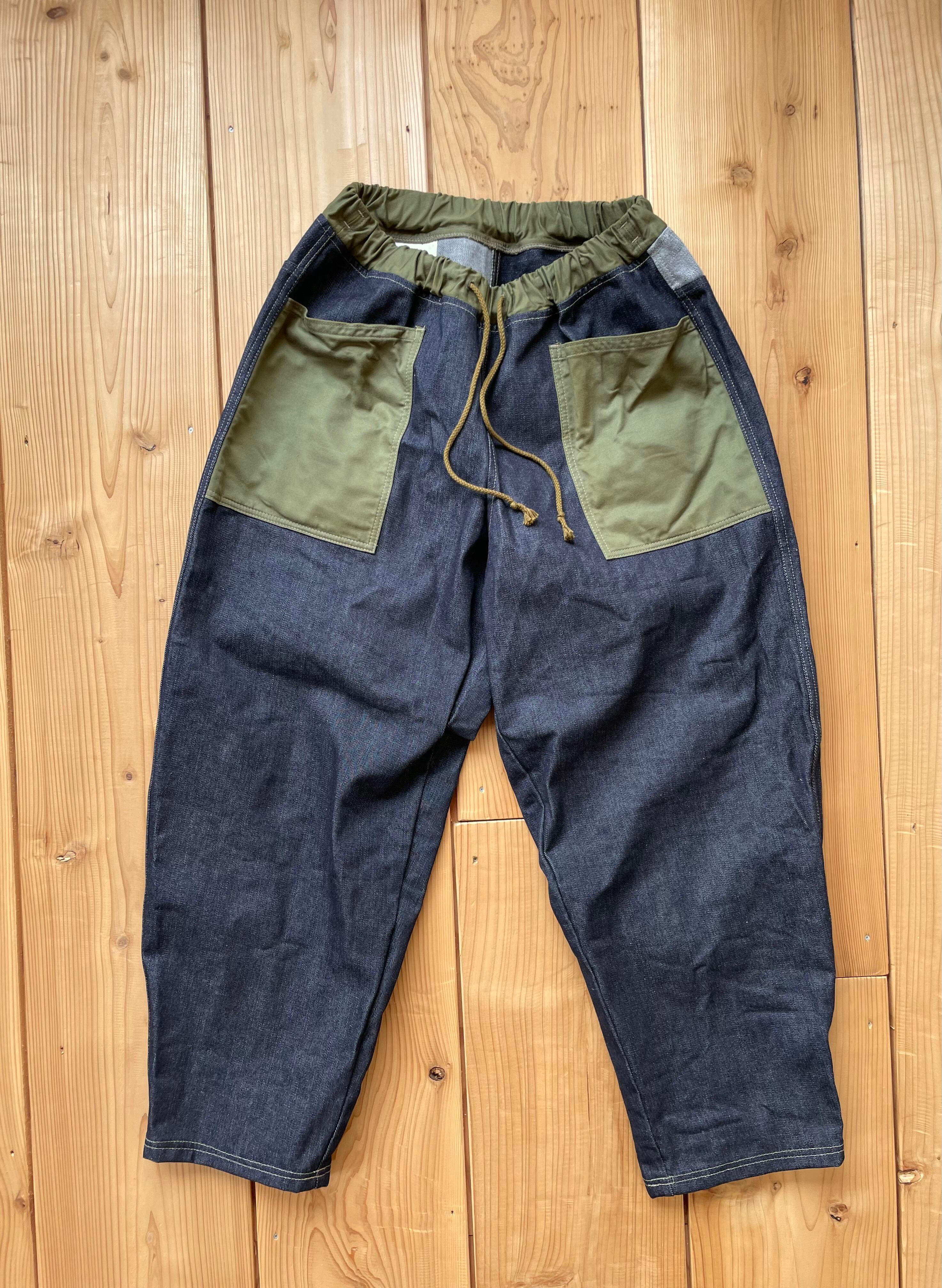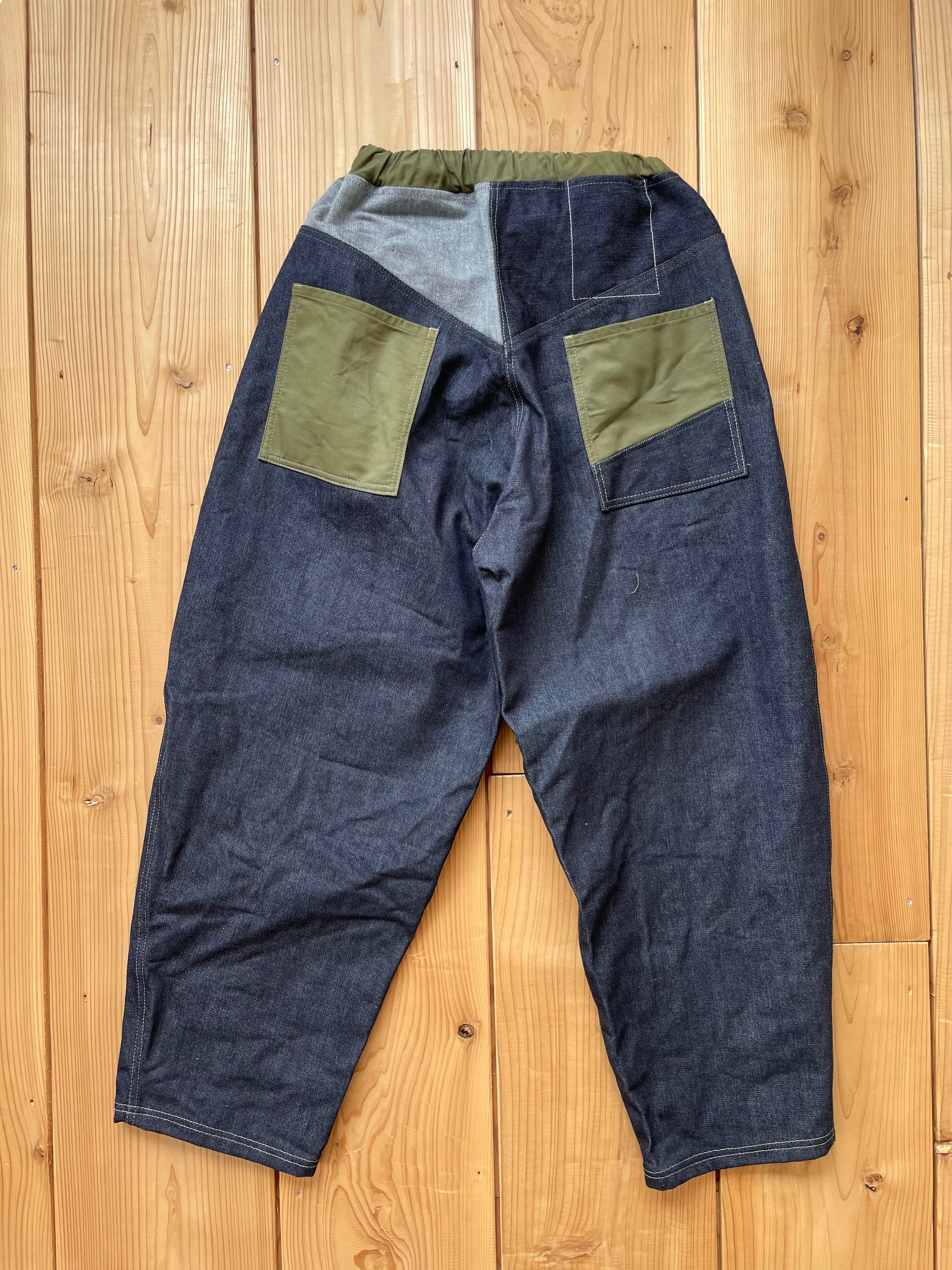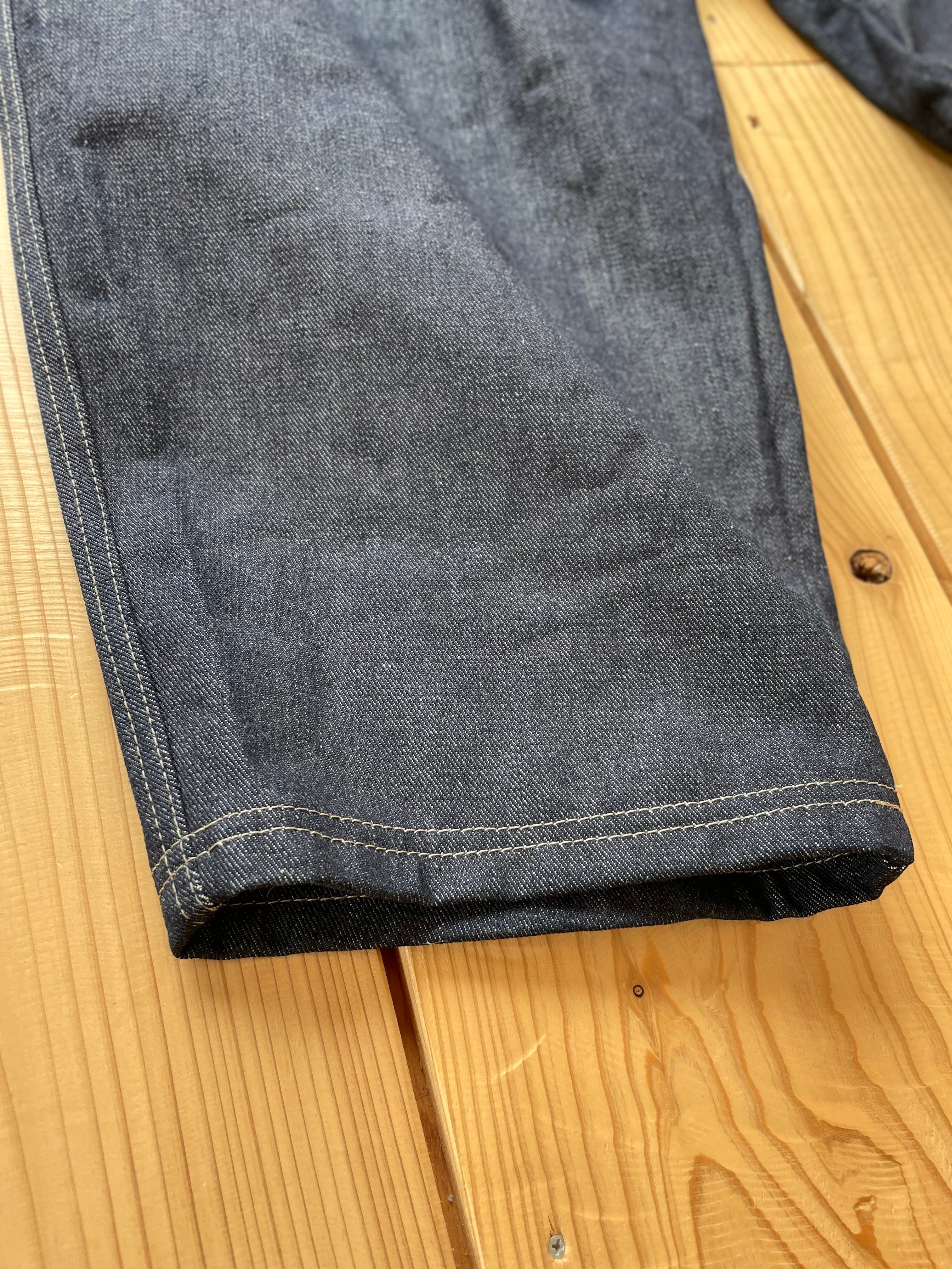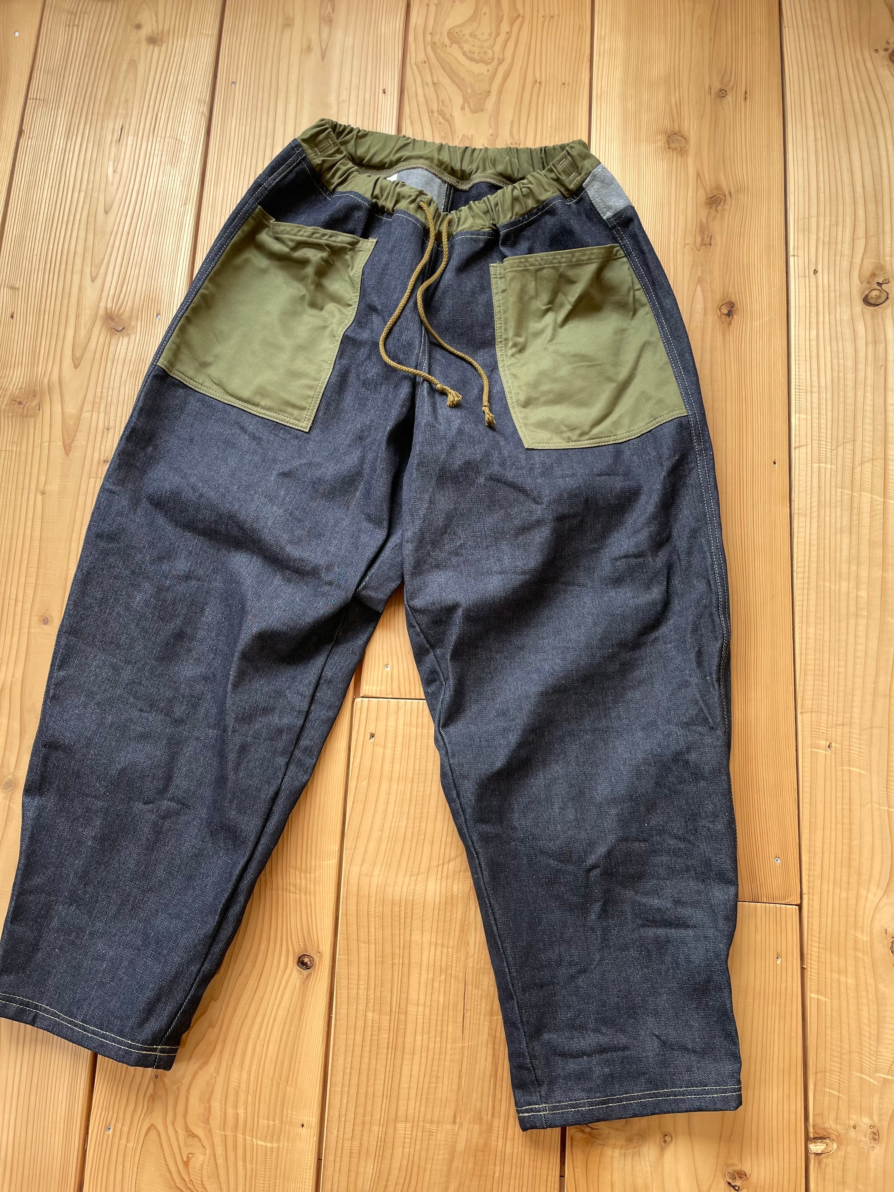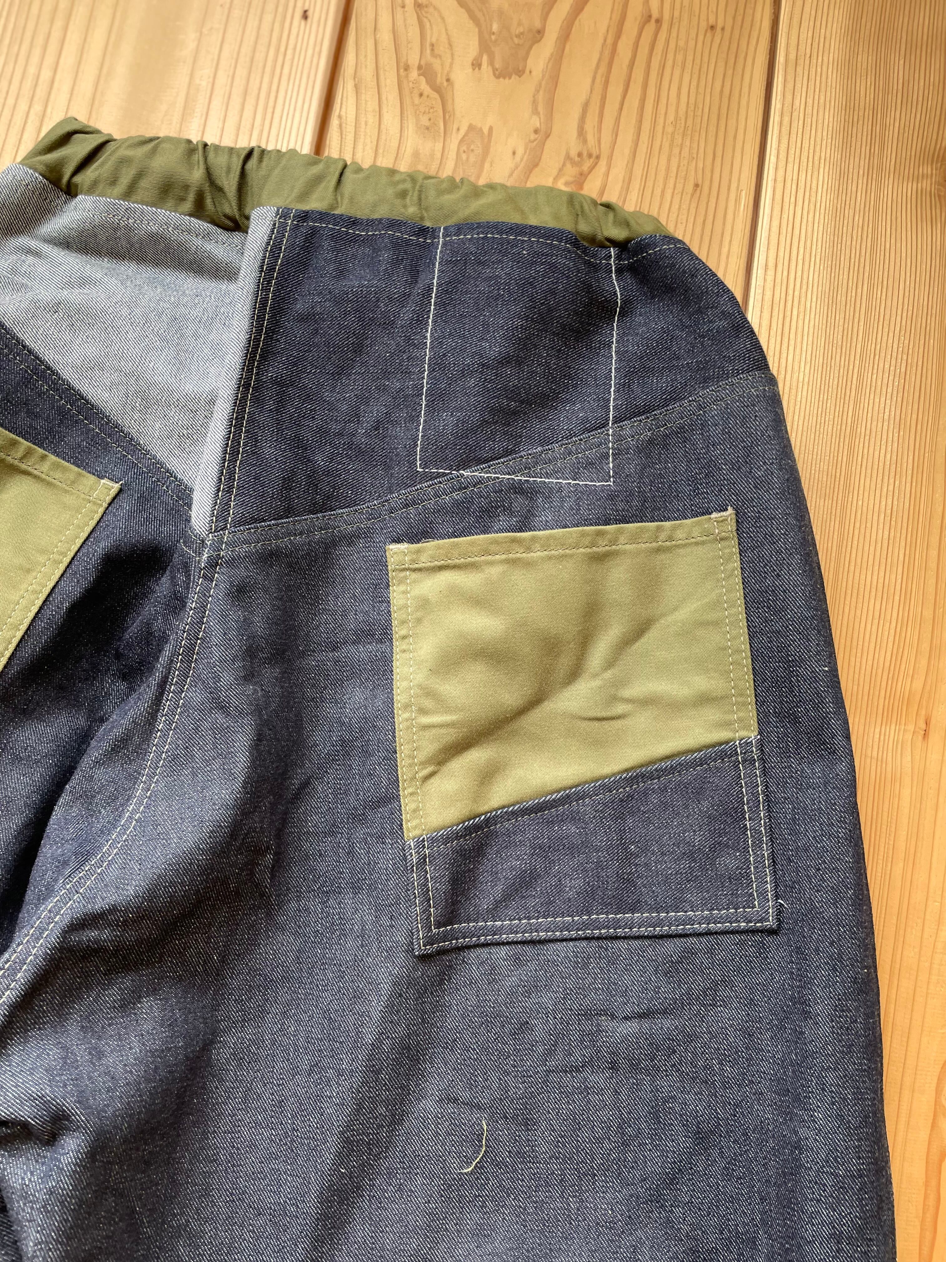 14〜15オンスくらいの中厚手なデニム生地で作りました。ポケットはカーキです。