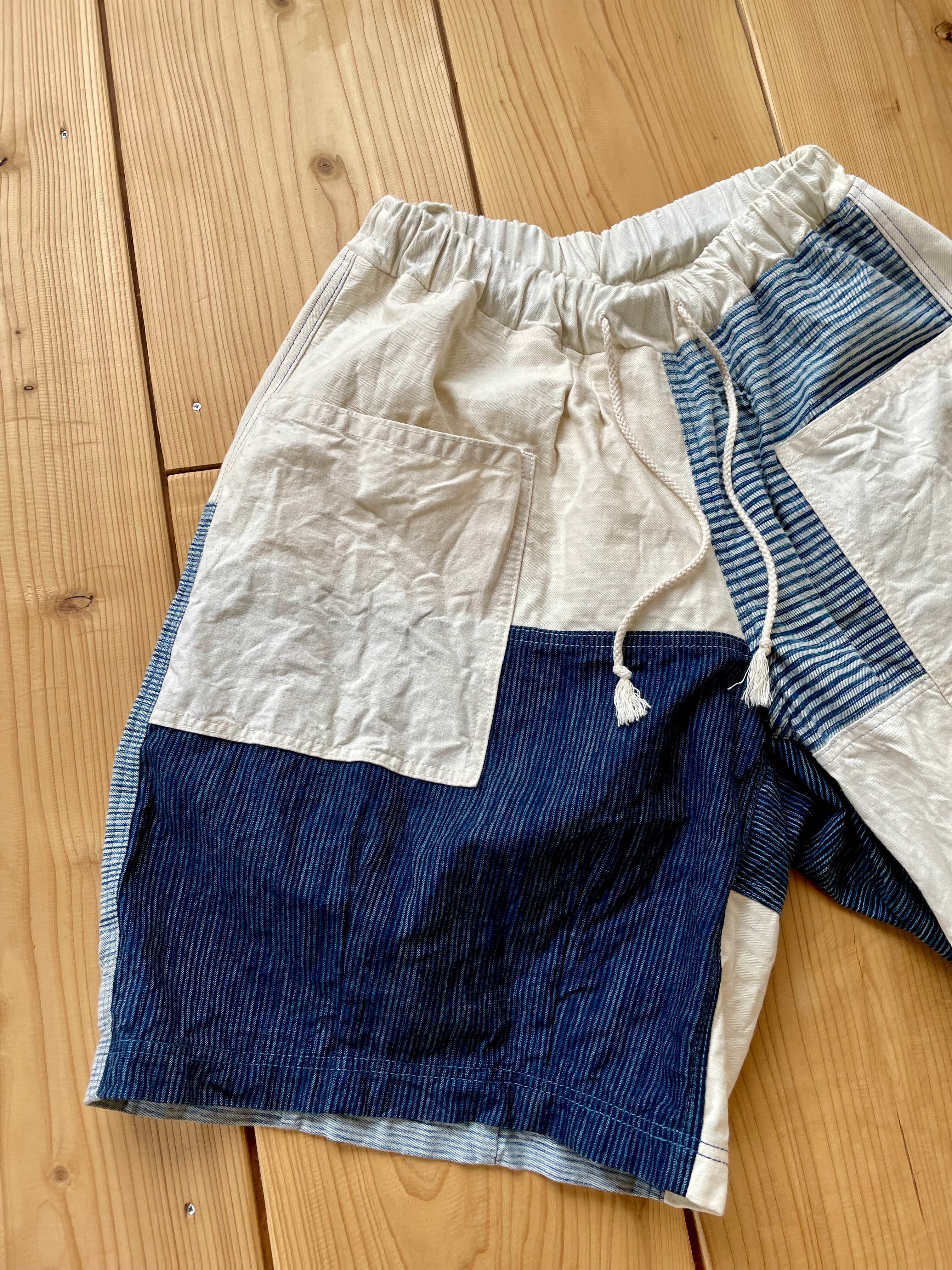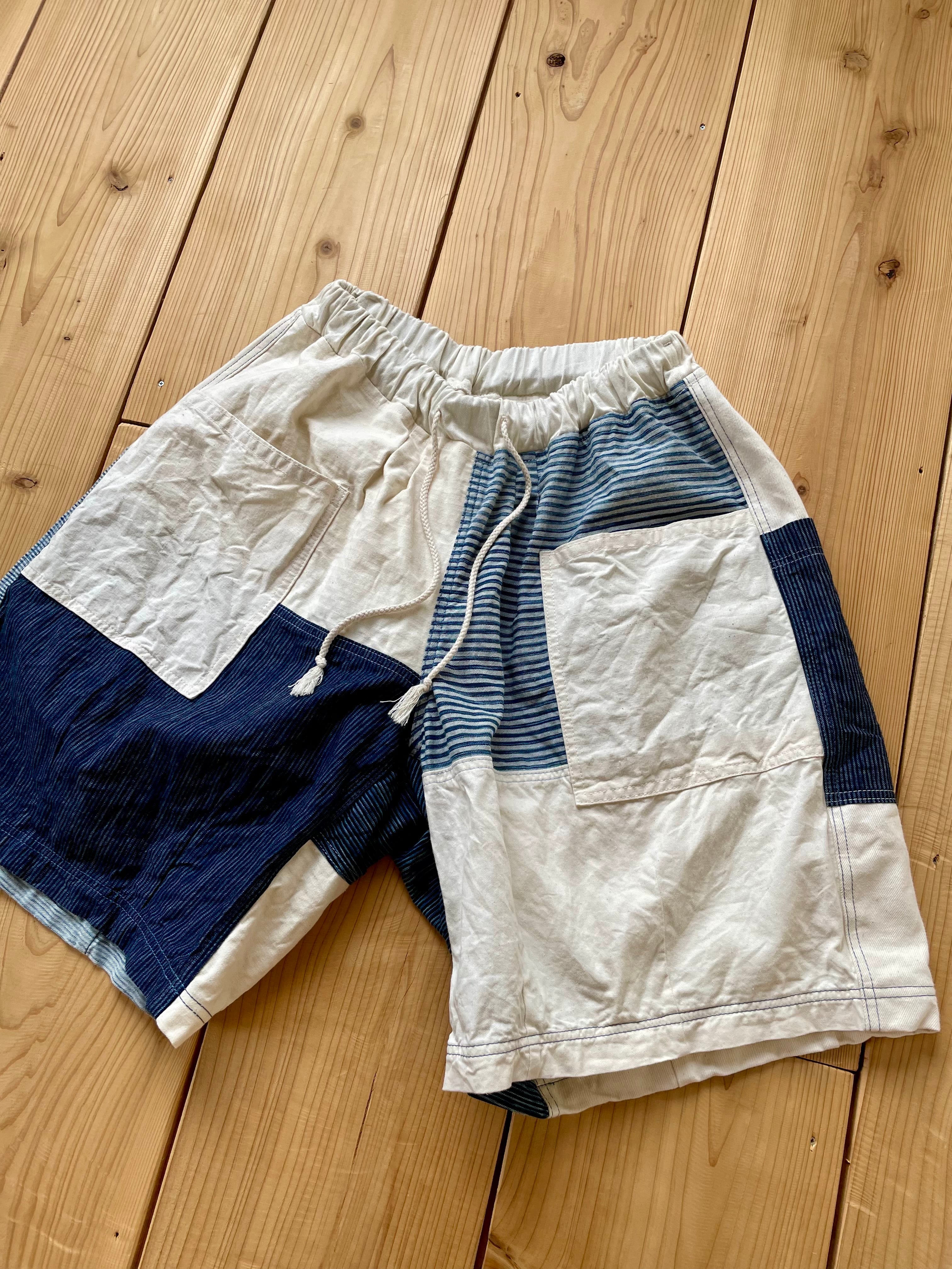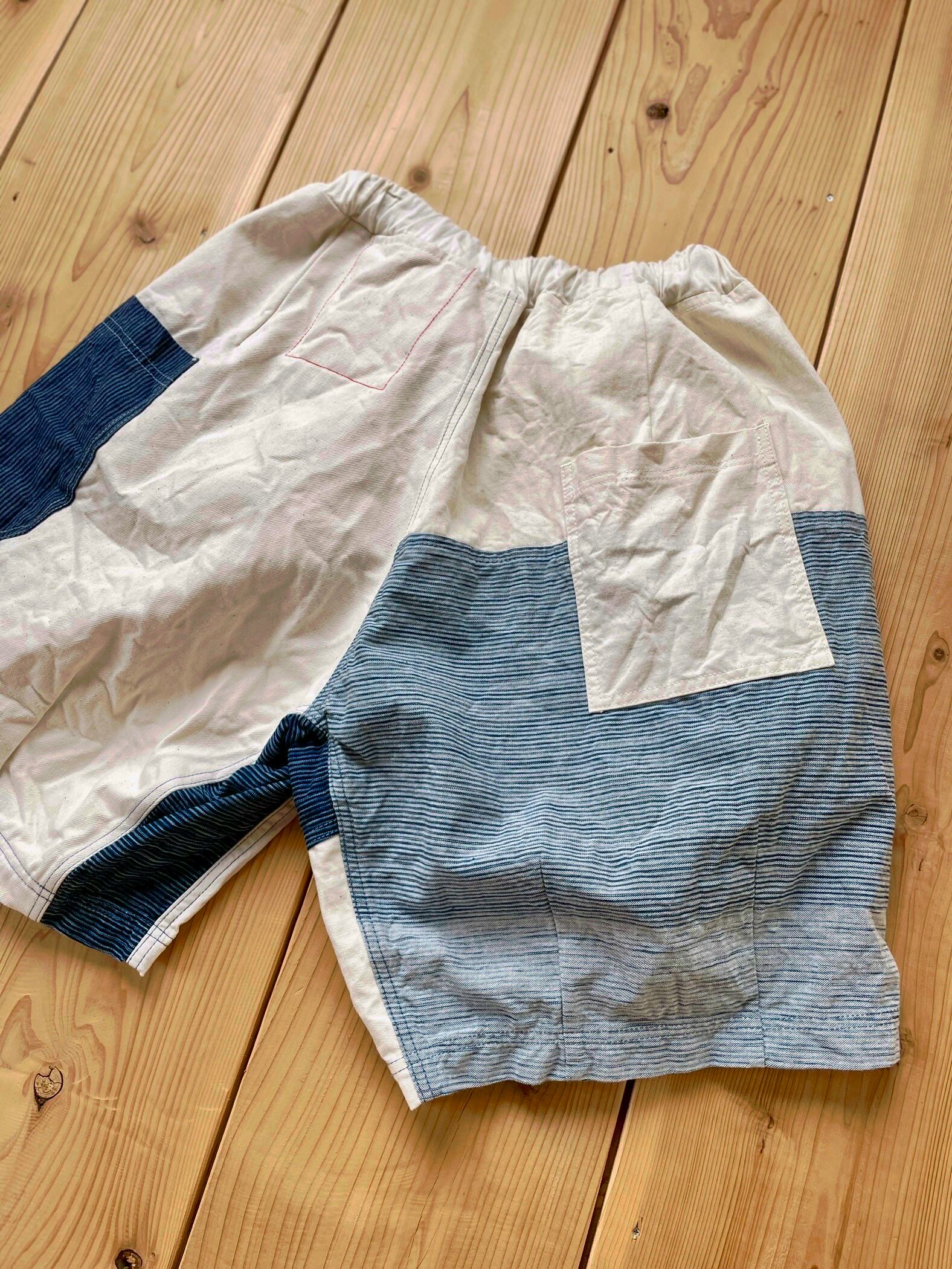 白系メインで生地を組み合わせた、さわやかなワイドな短パンとなります。
