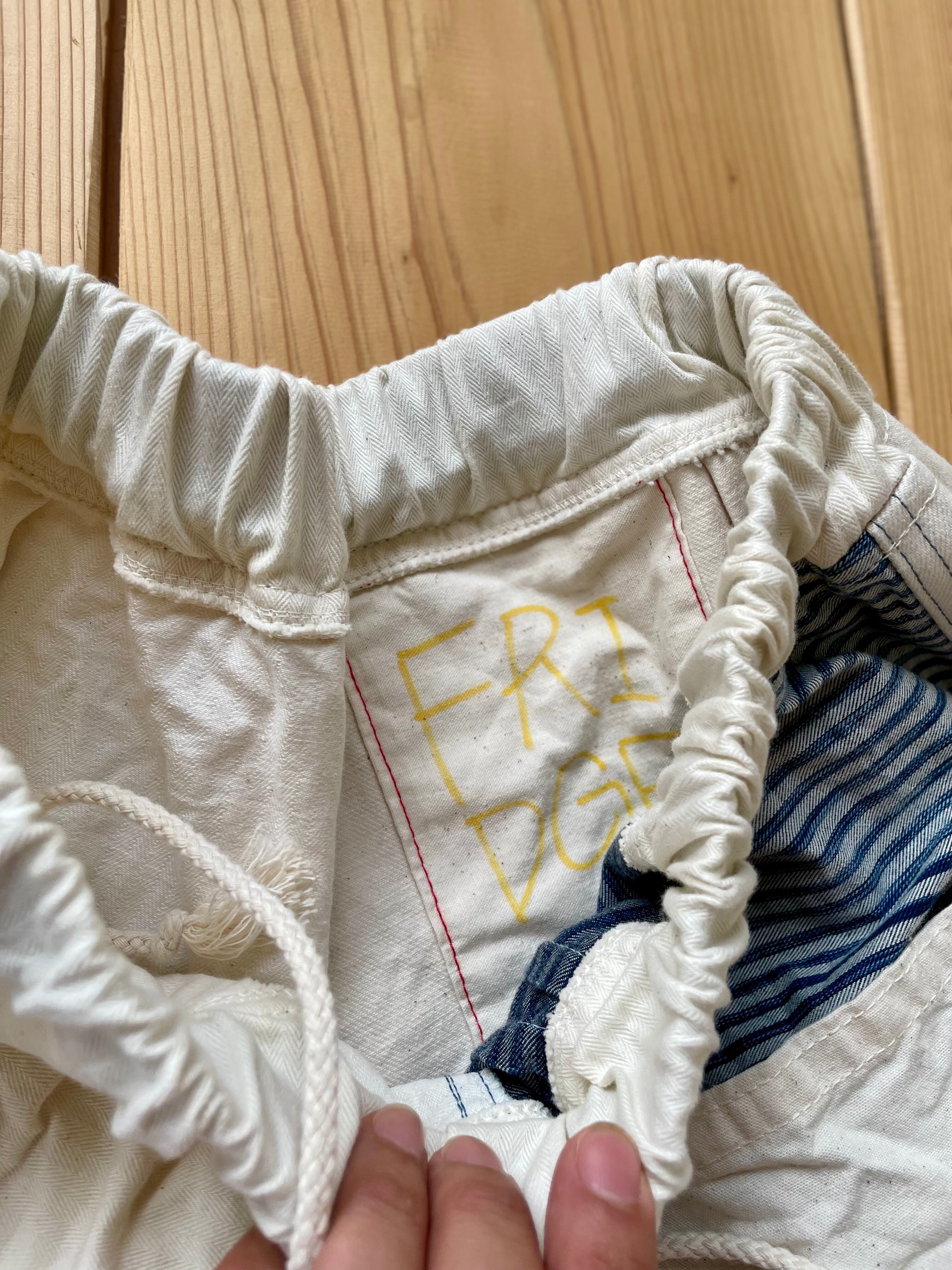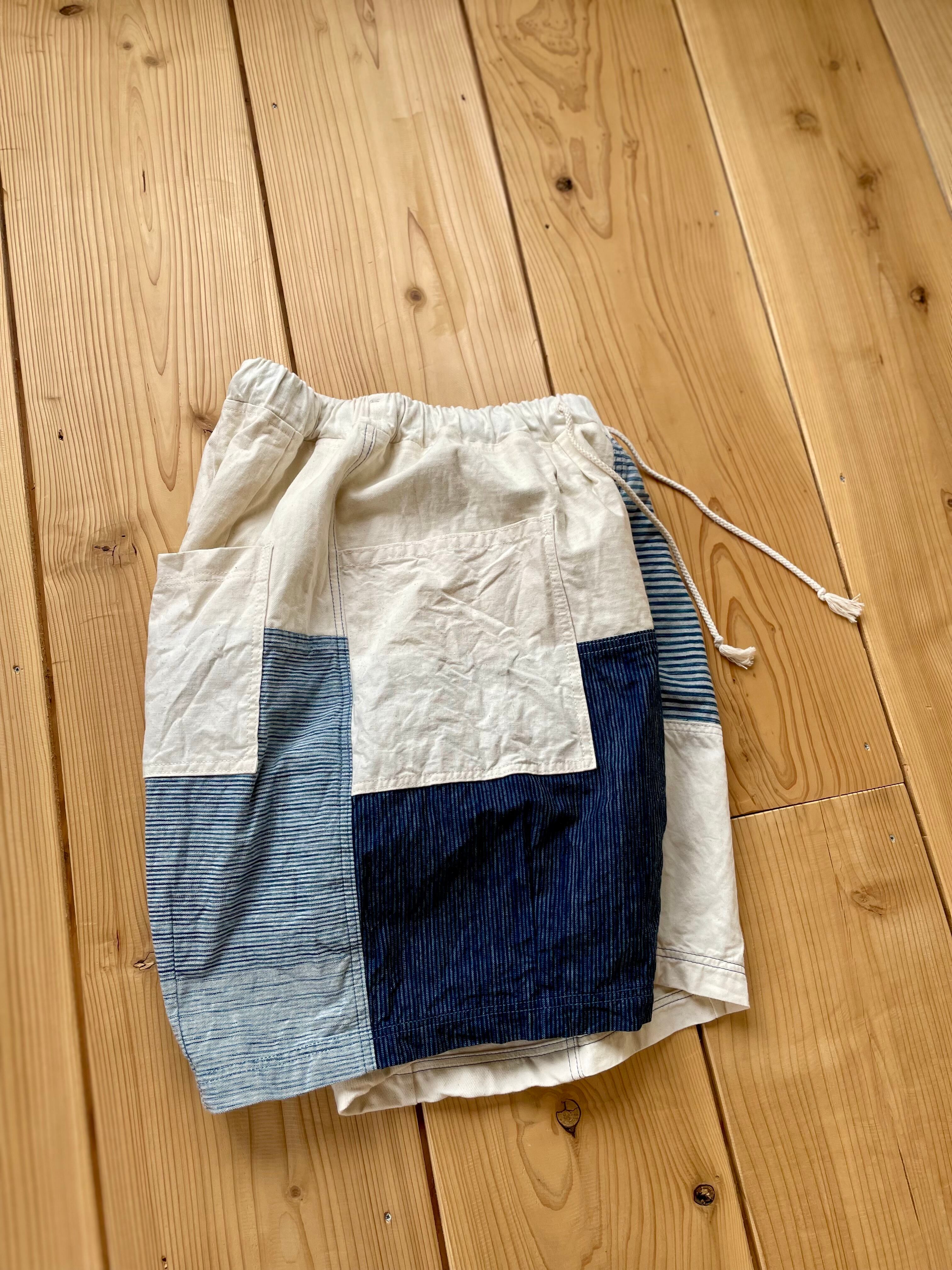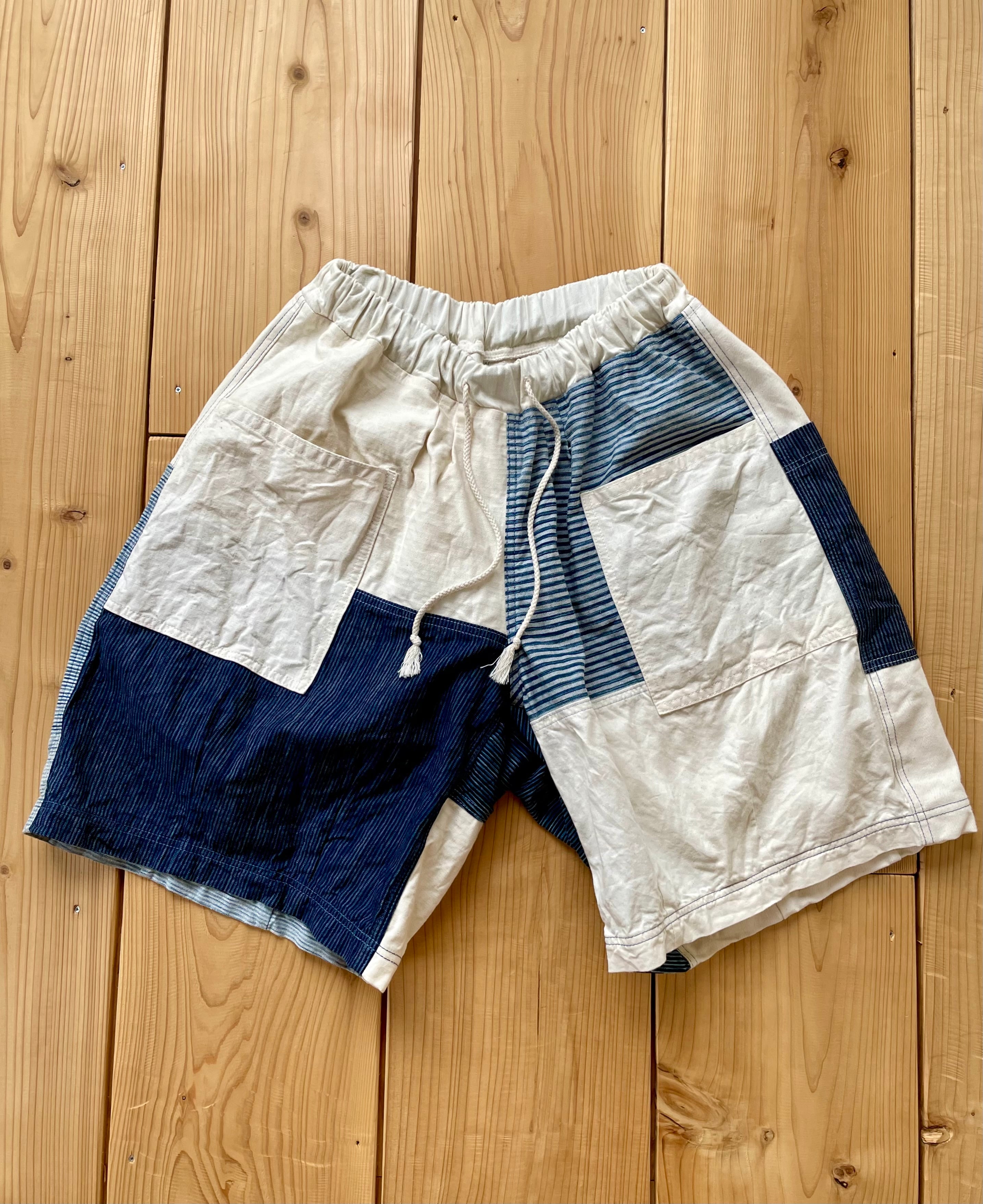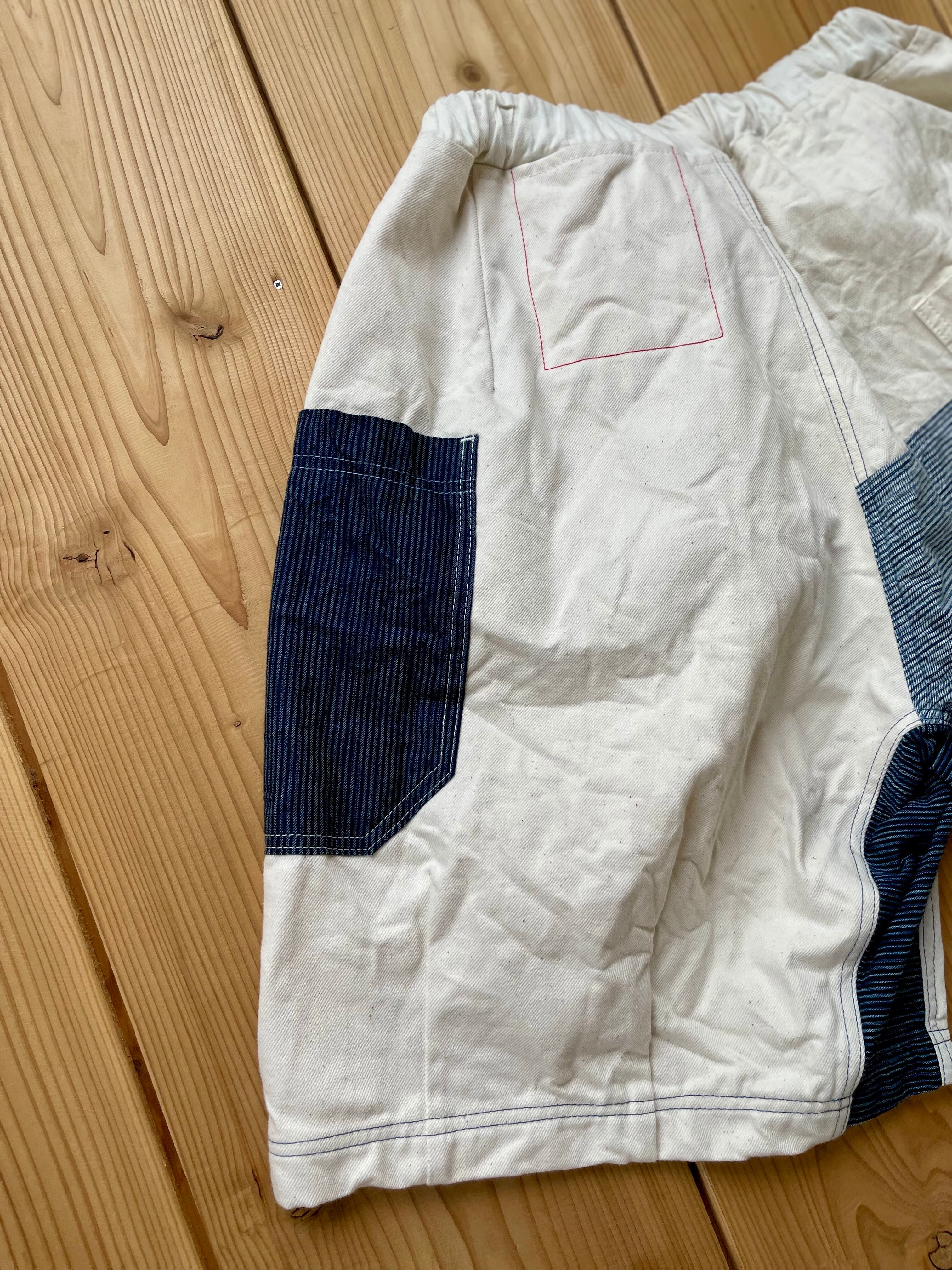 白系メインで生地を組み合わせた、さわやかなワイドな短パンとなります。