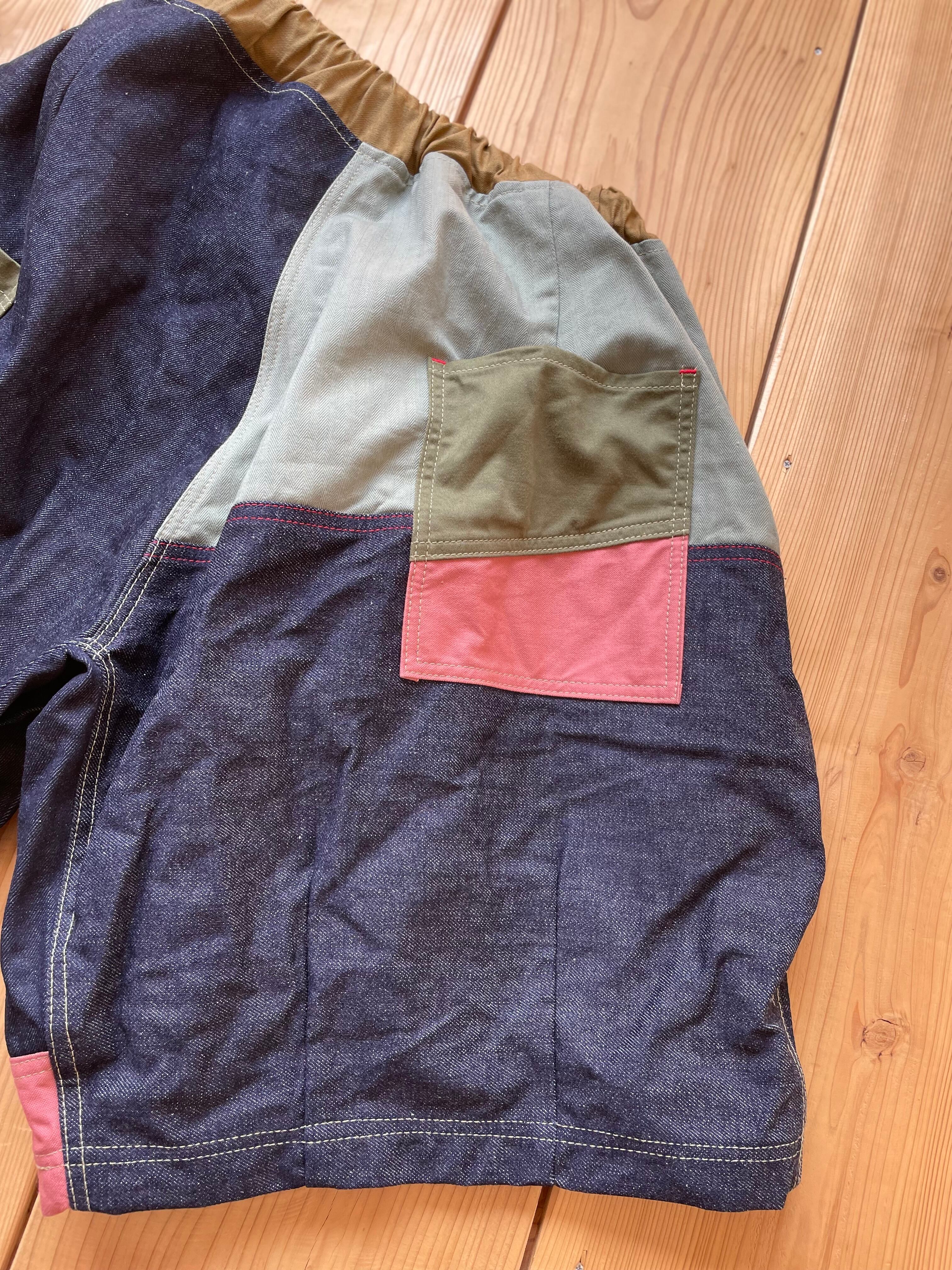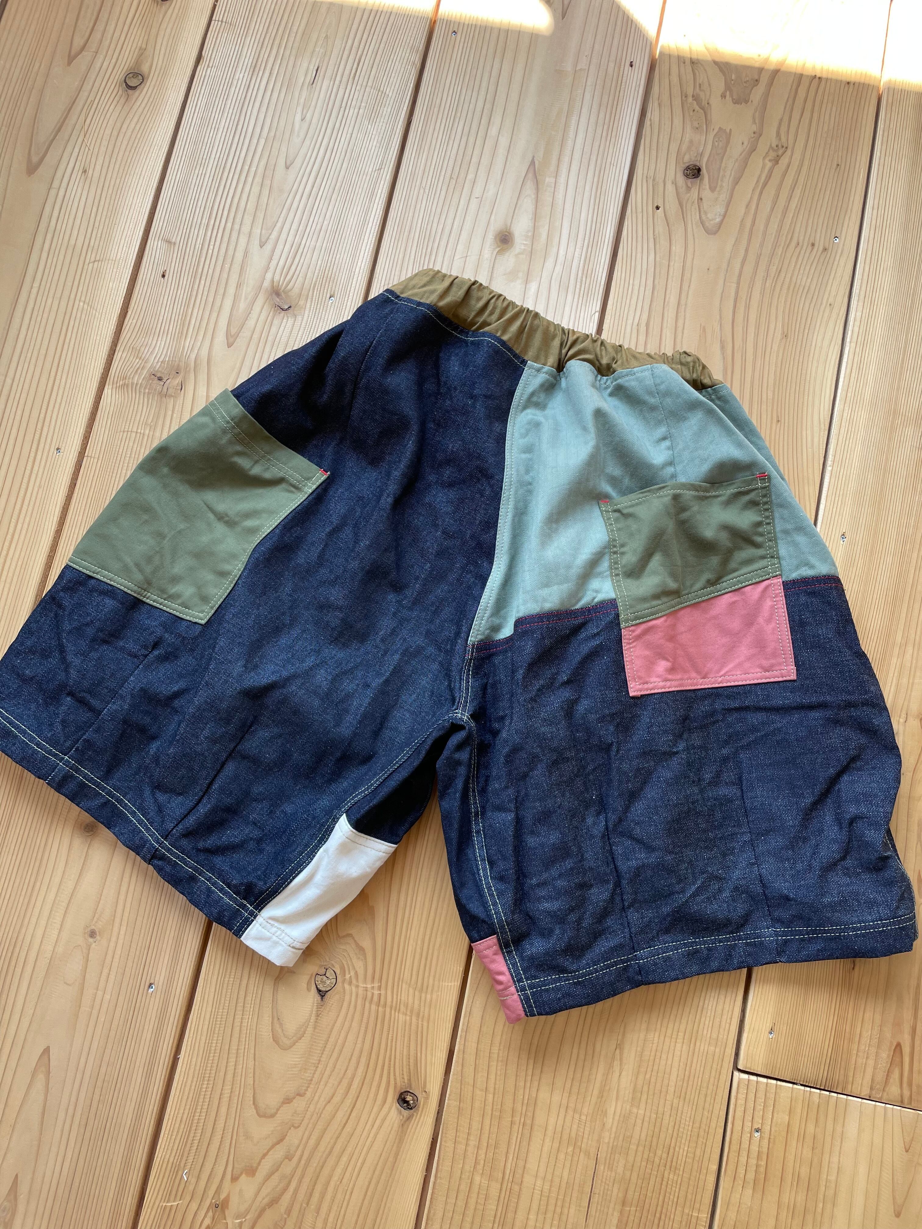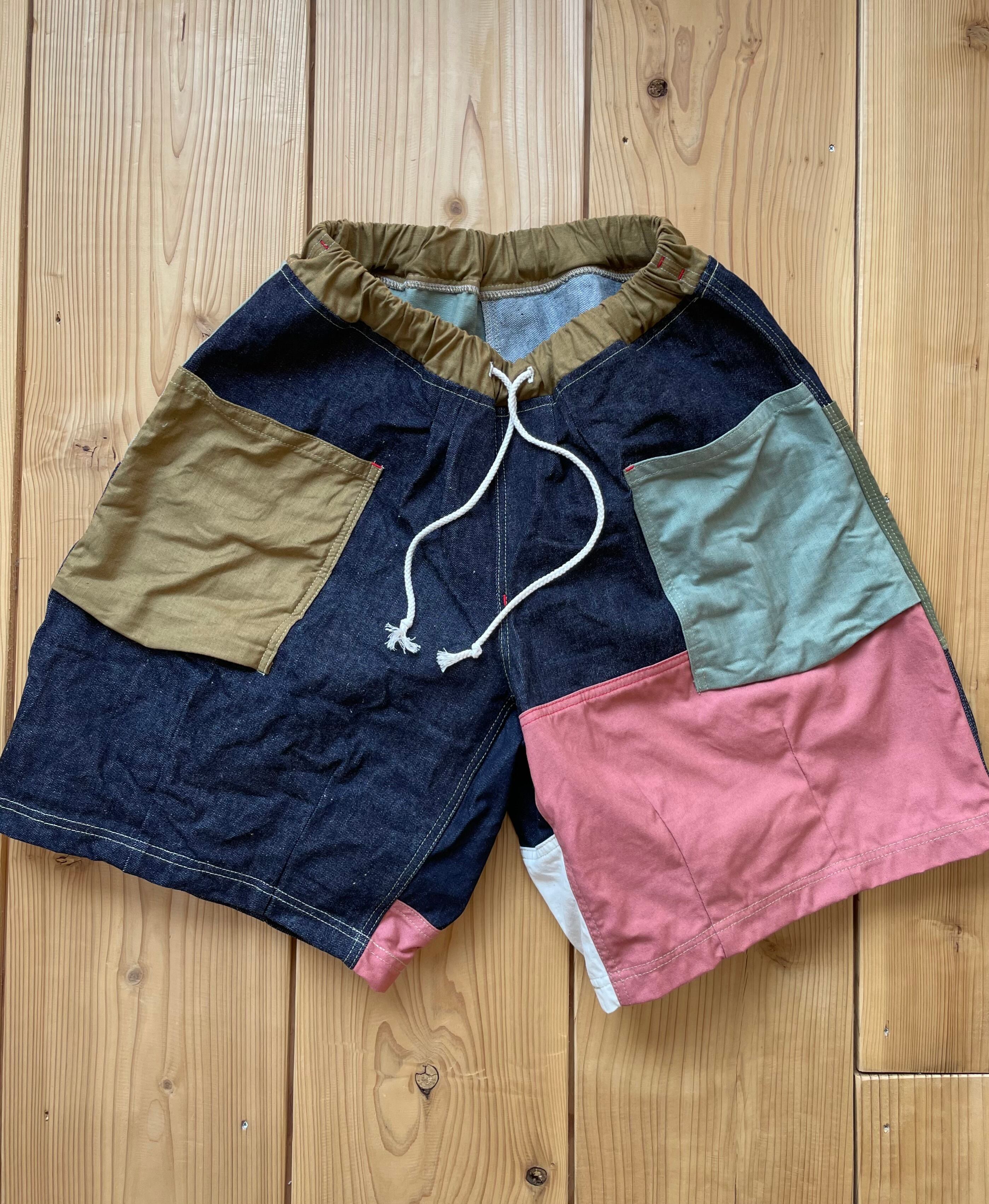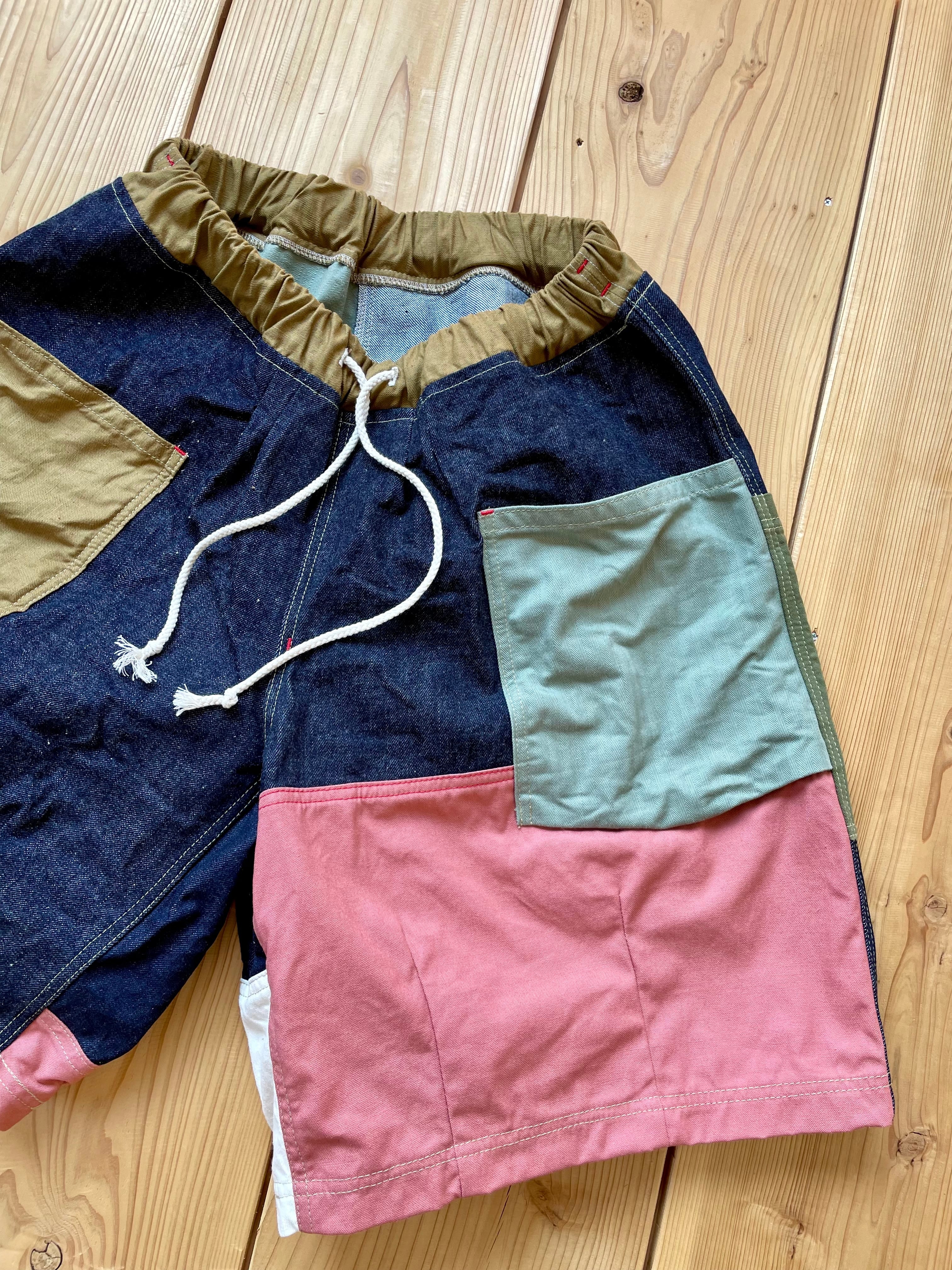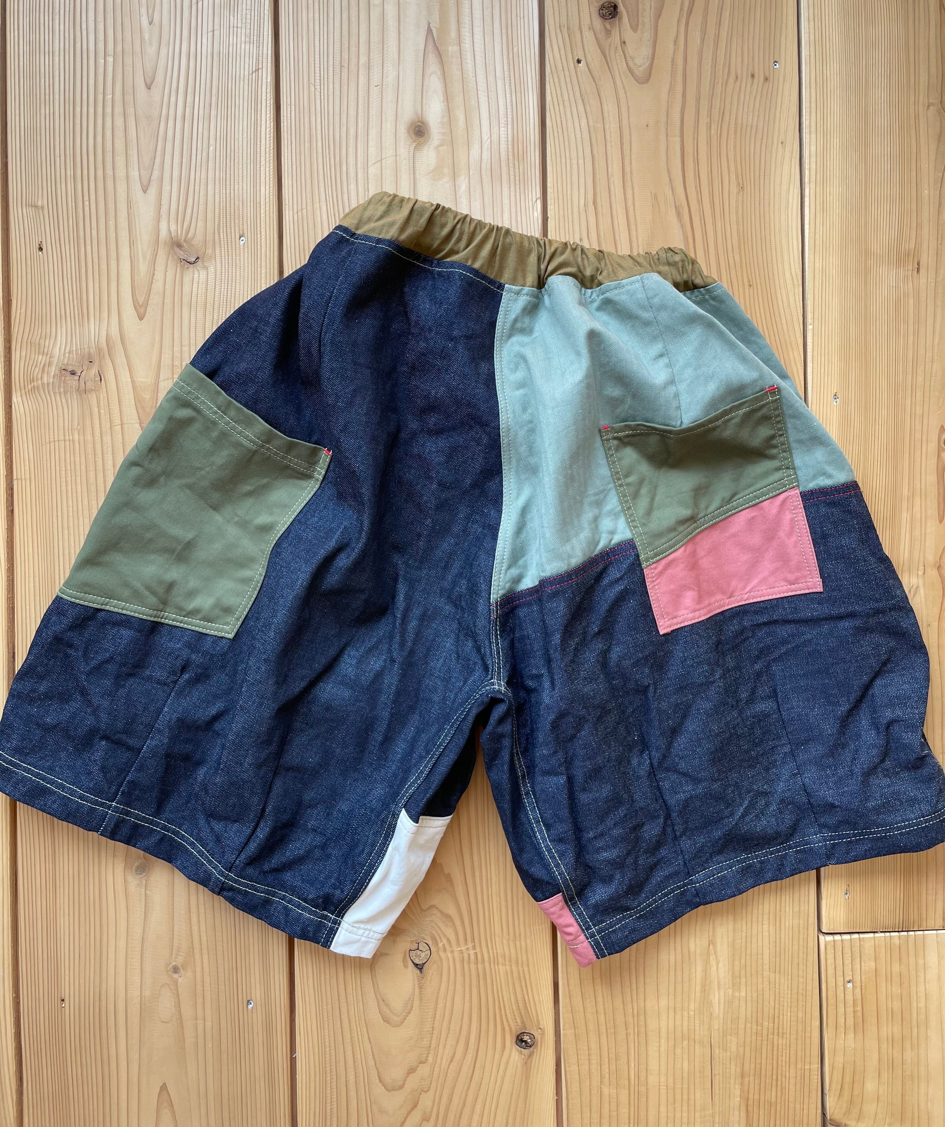 ランダムに生地を組み合わせた、さわやかなワイドな短パンとなります。