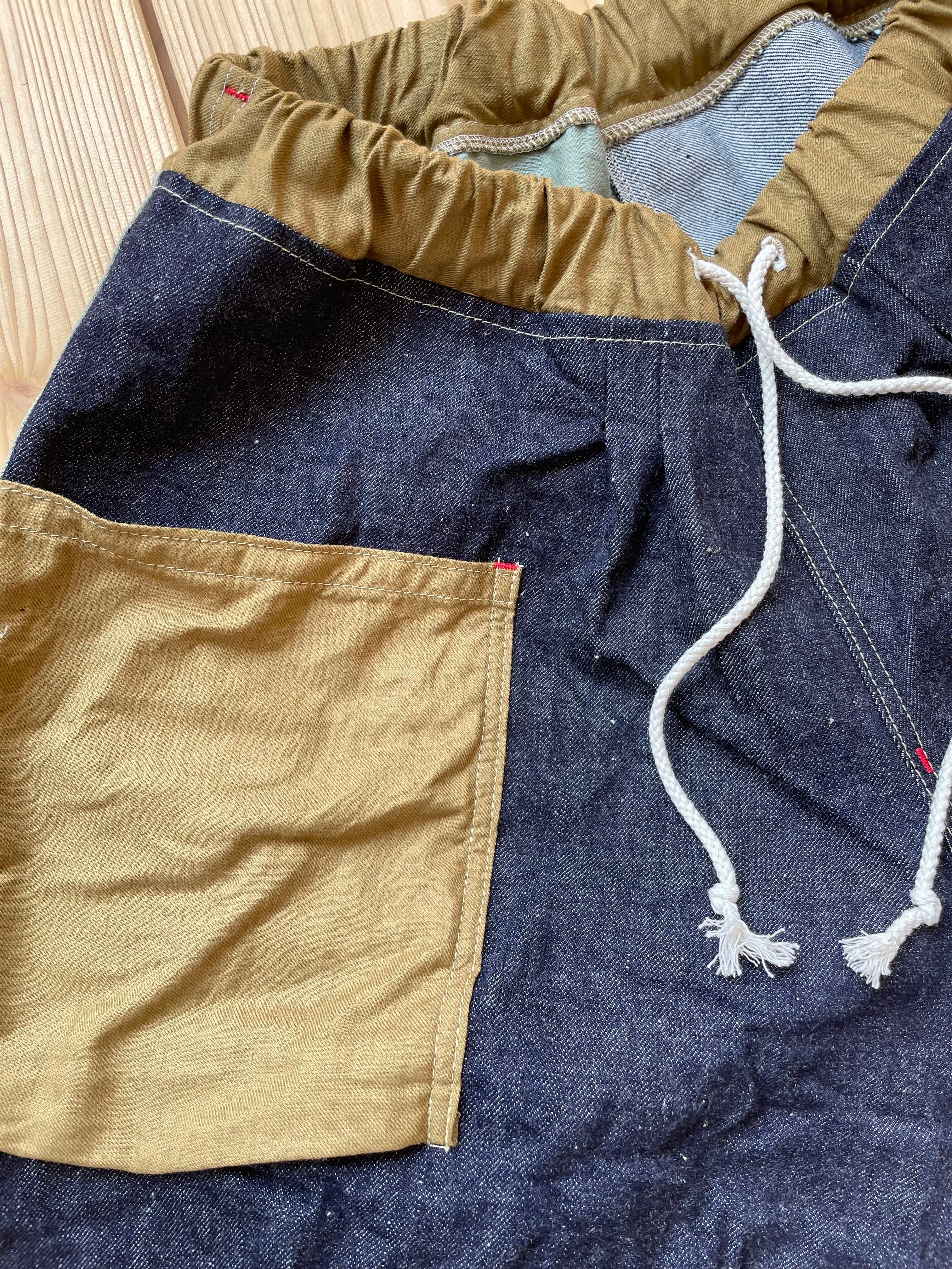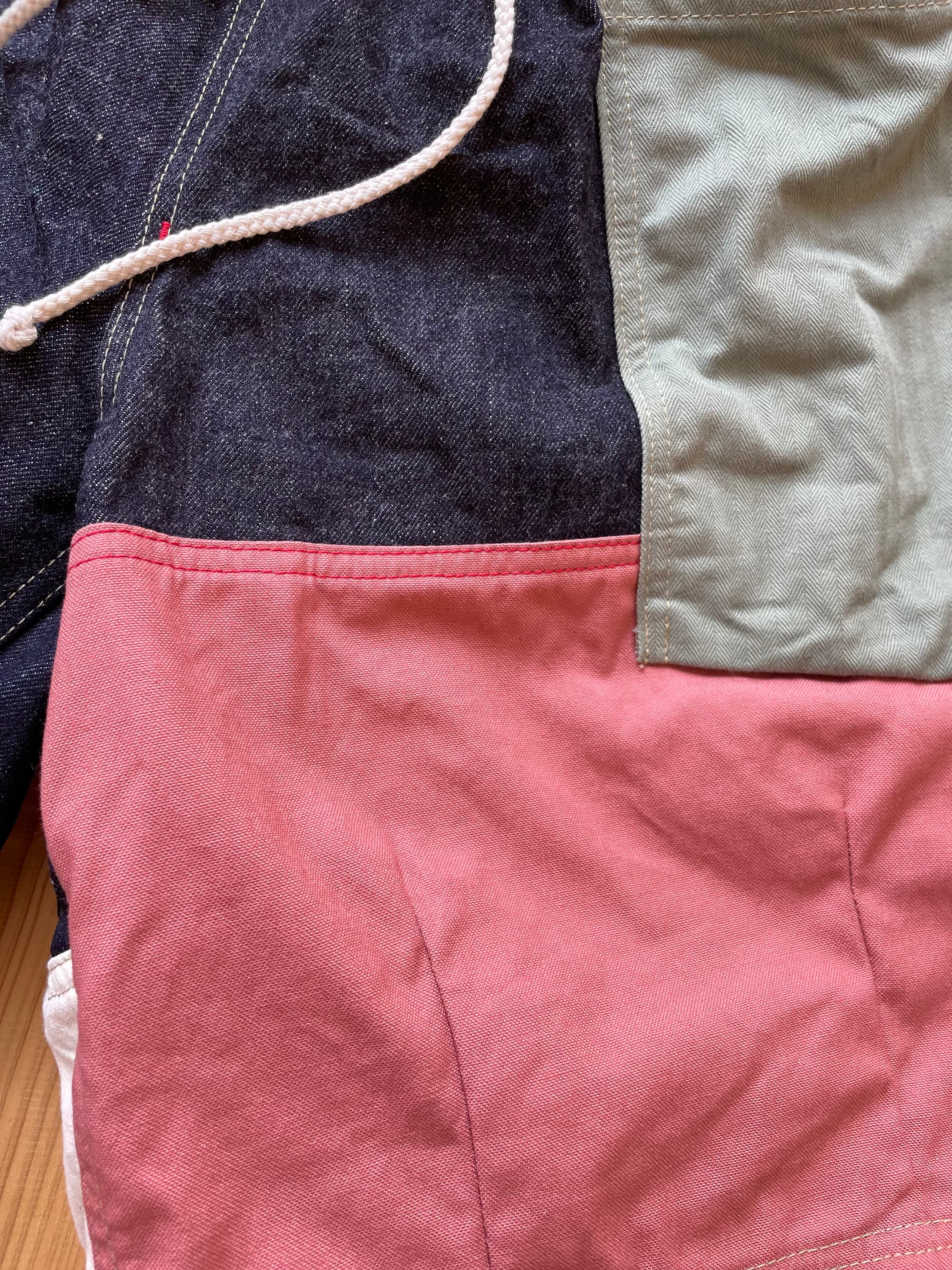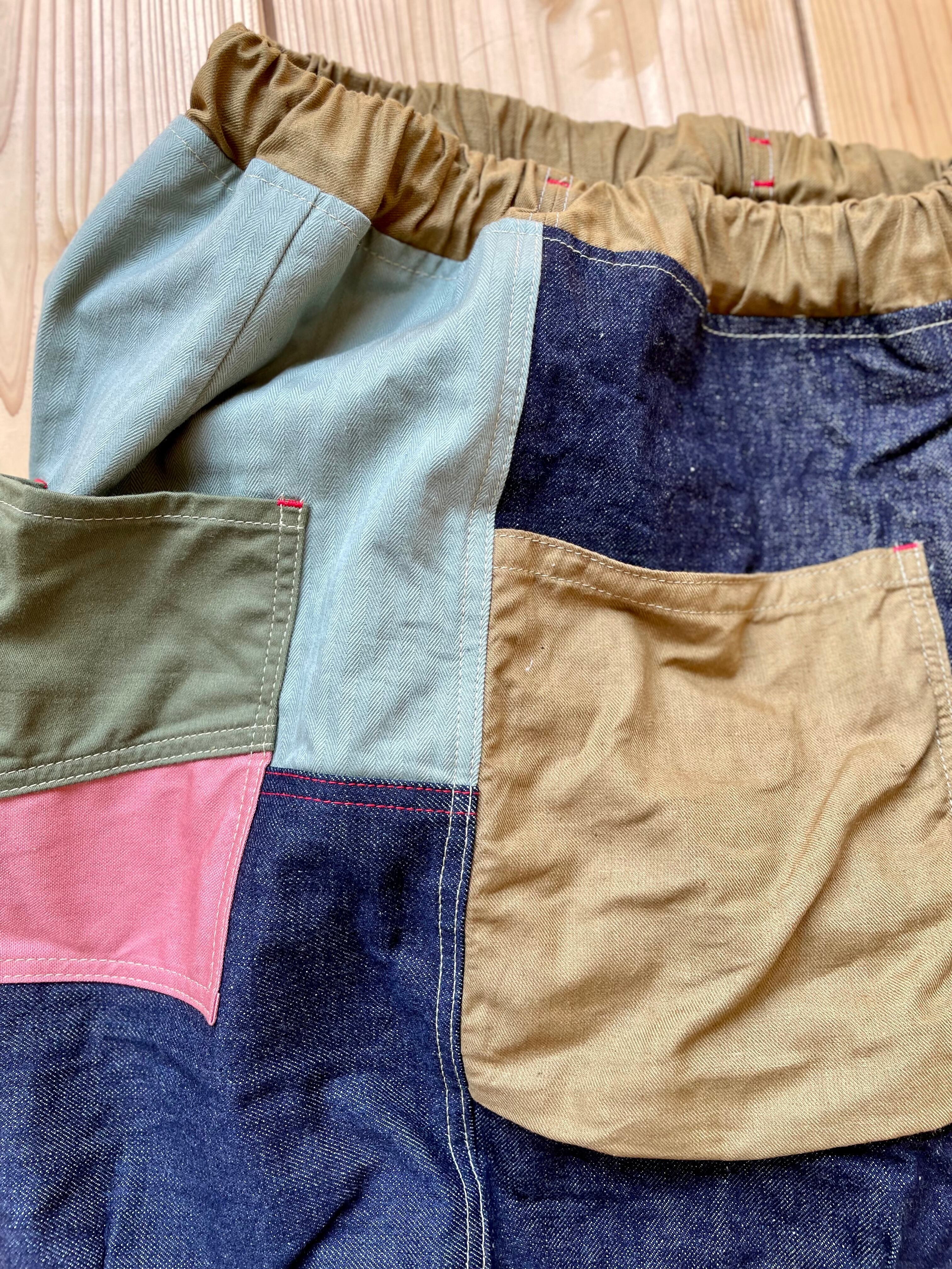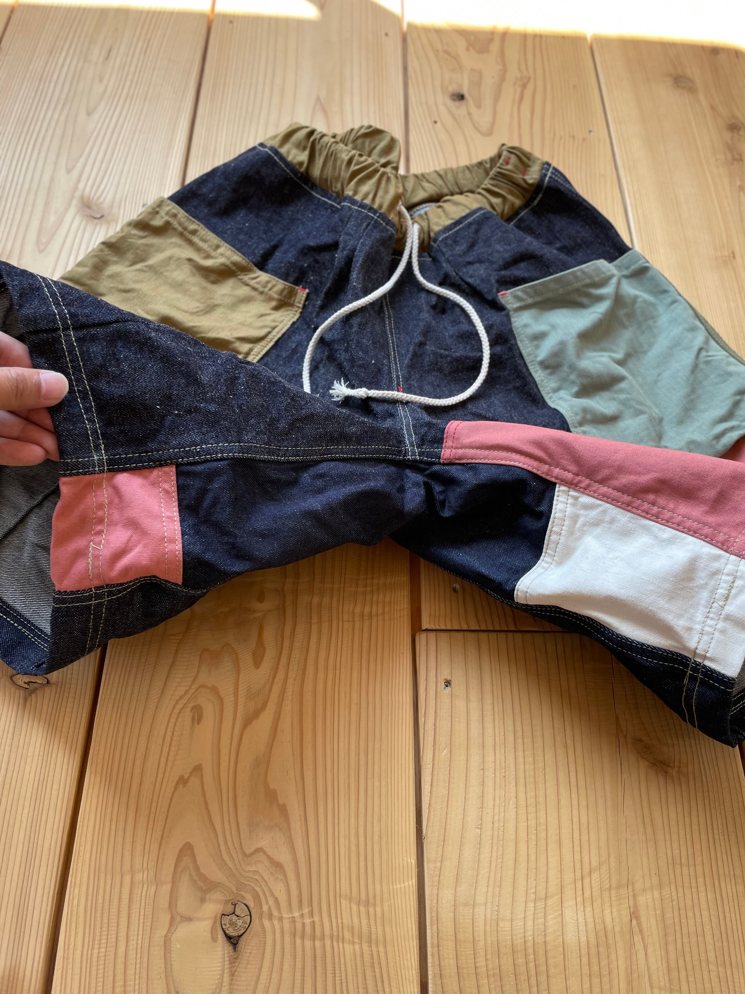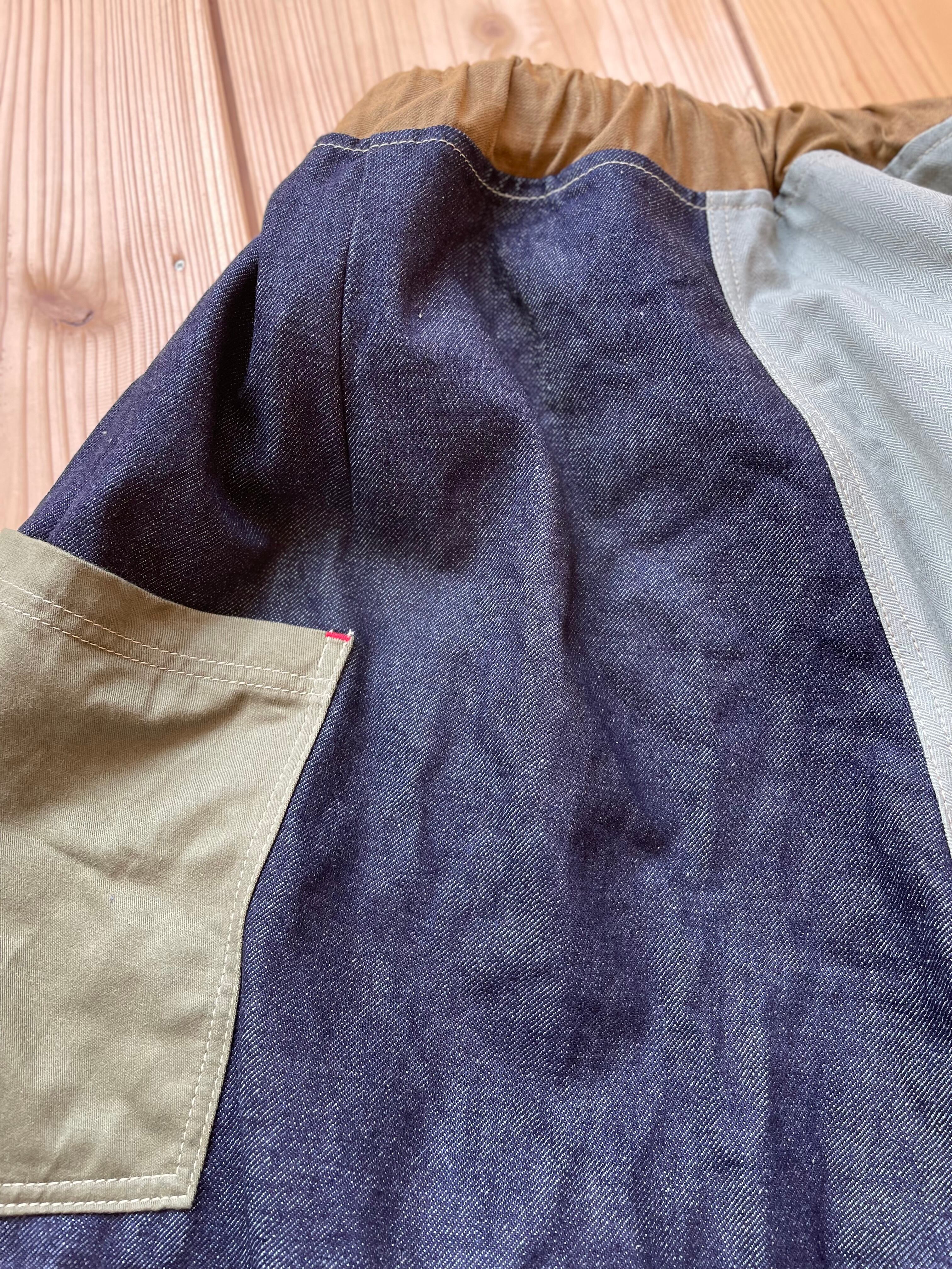 ランダムに生地を組み合わせた、さわやかなワイドな短パンとなります。