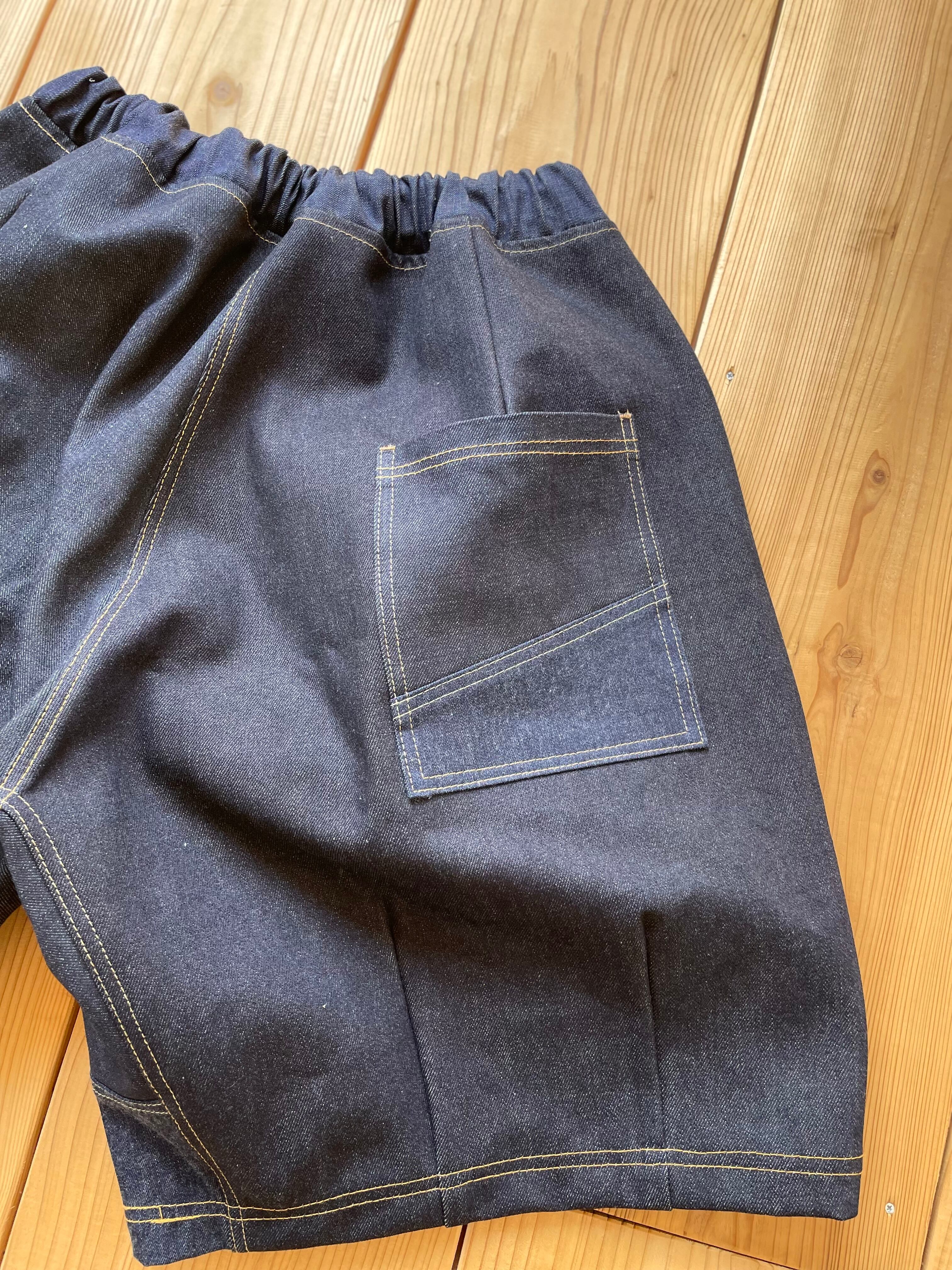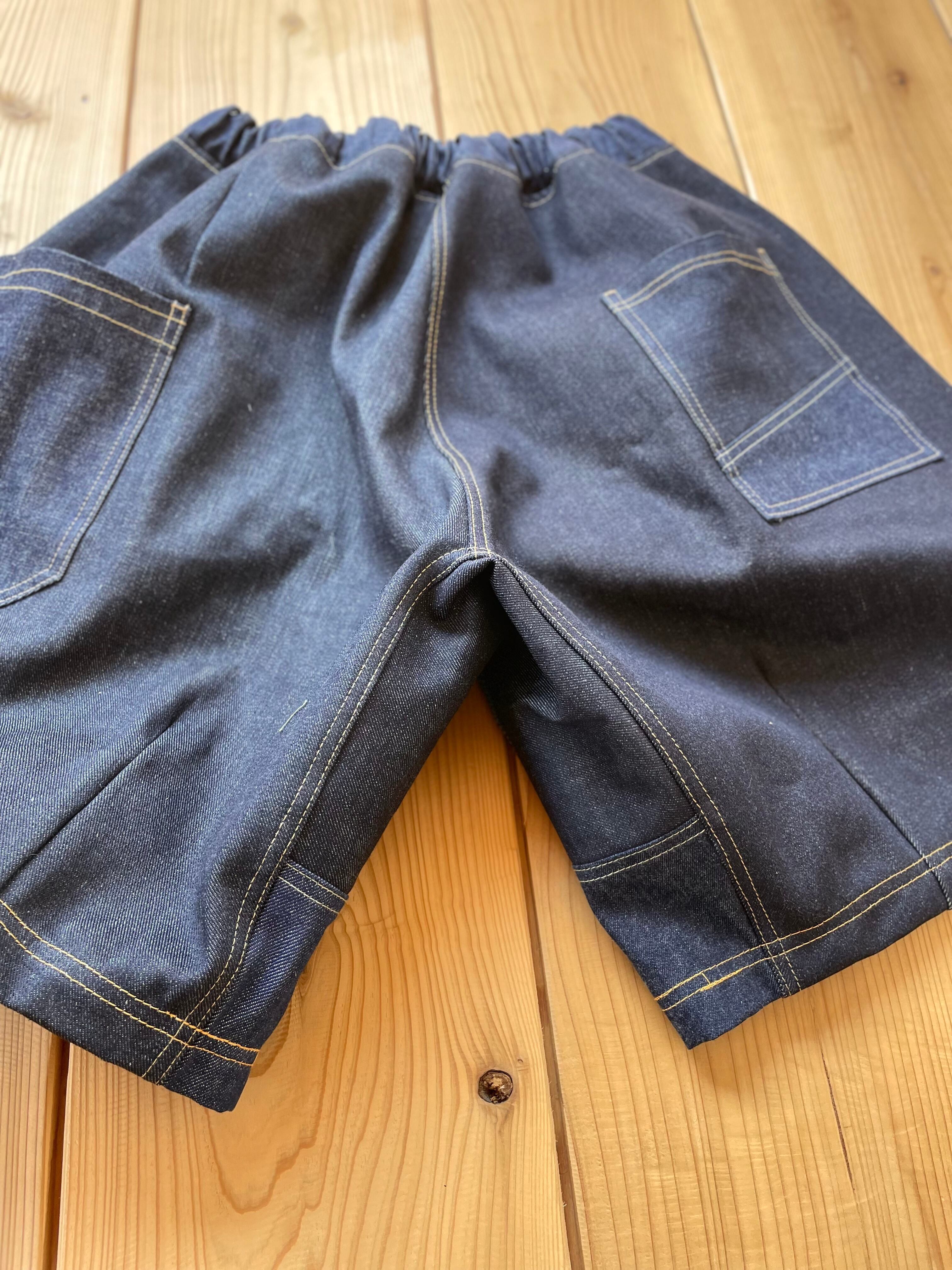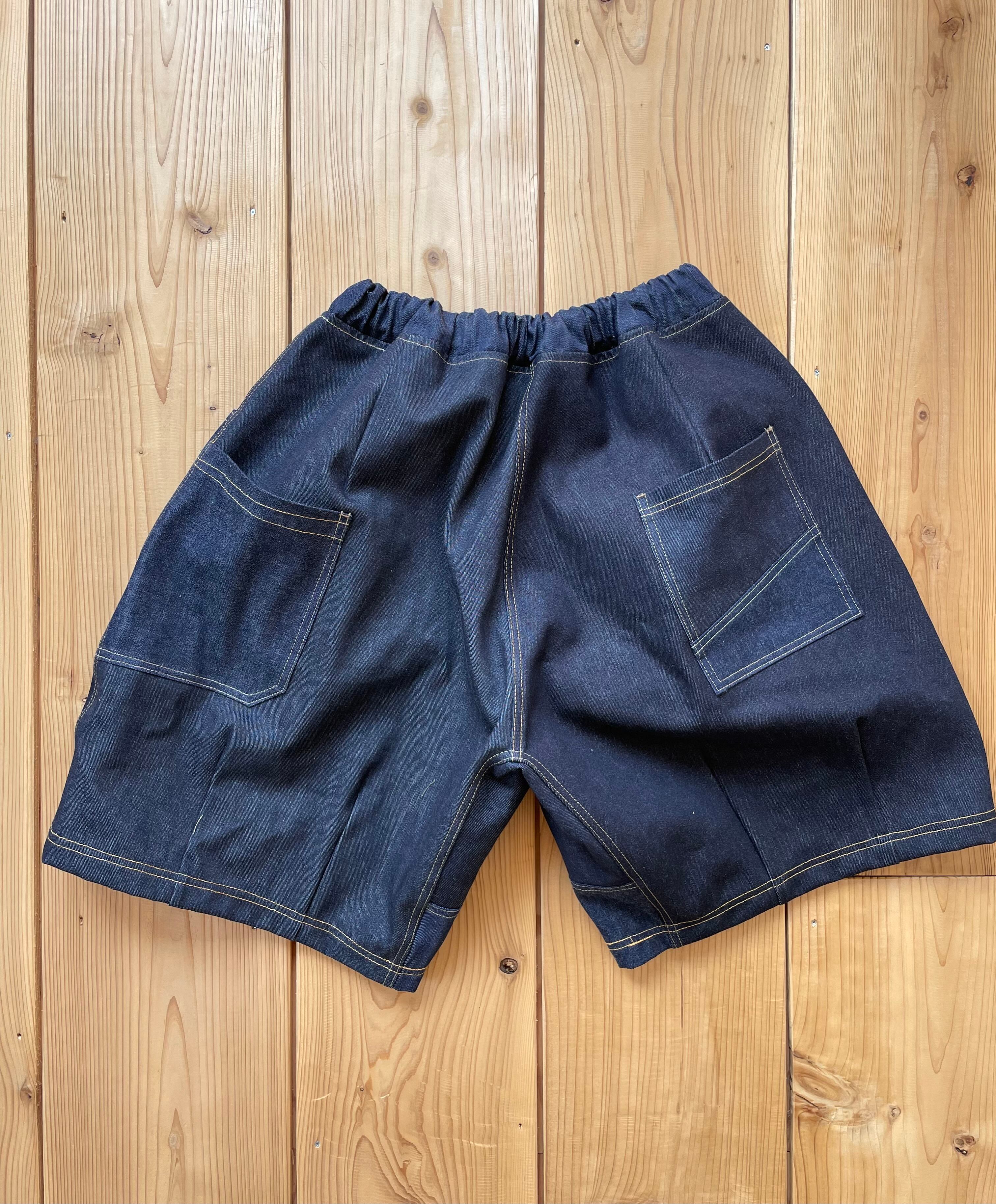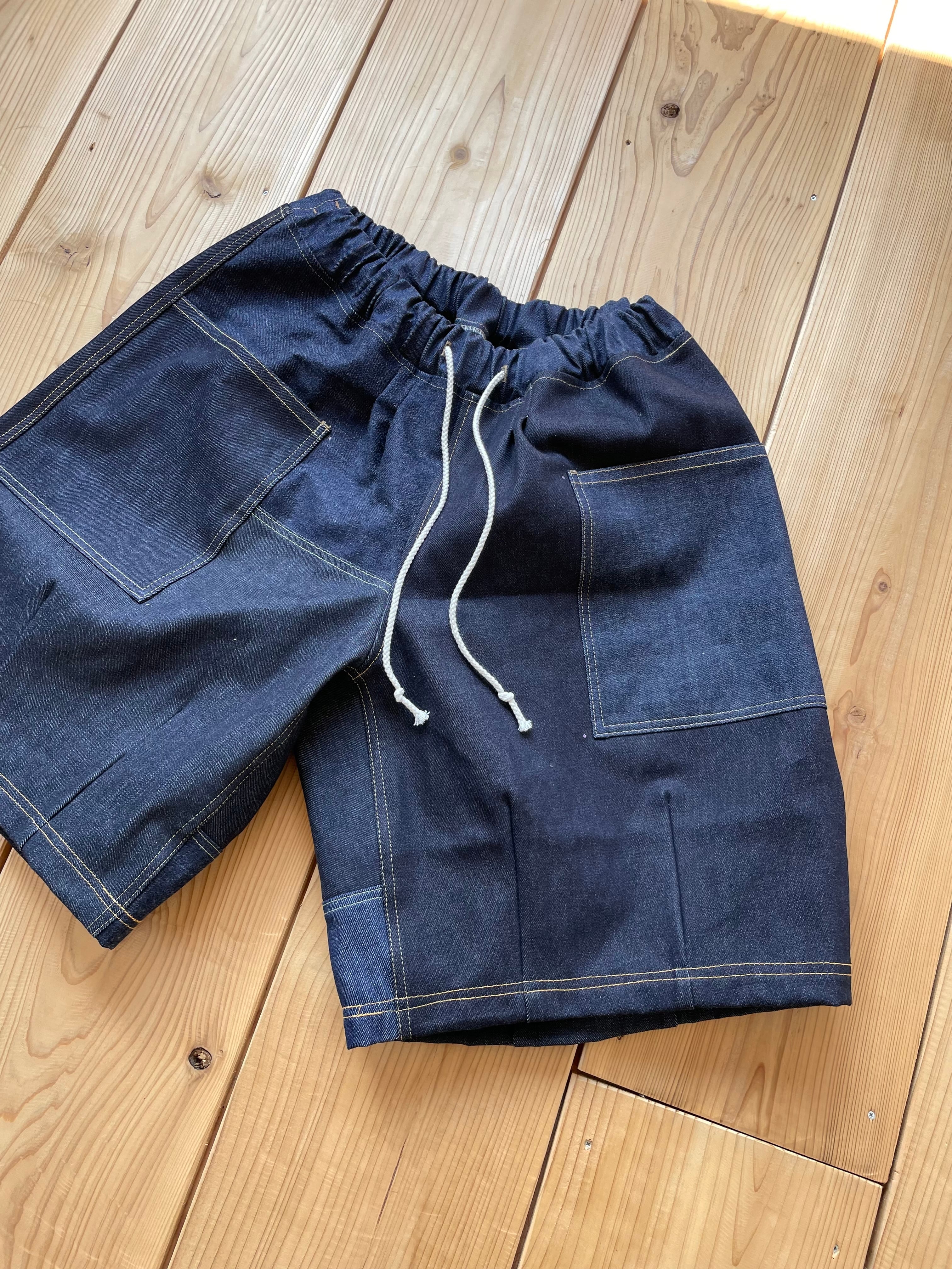 生デニム生地をランダムに組み合わせた、さわやかなワイドな短パンとなります。