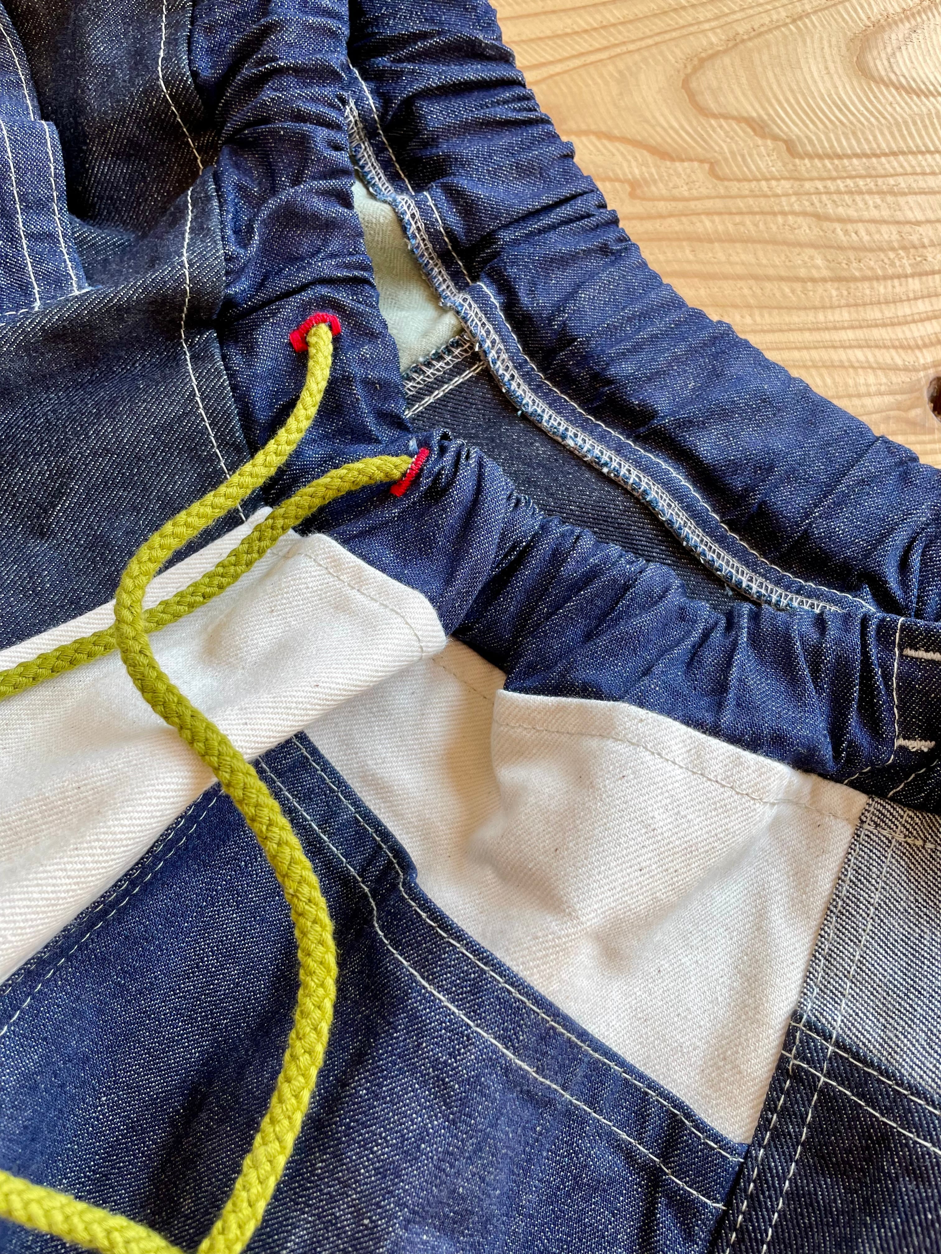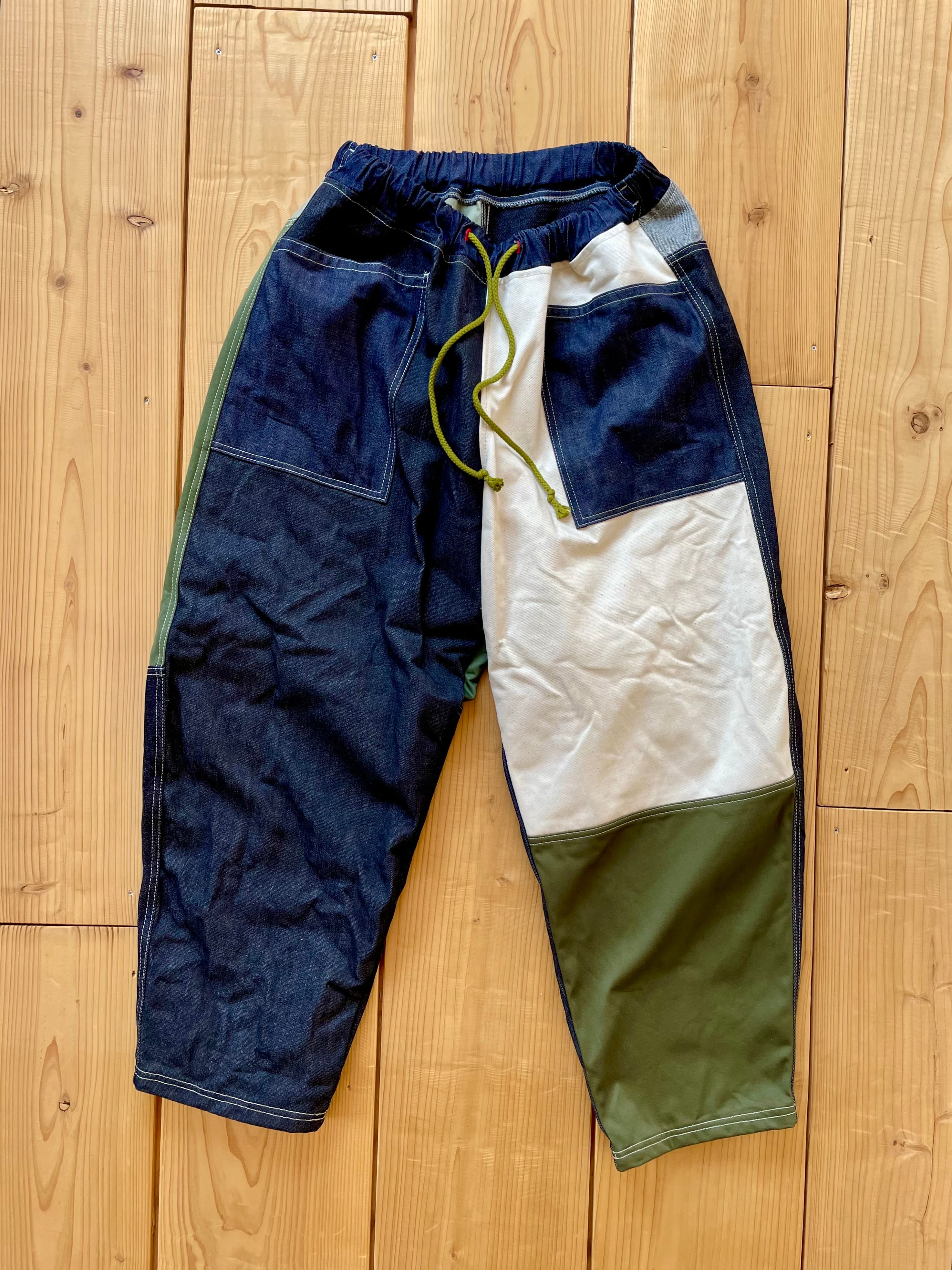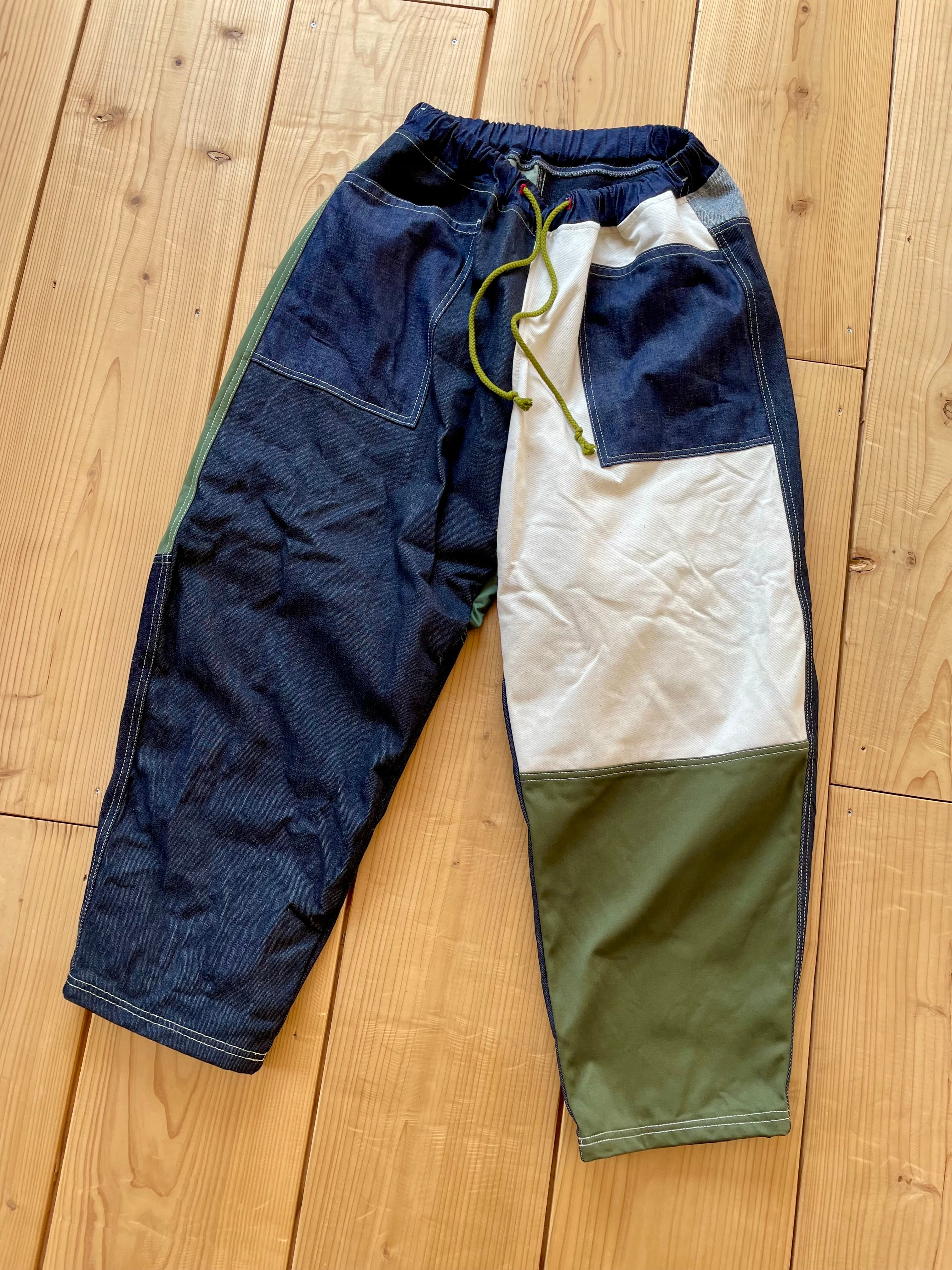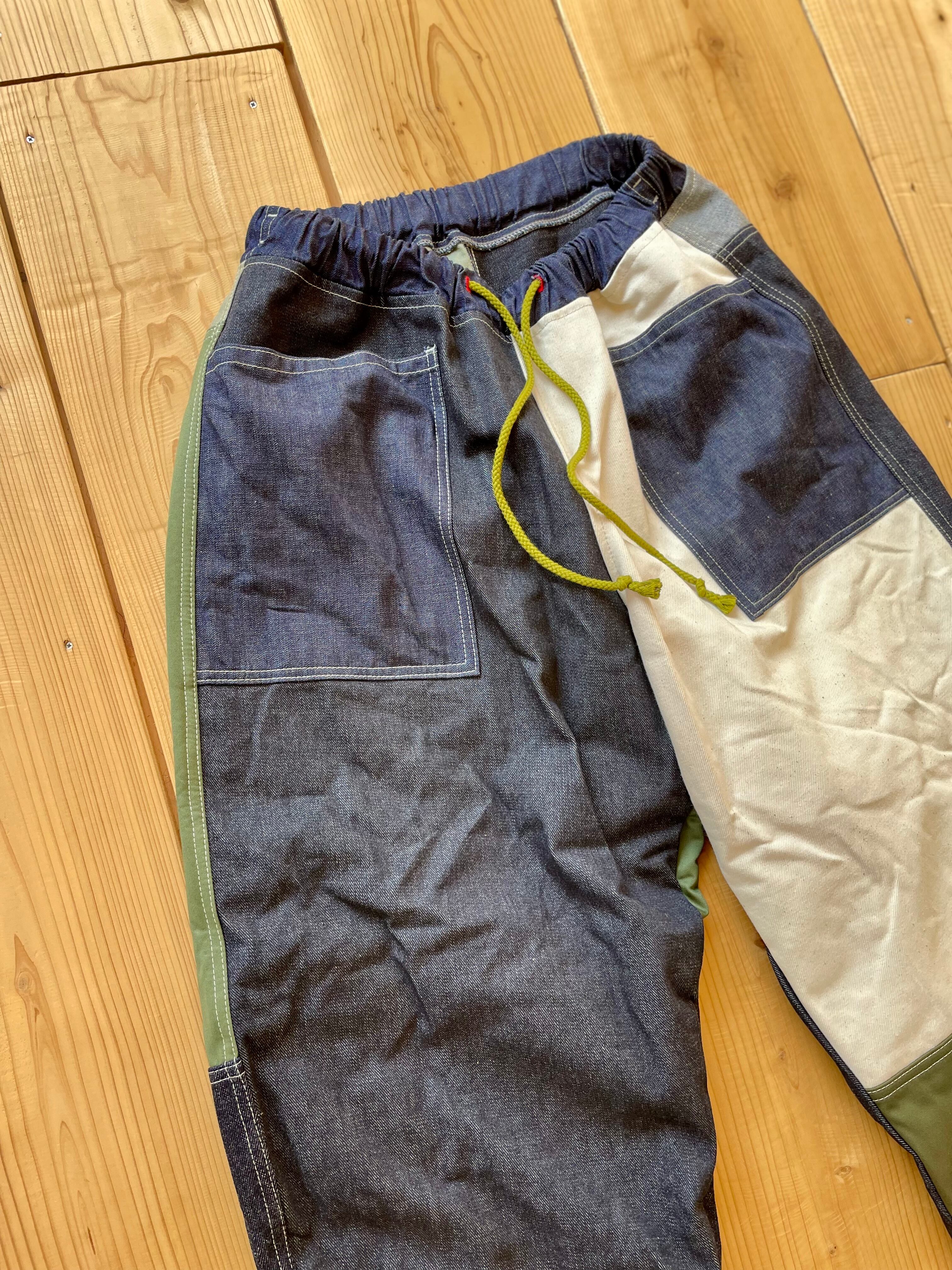 デニム、カーキ、生成り系の中厚手な生地をパーツごとにランダムに使っています。