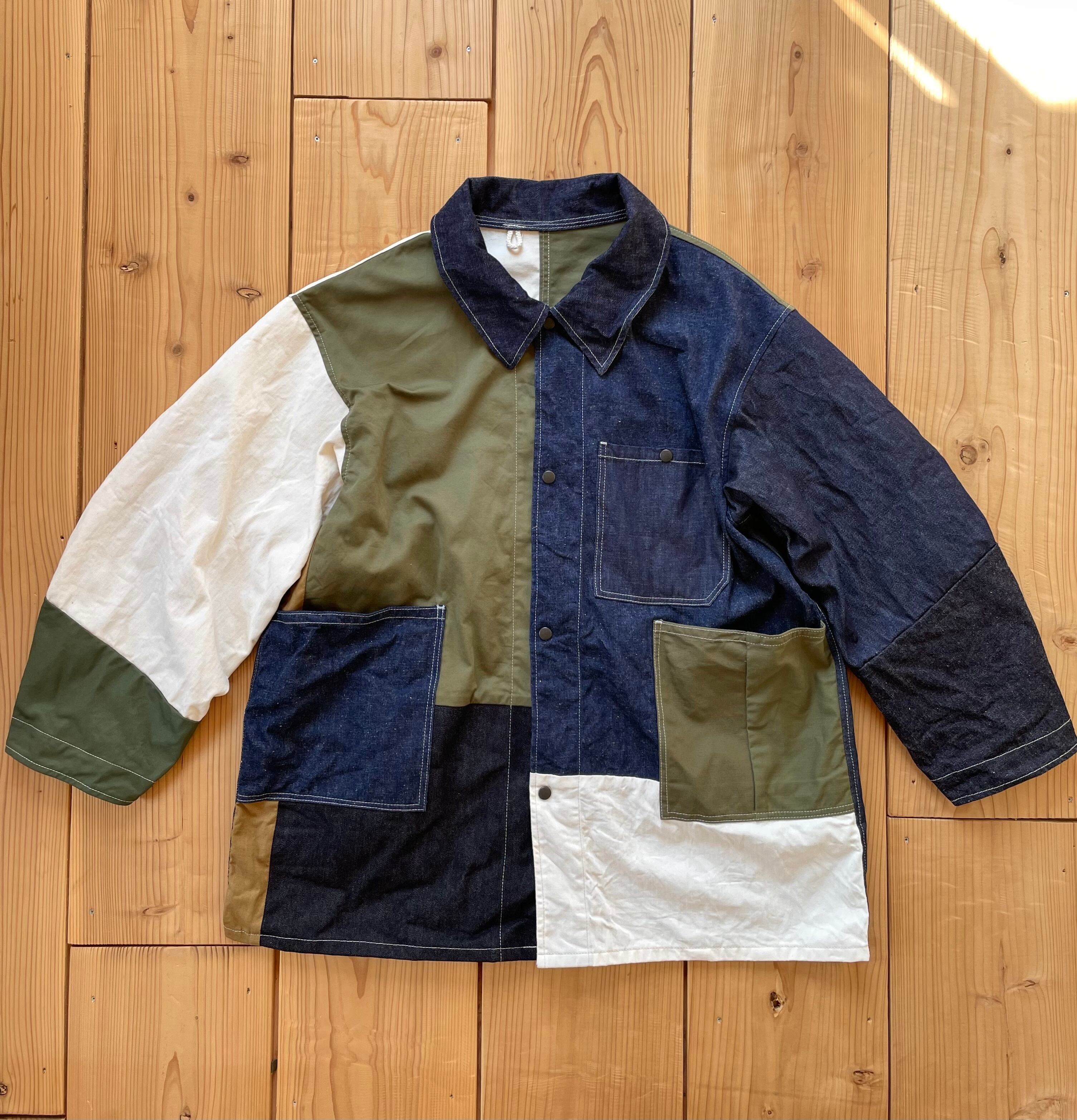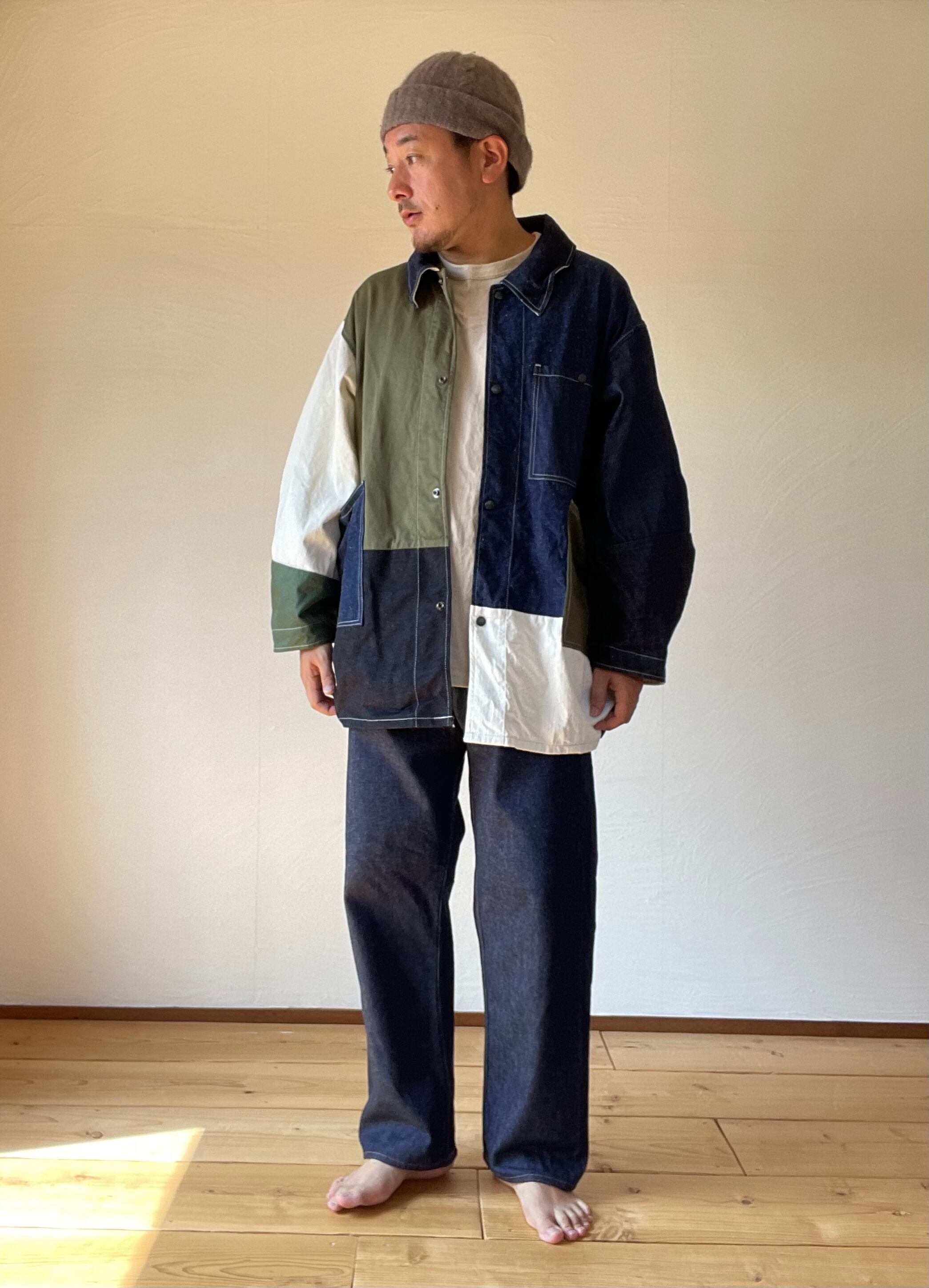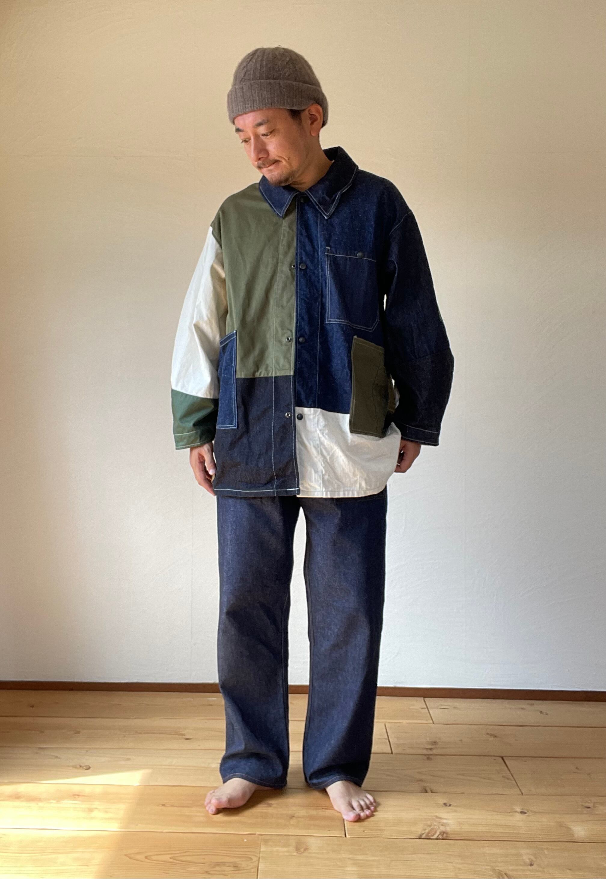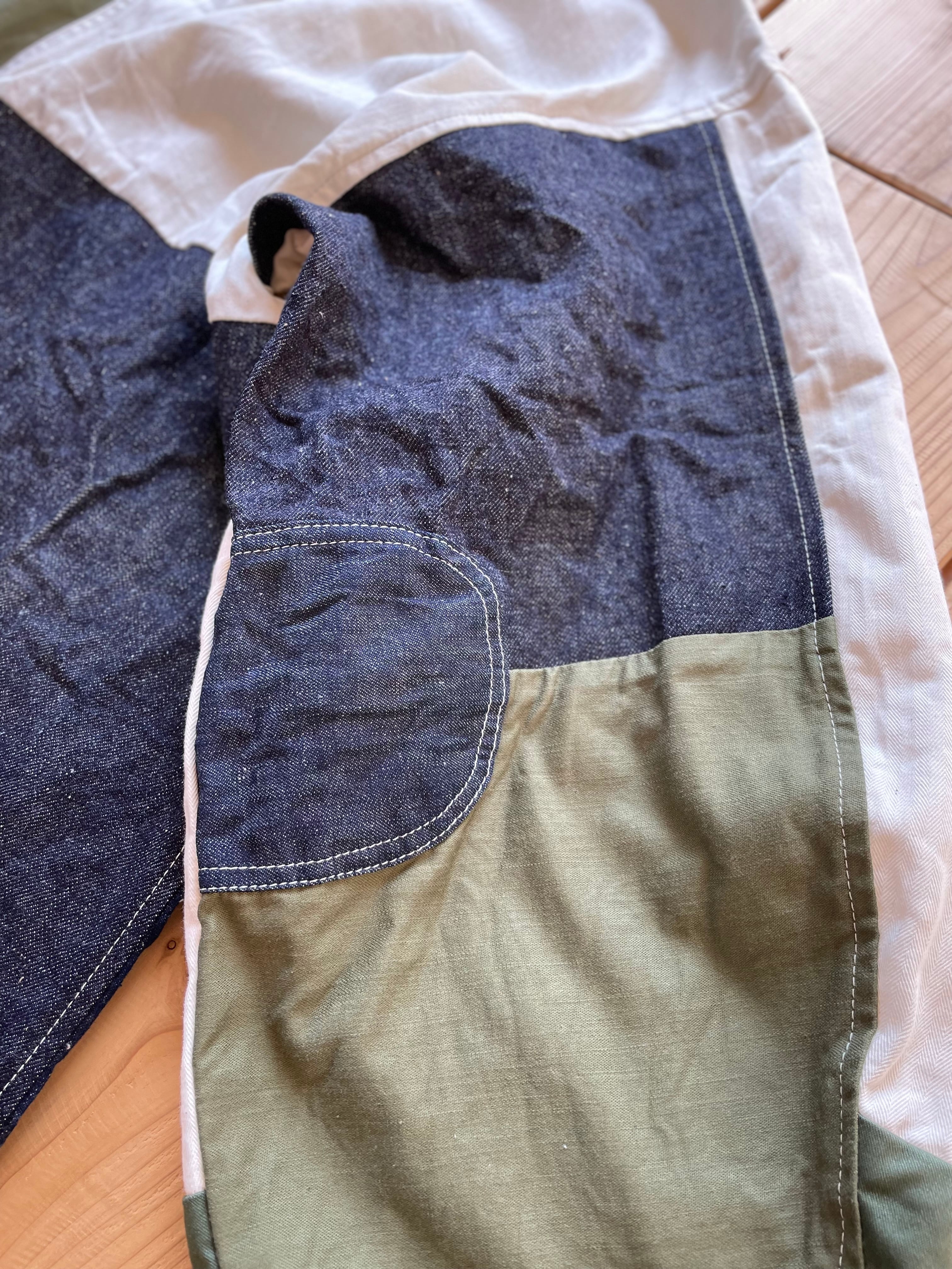 デニム、カーキ、白系のコットン素材でランダムに仕上げています。