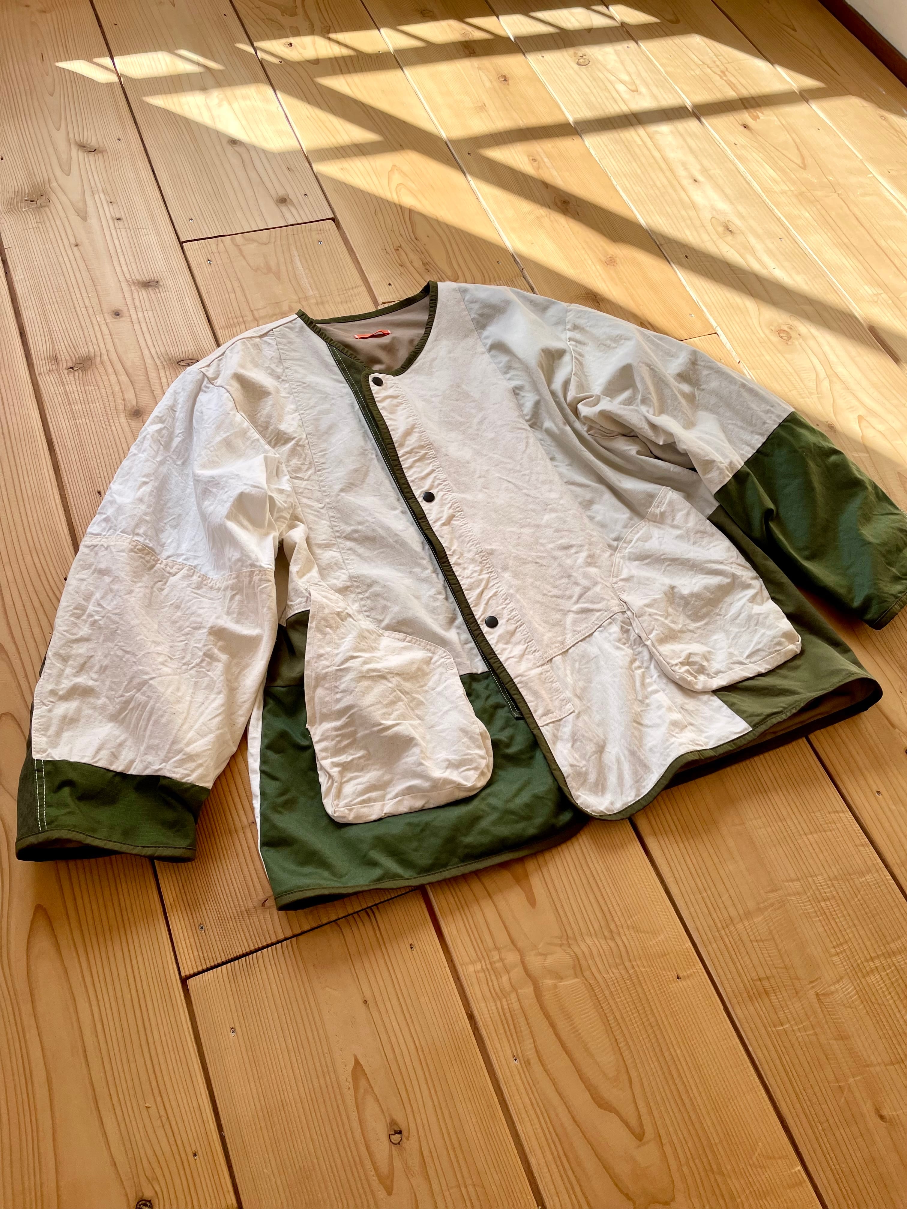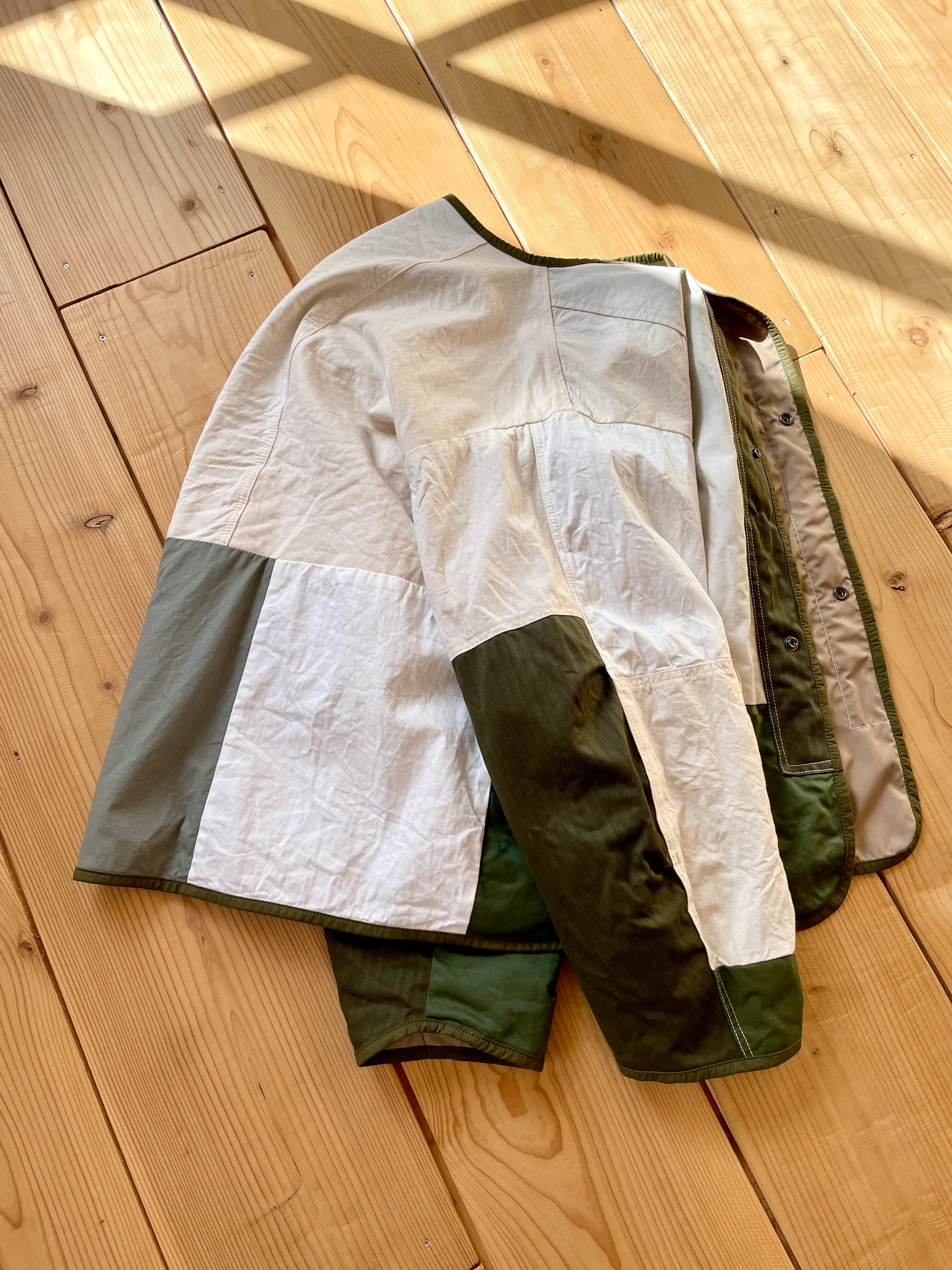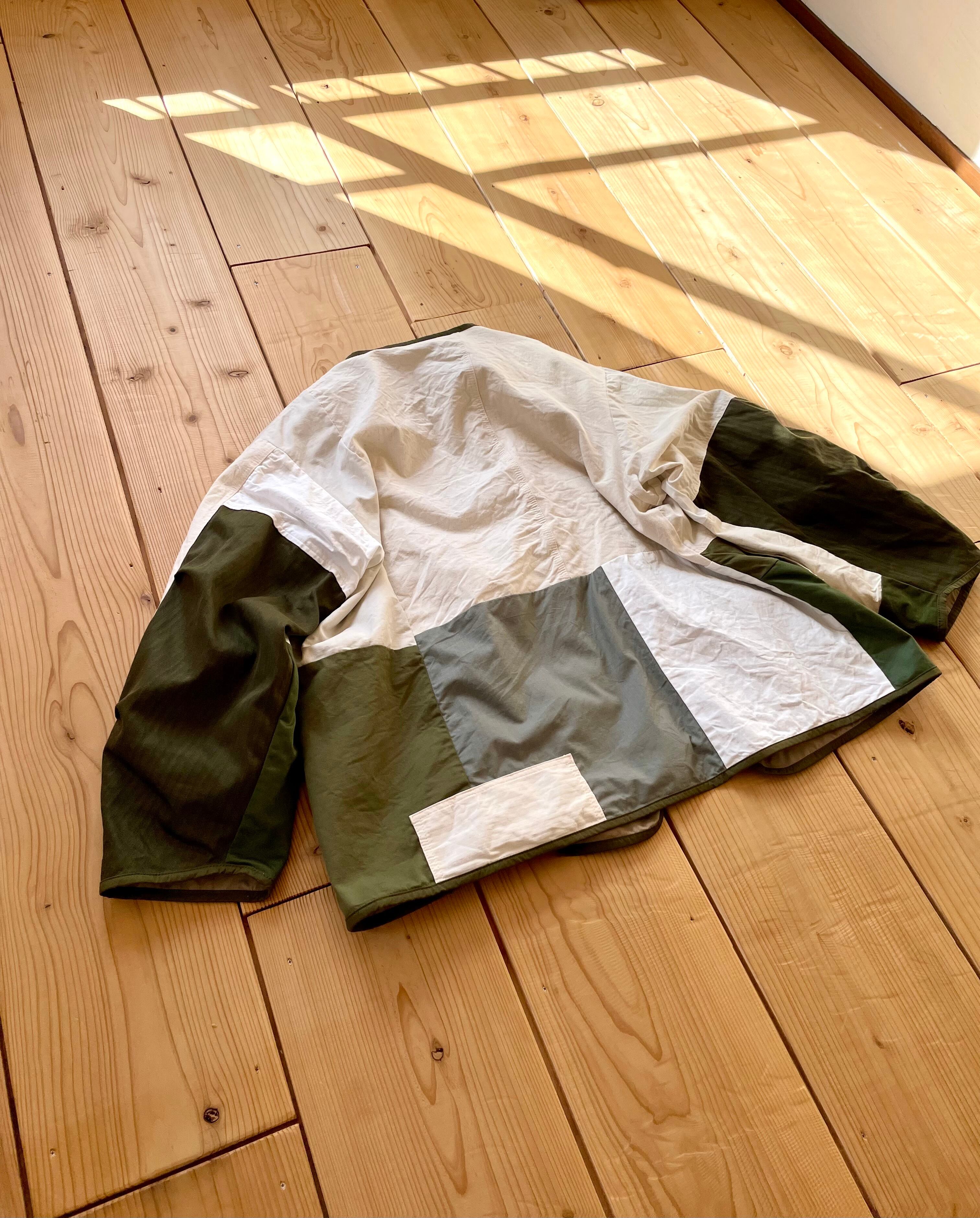 白、生成り系とカーキ系コットン生地でランダムに仕上げています。