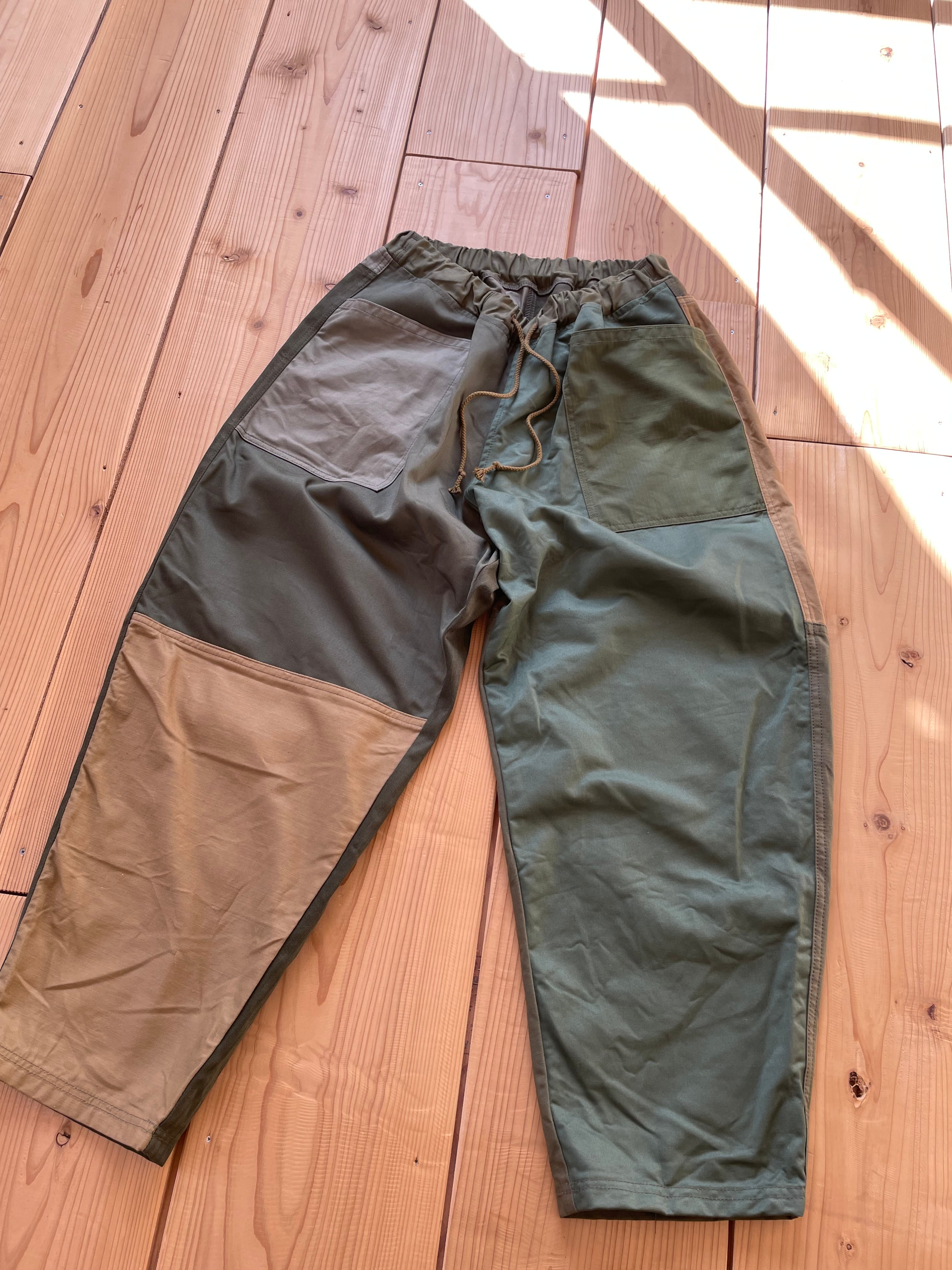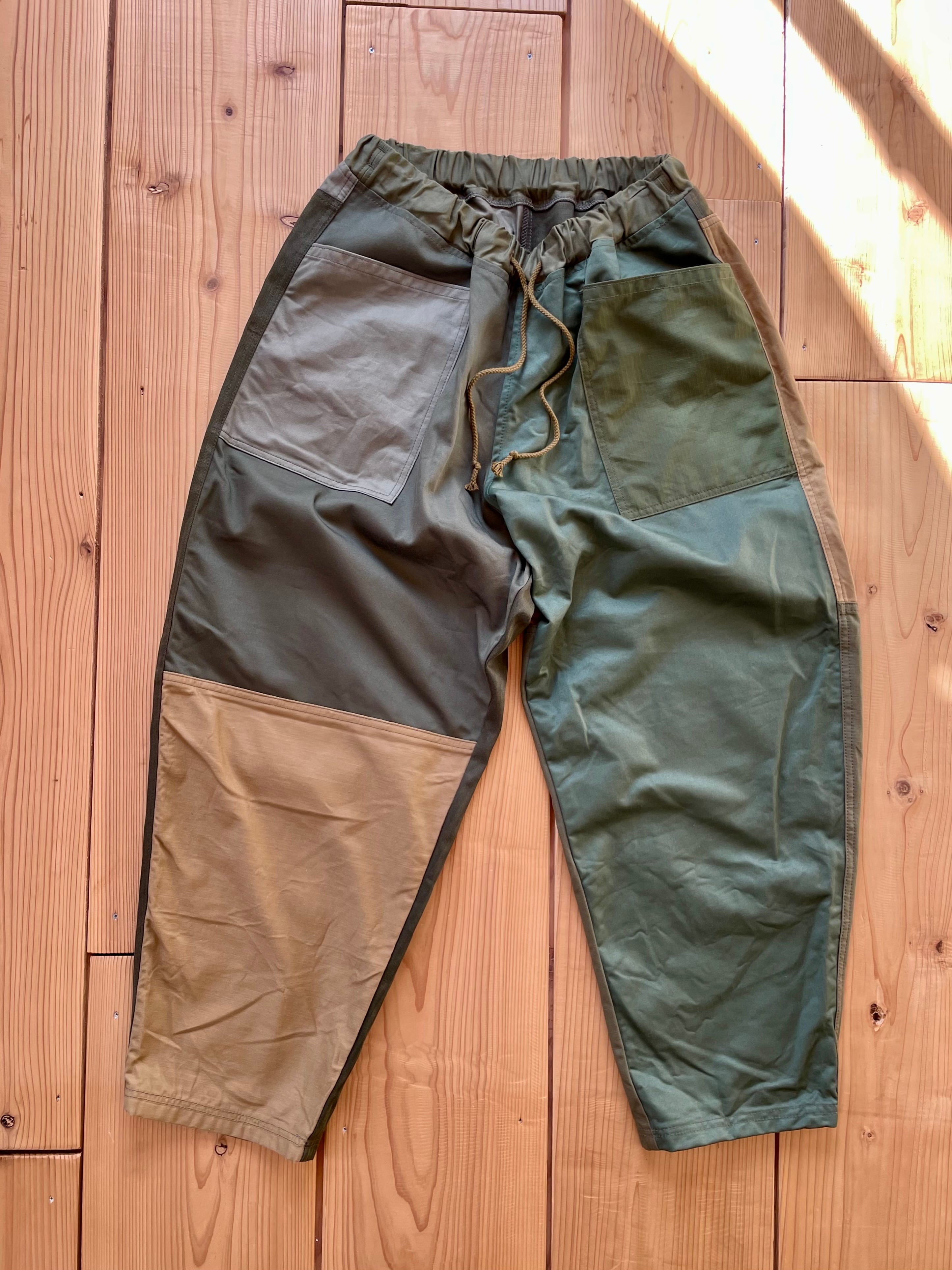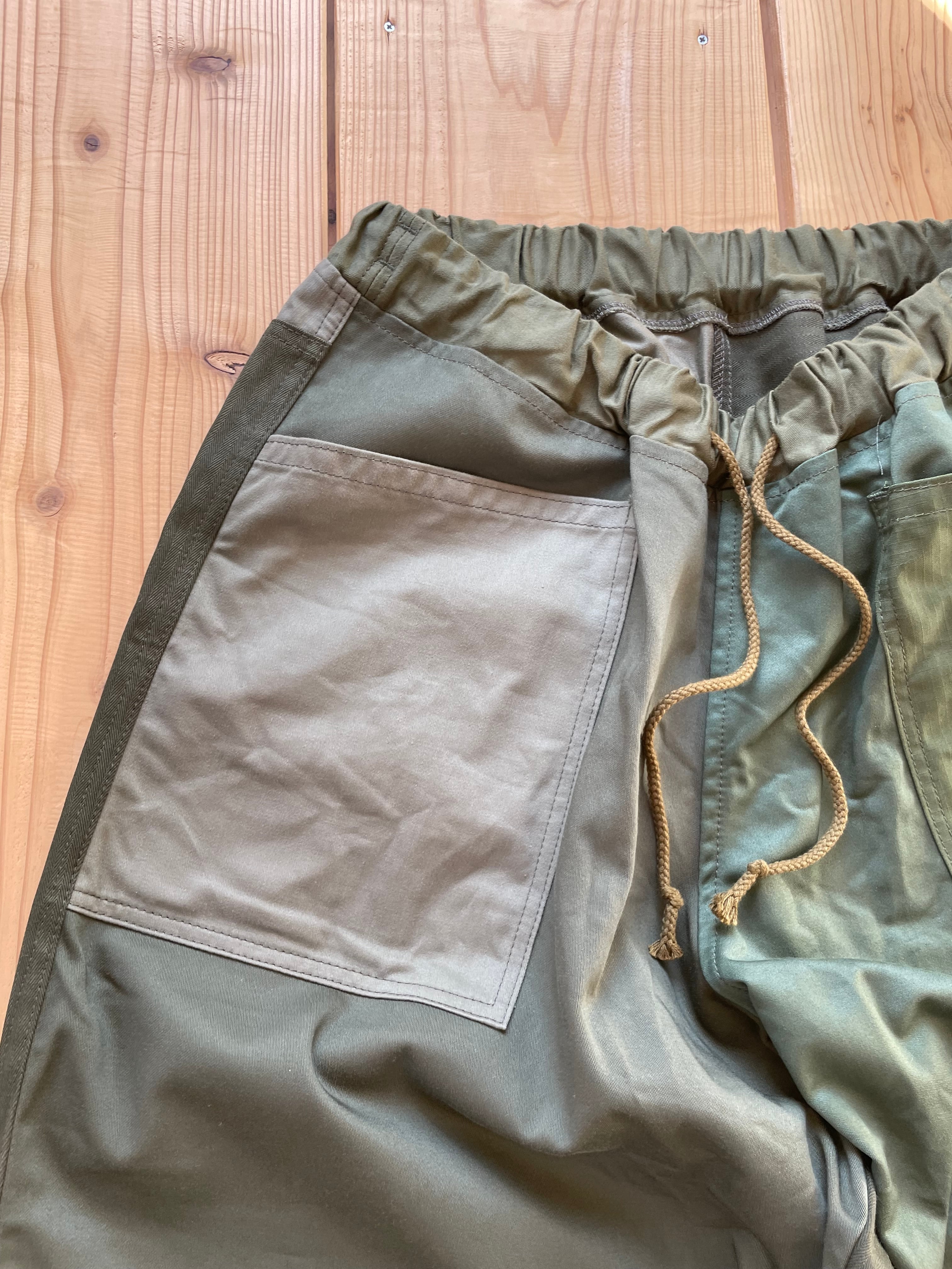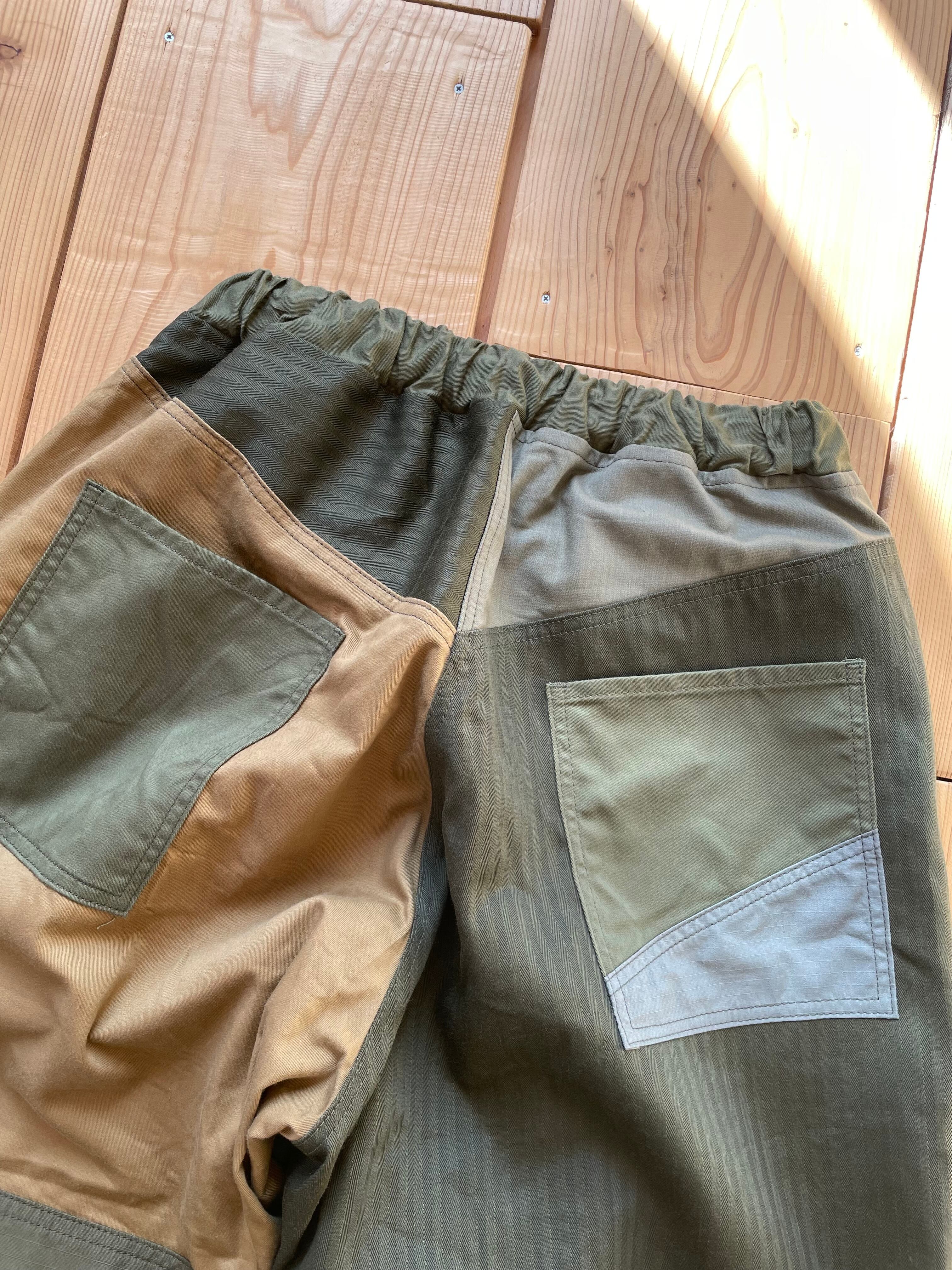 カーキ系で生地をランダムに使っています。