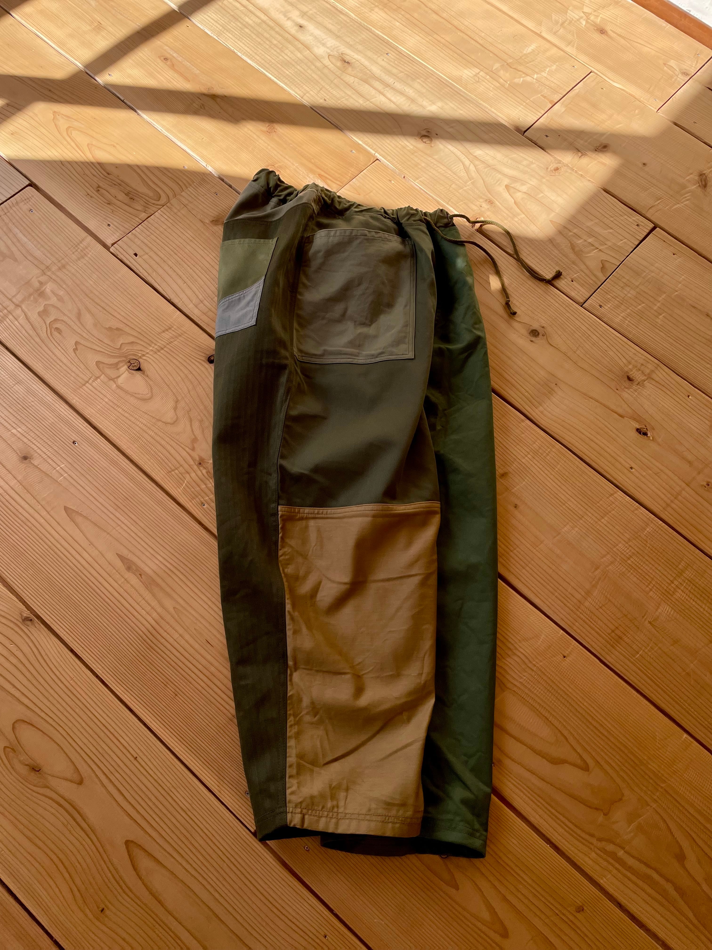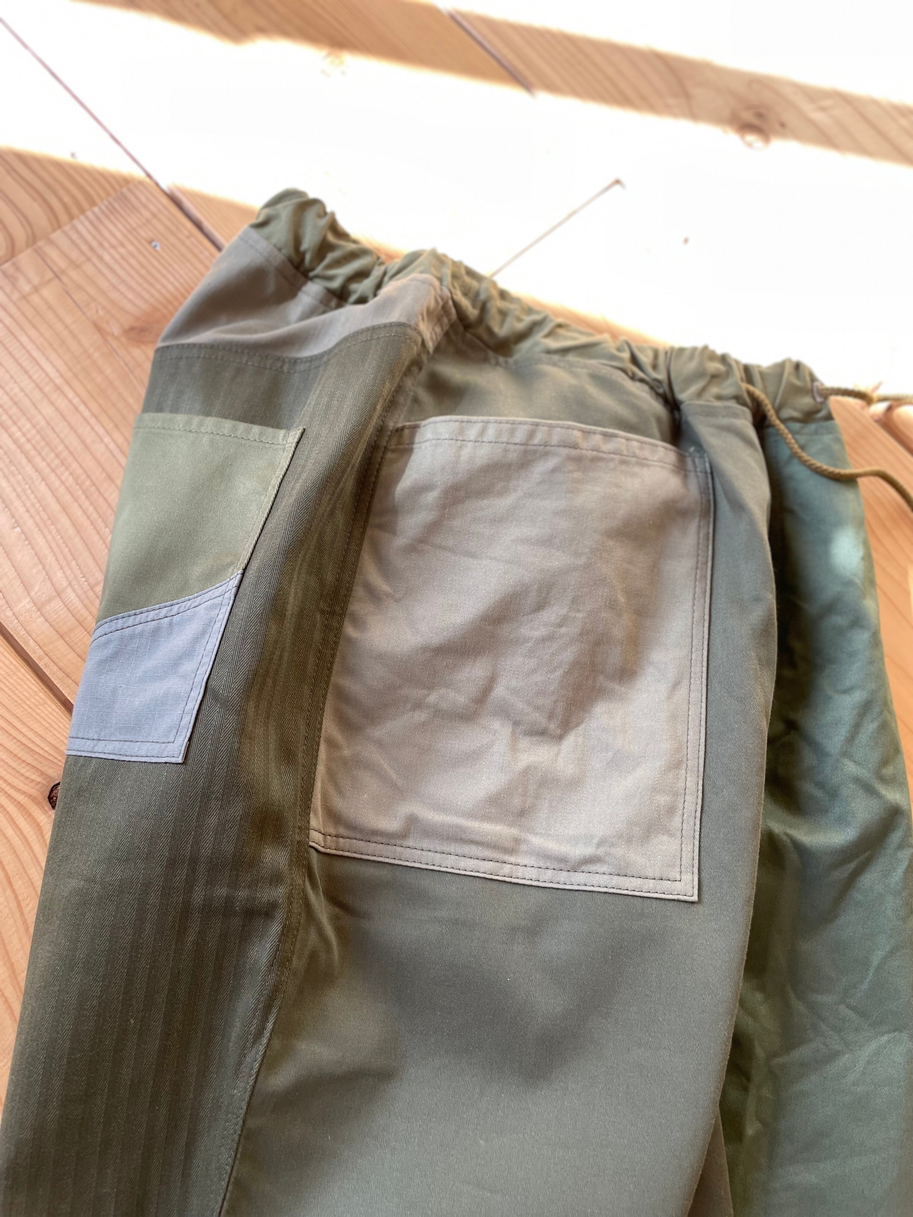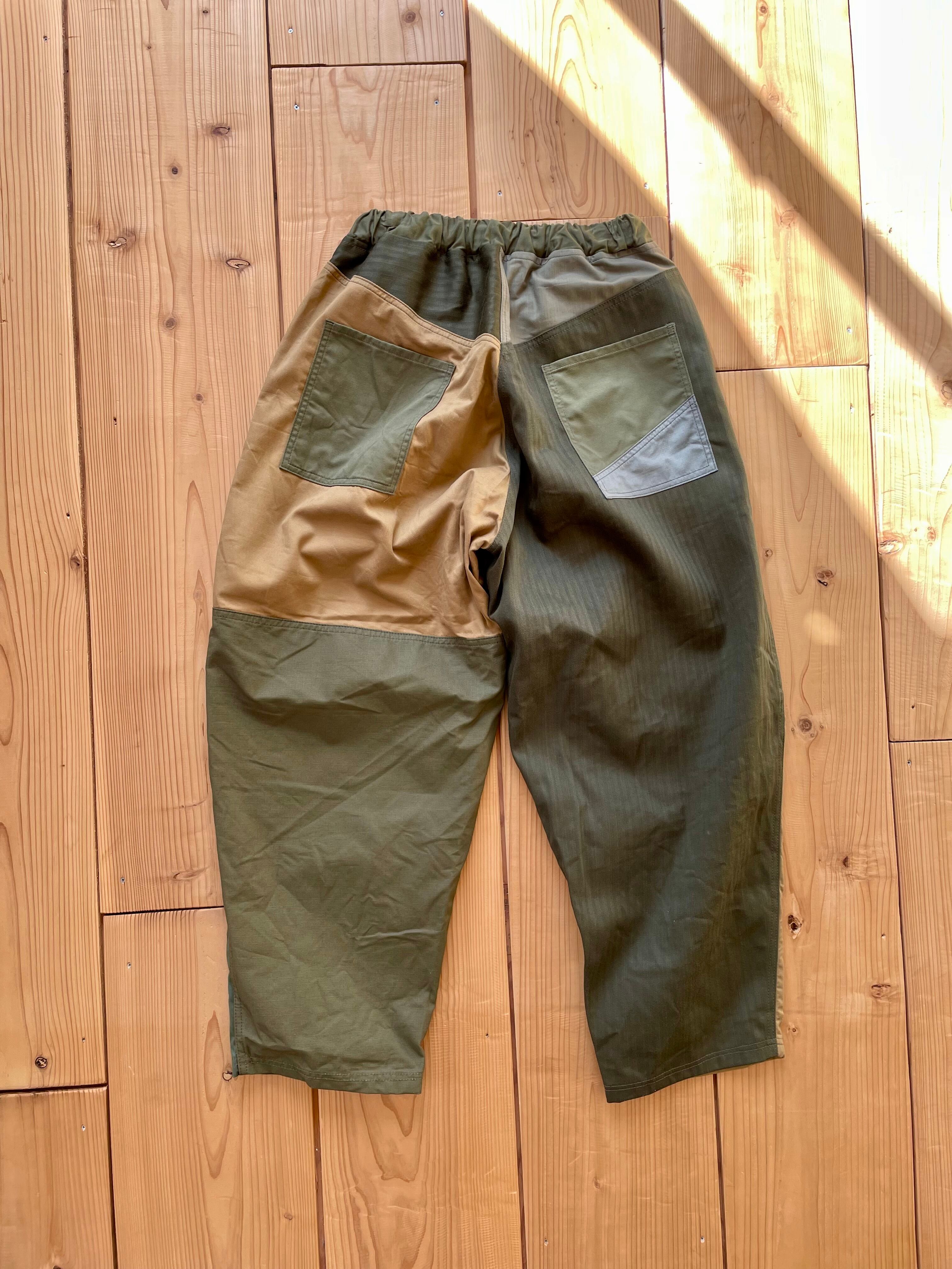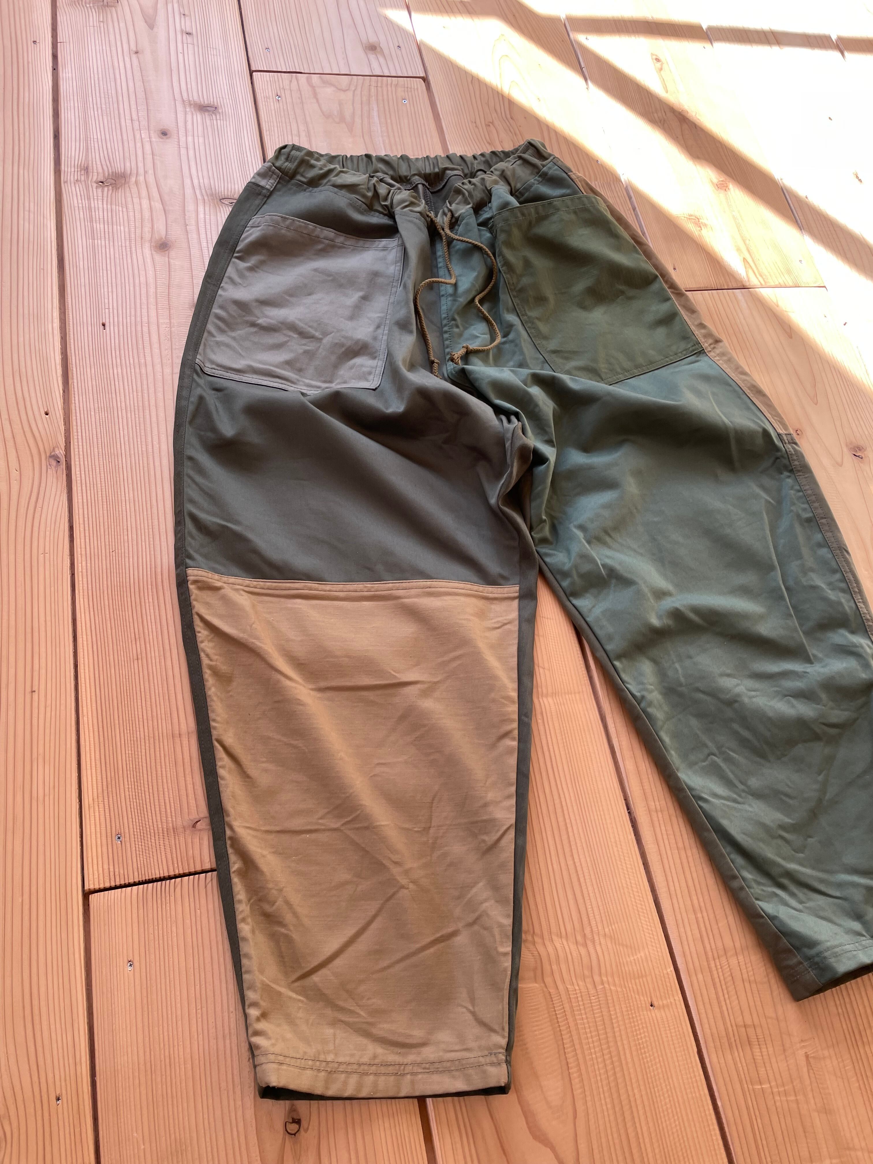 カーキ系で生地をランダムに使っています。