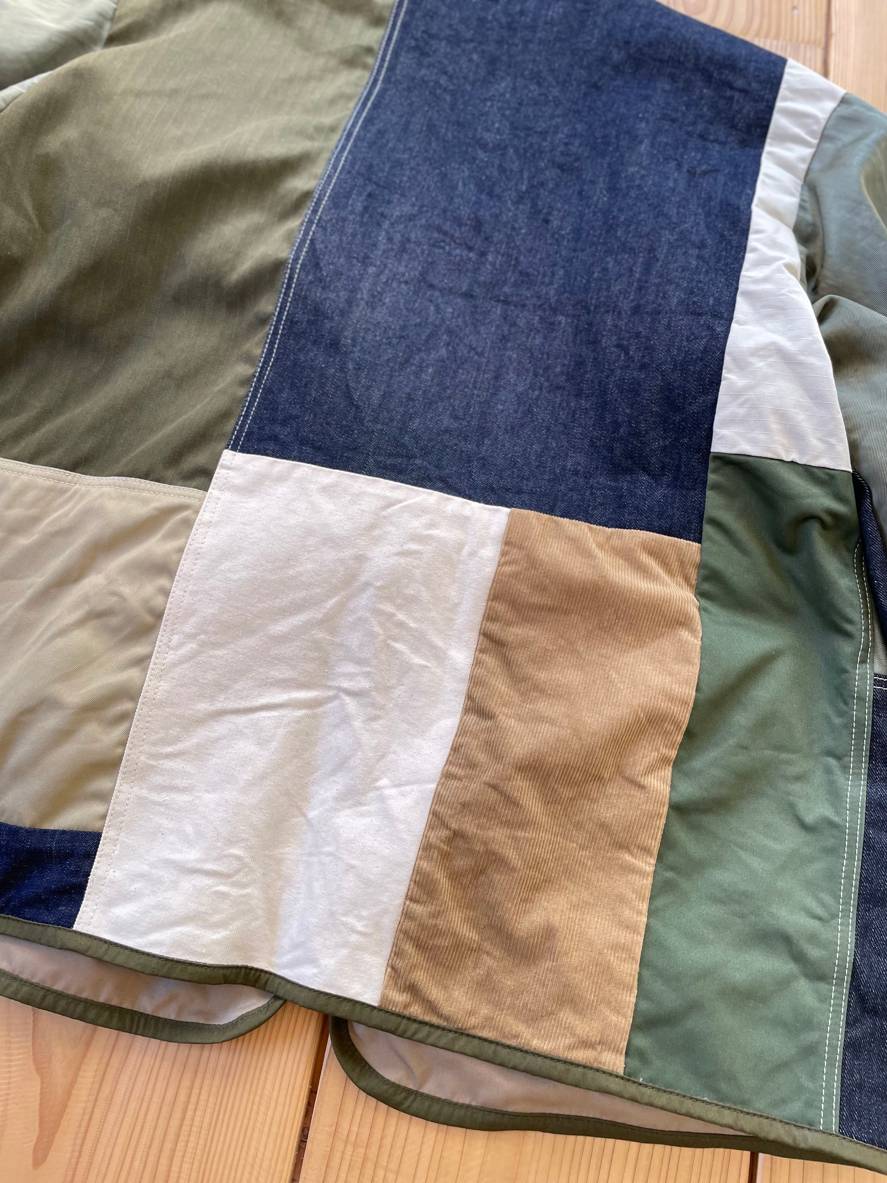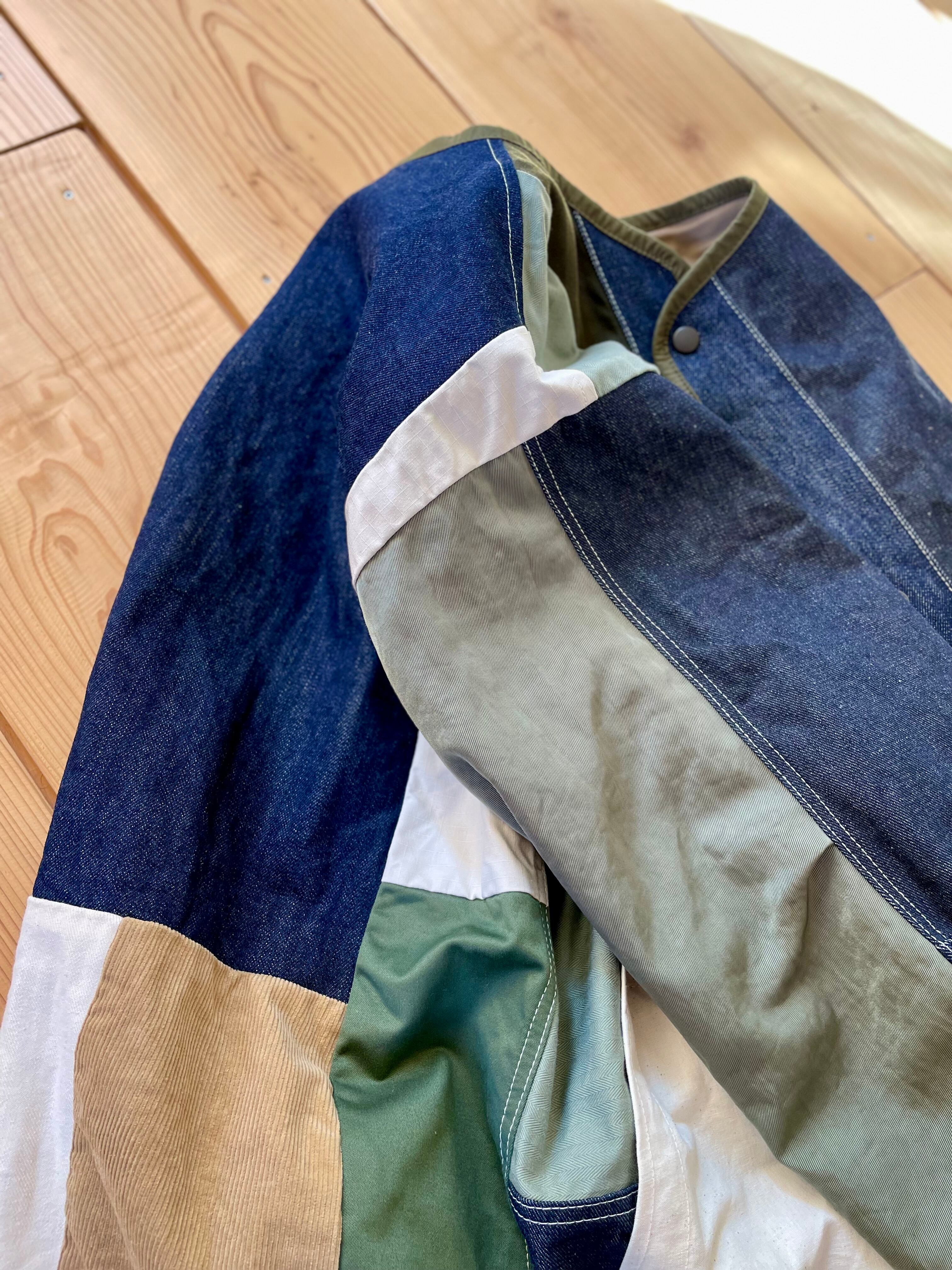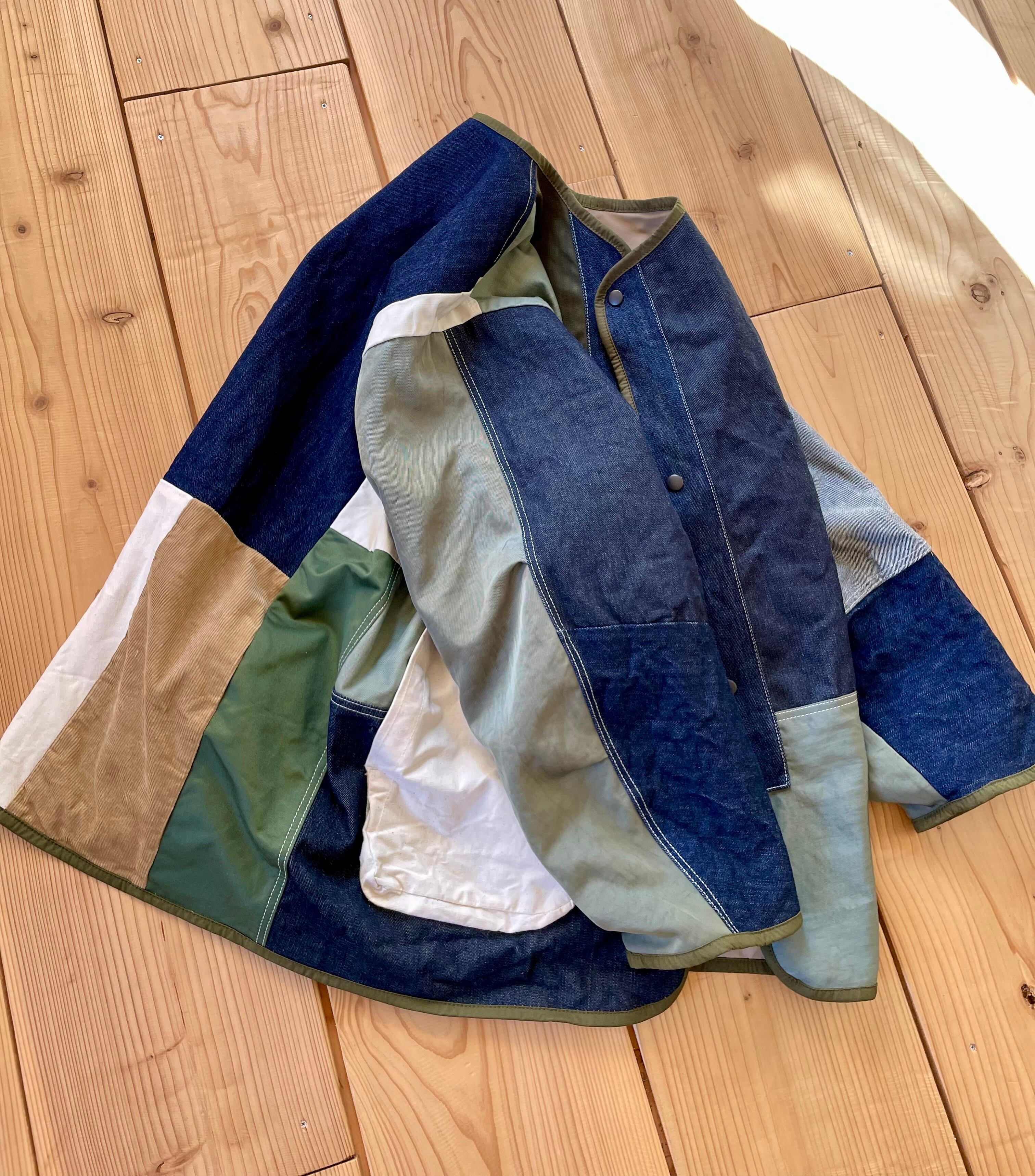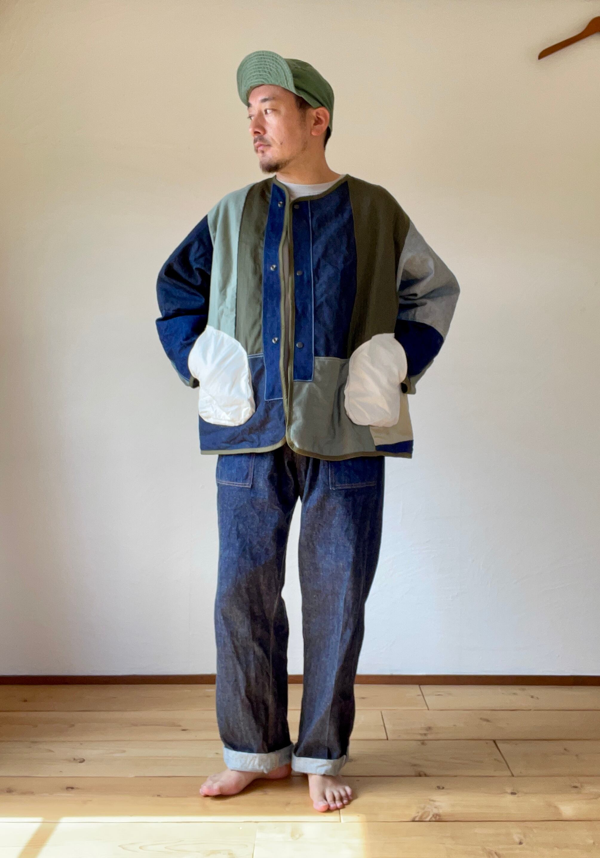 デニムやカーキ、生成りのコットン生地でランダムに仕上げています。