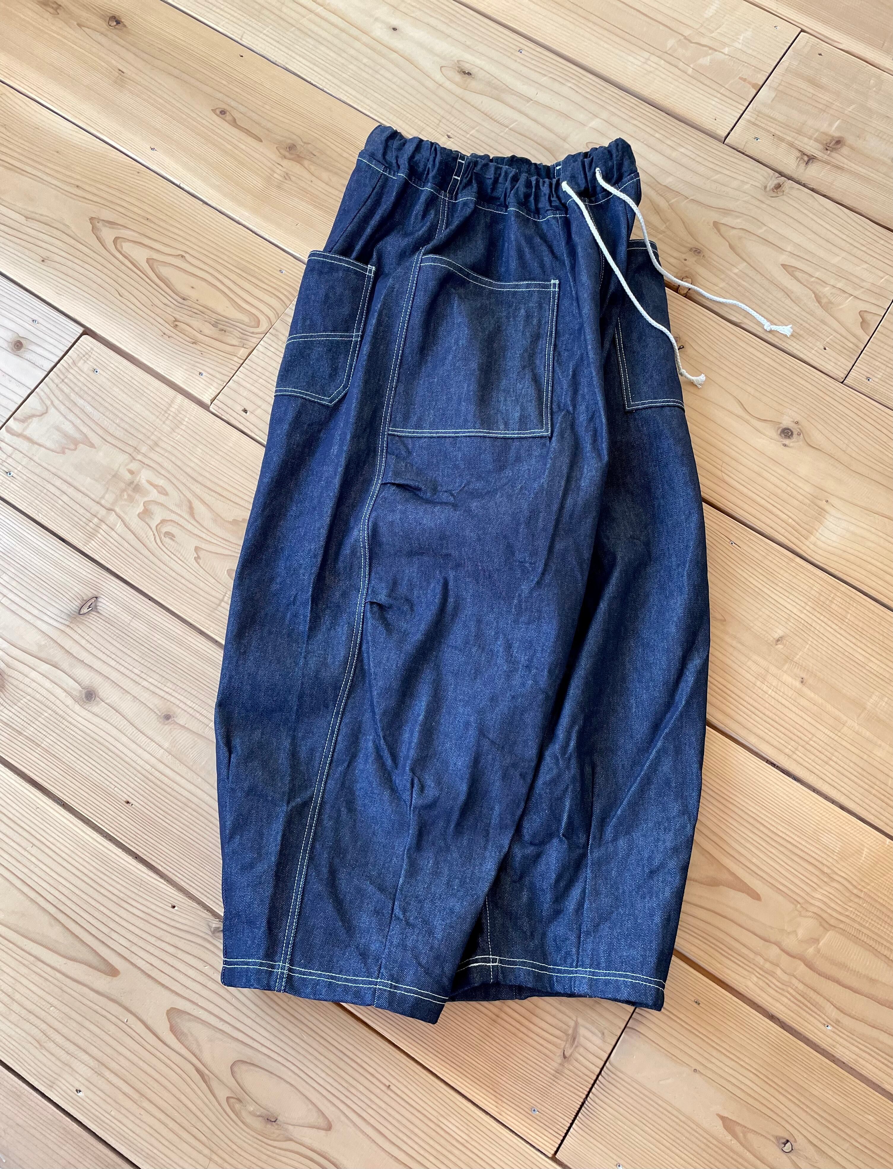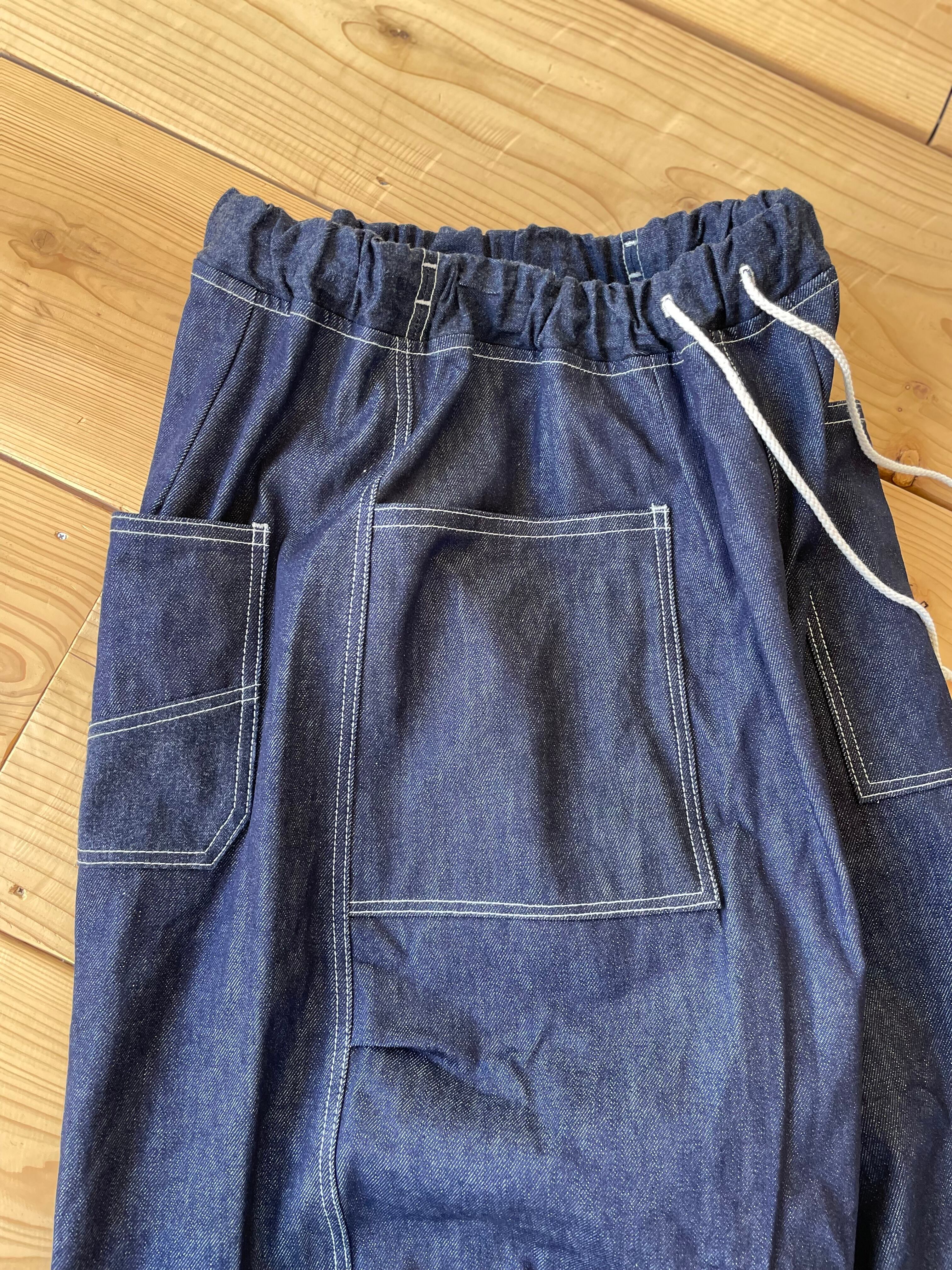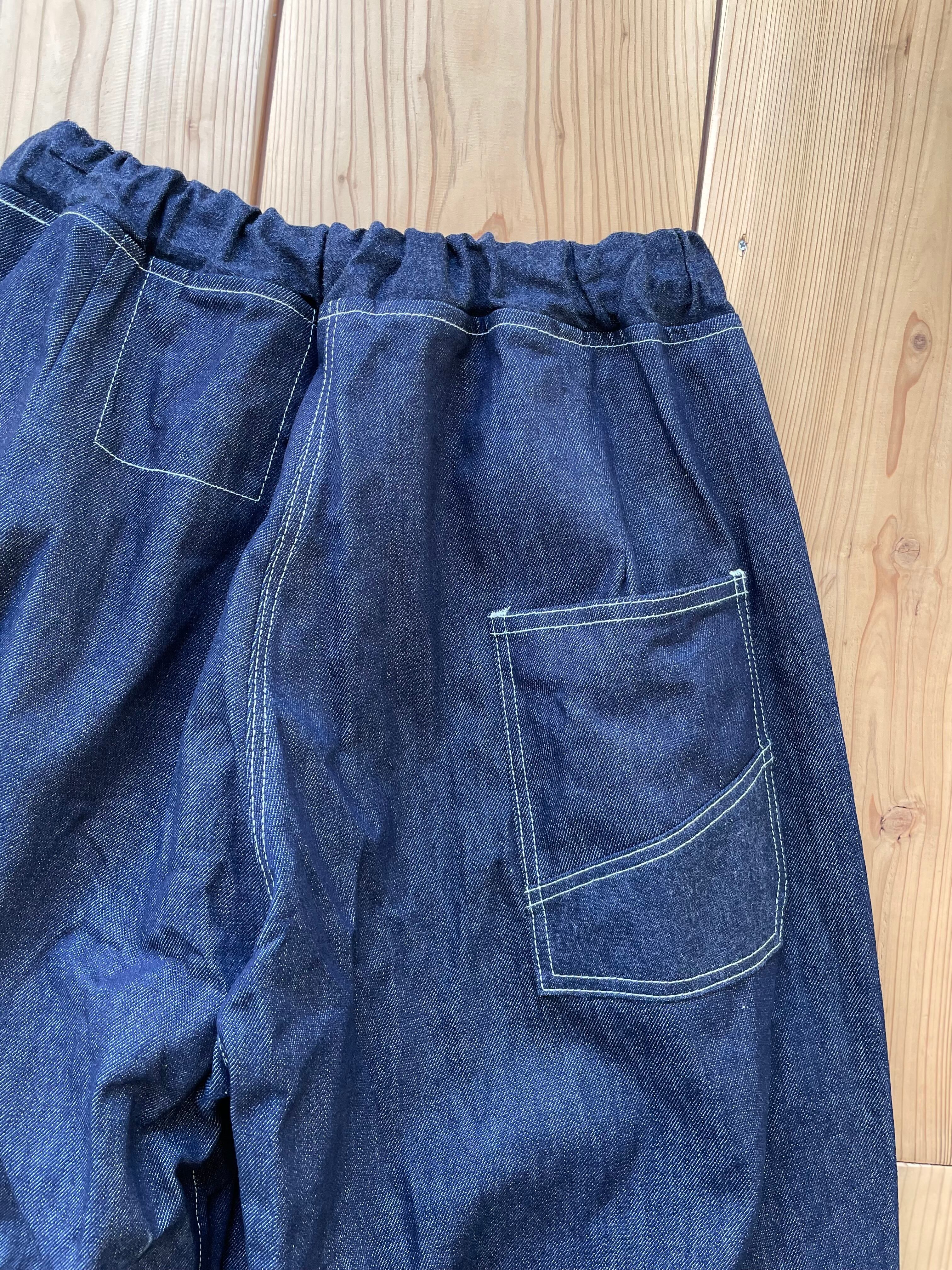 厚すぎないフワッとなる14オンスくらいの国産デニム生地で、ダーツやタックが入ってるワイドパンツです。