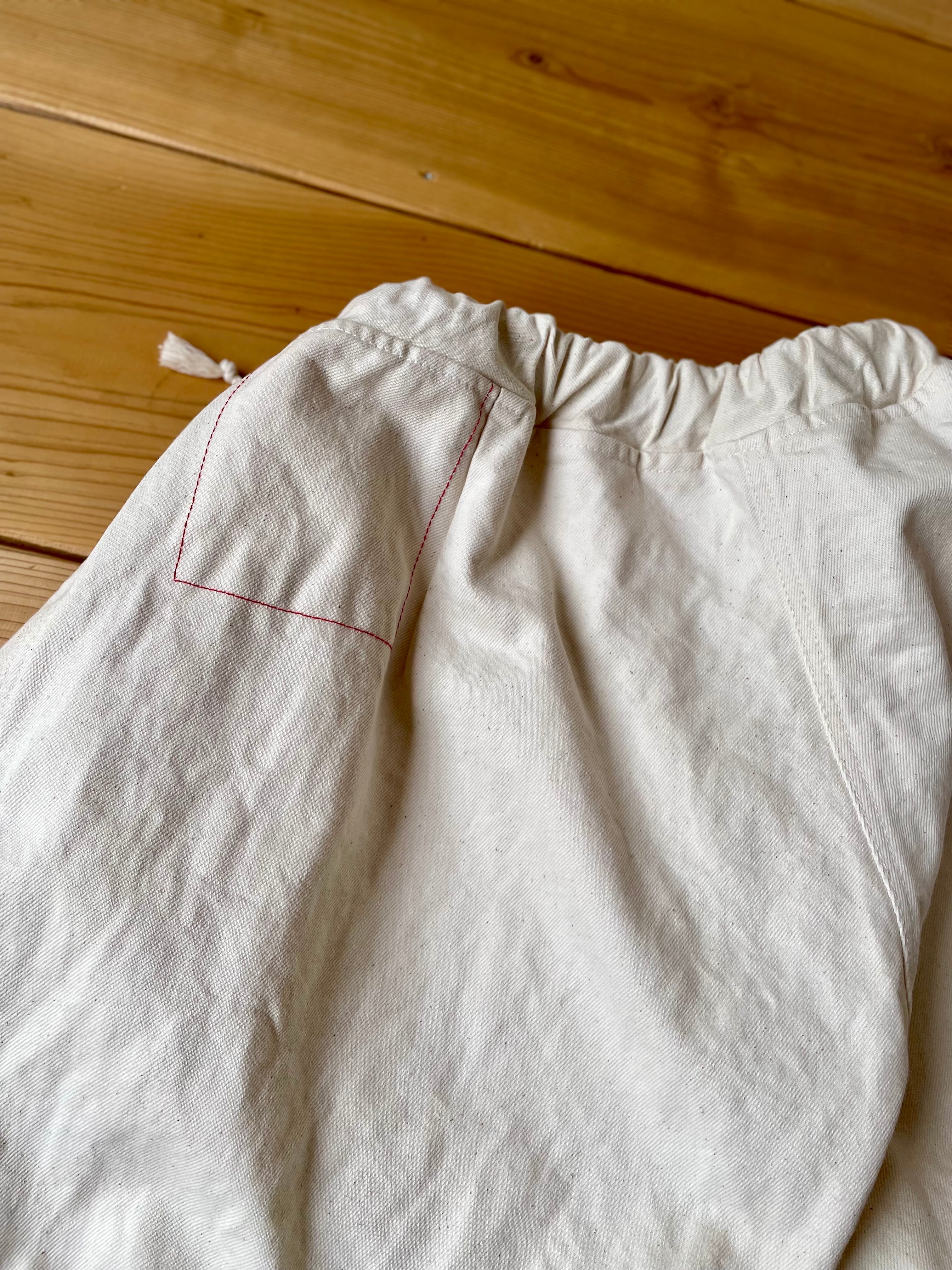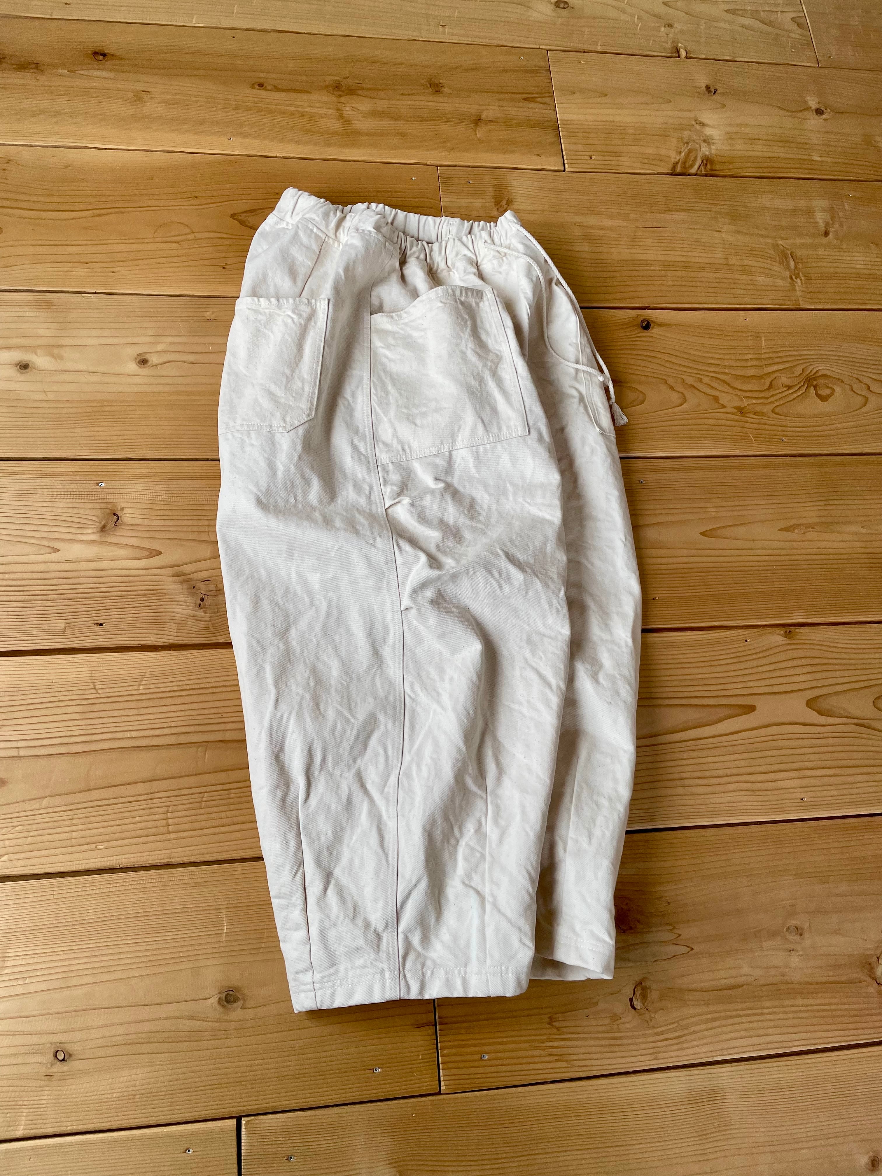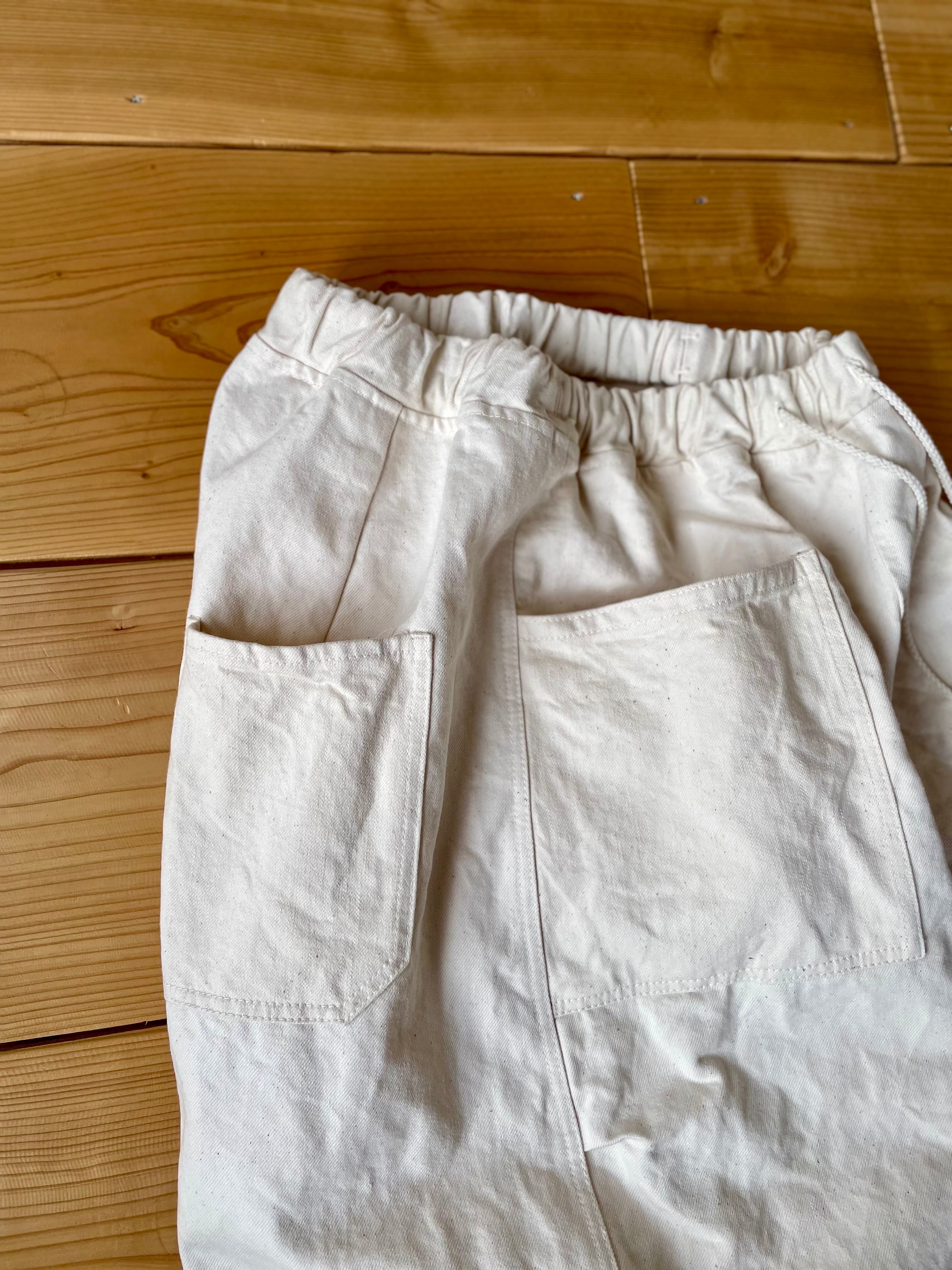 コットン生地を染色する前の状態の生機(きばた)生地を使用した、ダーツやタックが入ってるワイドパンツです。