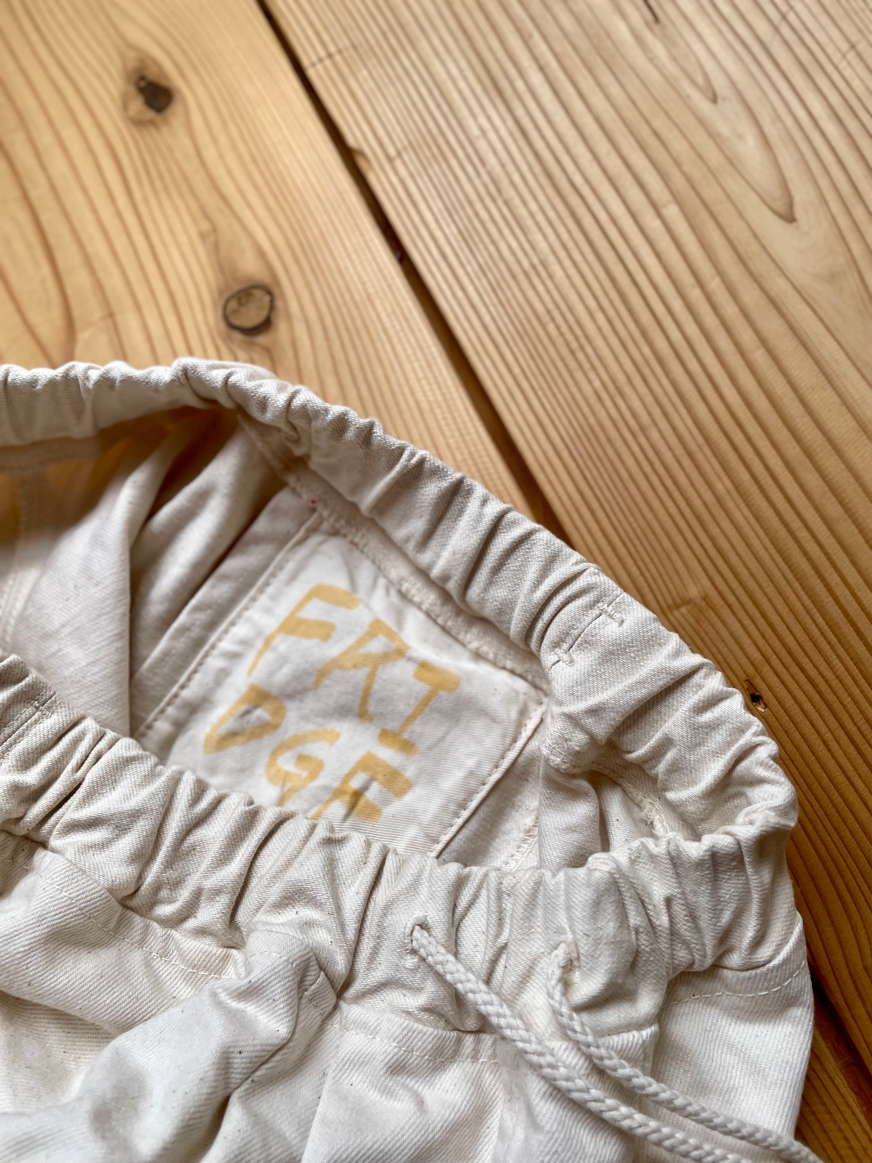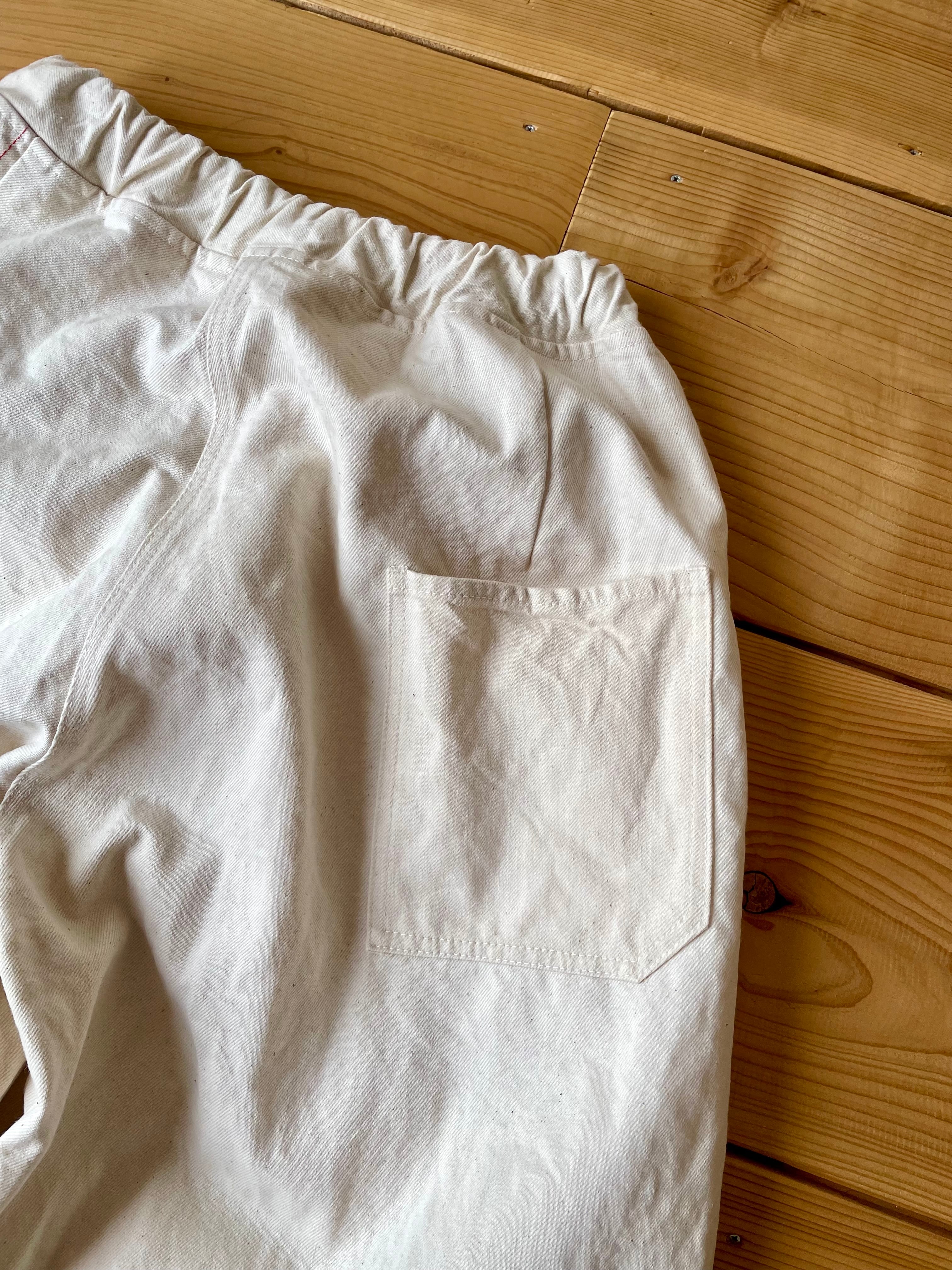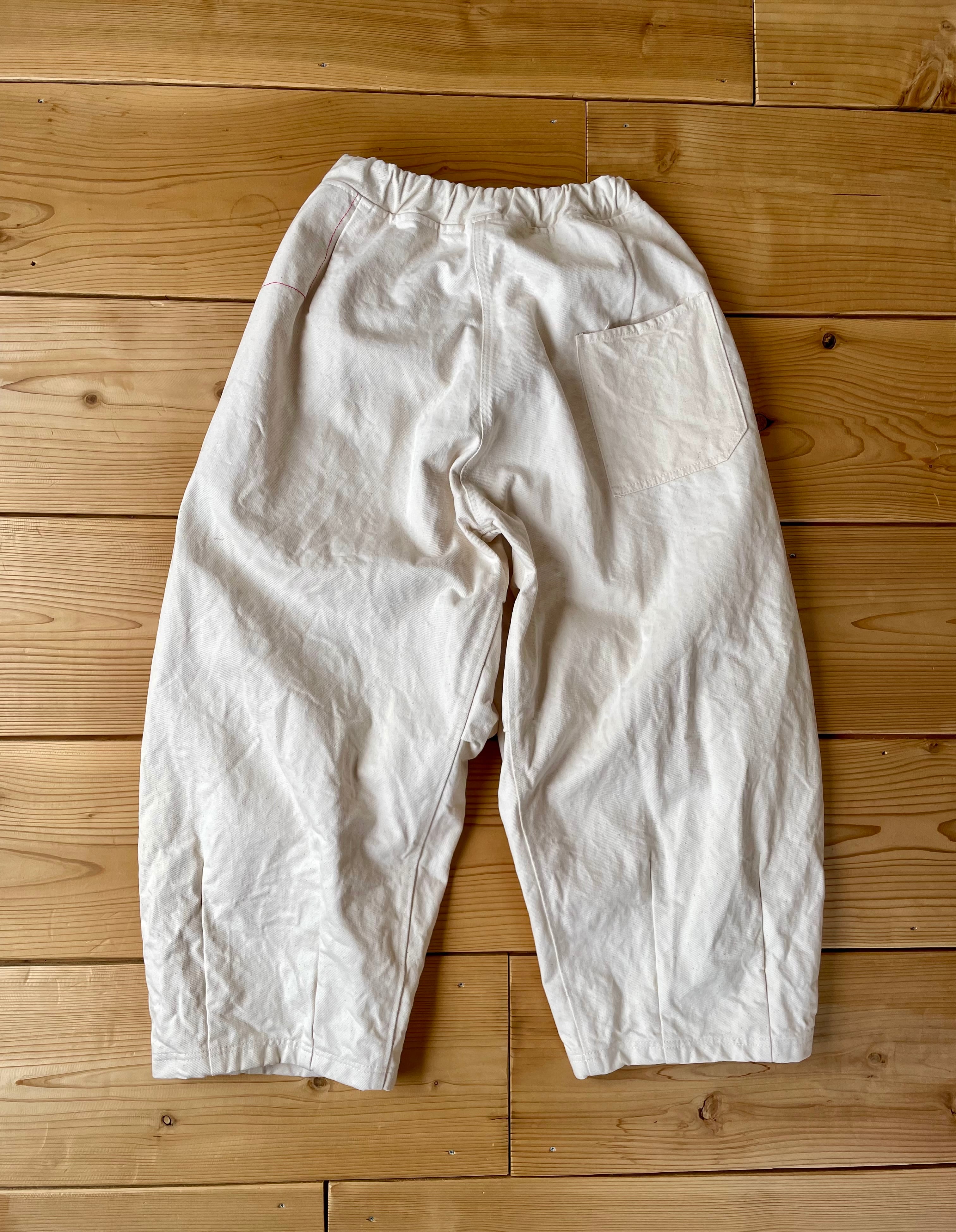 コットン生地を染色する前の状態の生機(きばた)生地を使用した、ダーツやタックが入ってるワイドパンツです。
