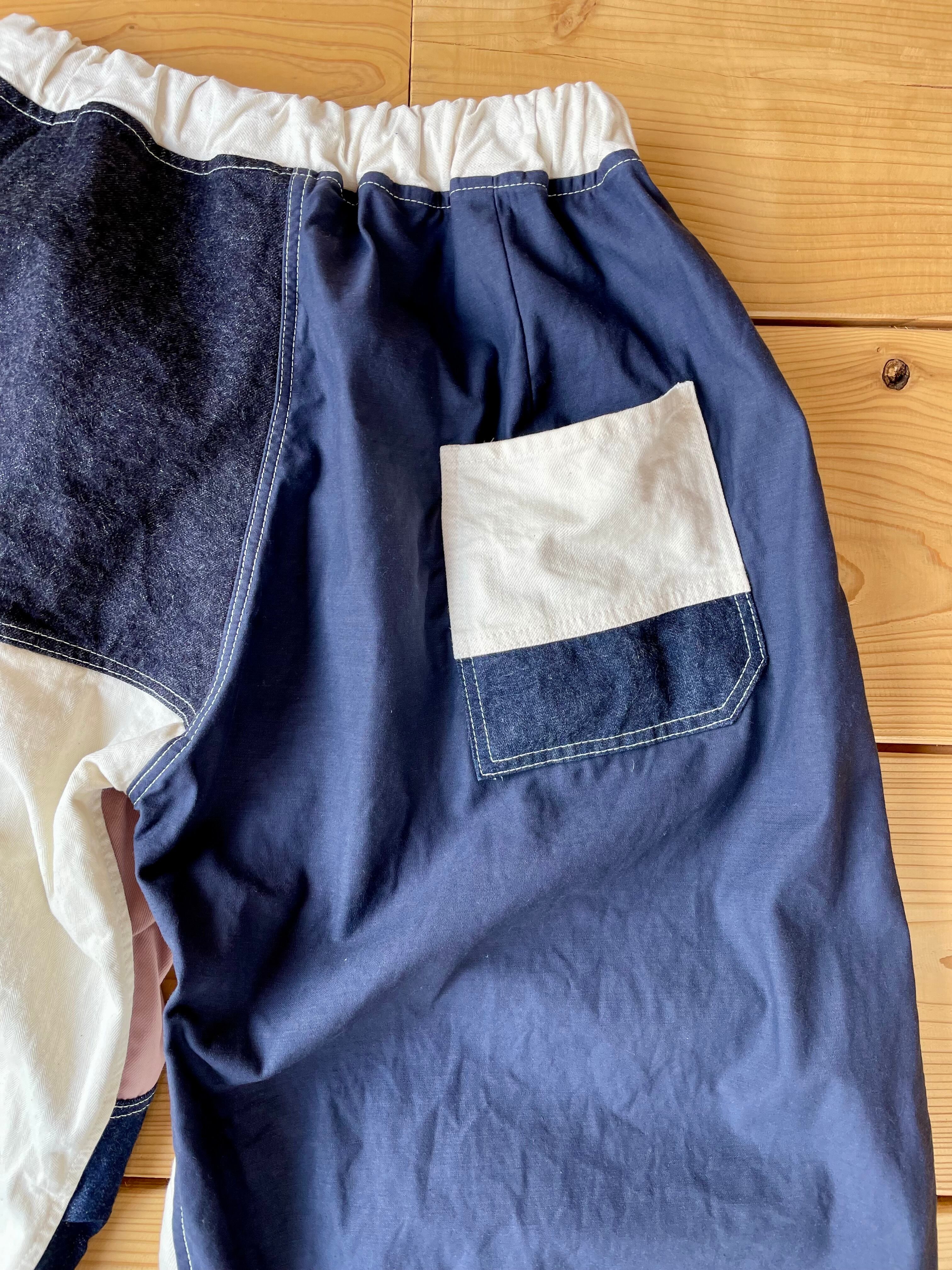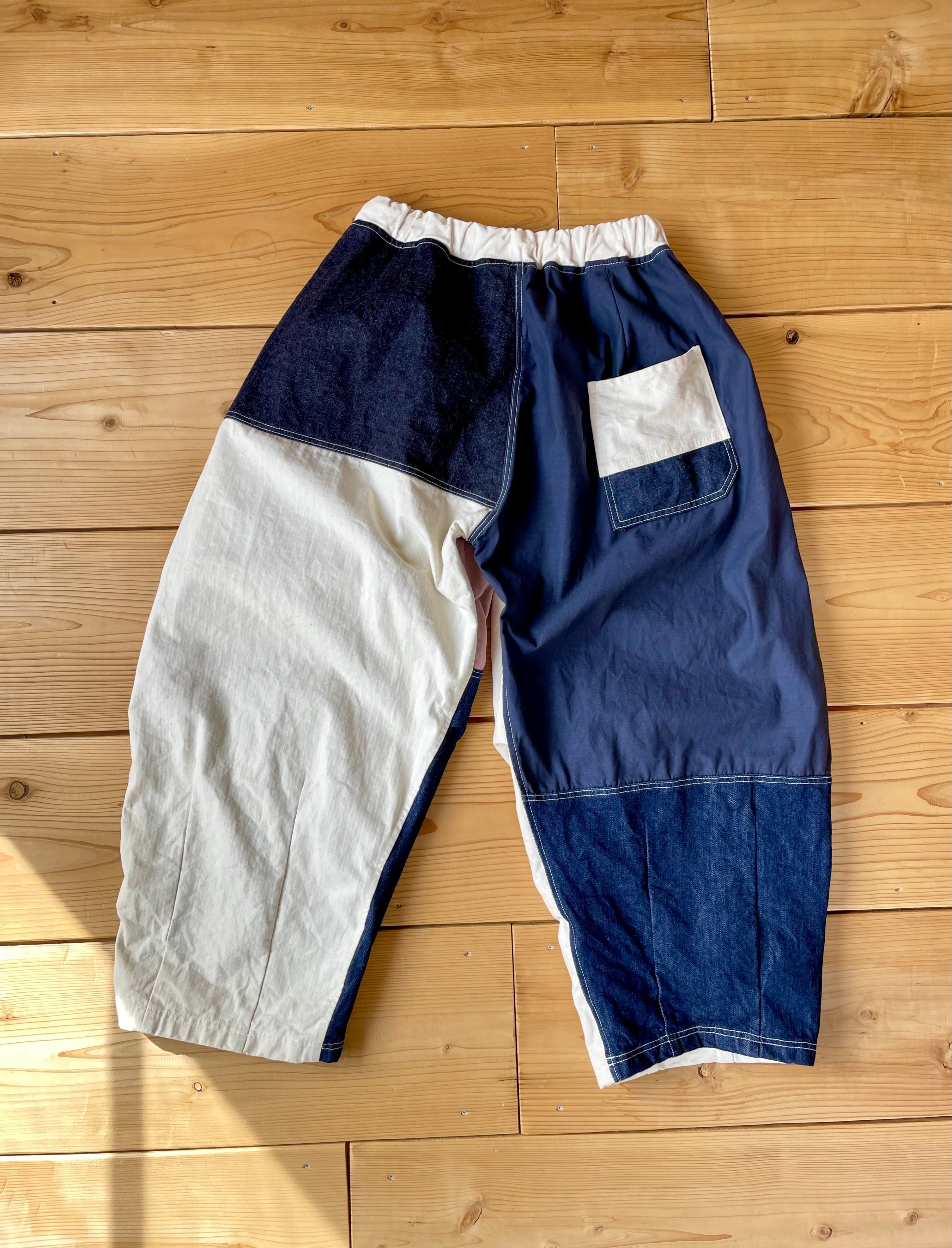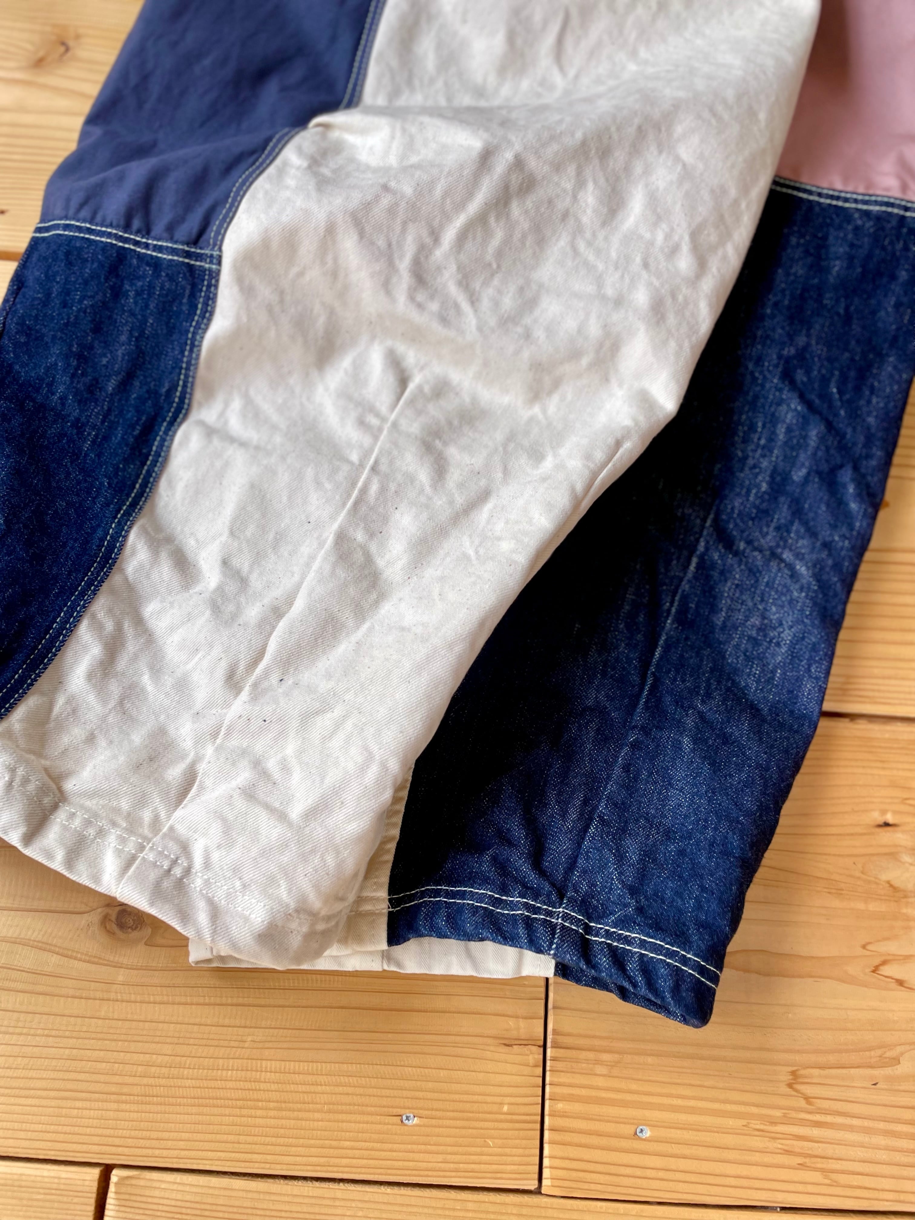 デニムやコットン生地をランダムに使用して、ダーツやタックが入ってるワイドパンツです。