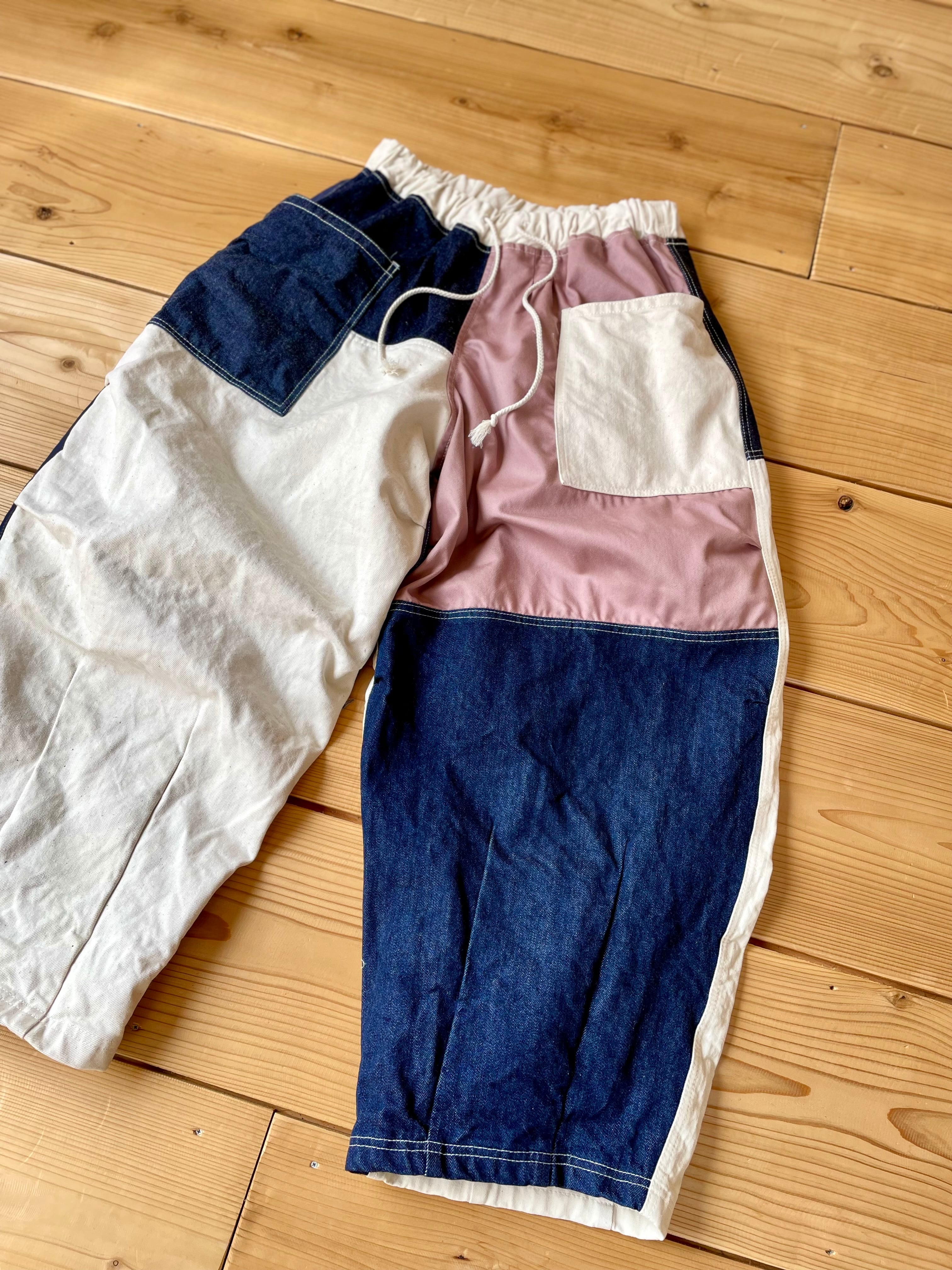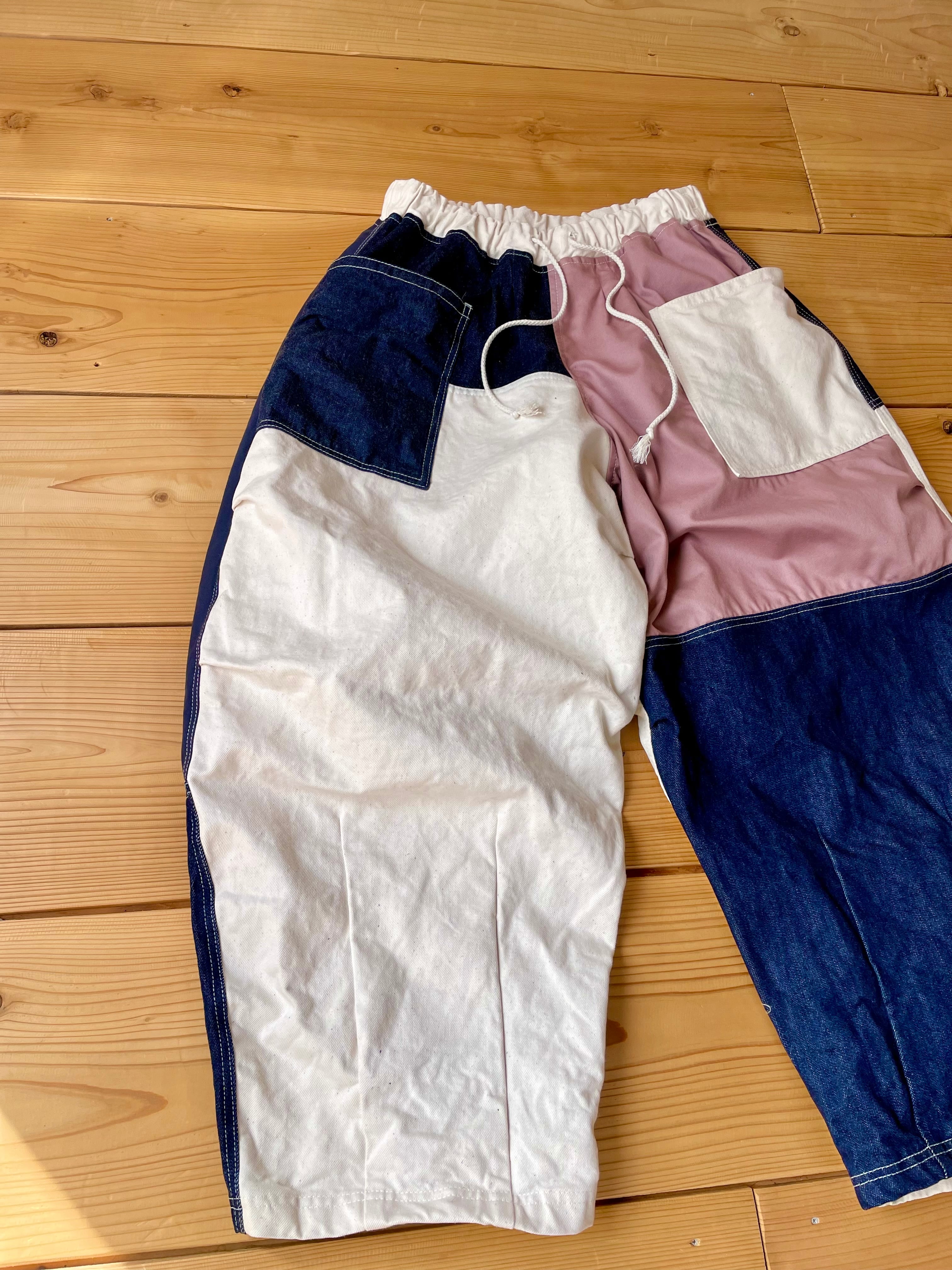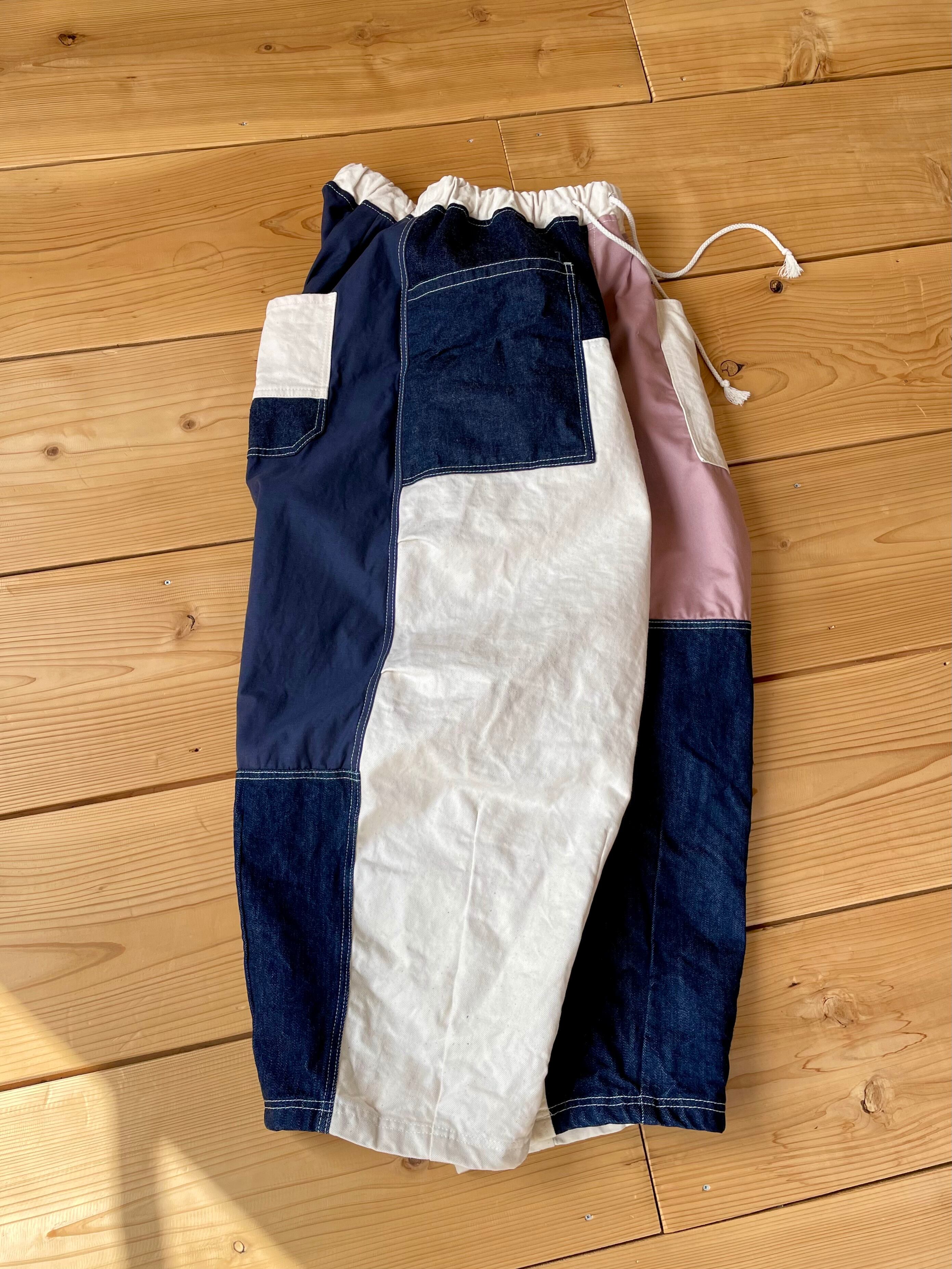 デニムやコットン生地をランダムに使用して、ダーツやタックが入ってるワイドパンツです。