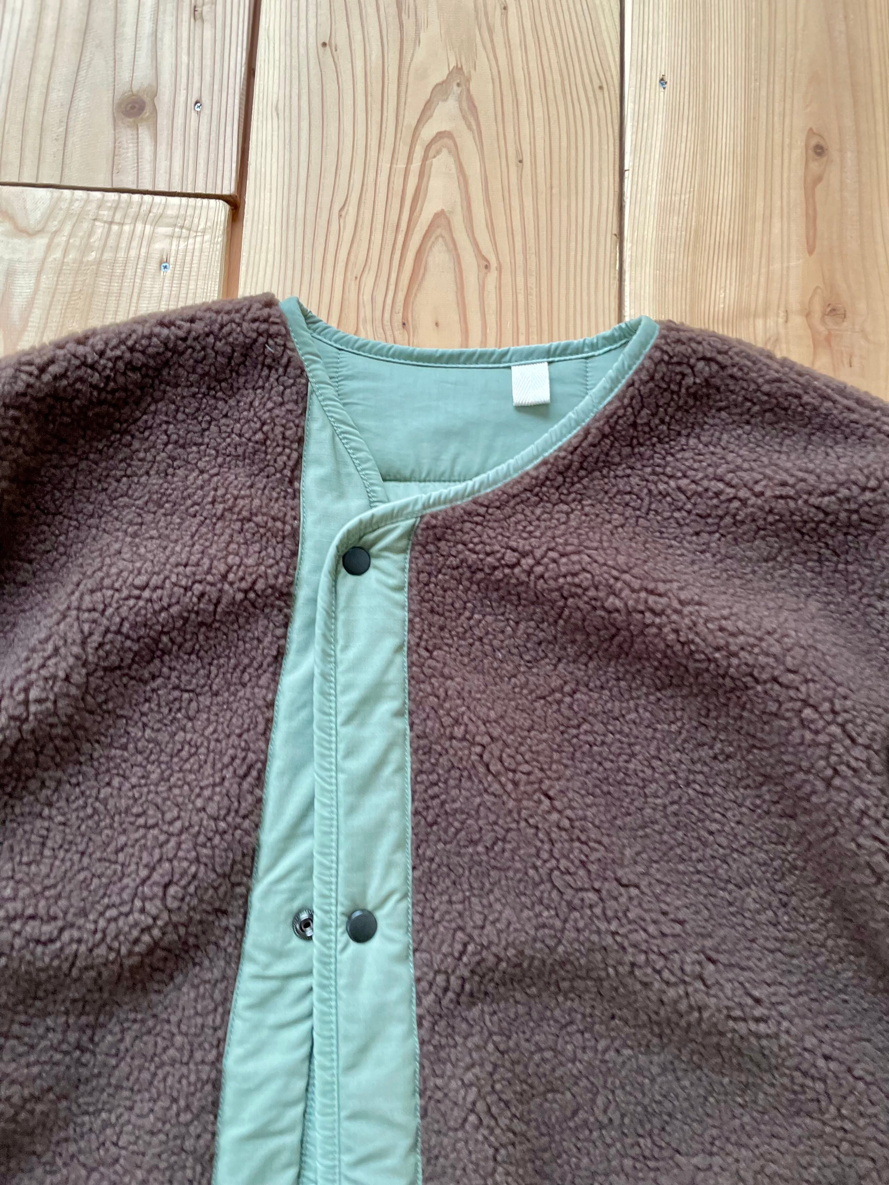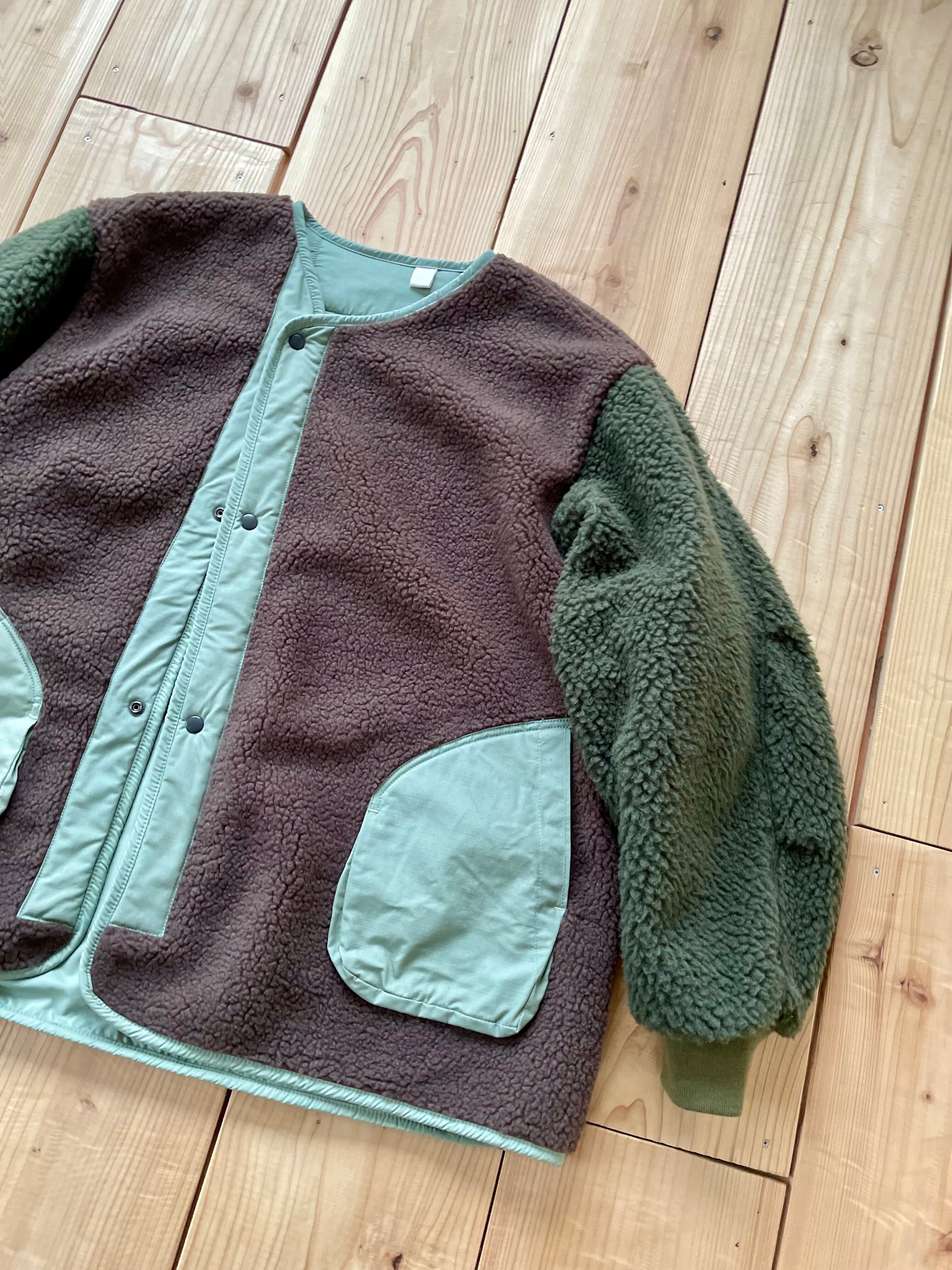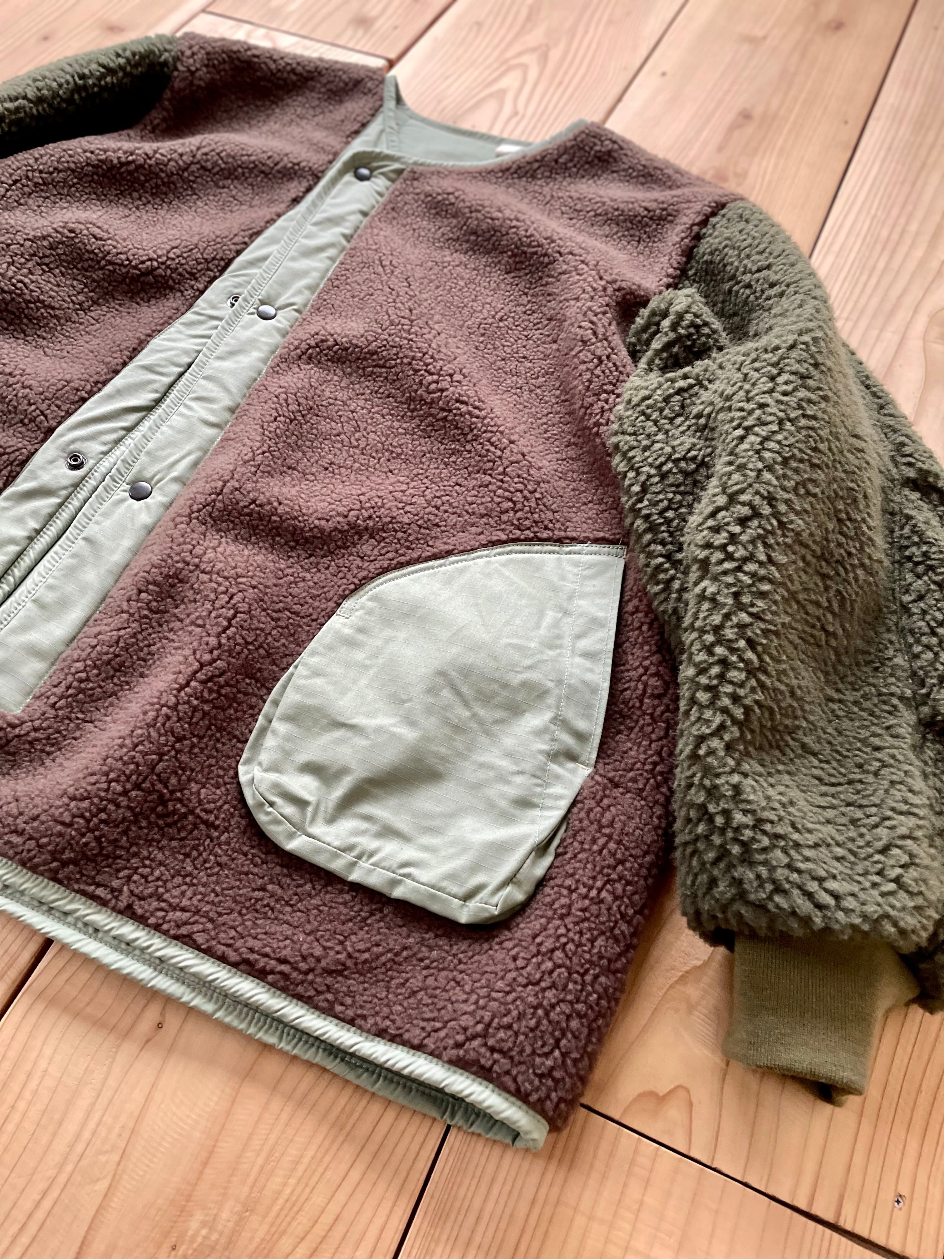 モコモコのフリース生地に、裏地をナイロン生地にして風を通しにくくしています。