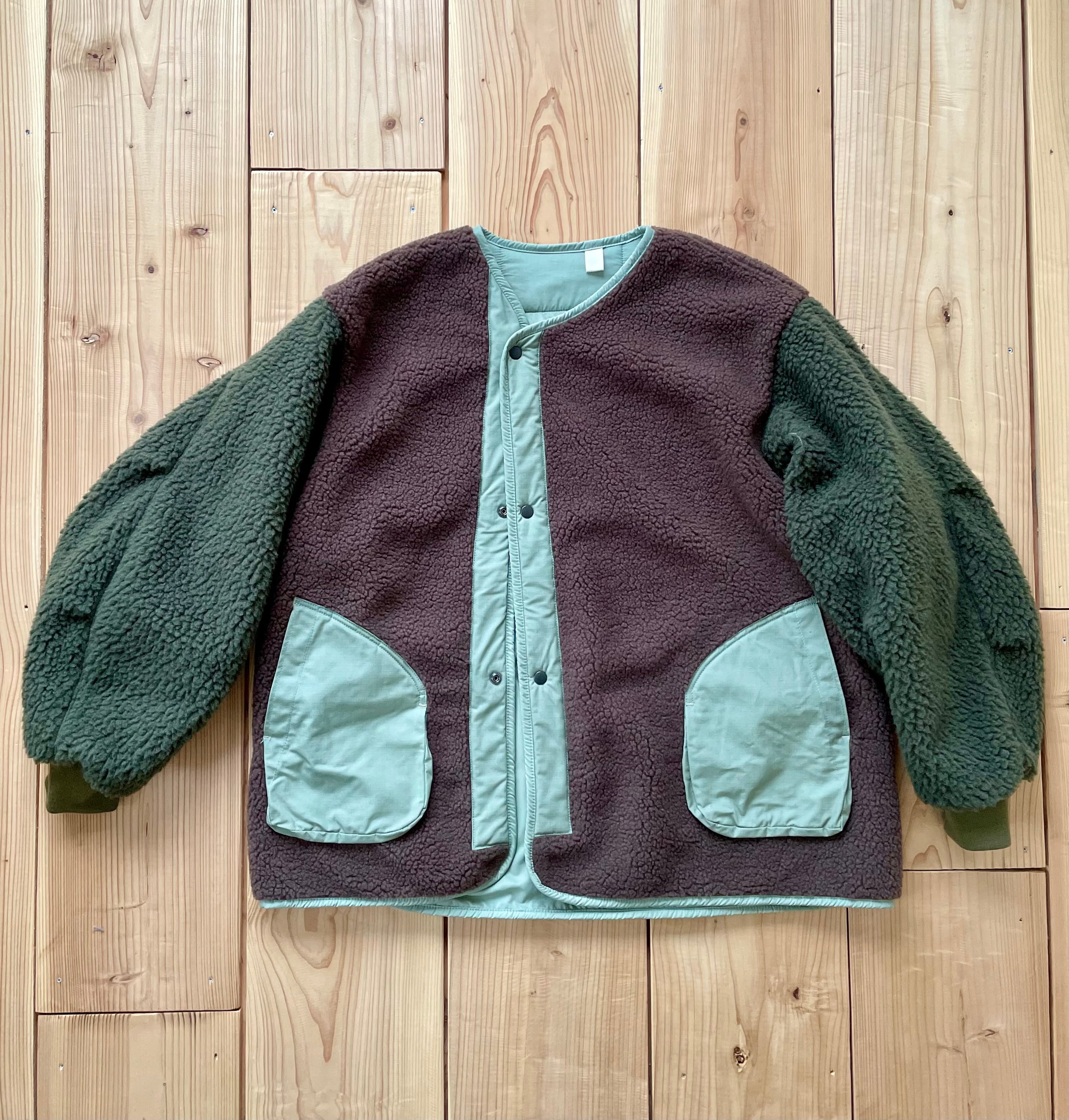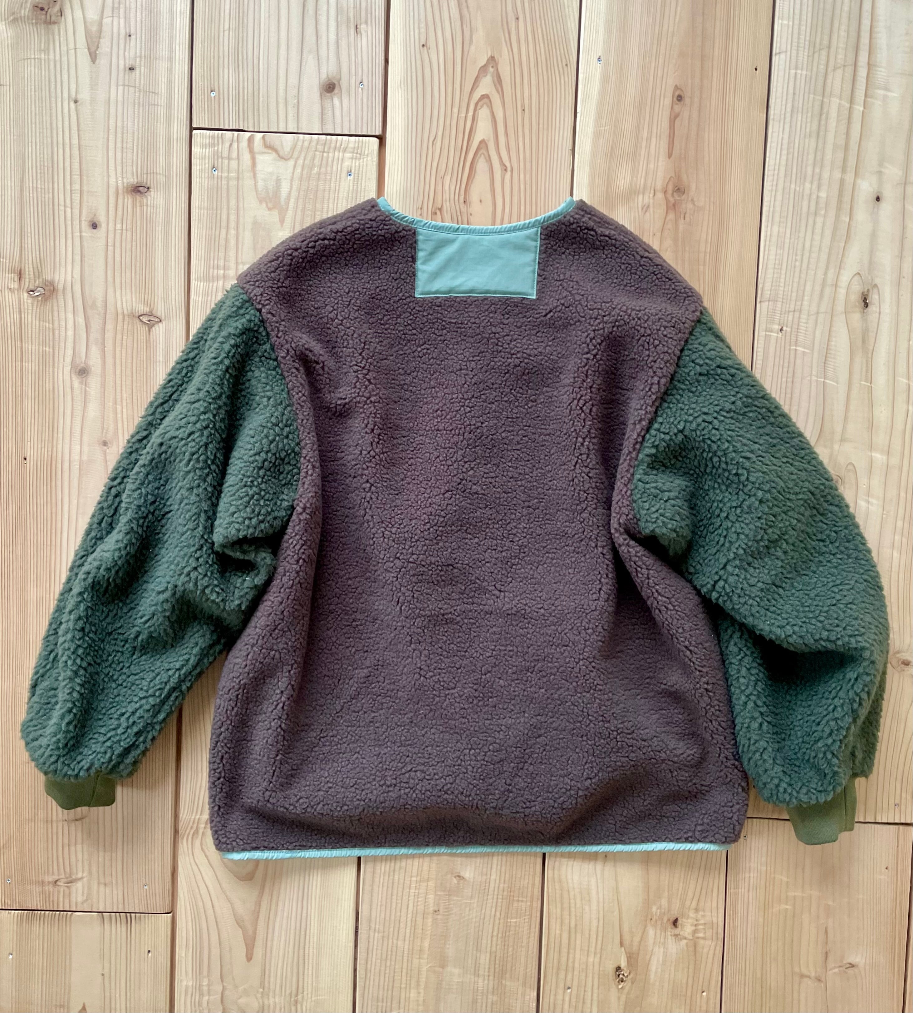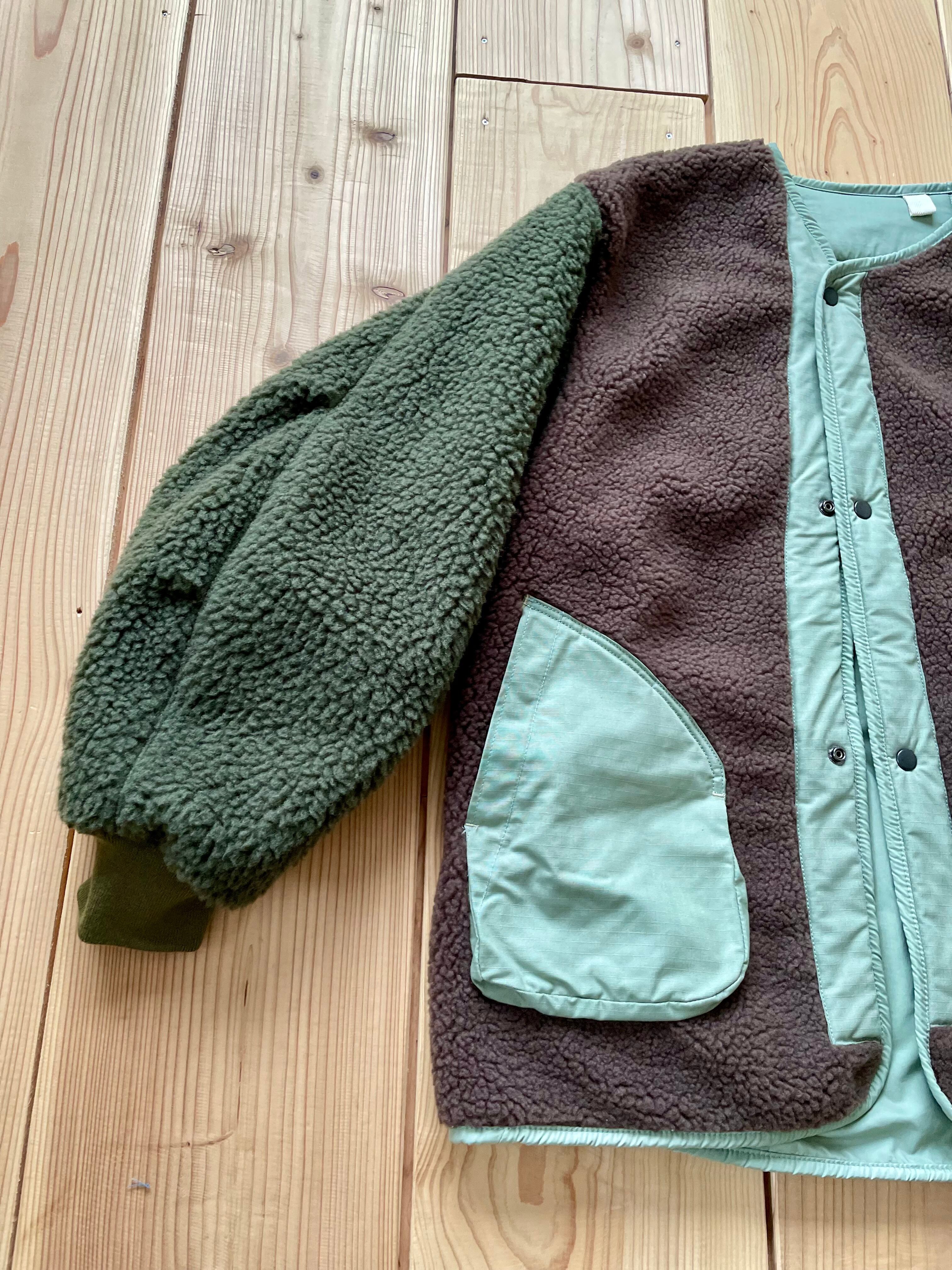 モコモコのフリース生地に、裏地をナイロン生地にして風を通しにくくしています。