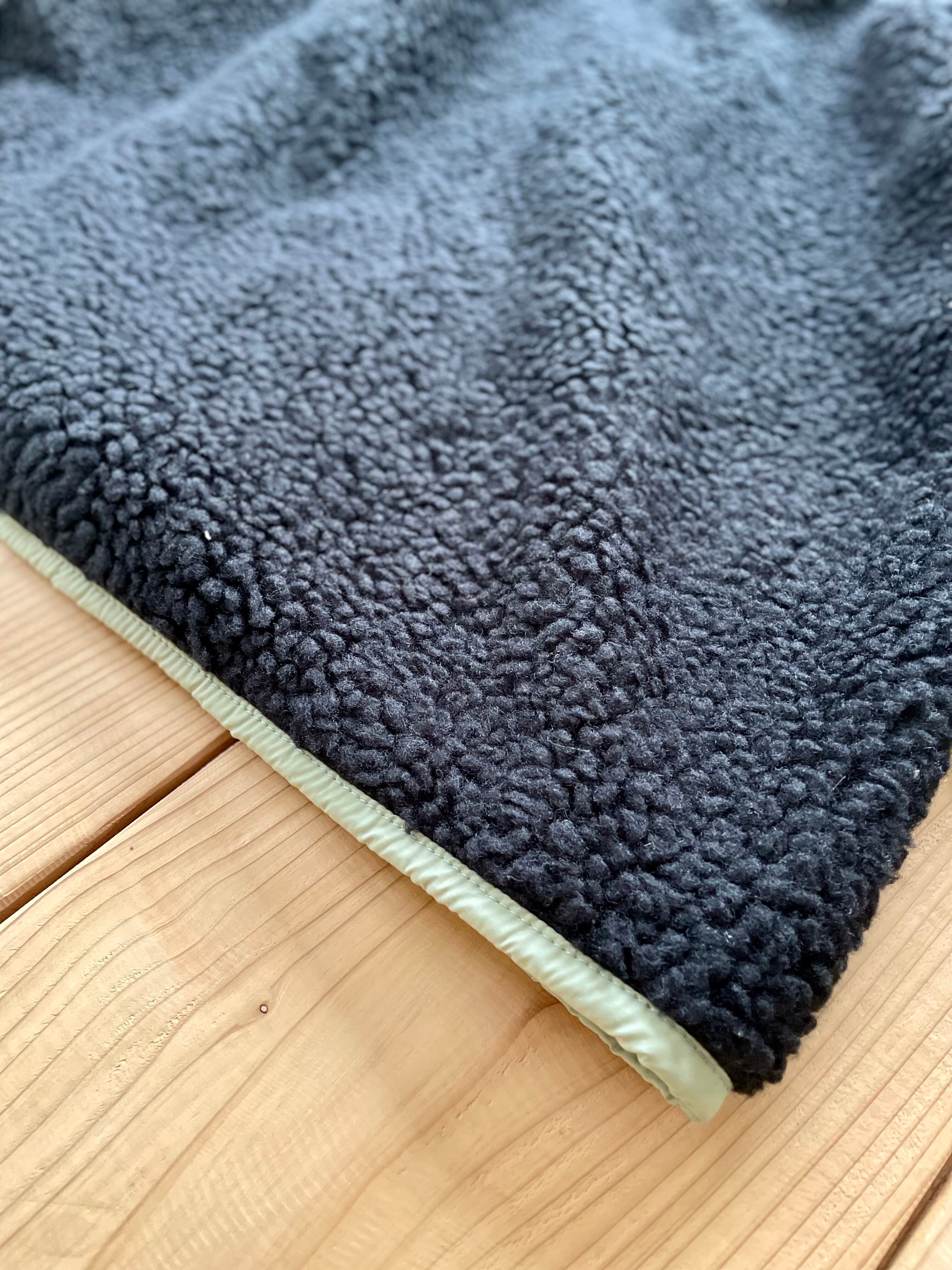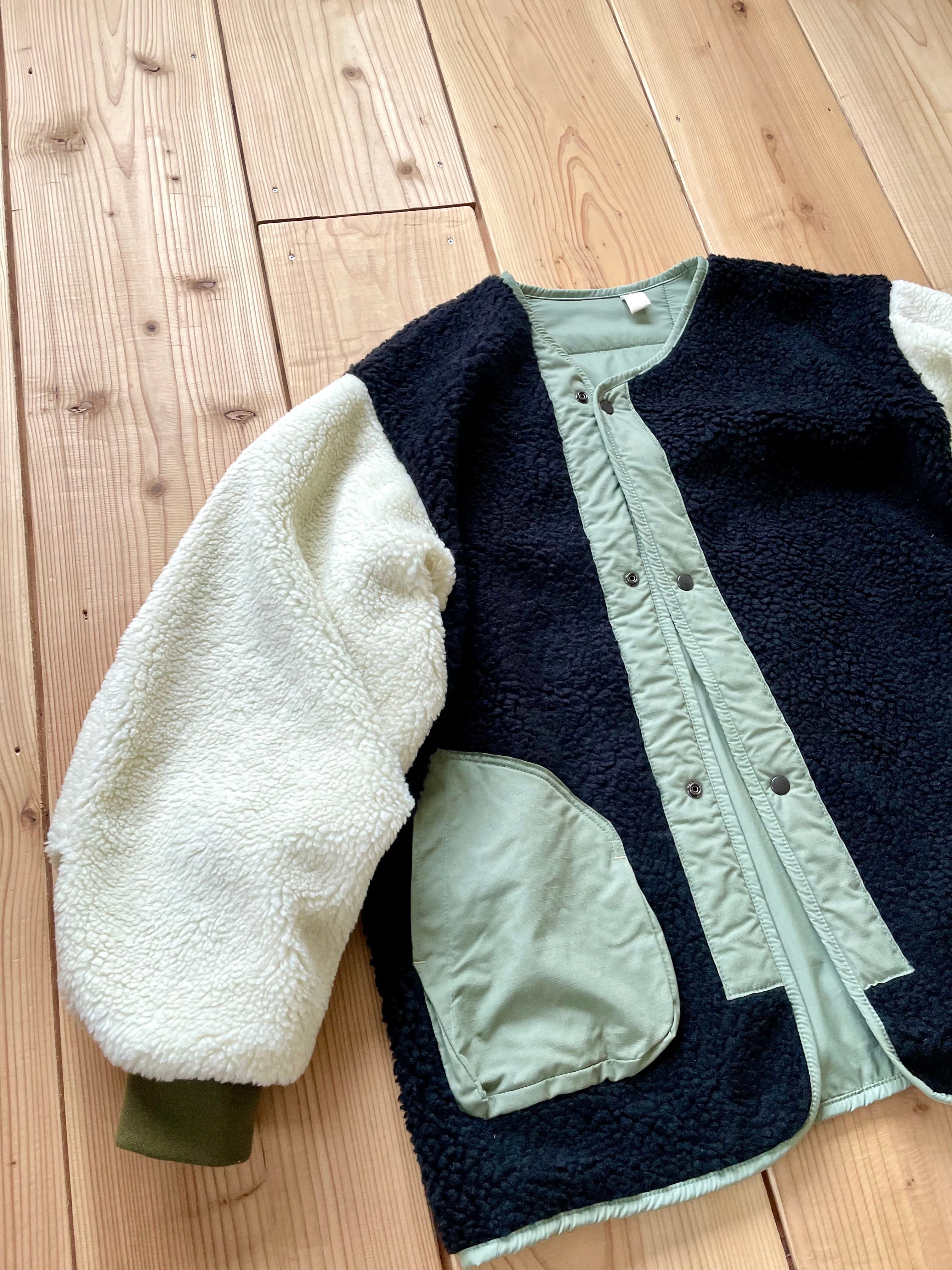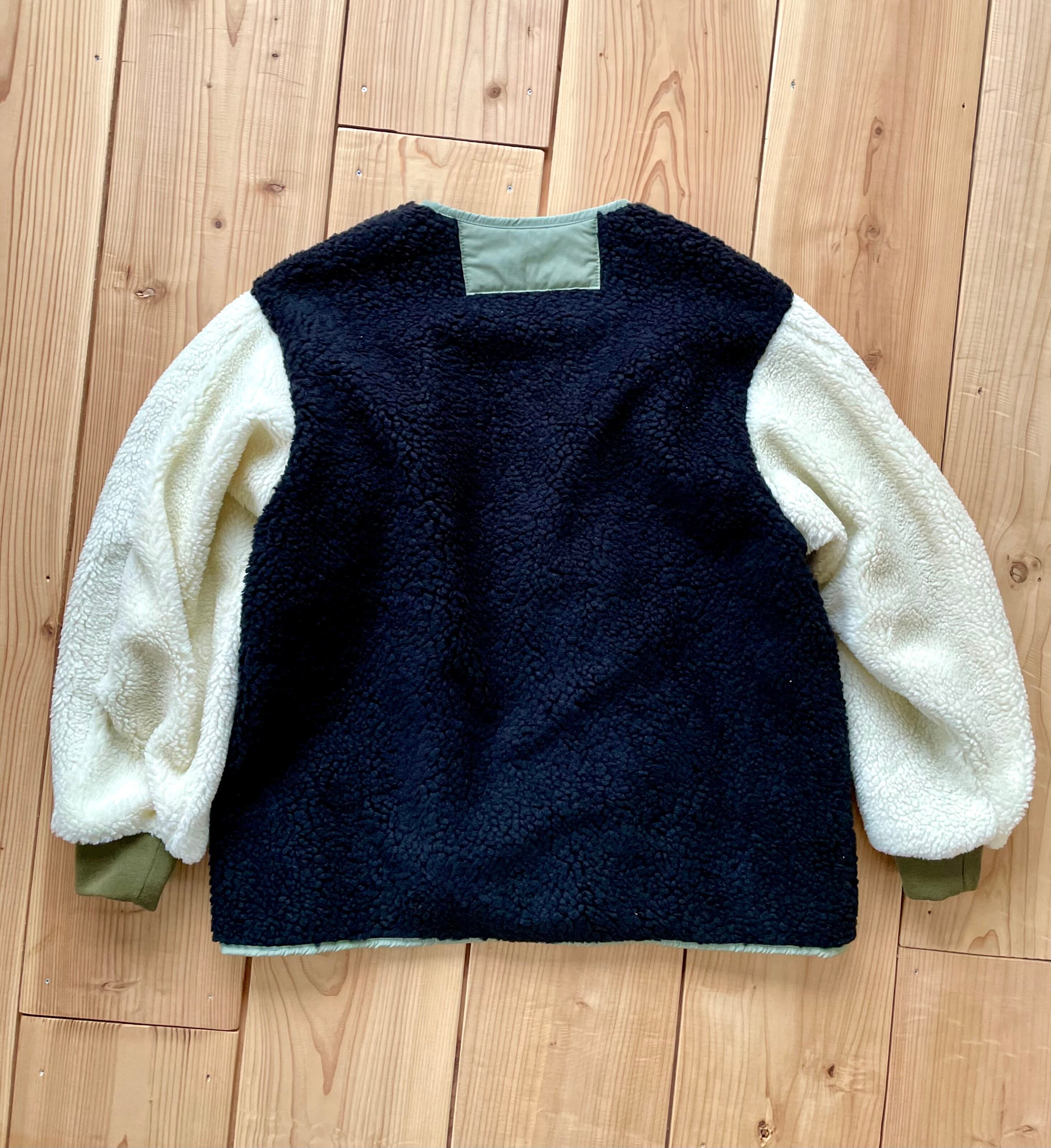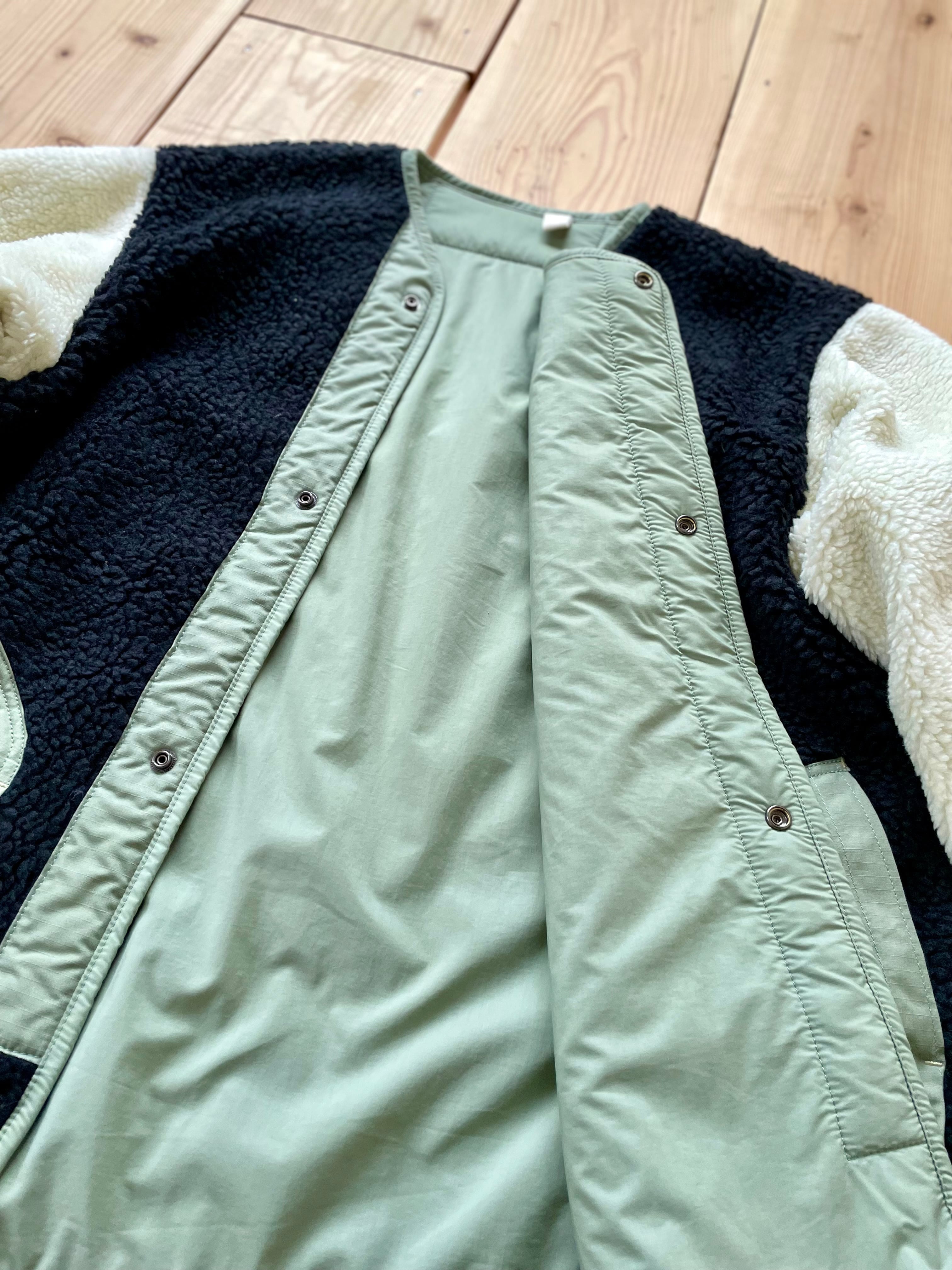 モコモコのフリース生地に、裏地をナイロン生地にして風を通しにくくしています。