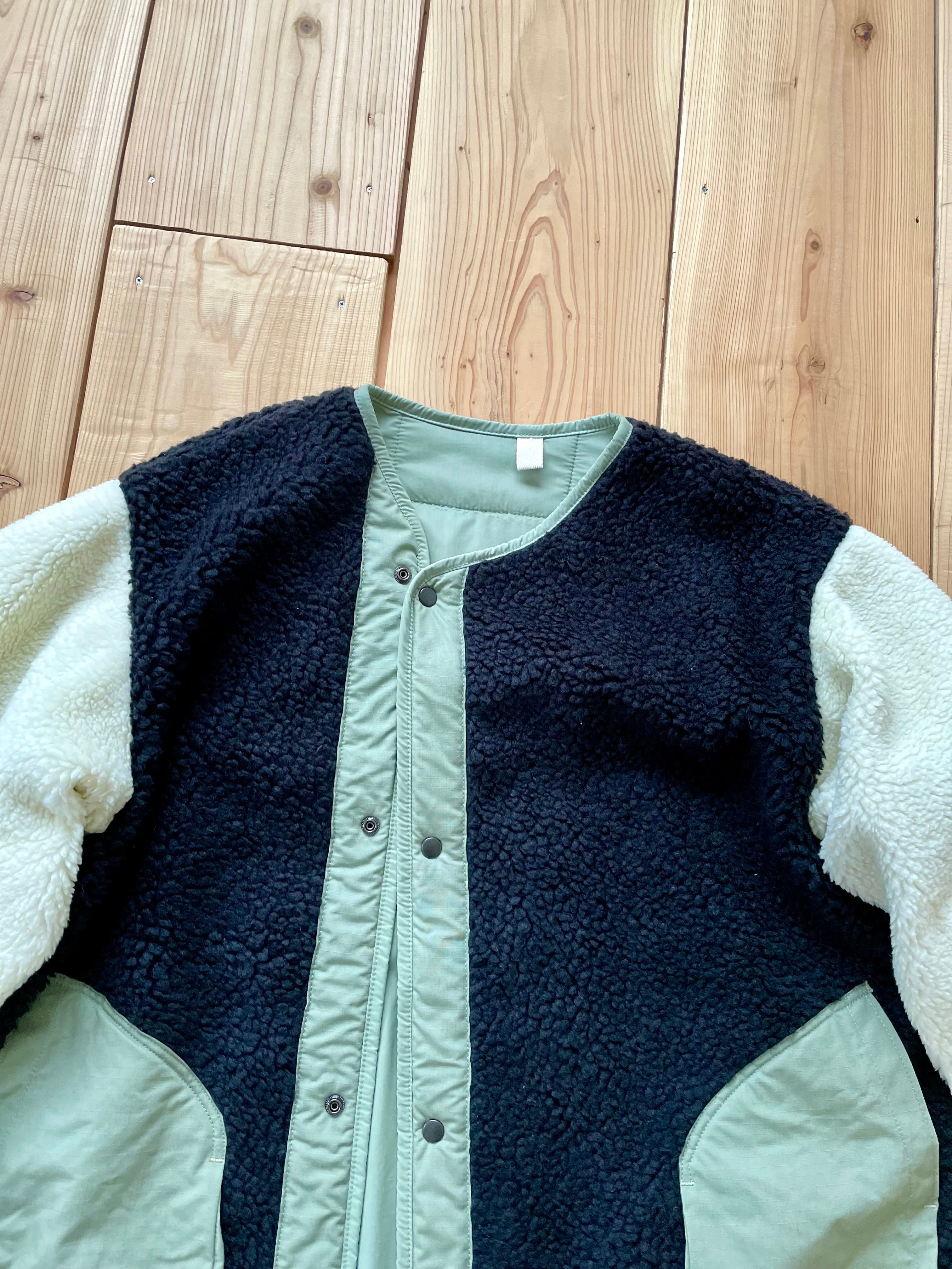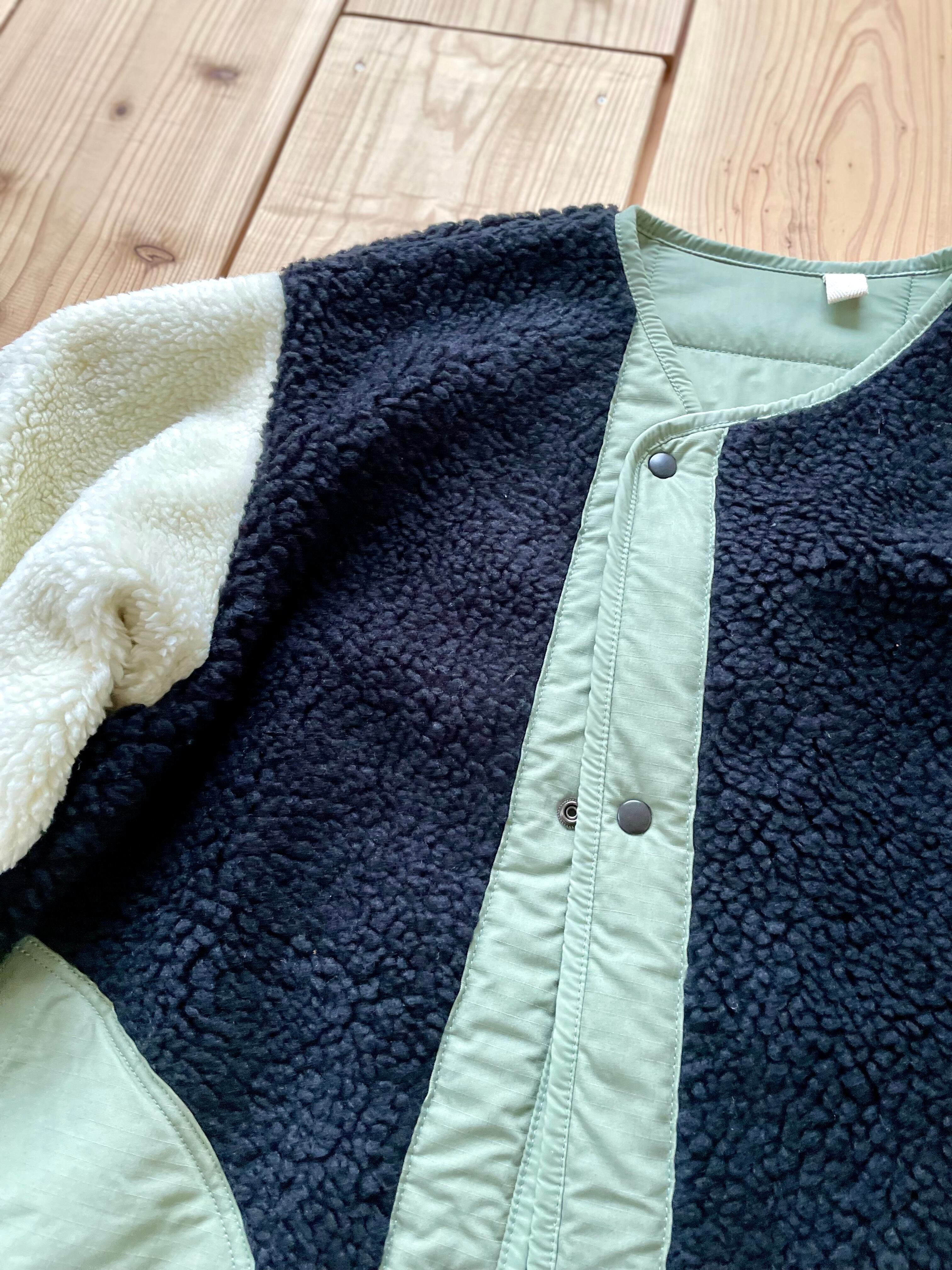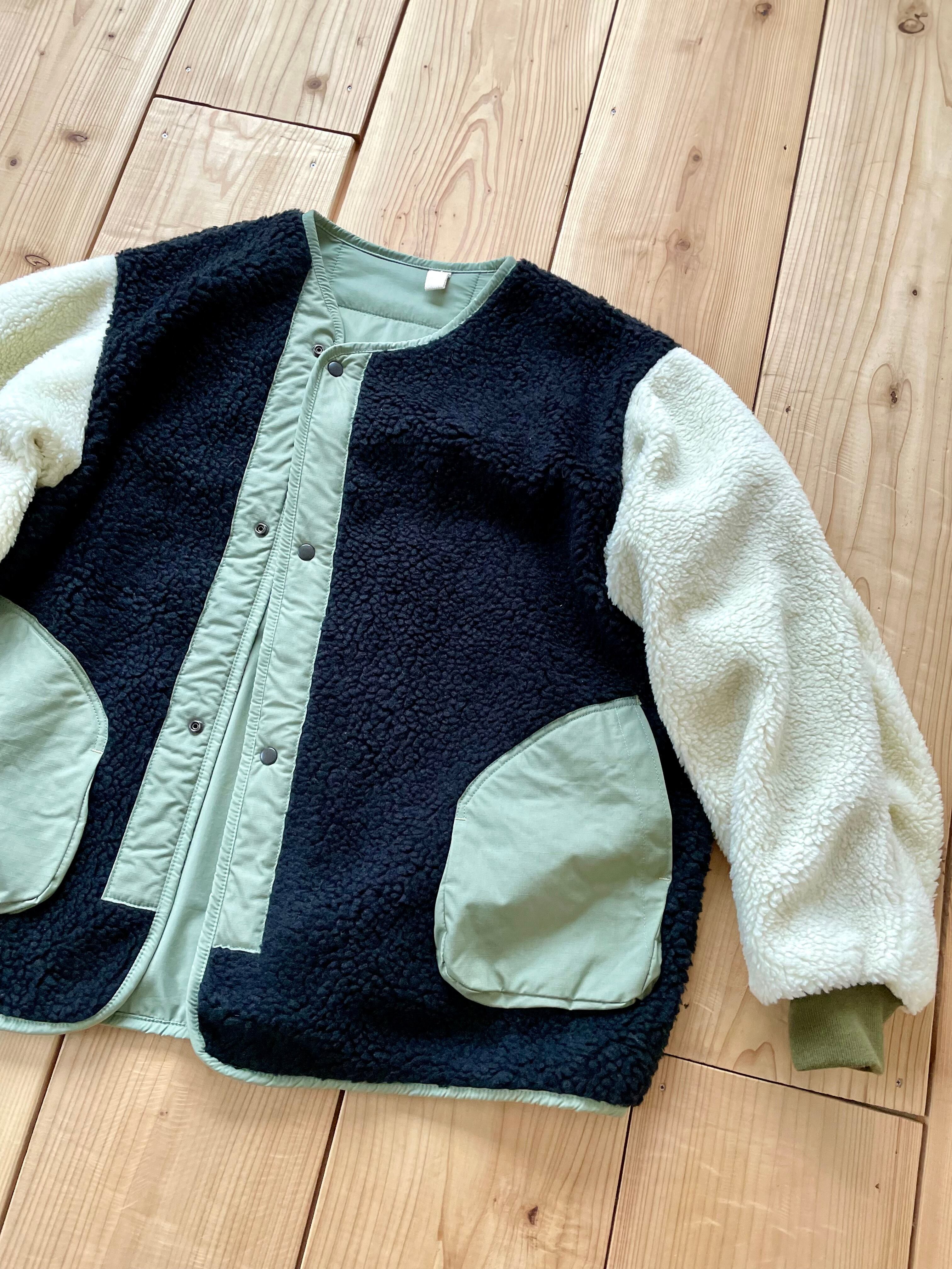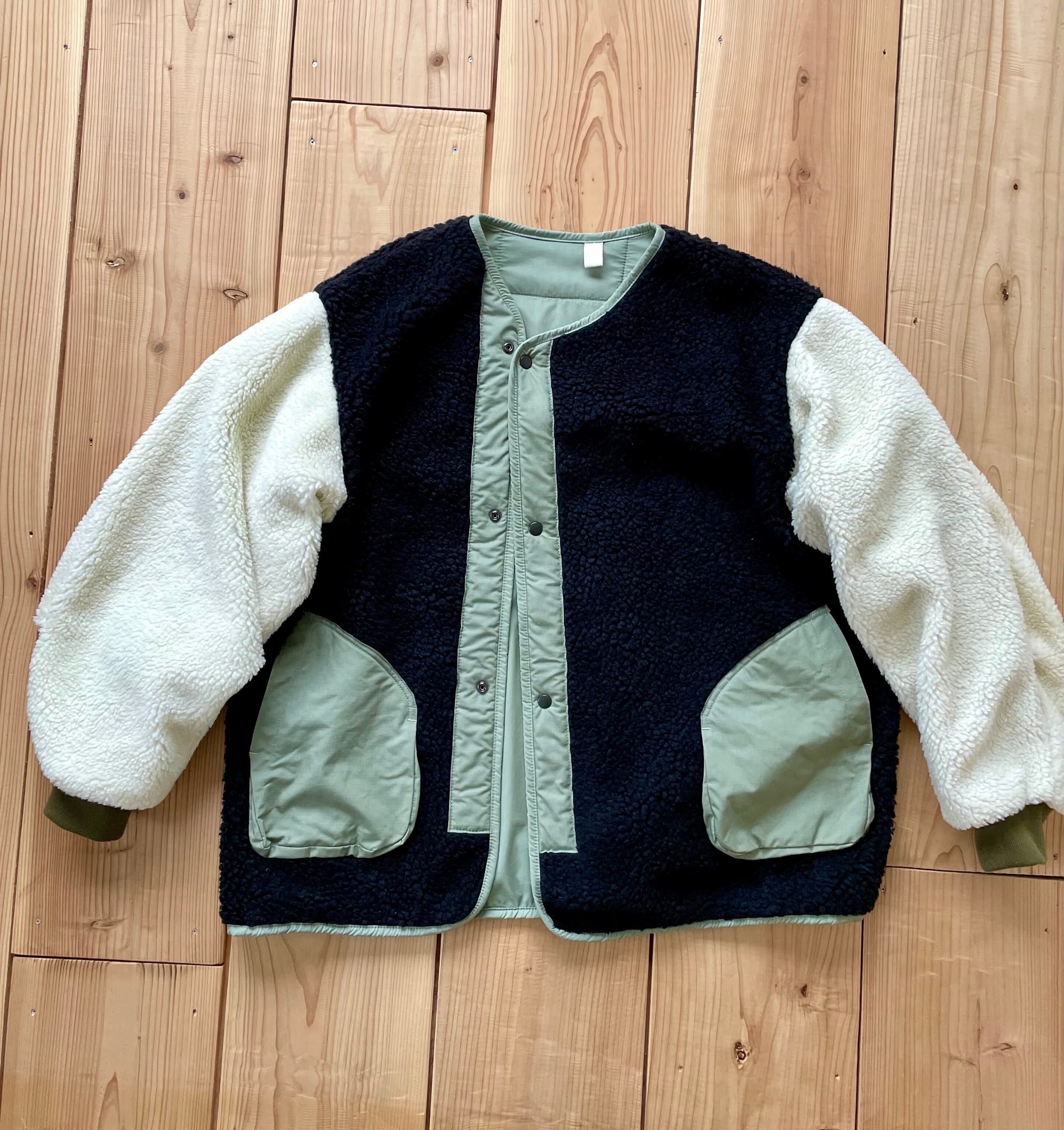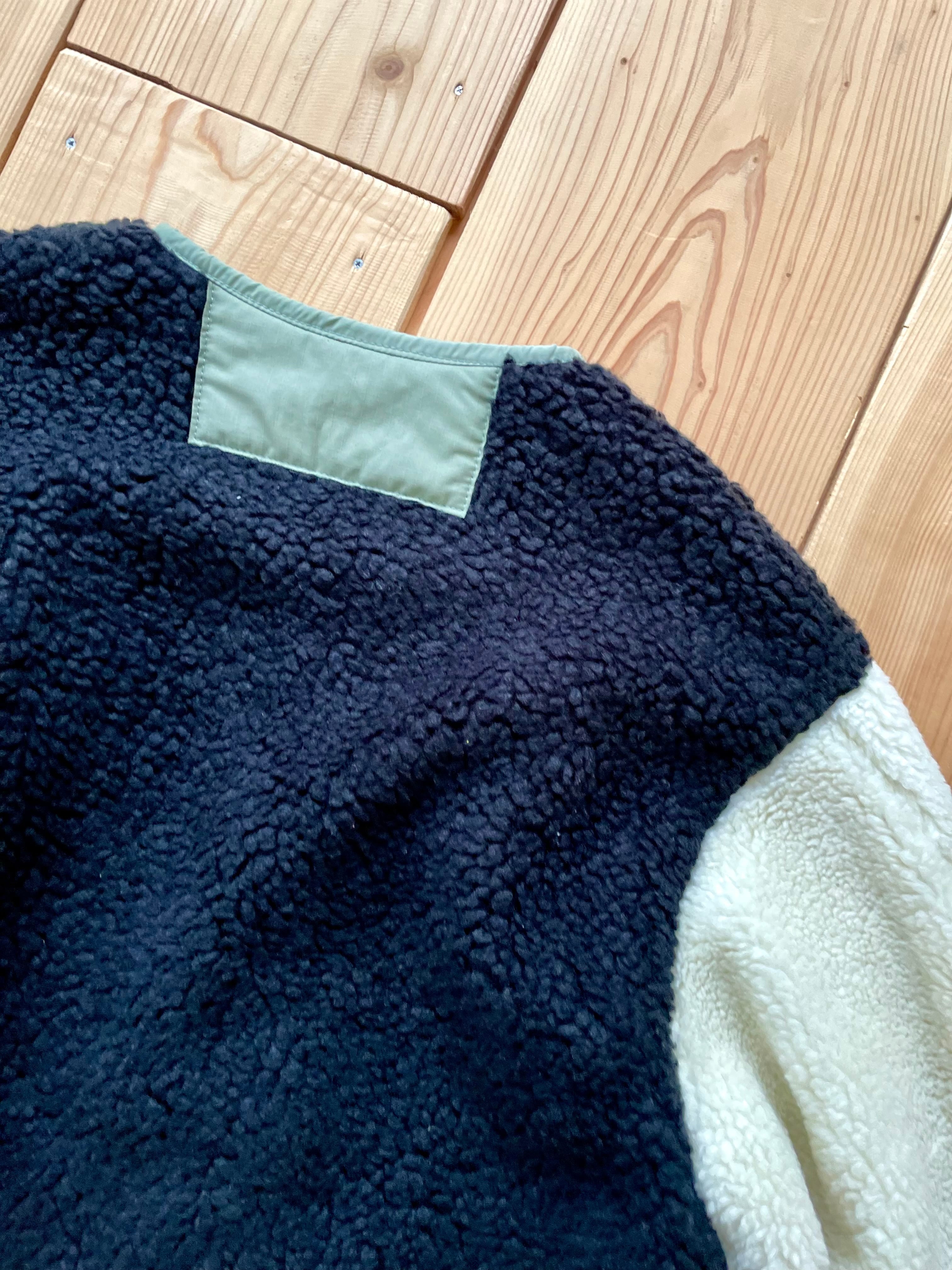 モコモコのフリース生地に、裏地をナイロン生地にして風を通しにくくしています。