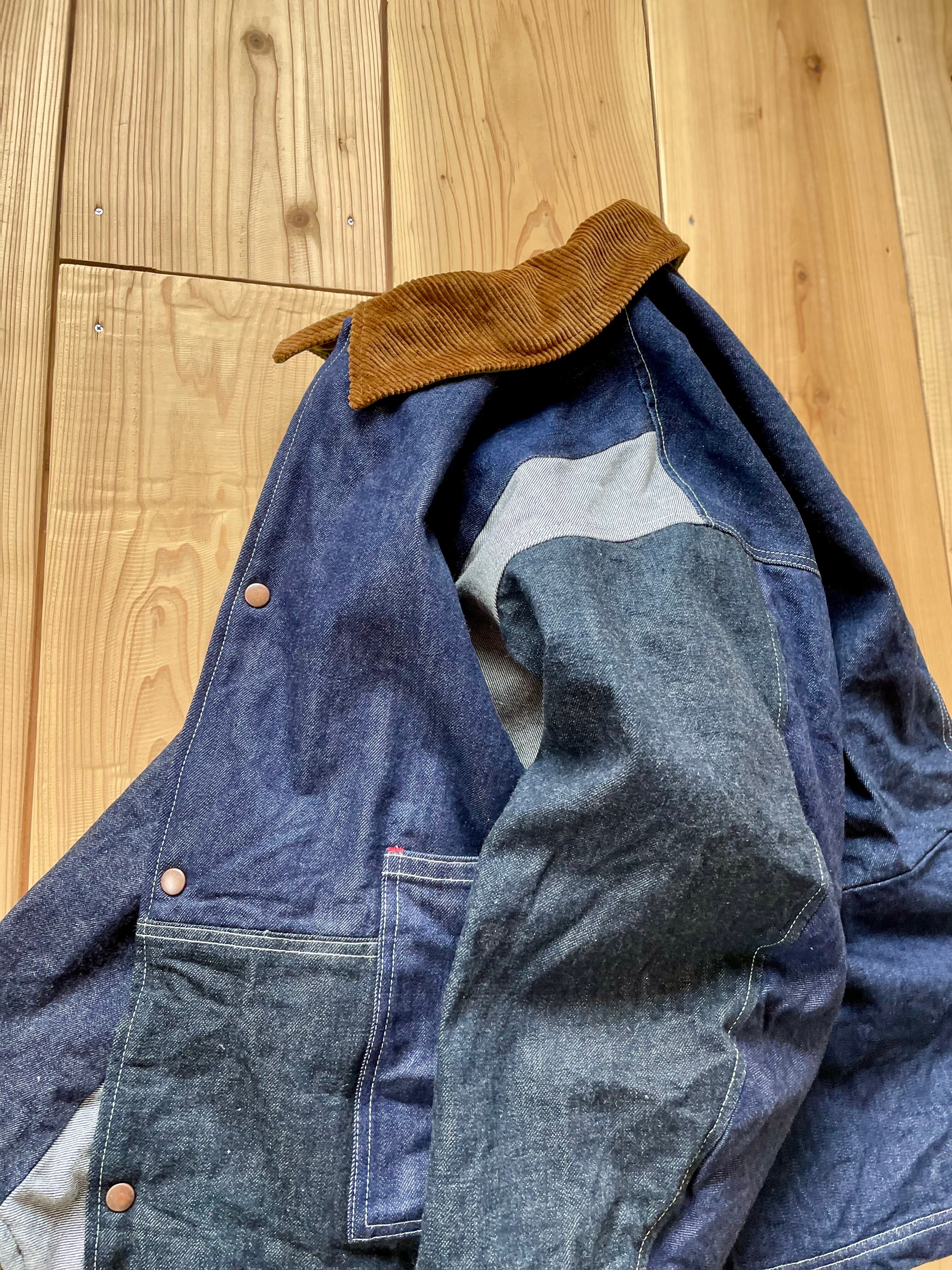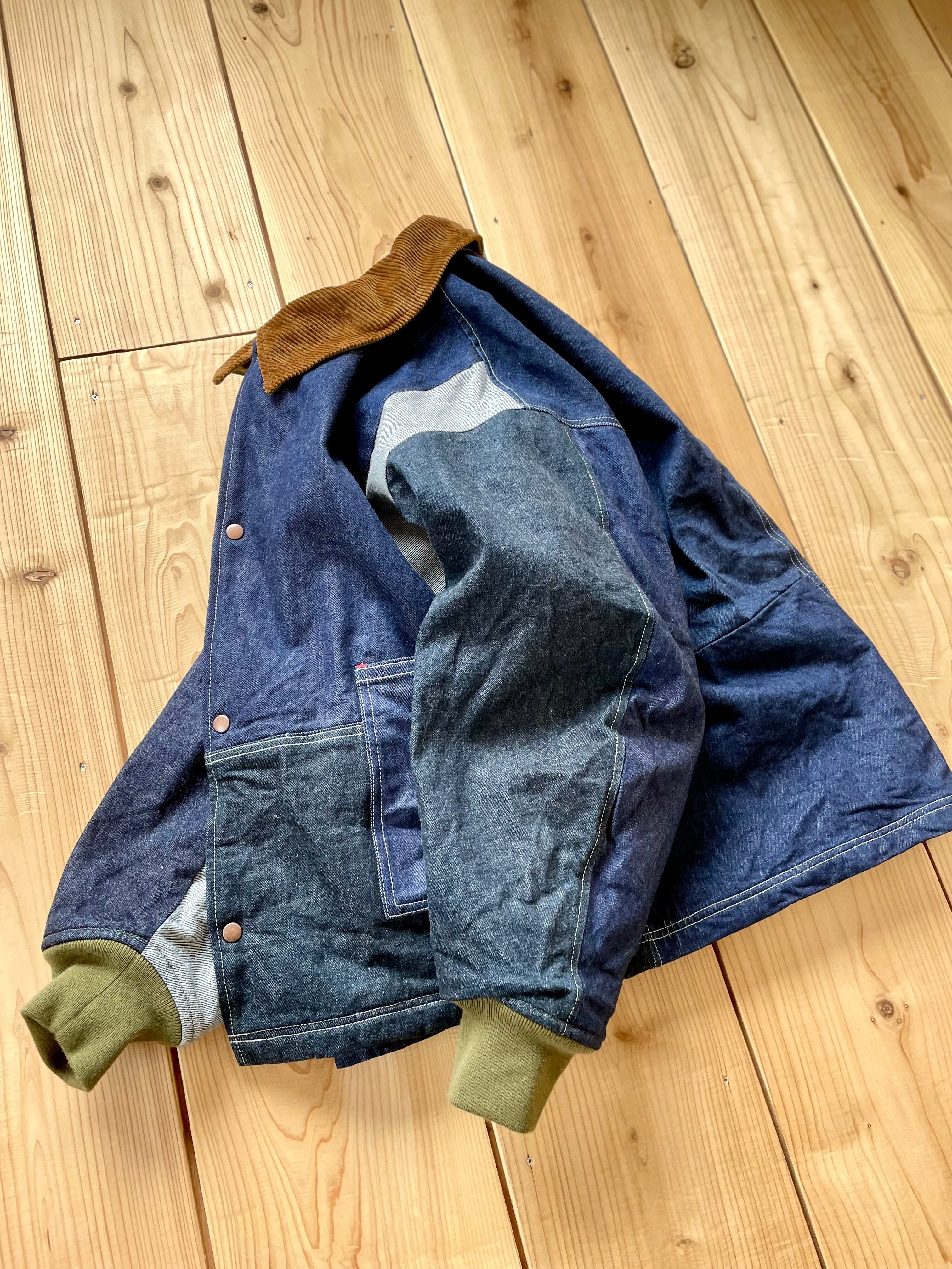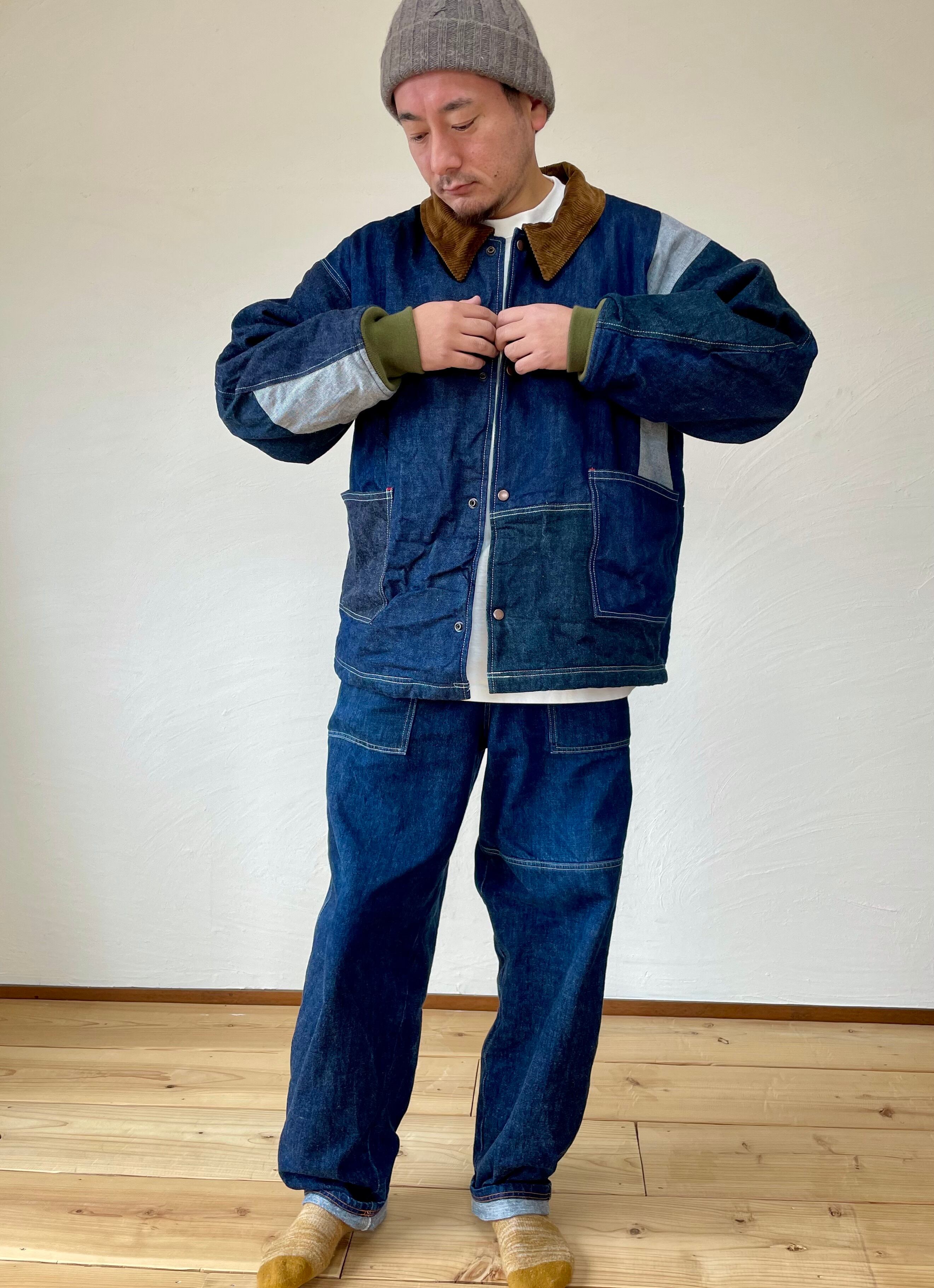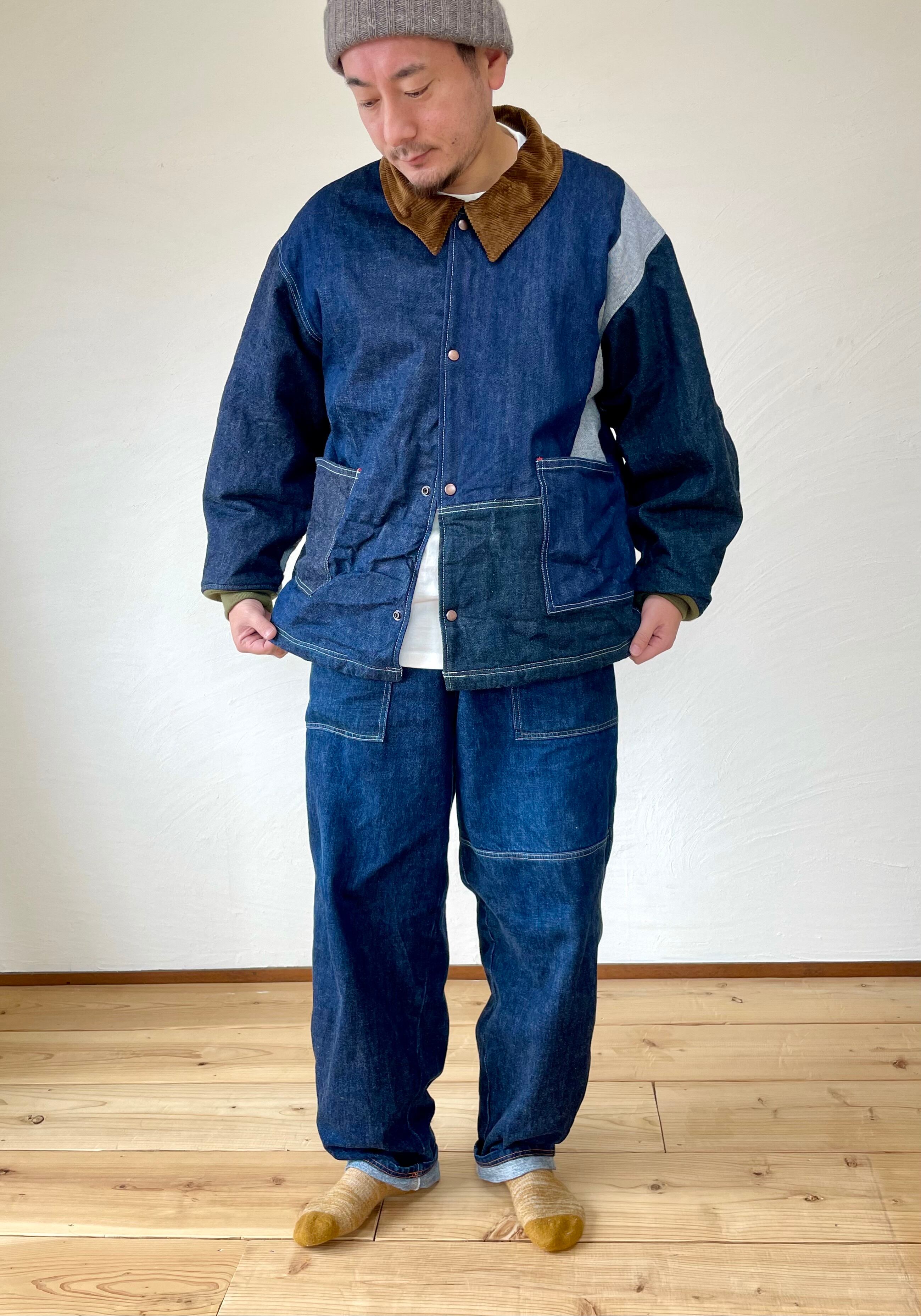 14〜16オンスのデニムをロット、厚み違いで6反くらいからパーツごとにランダムに使っています。