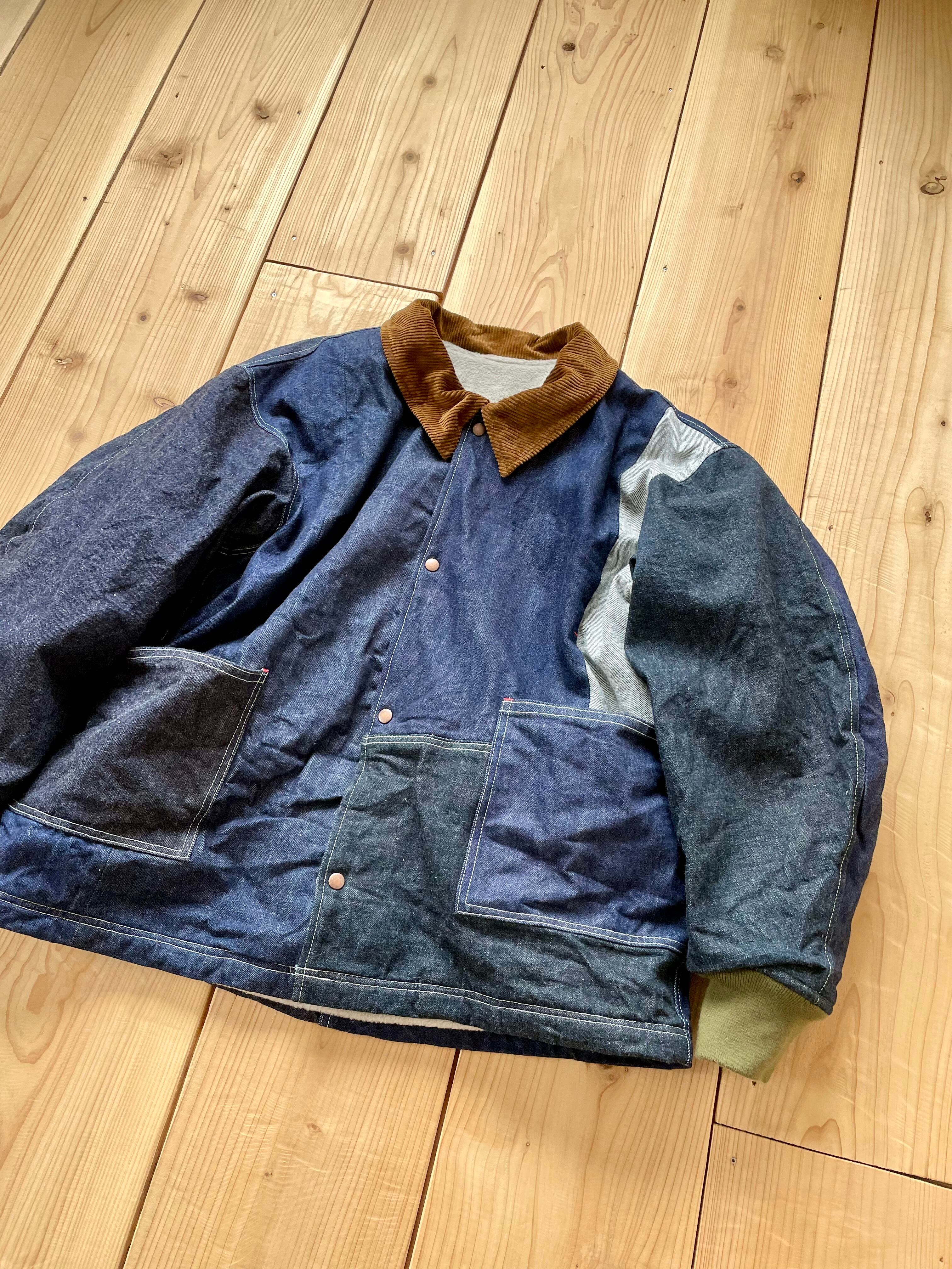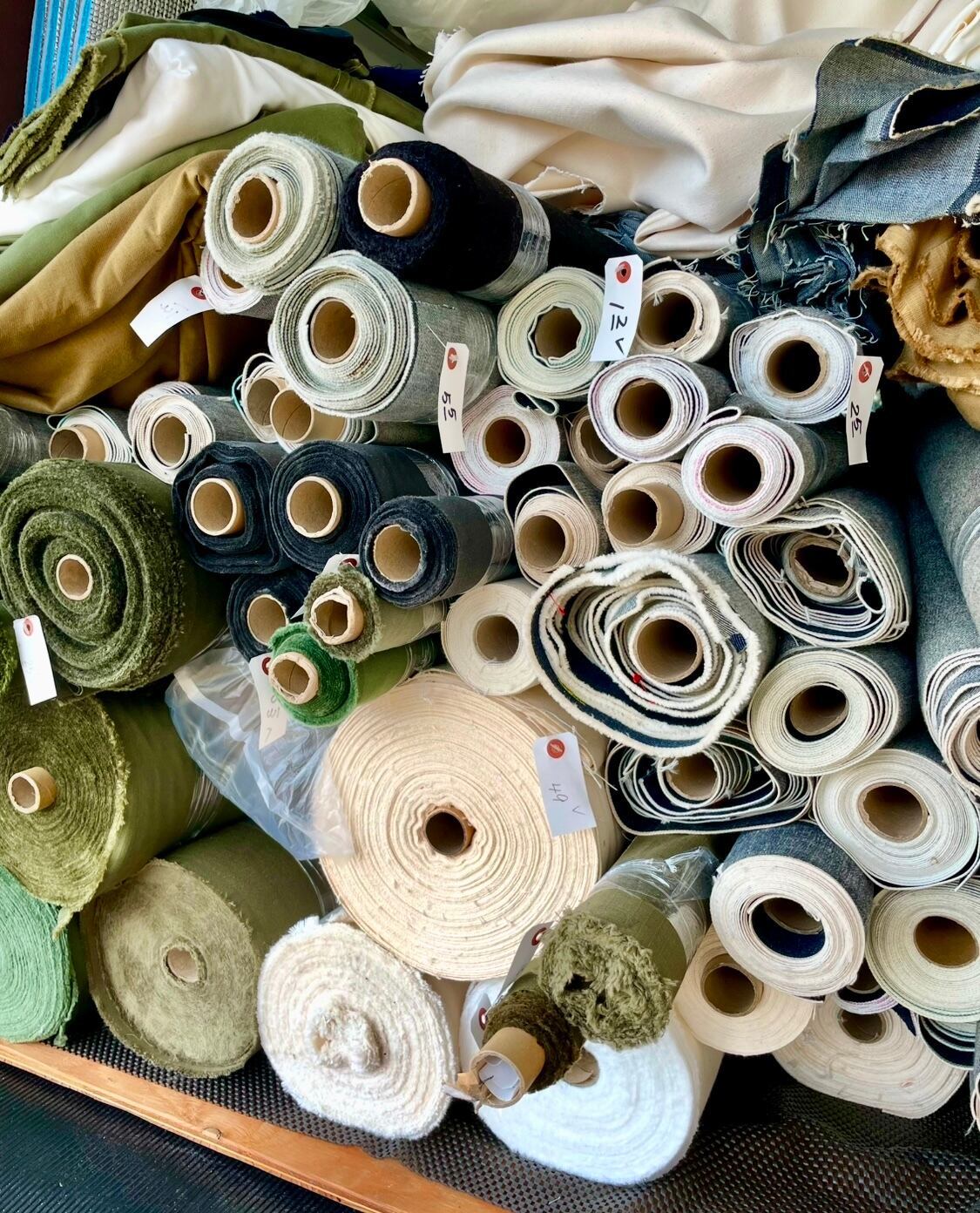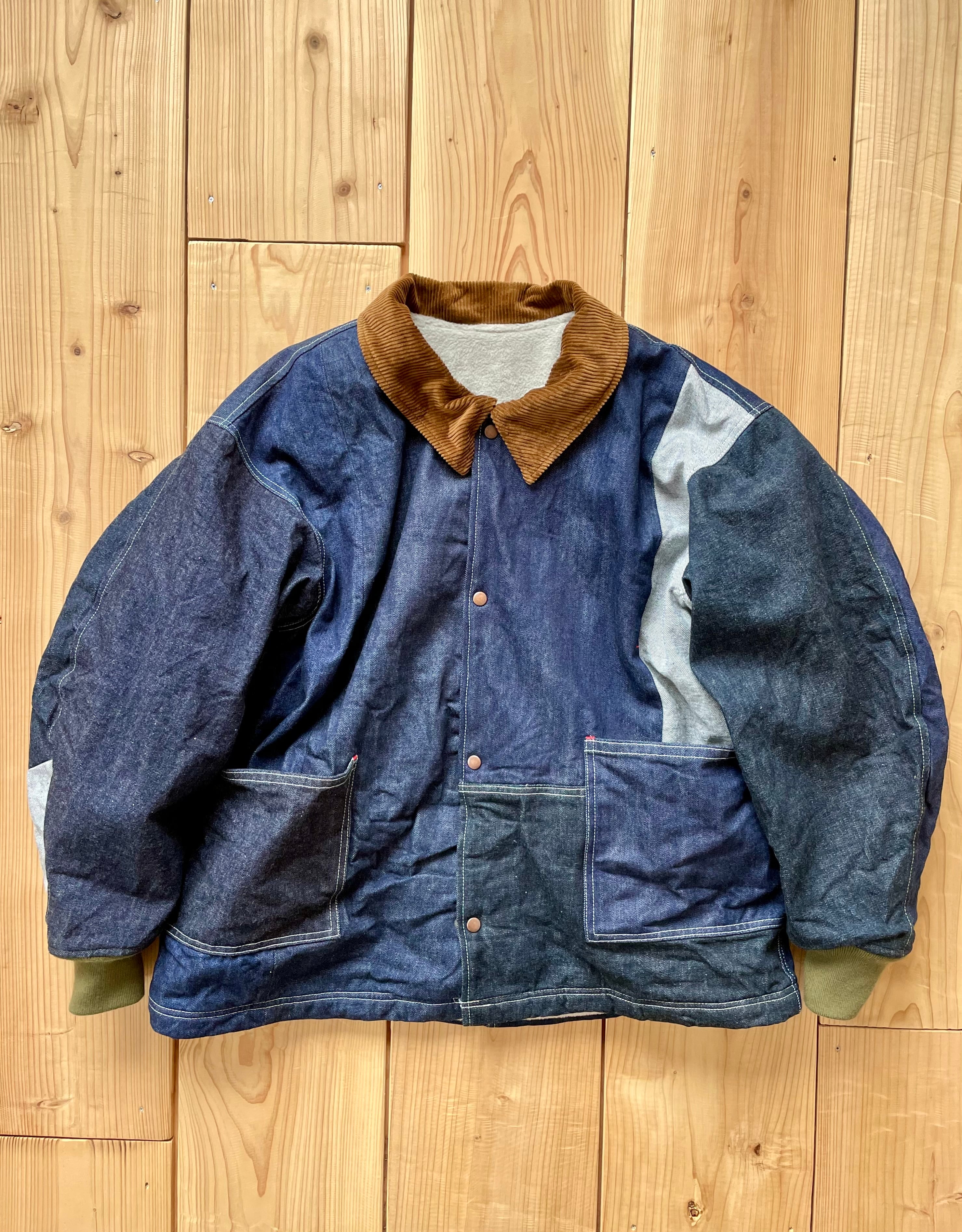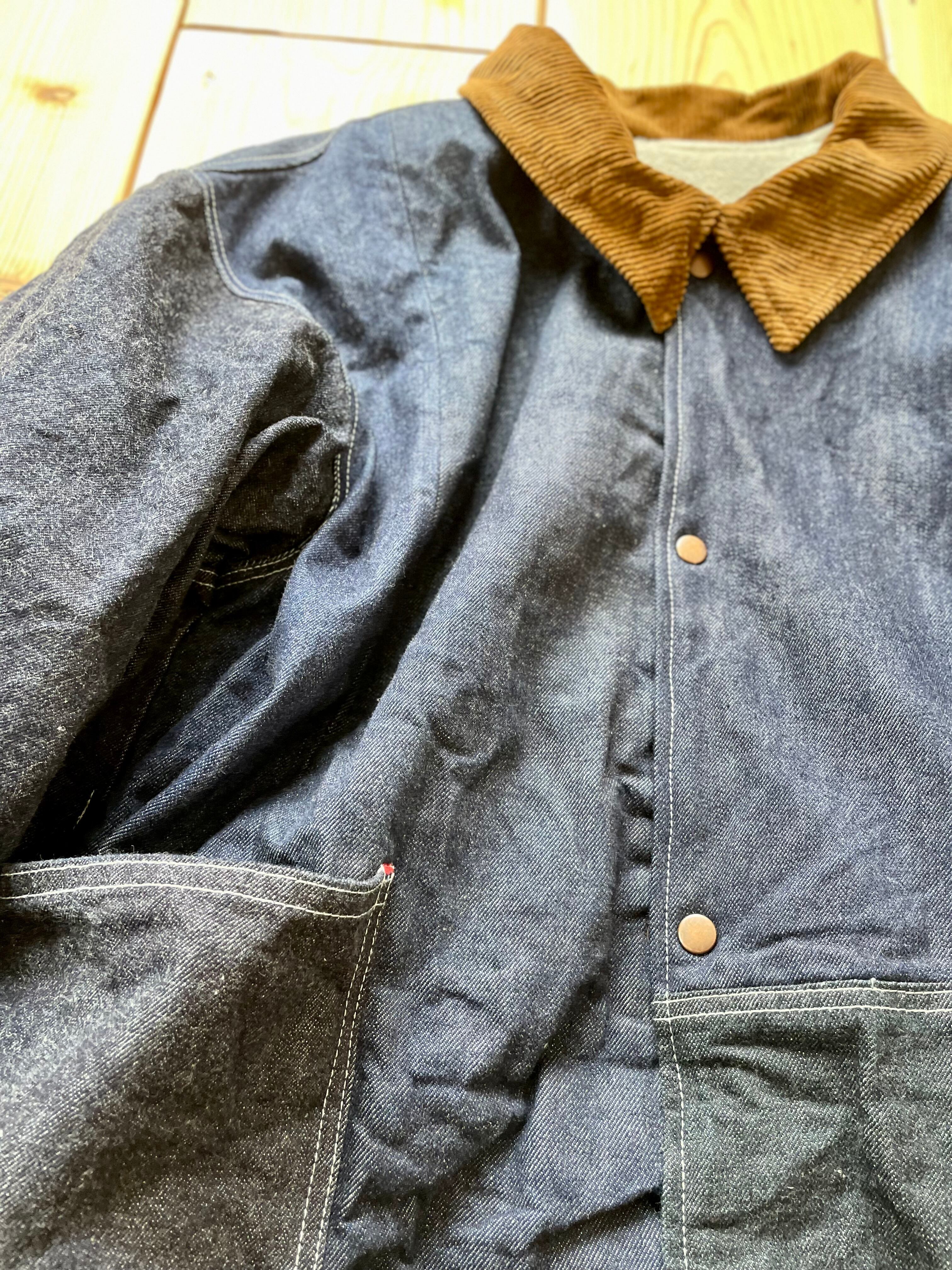 14〜16オンスのデニムをロット、厚み違いで6反くらいからパーツごとにランダムに使っています。