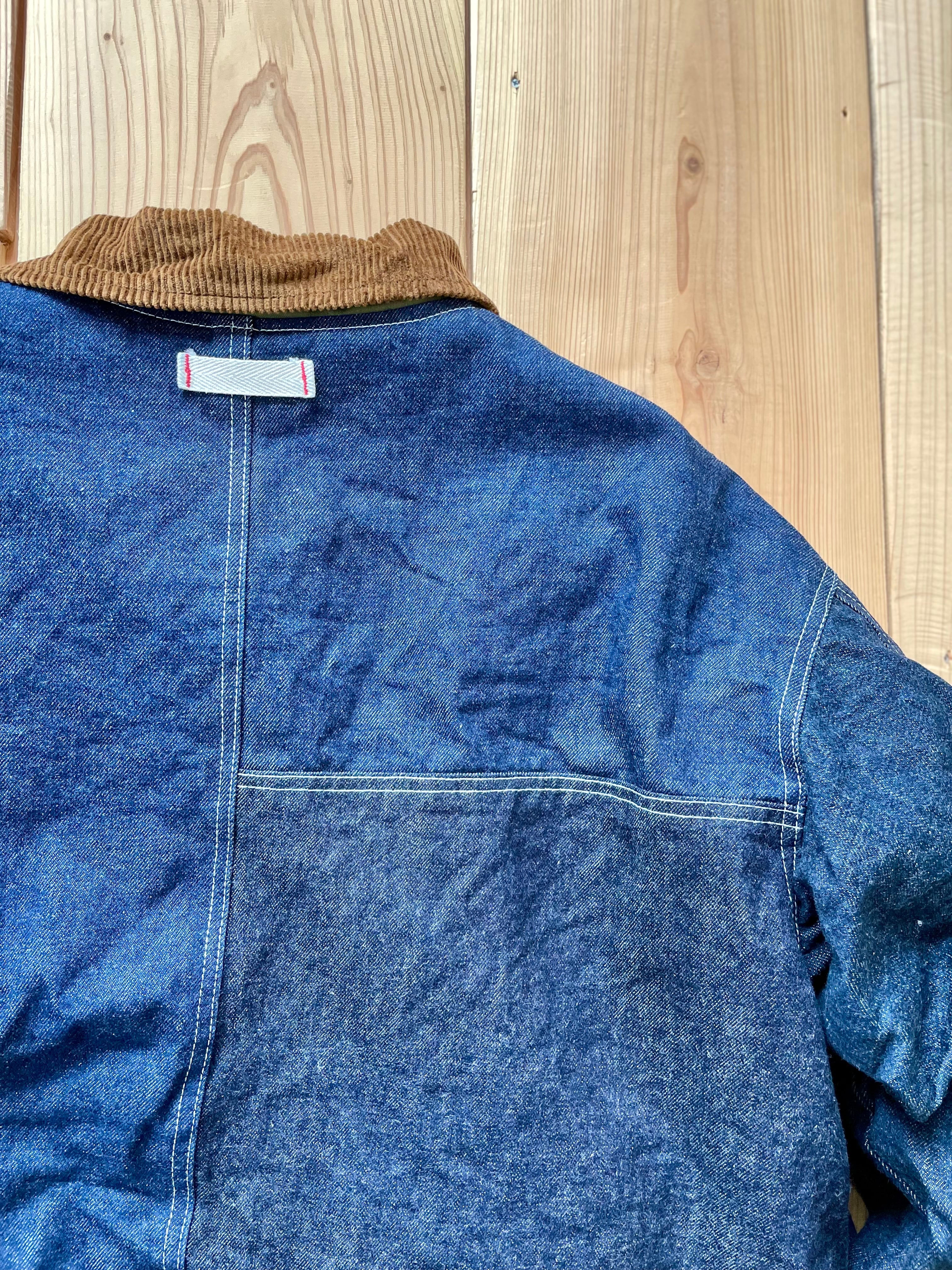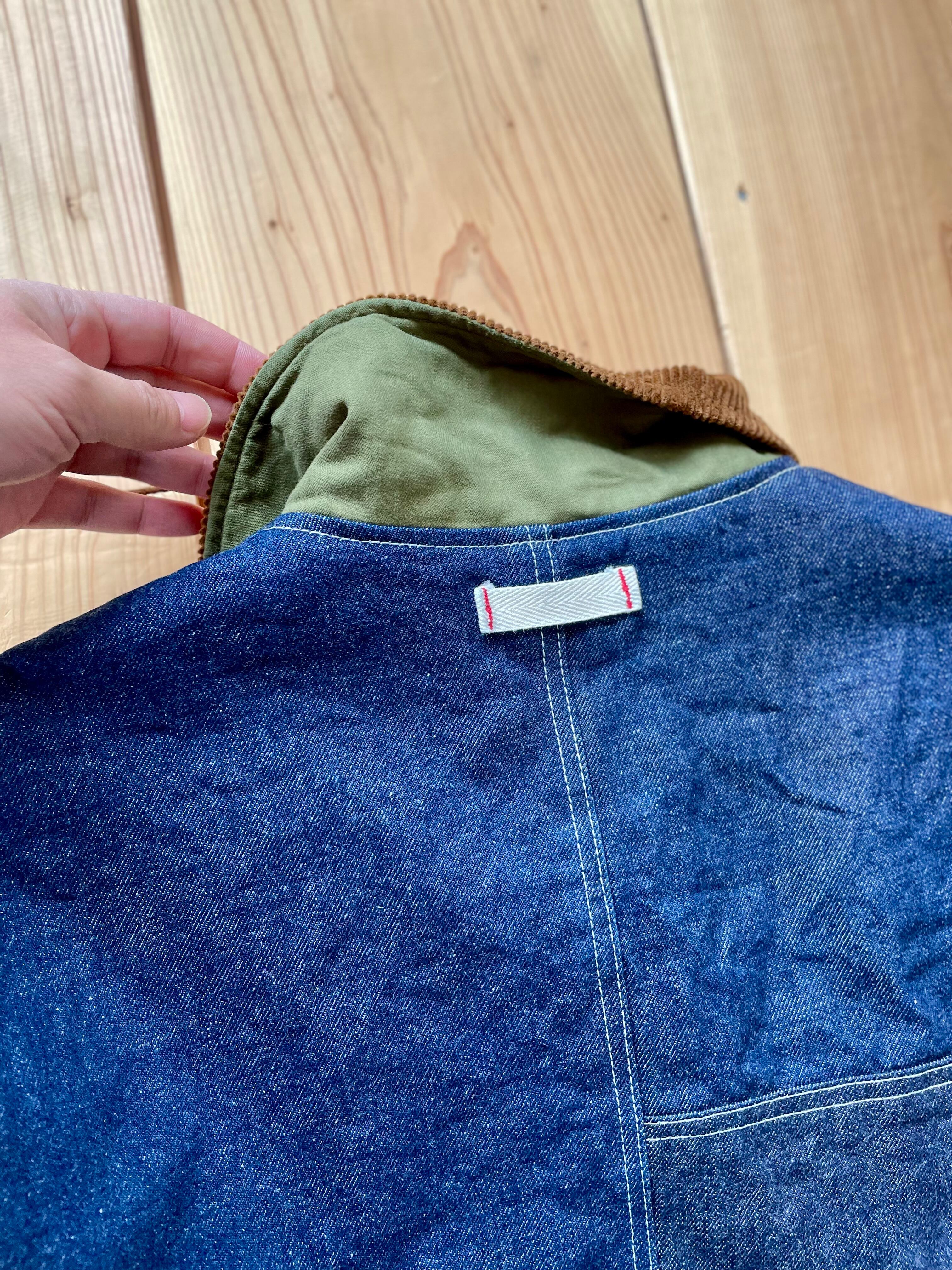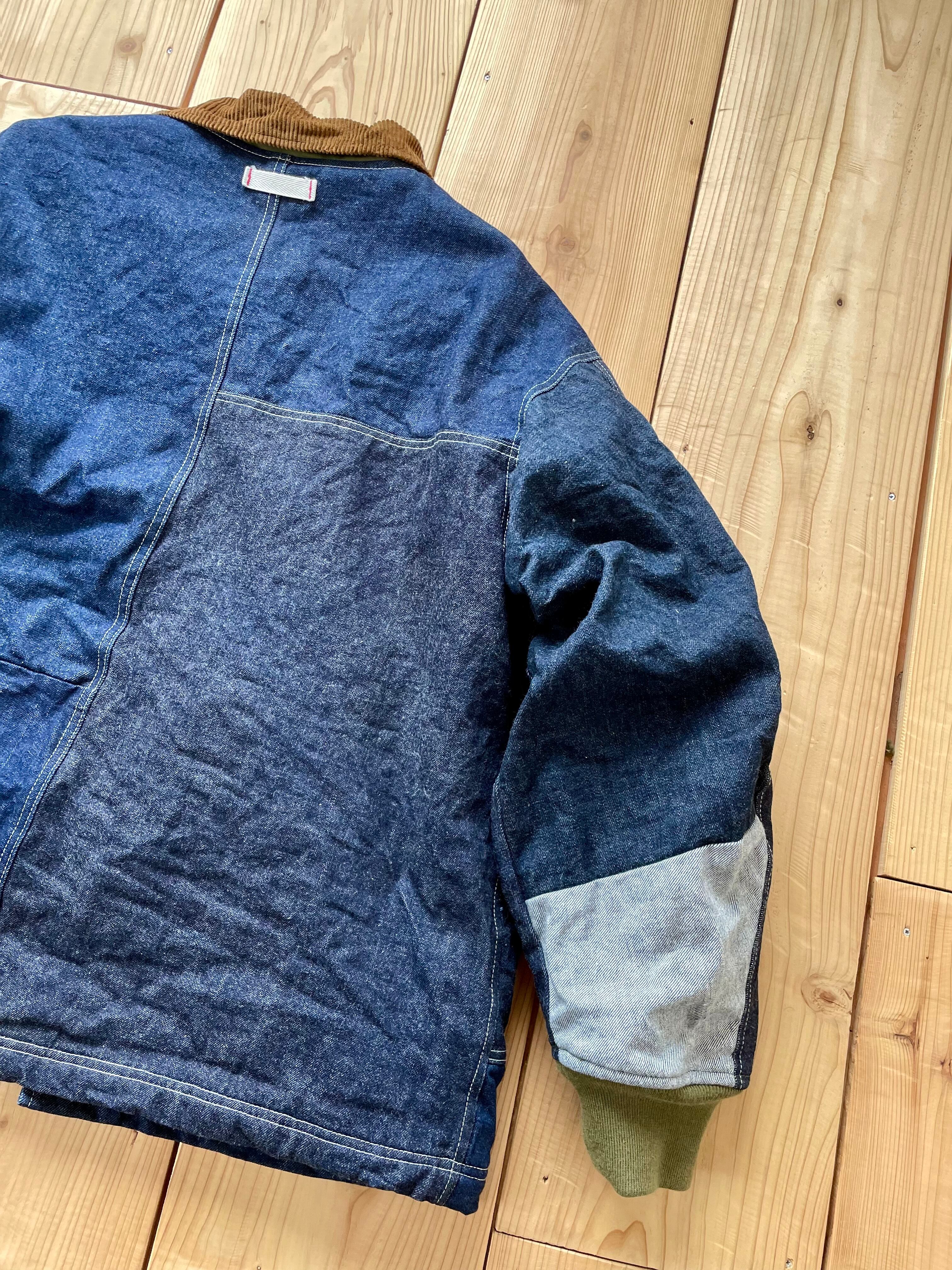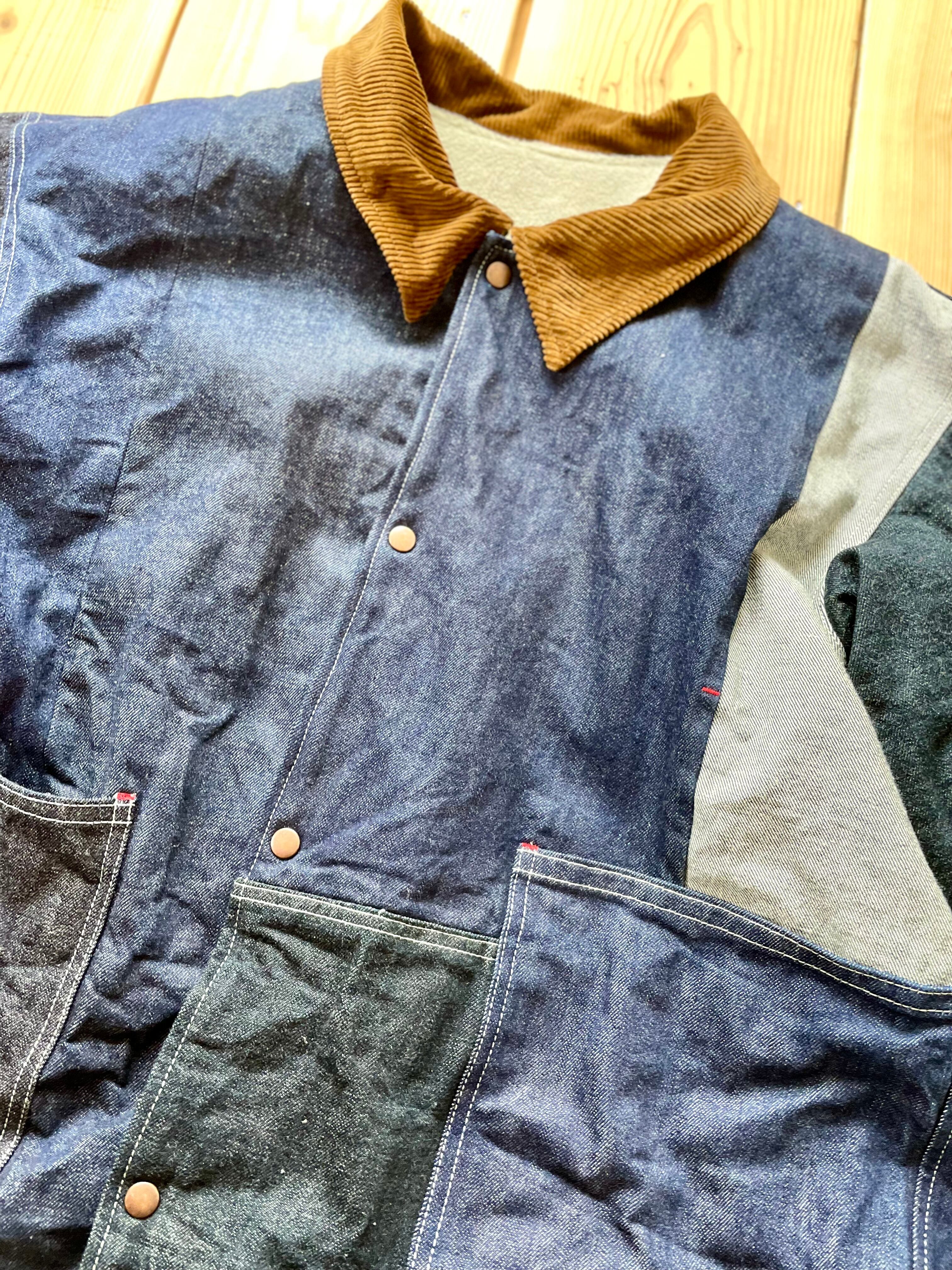 14〜16オンスのデニムをロット、厚み違いで6反くらいからパーツごとにランダムに使っています。