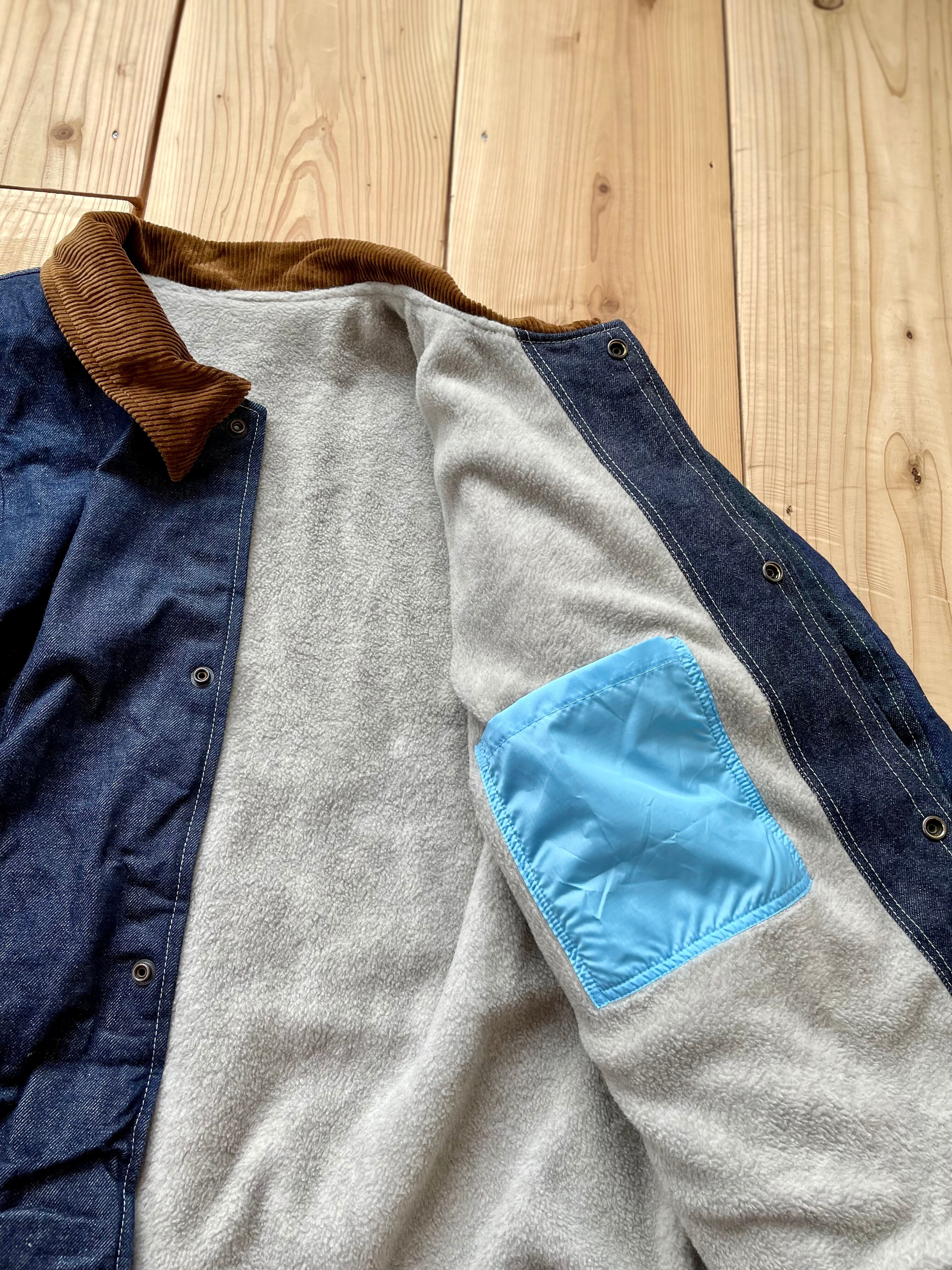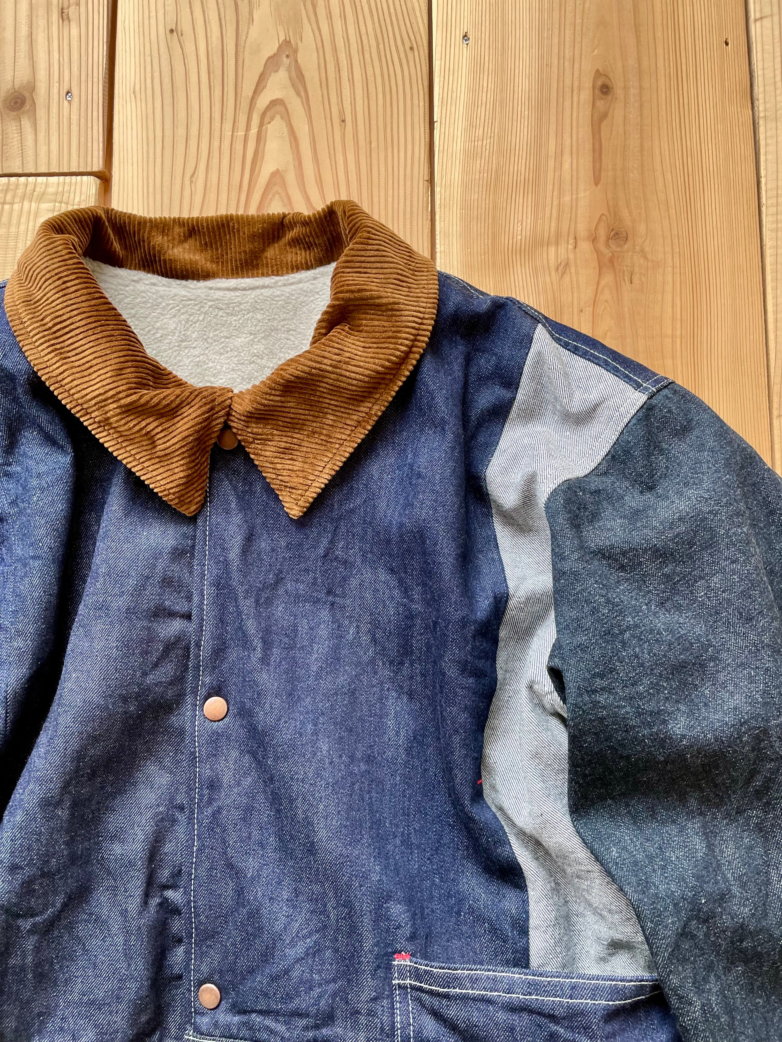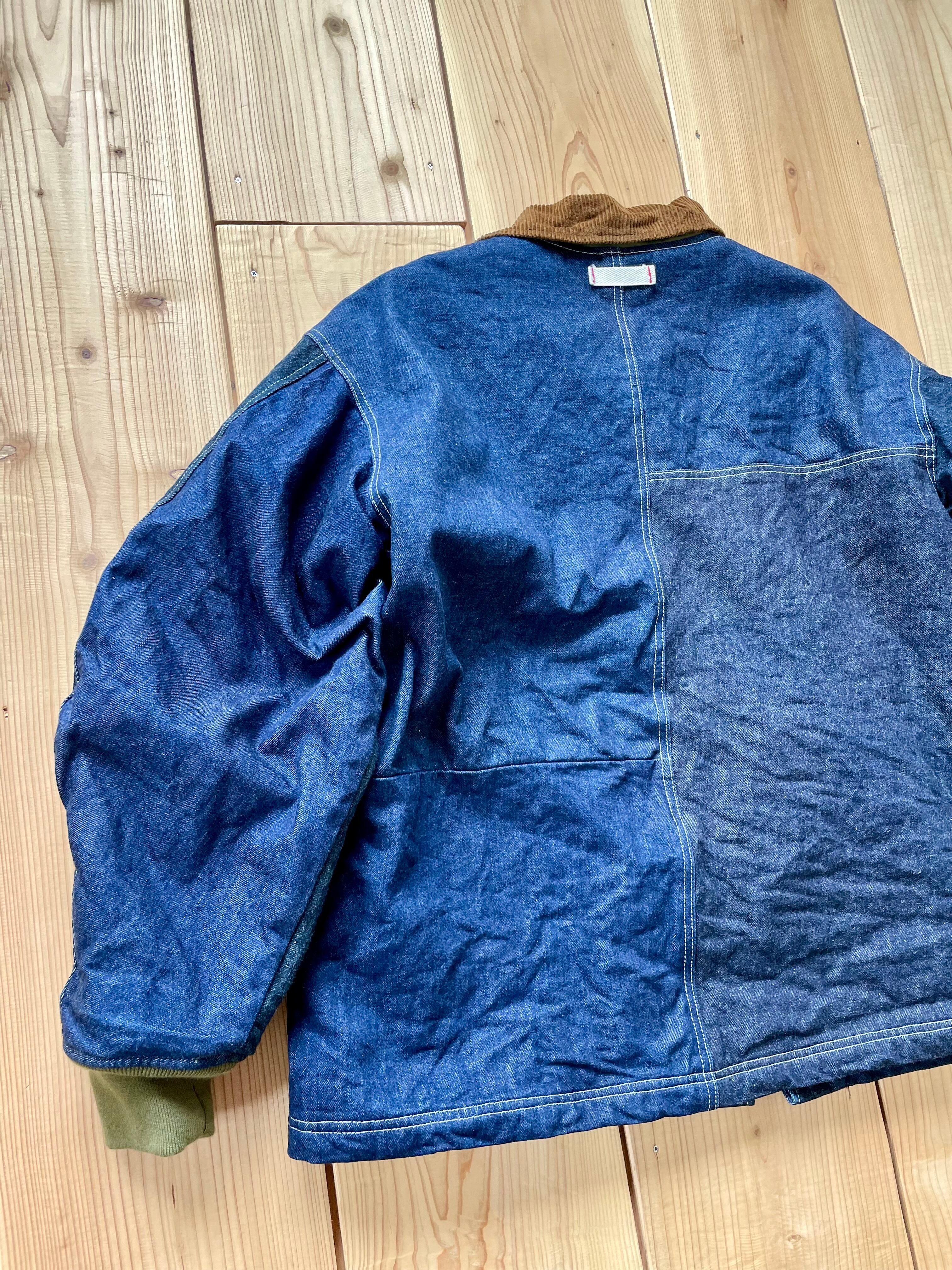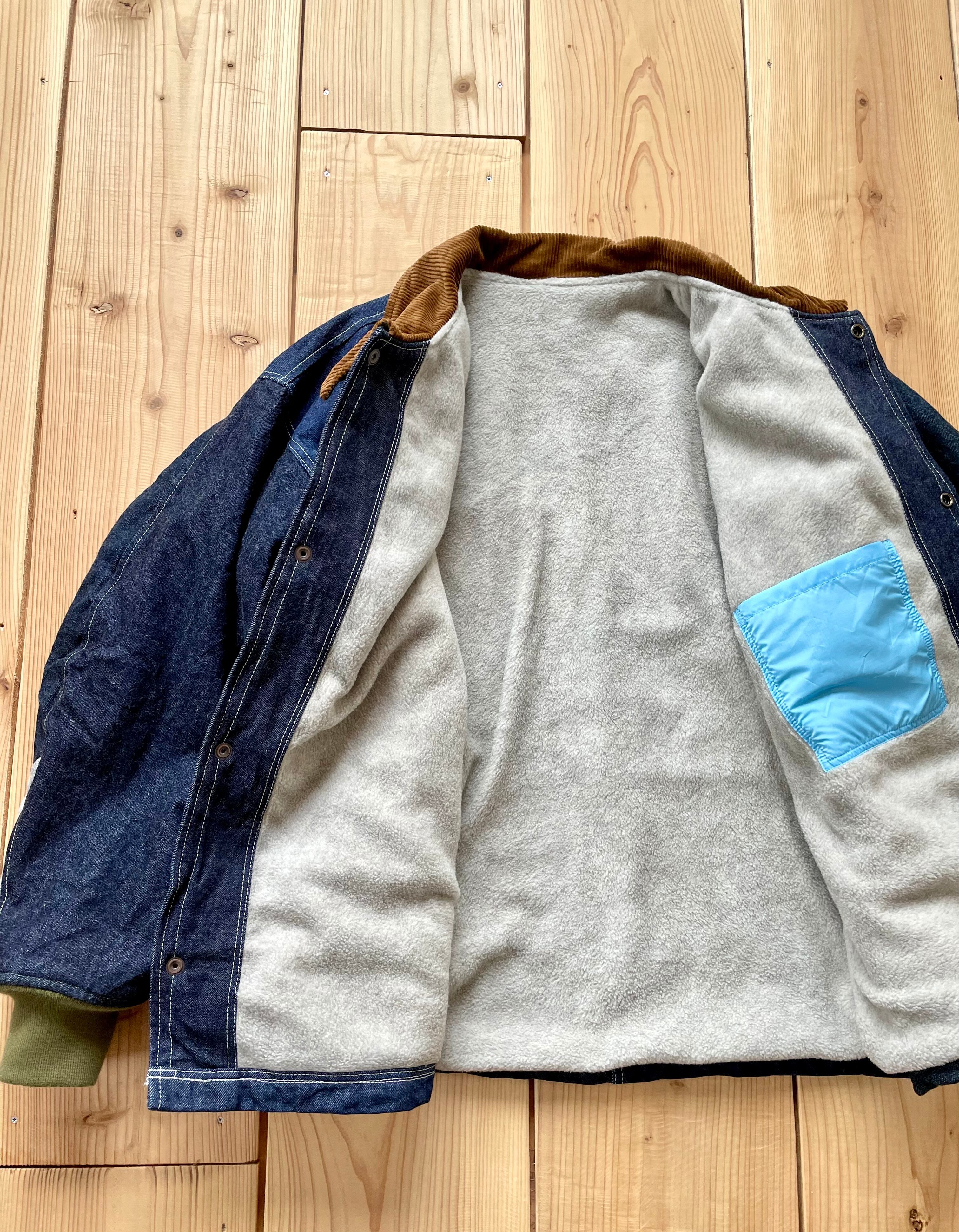 14〜16オンスのデニムをロット、厚み違いで6反くらいからパーツごとにランダムに使っています。