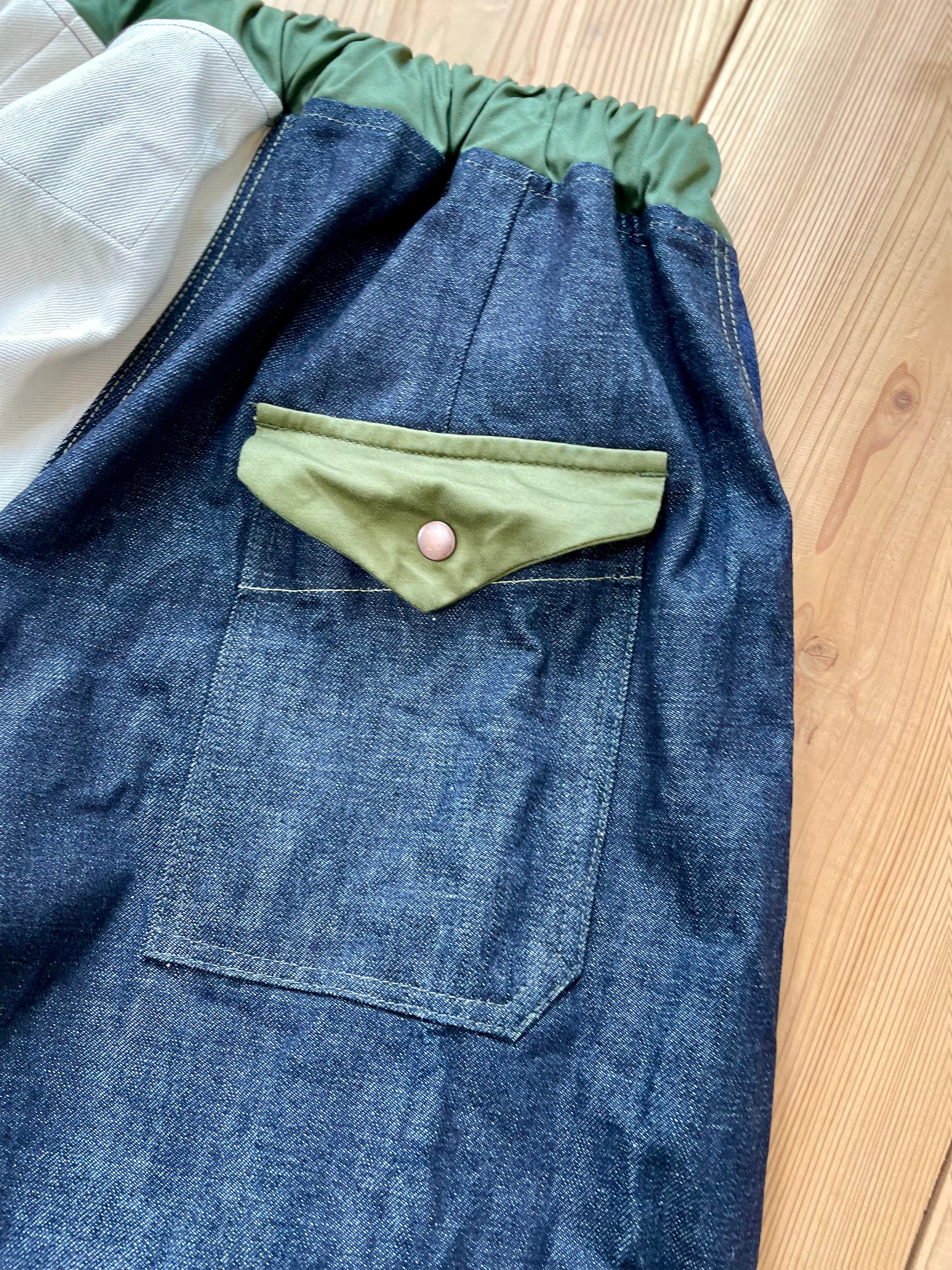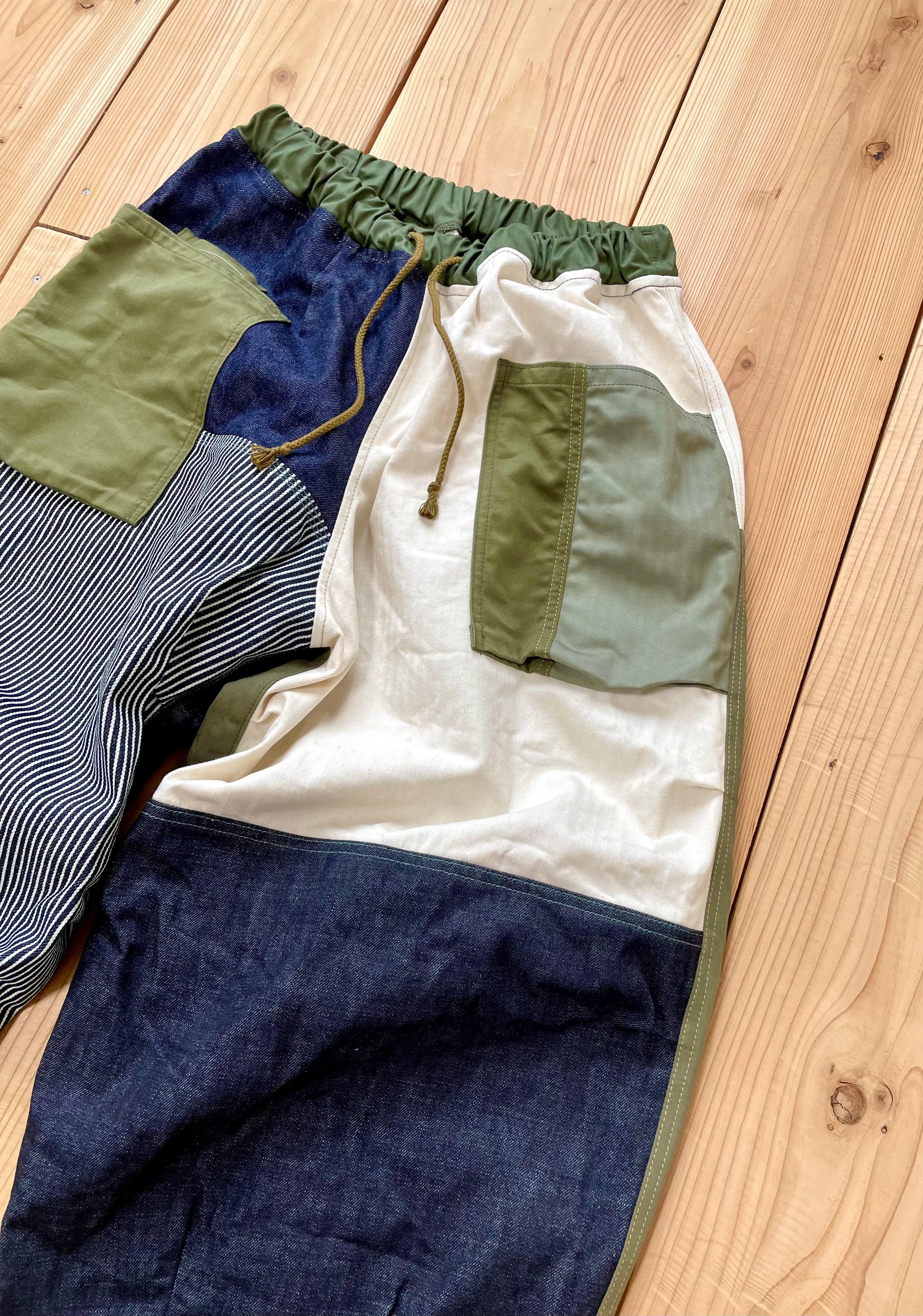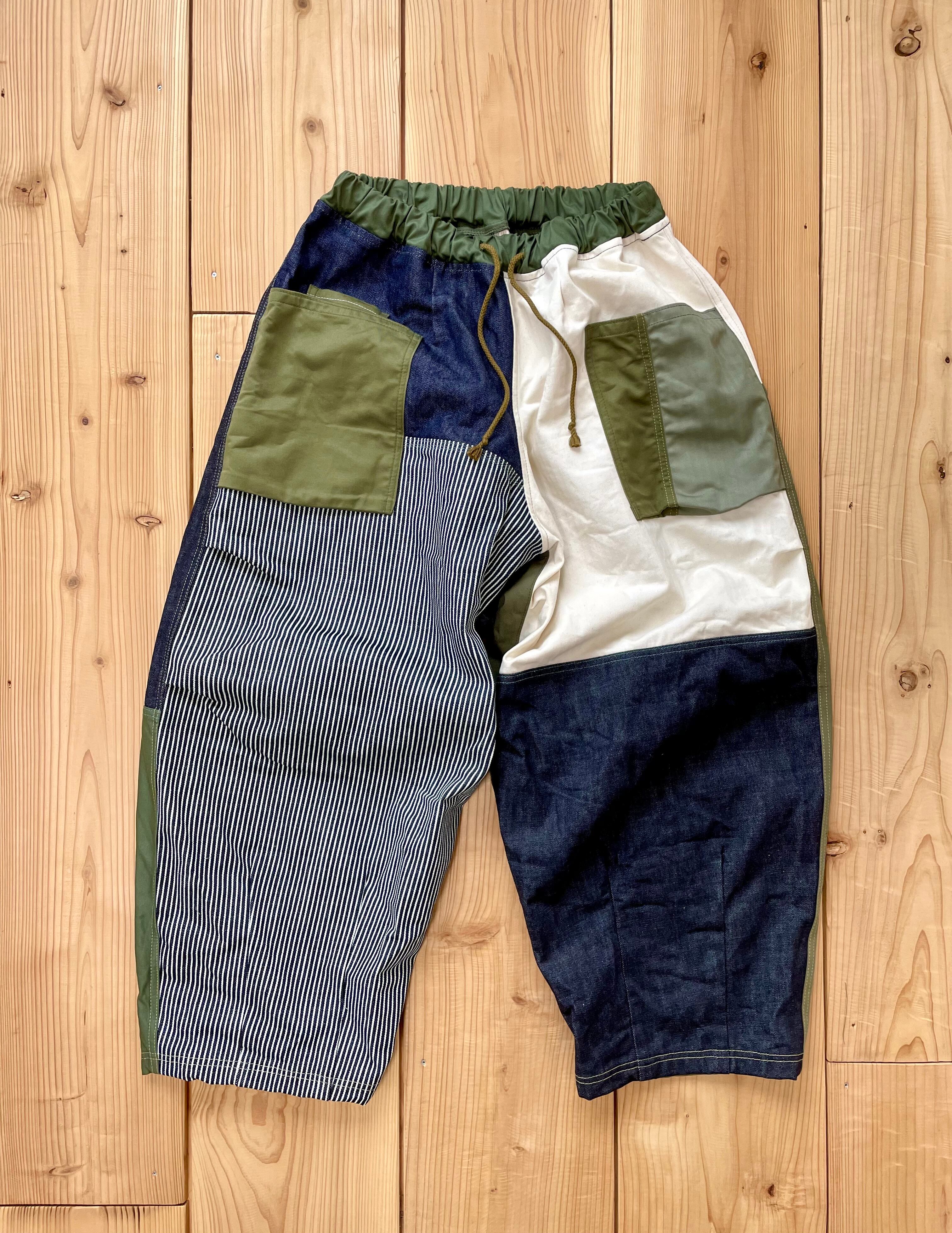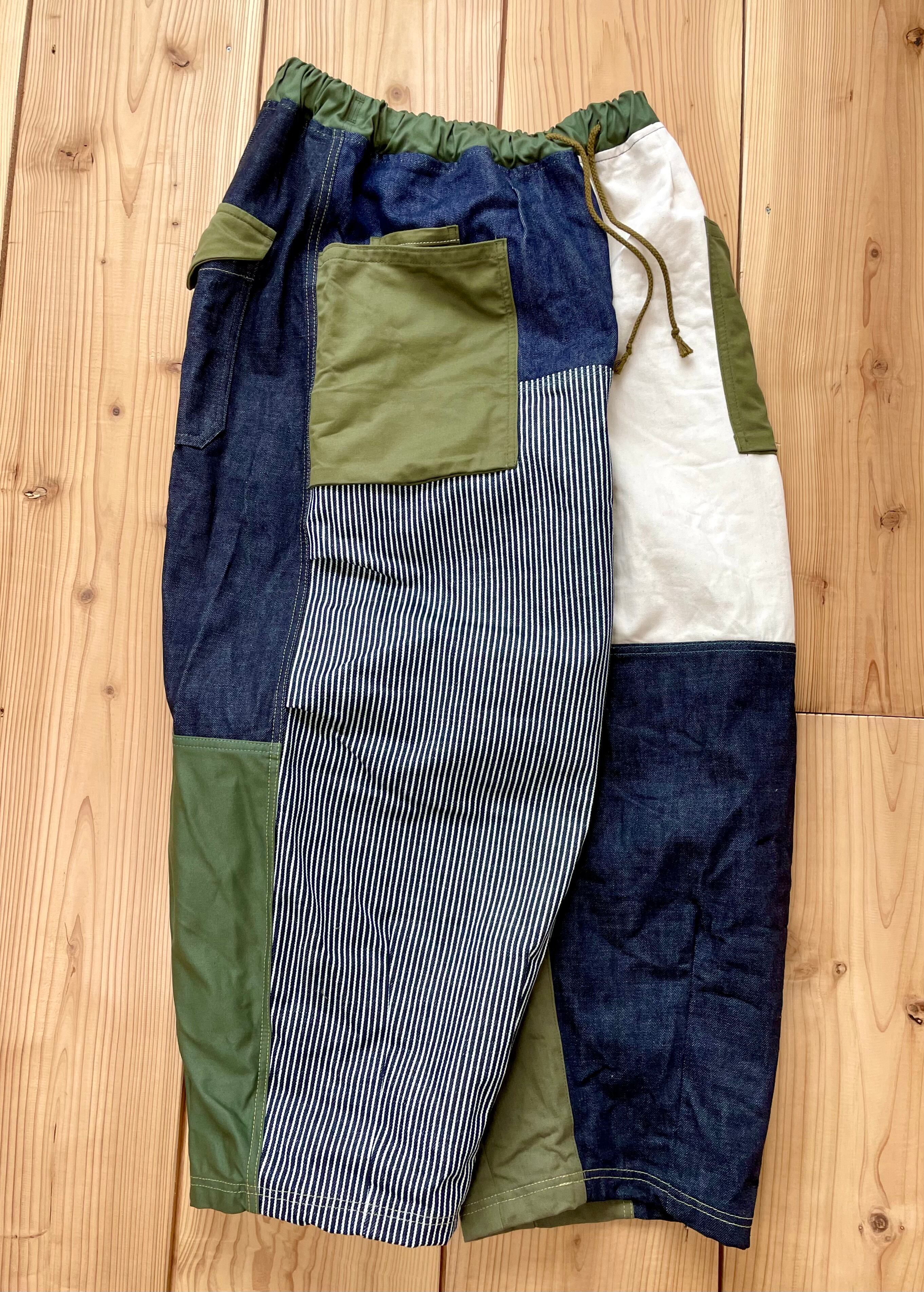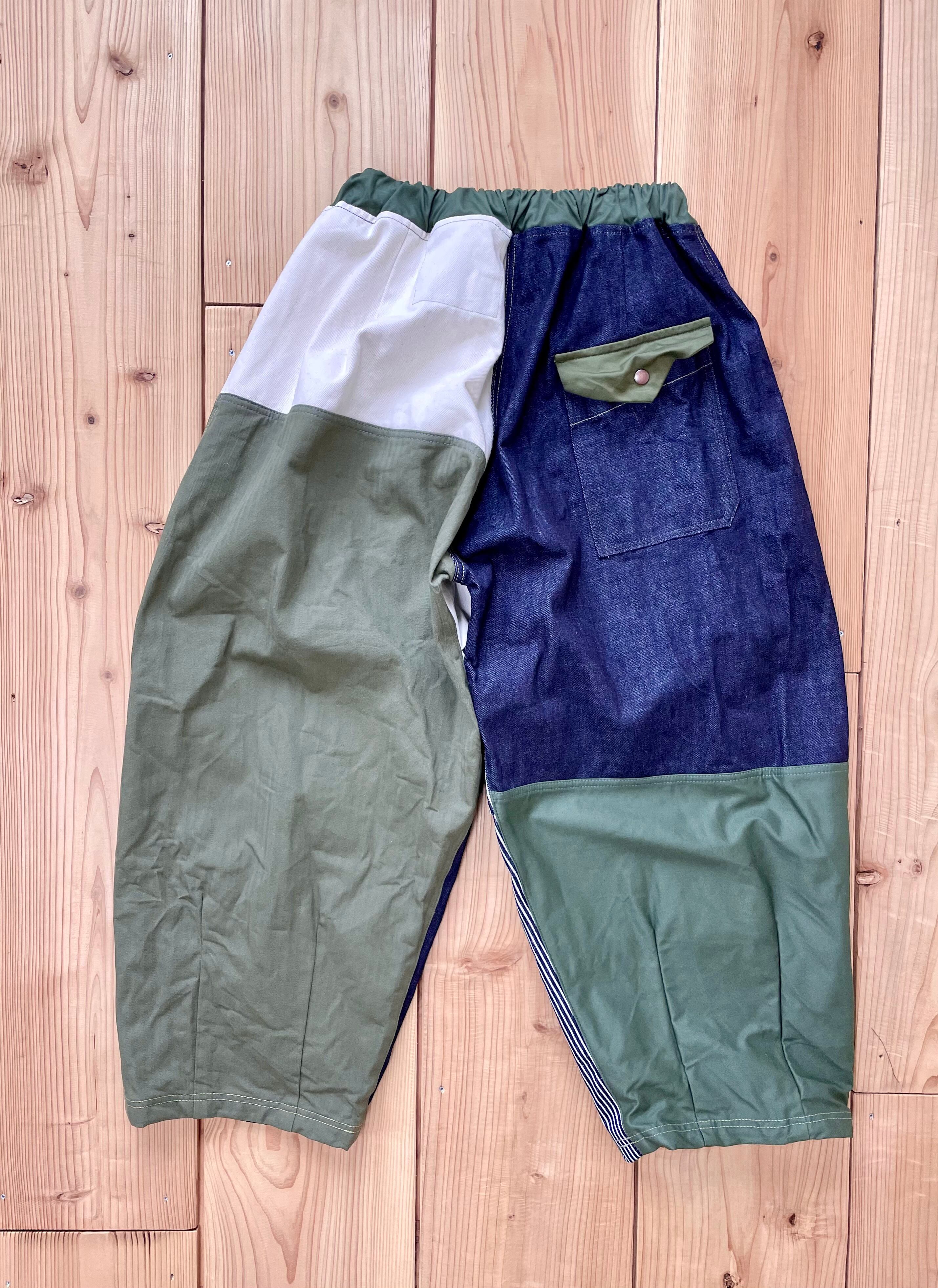 ワイドパンツを厚めのカーキ、白、14〜15オンスデニムなどをランダム使って仕上げました。