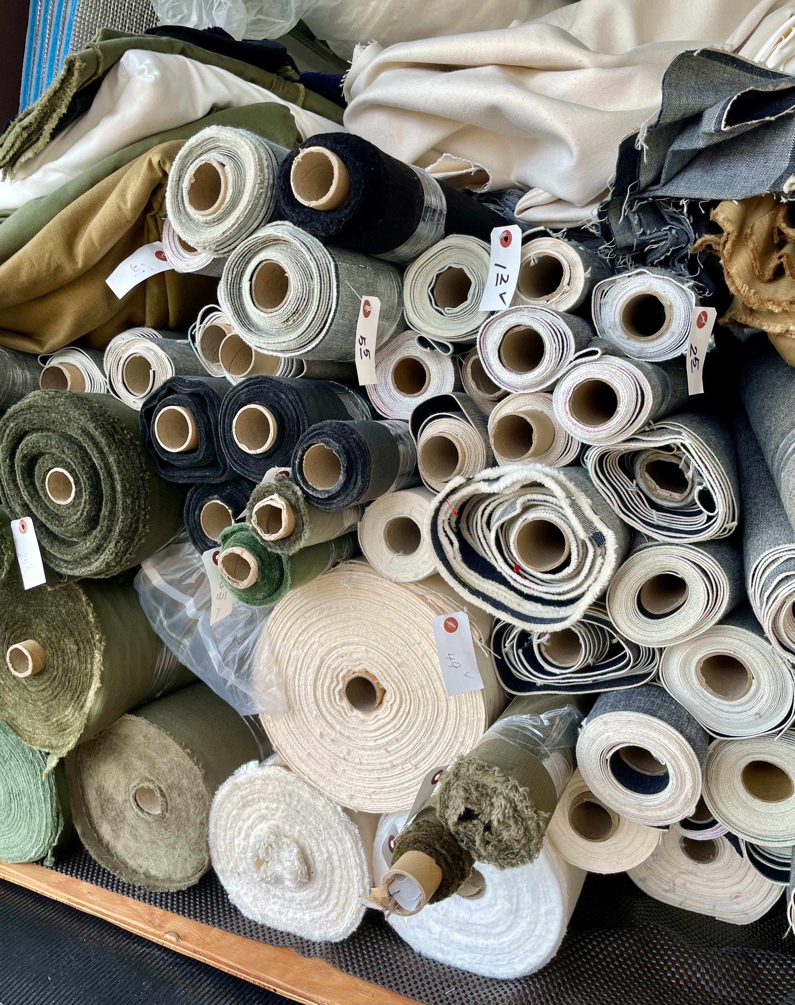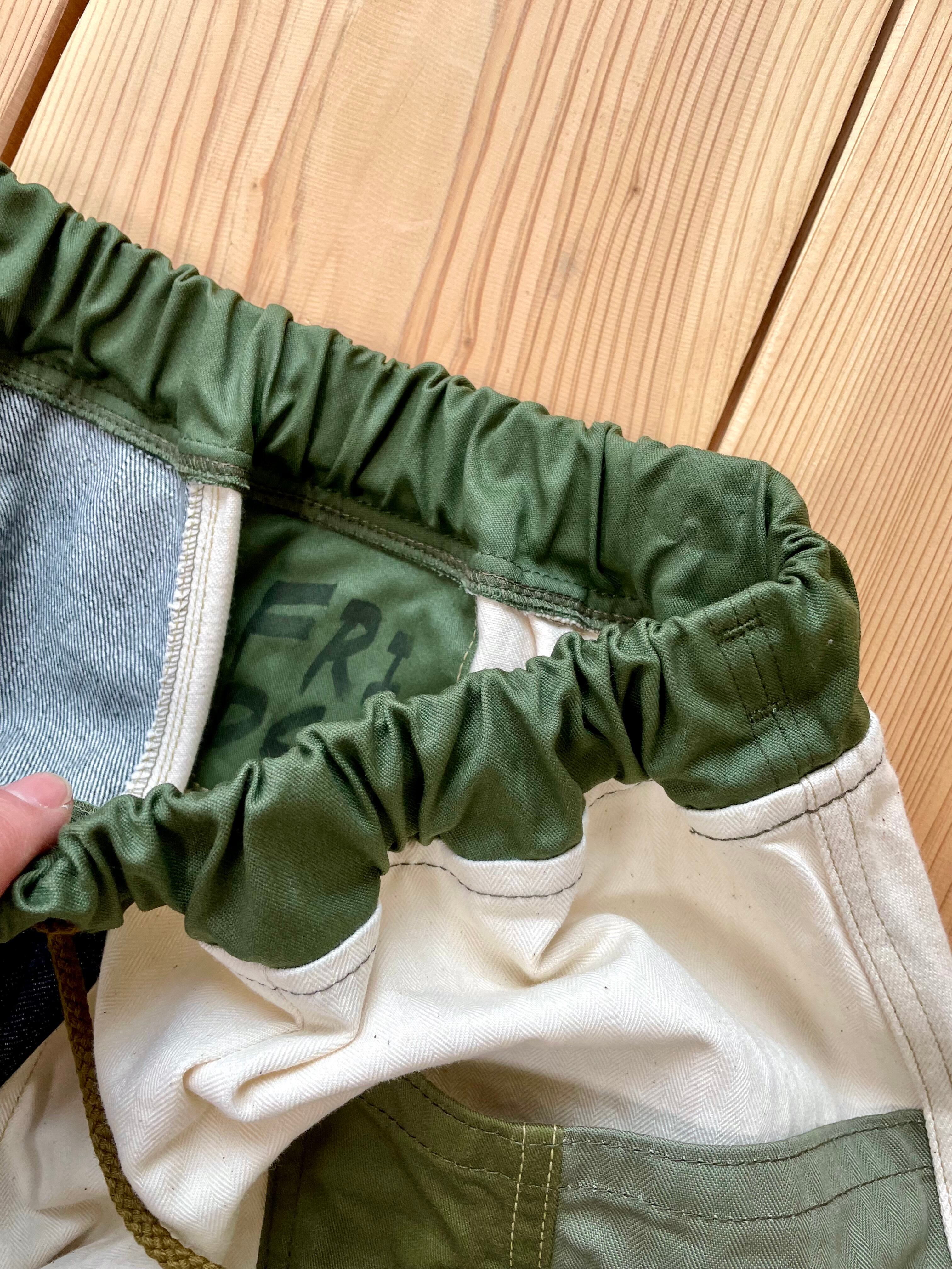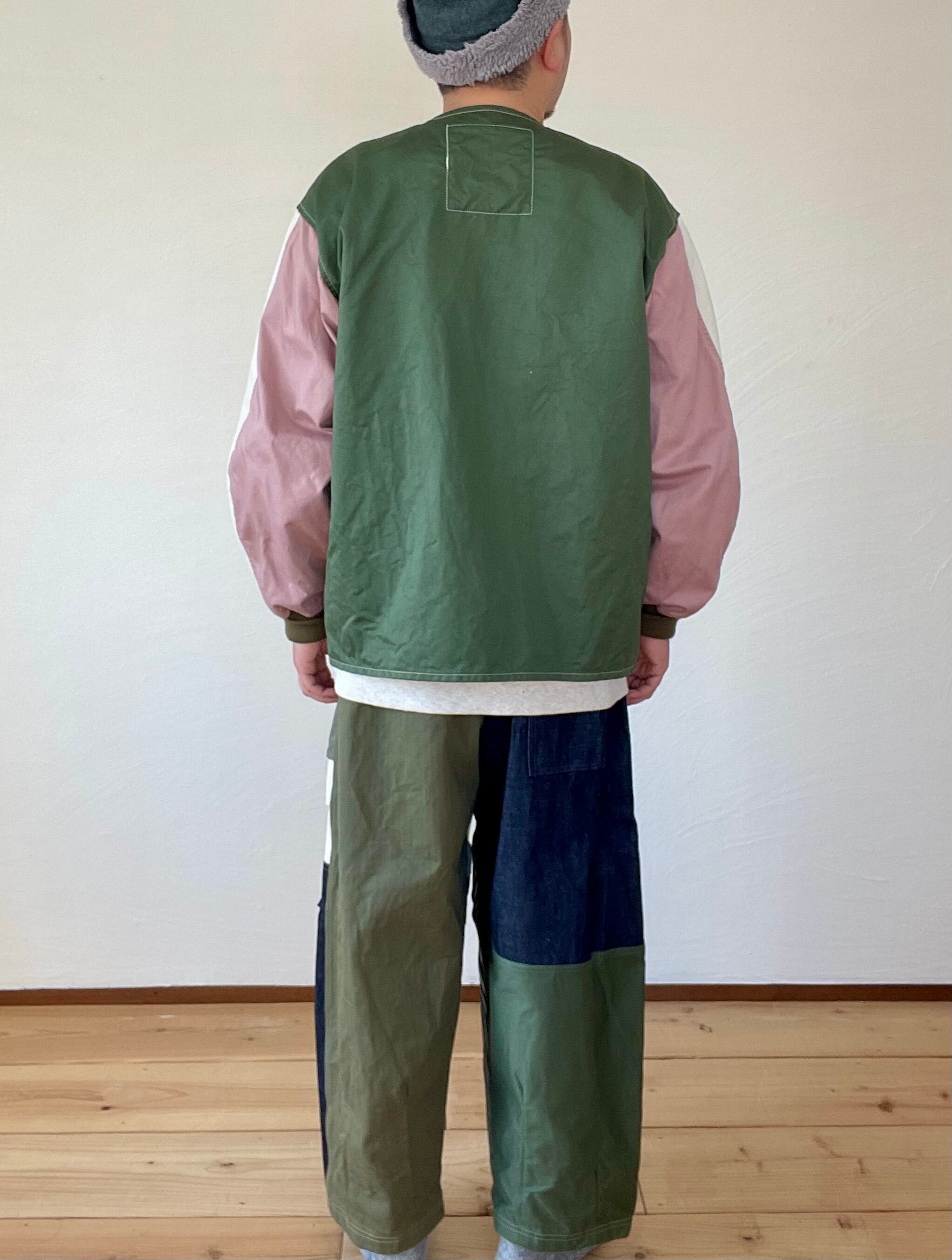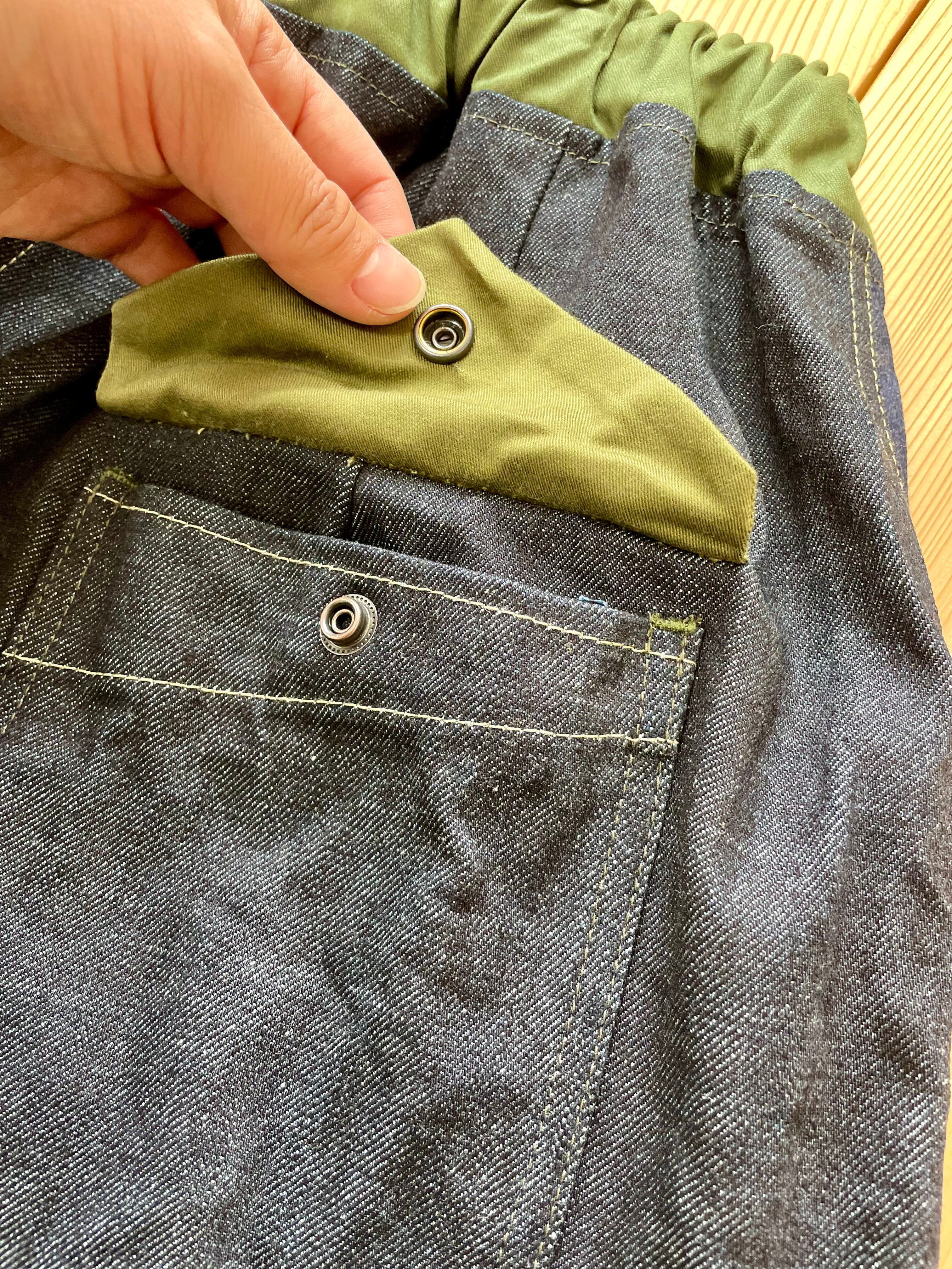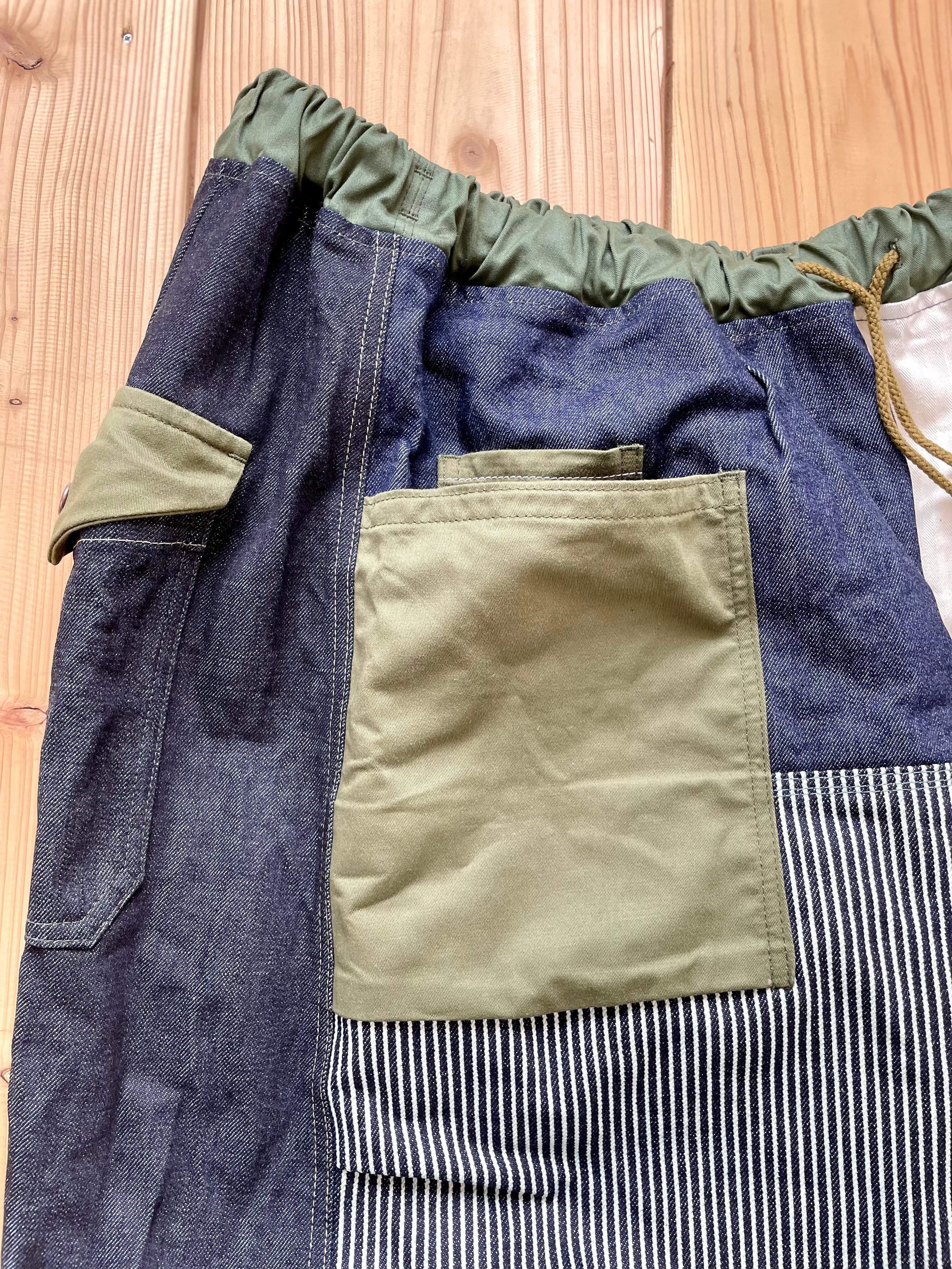 ワイドパンツを厚めのカーキ、白、14〜15オンスデニムなどをランダム使って仕上げました。